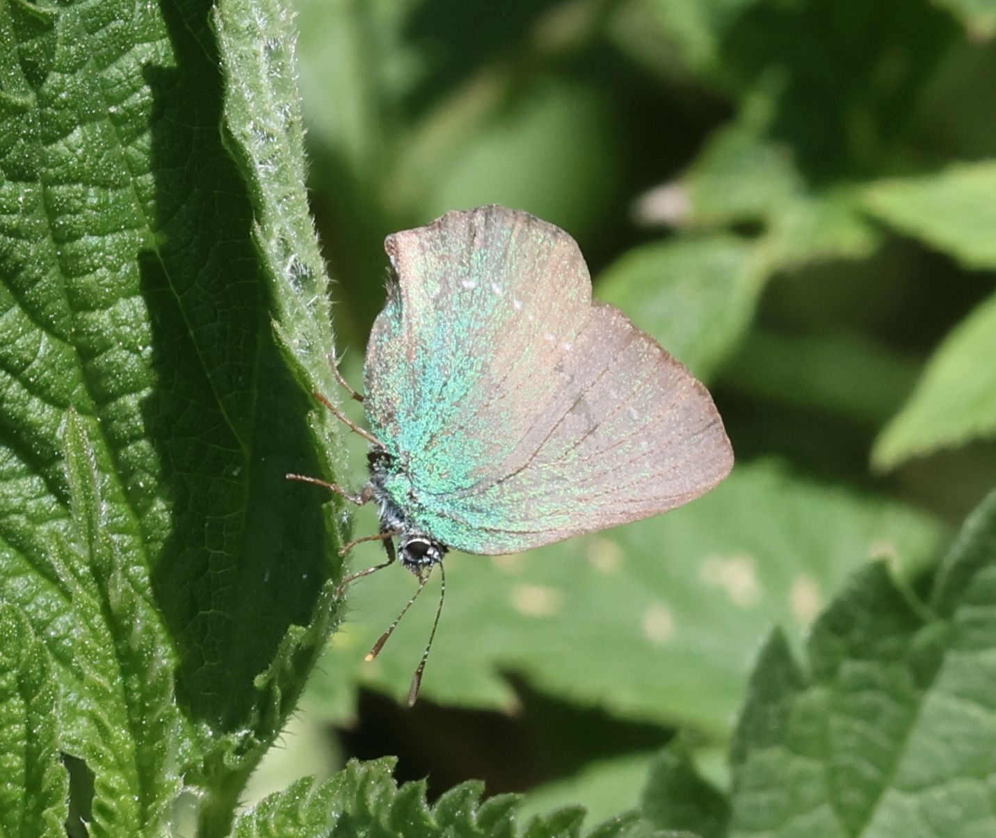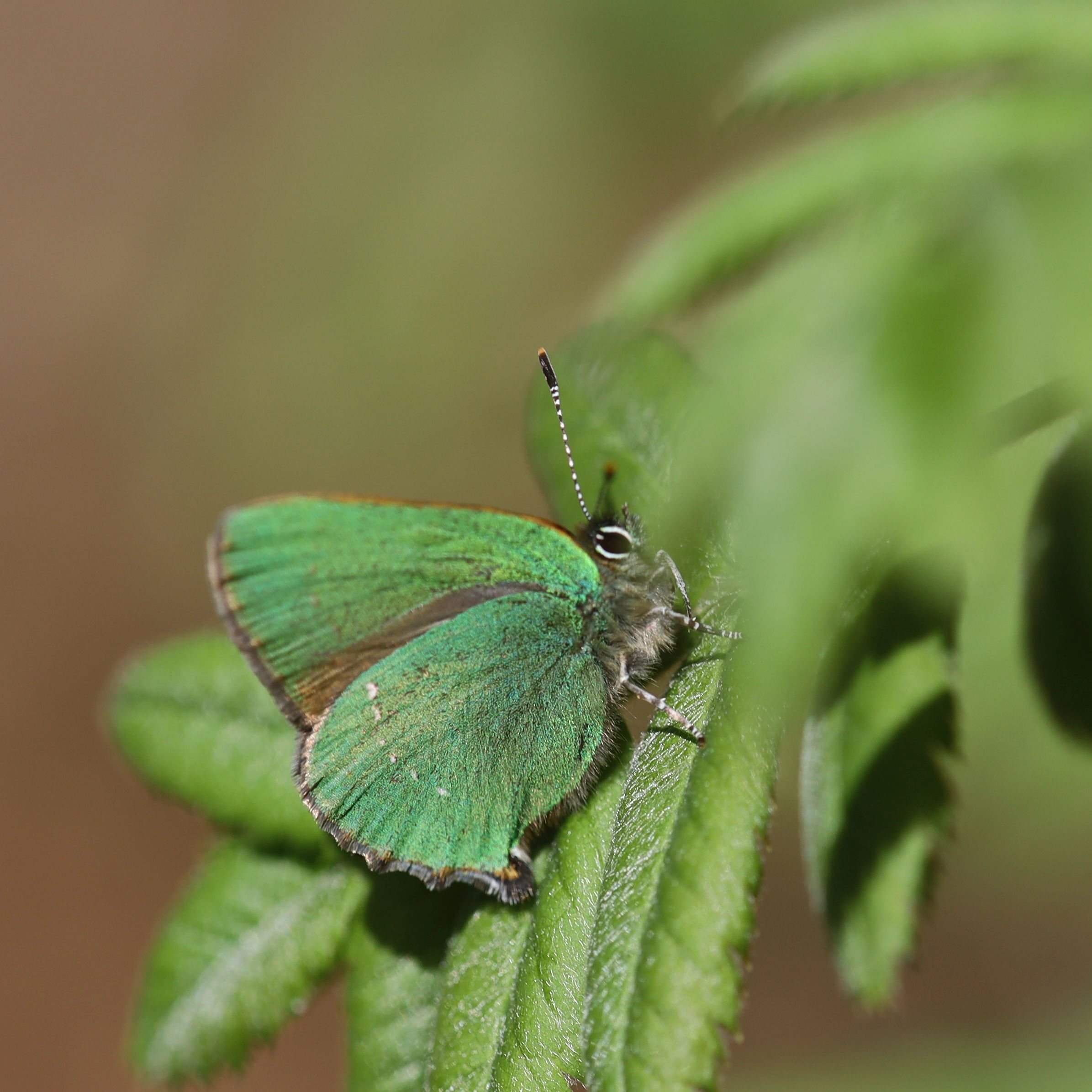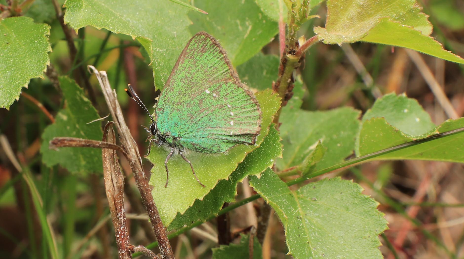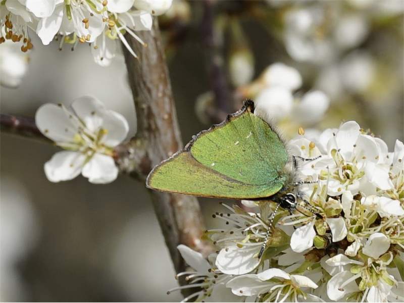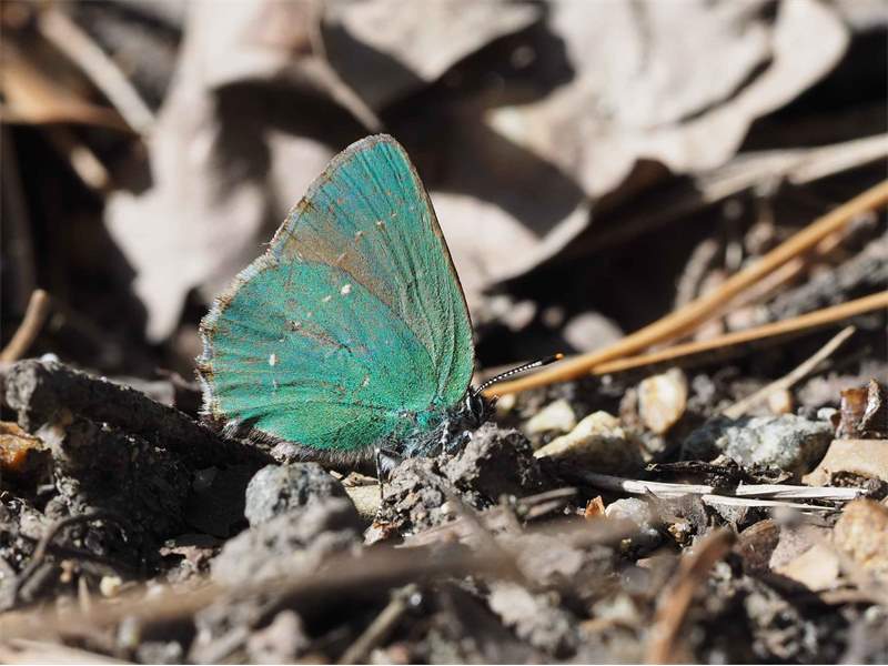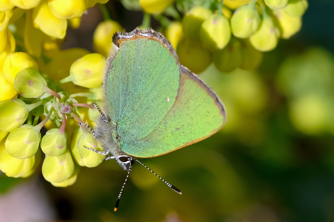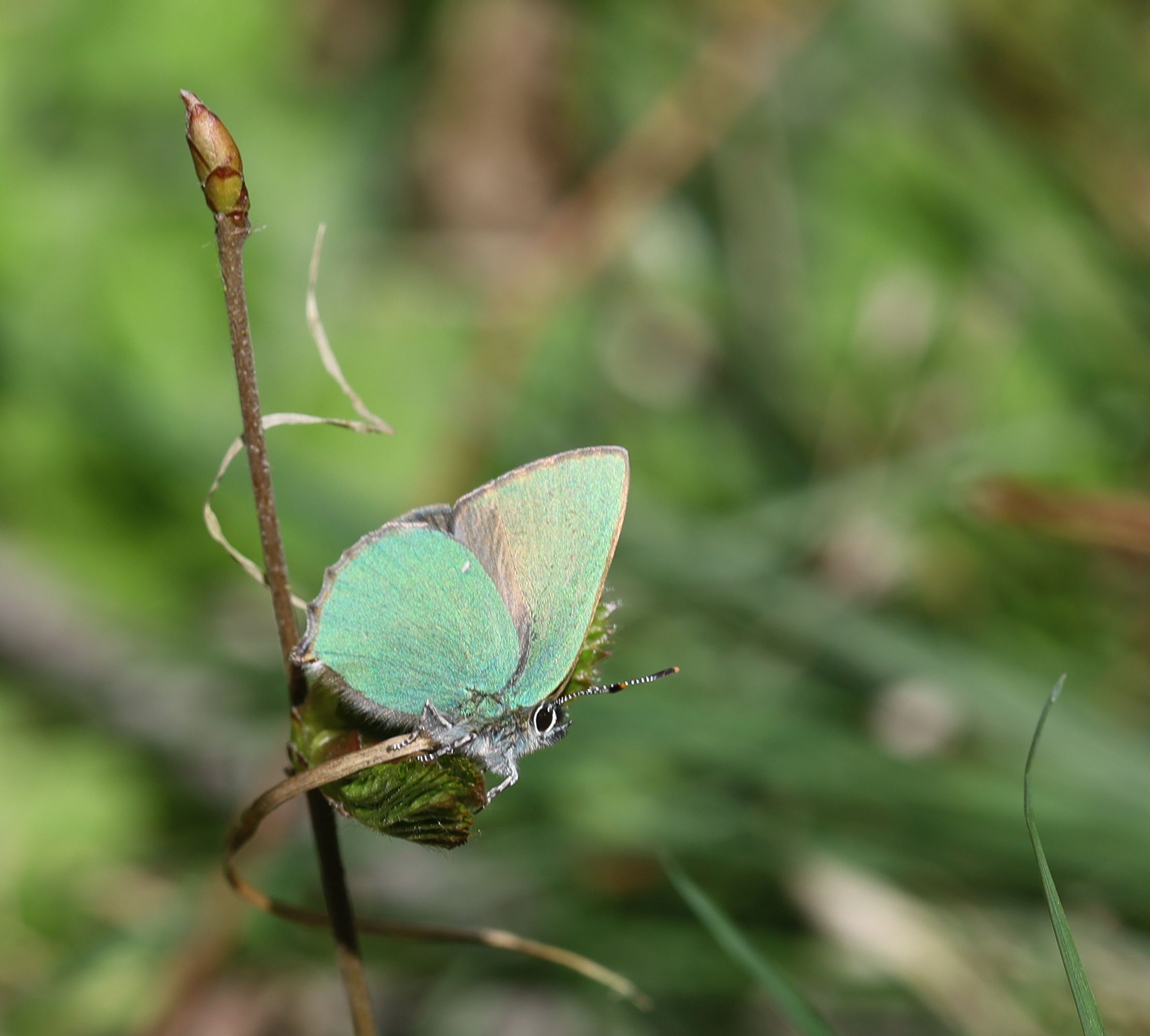 Grüner Zipfelfalter, im NSG Presseler Heide,- Wald,- und Moorgebiet, ca. 3 km nördl. von Wöllnau, am 17.05.2020