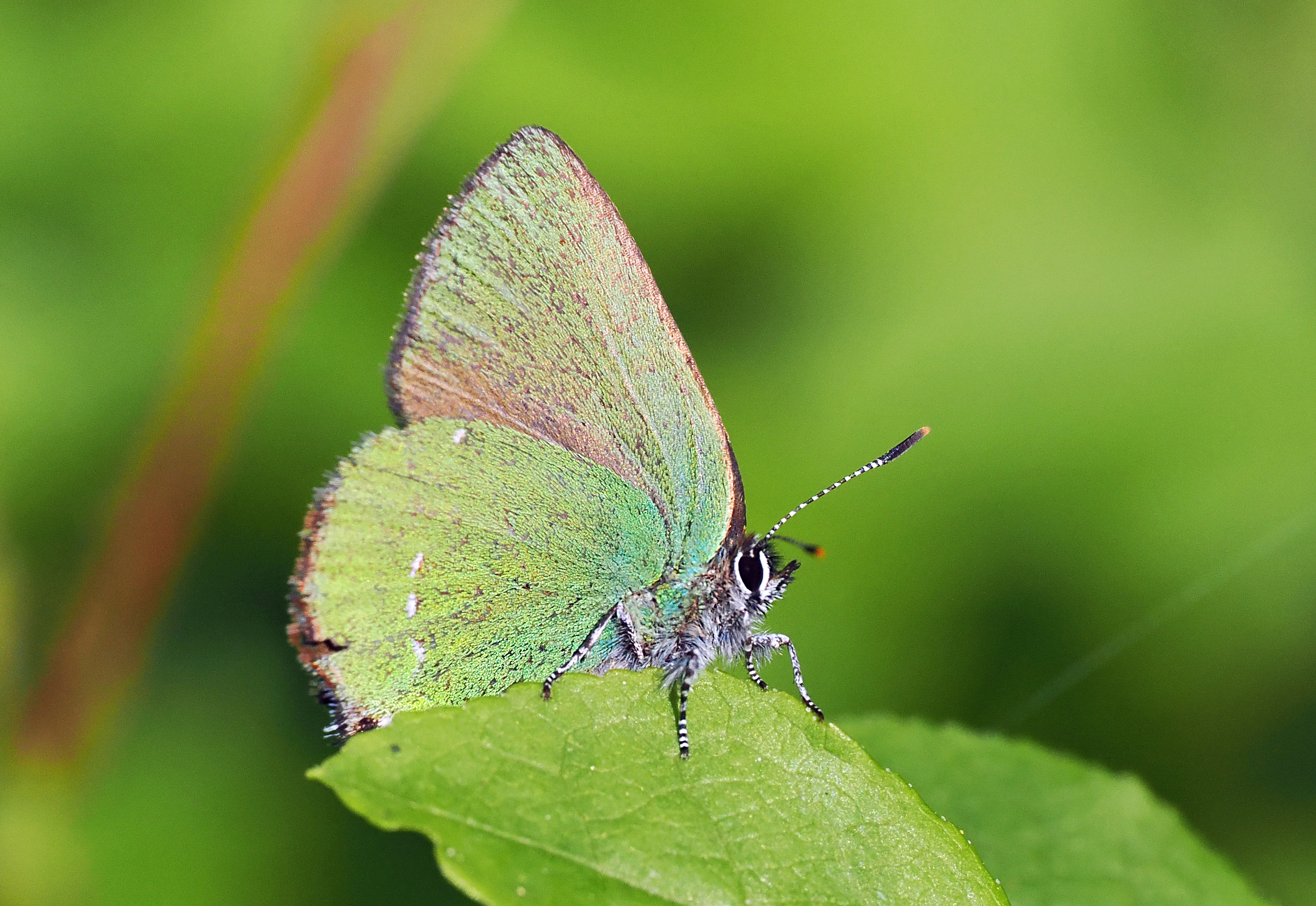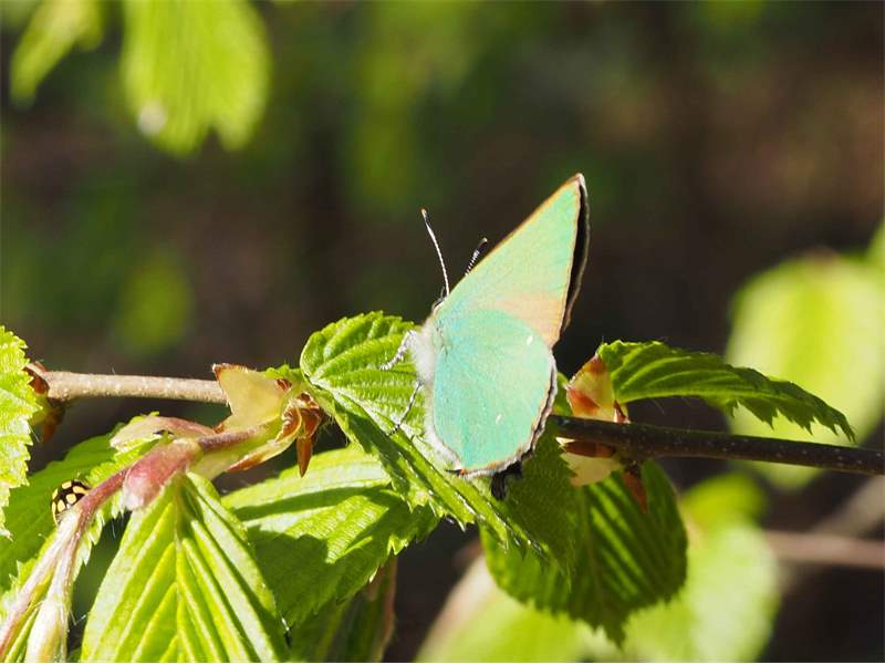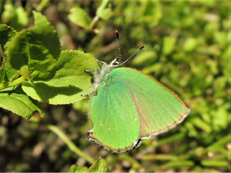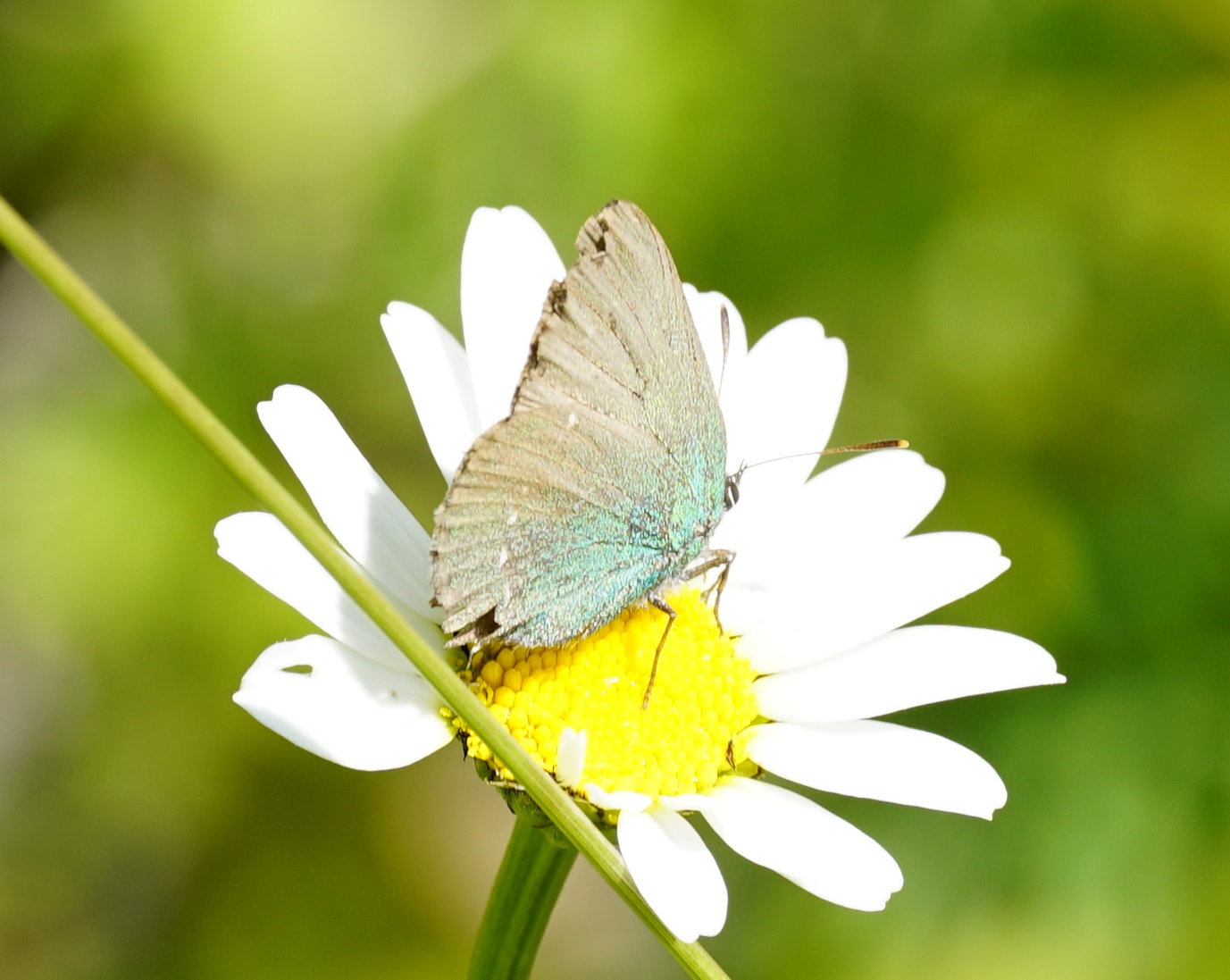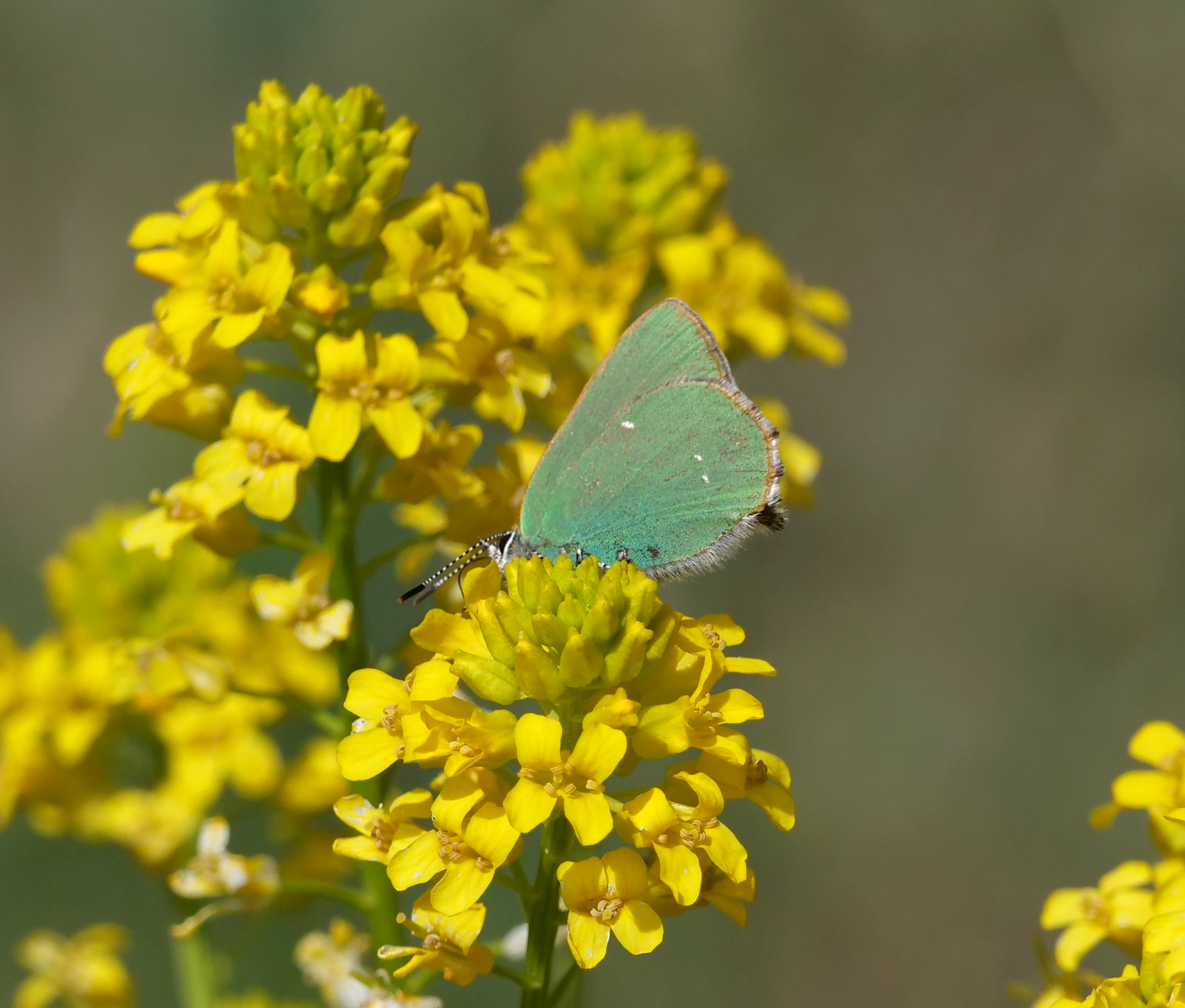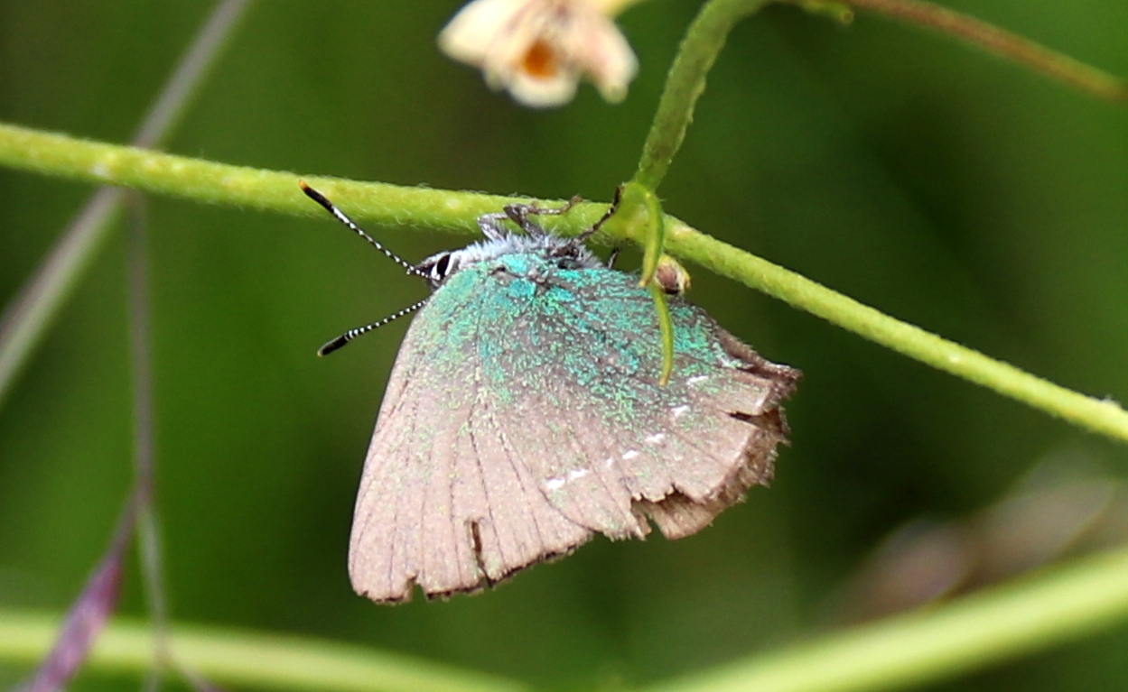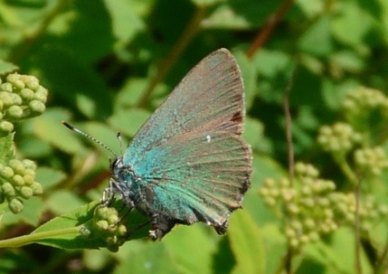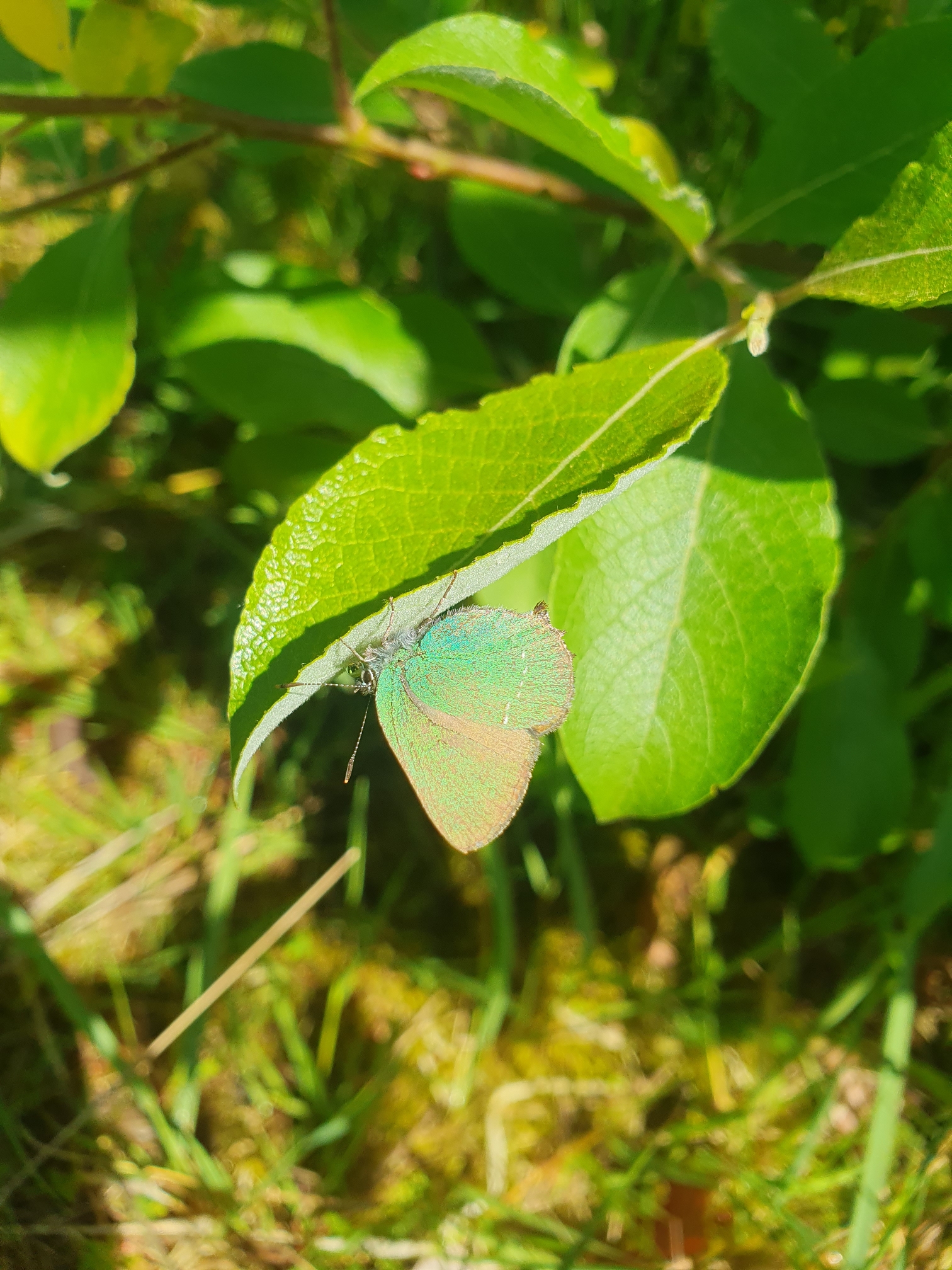 Grüner Zipfelfalter, im NSG Presseler Heide,- Wald,- und Moorgebiet, ca. 3 km nördl. von Wöllnau, am 17.05.2020
