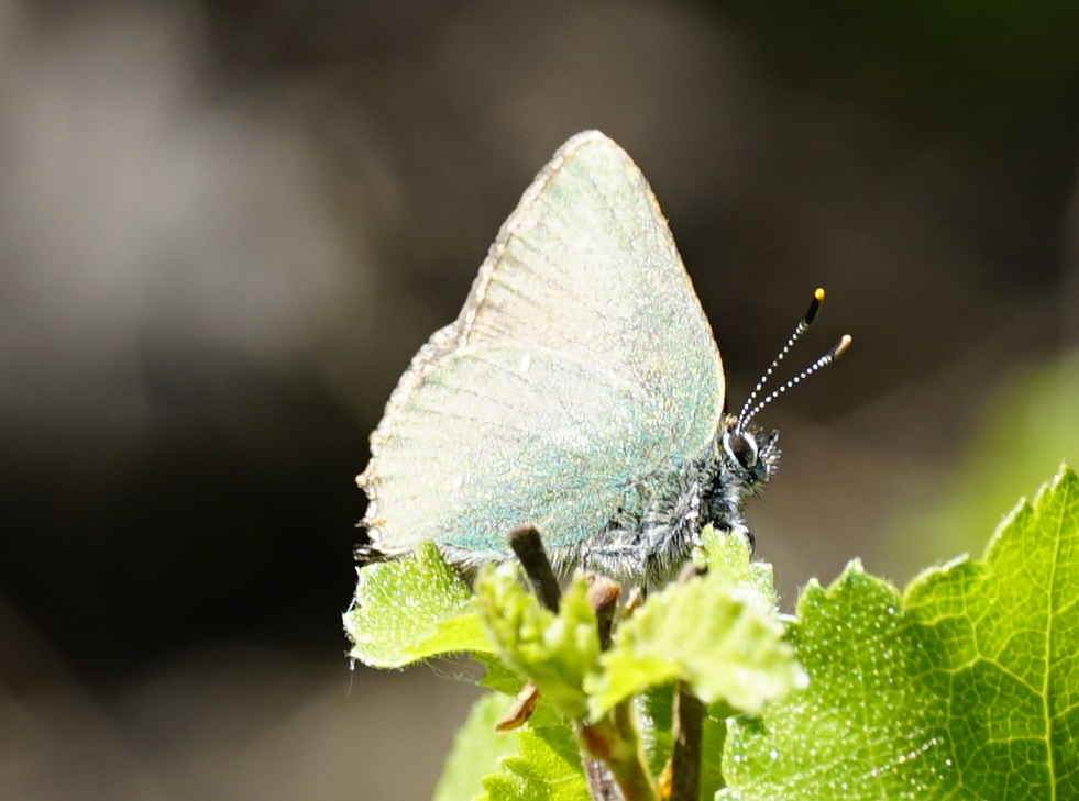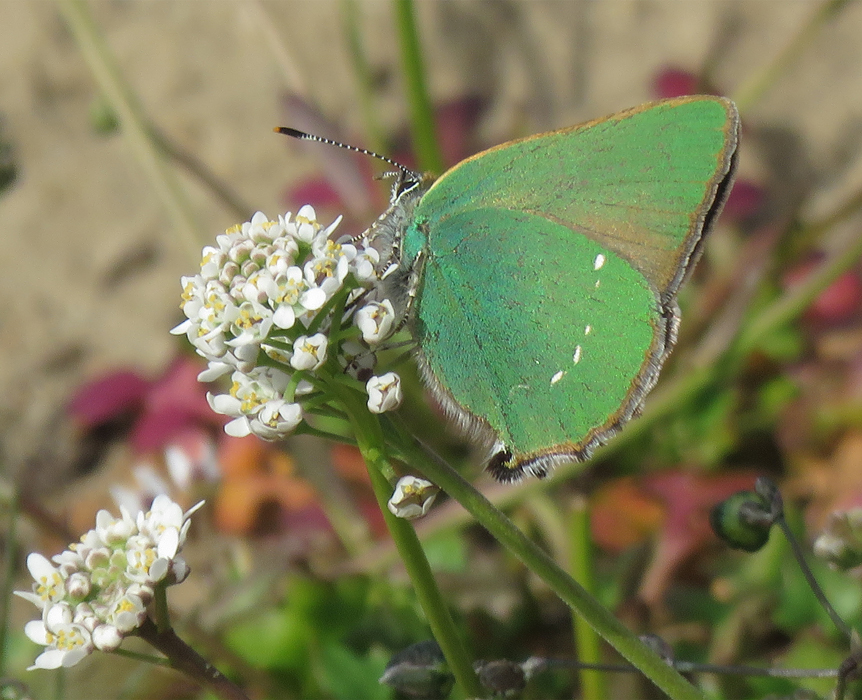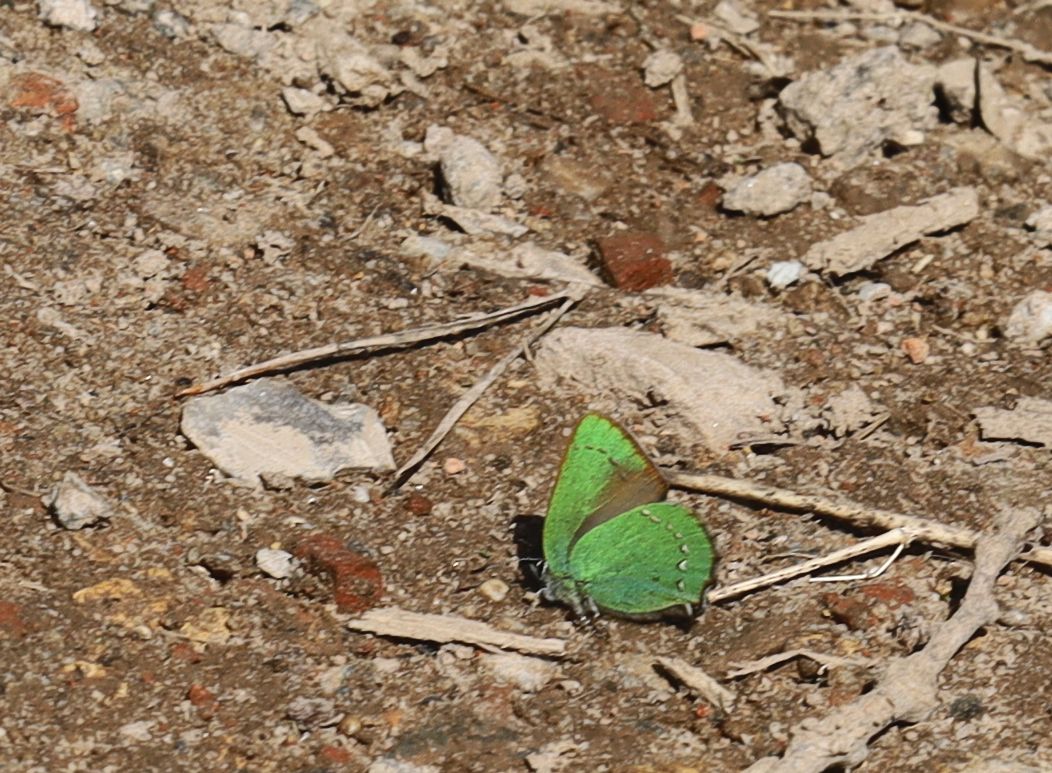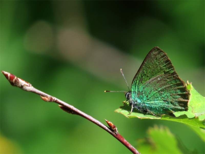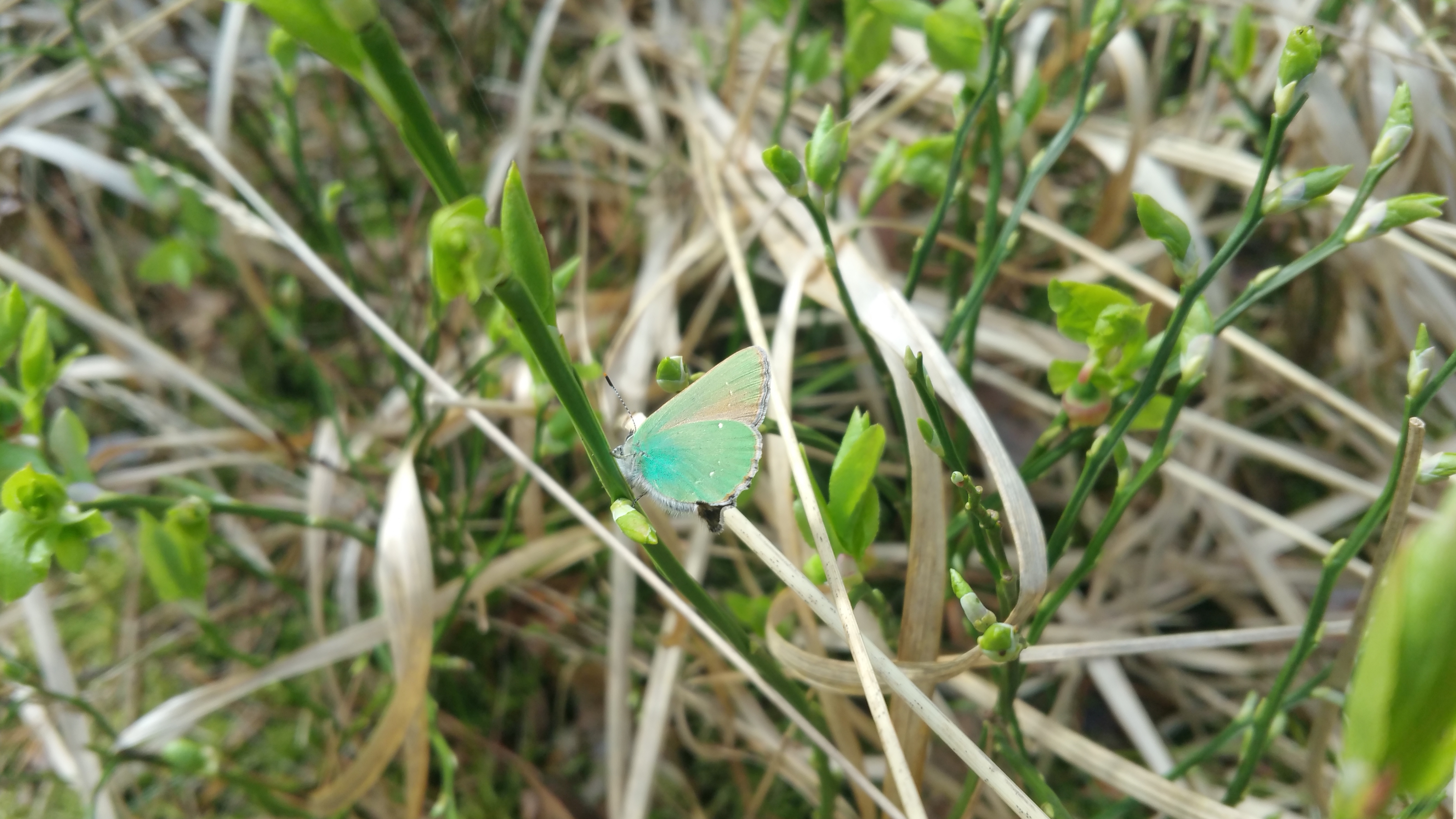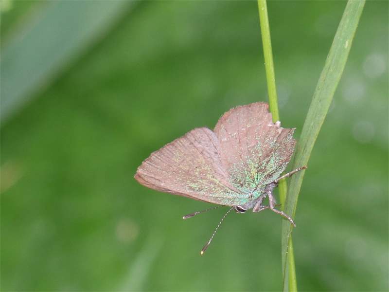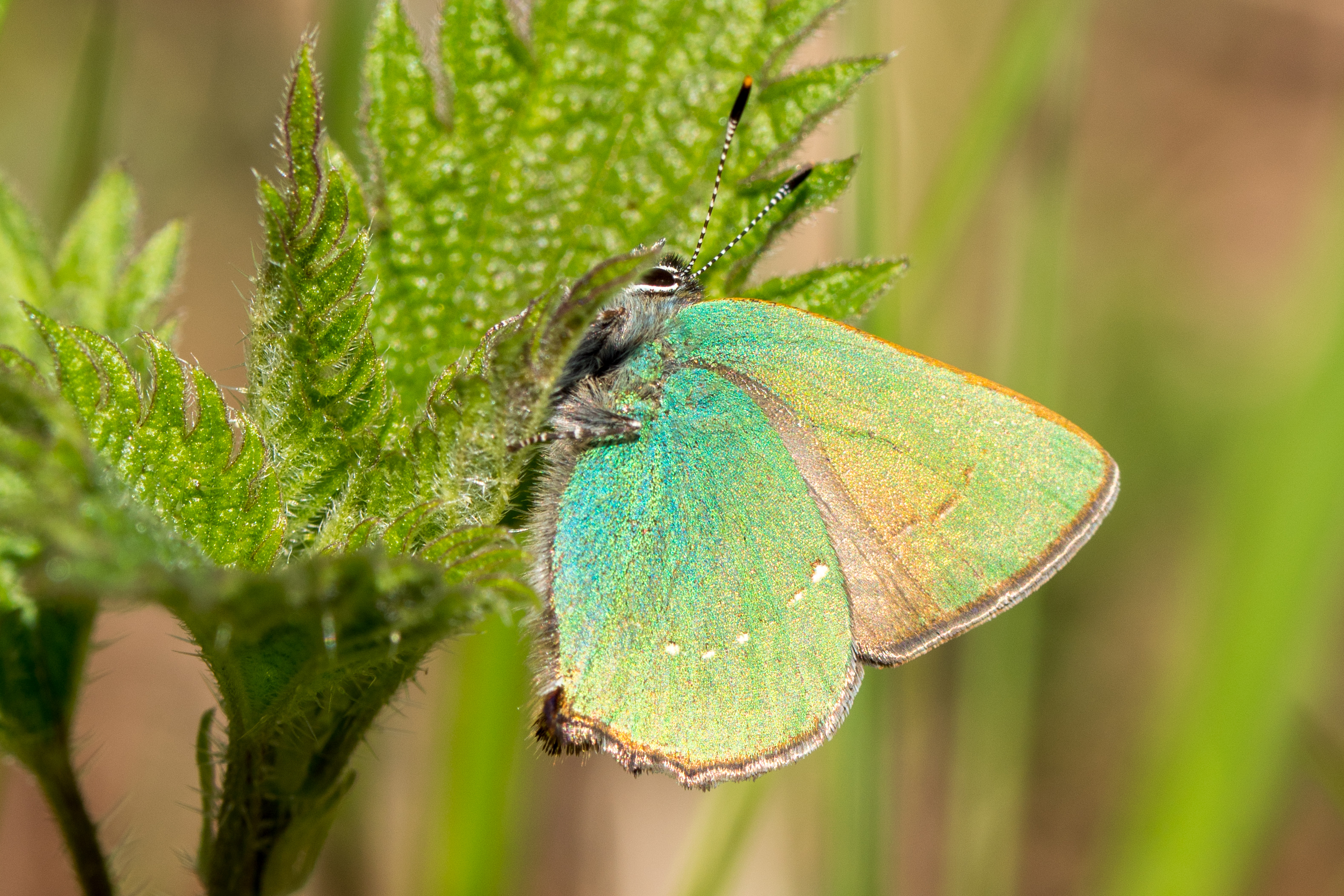 Grüner Zipfelfalter, im NSG Presseler Heide,- Wald,- und Moorgebiet, ca. 3 km nördl. von Wöllnau, am 17.05.2020