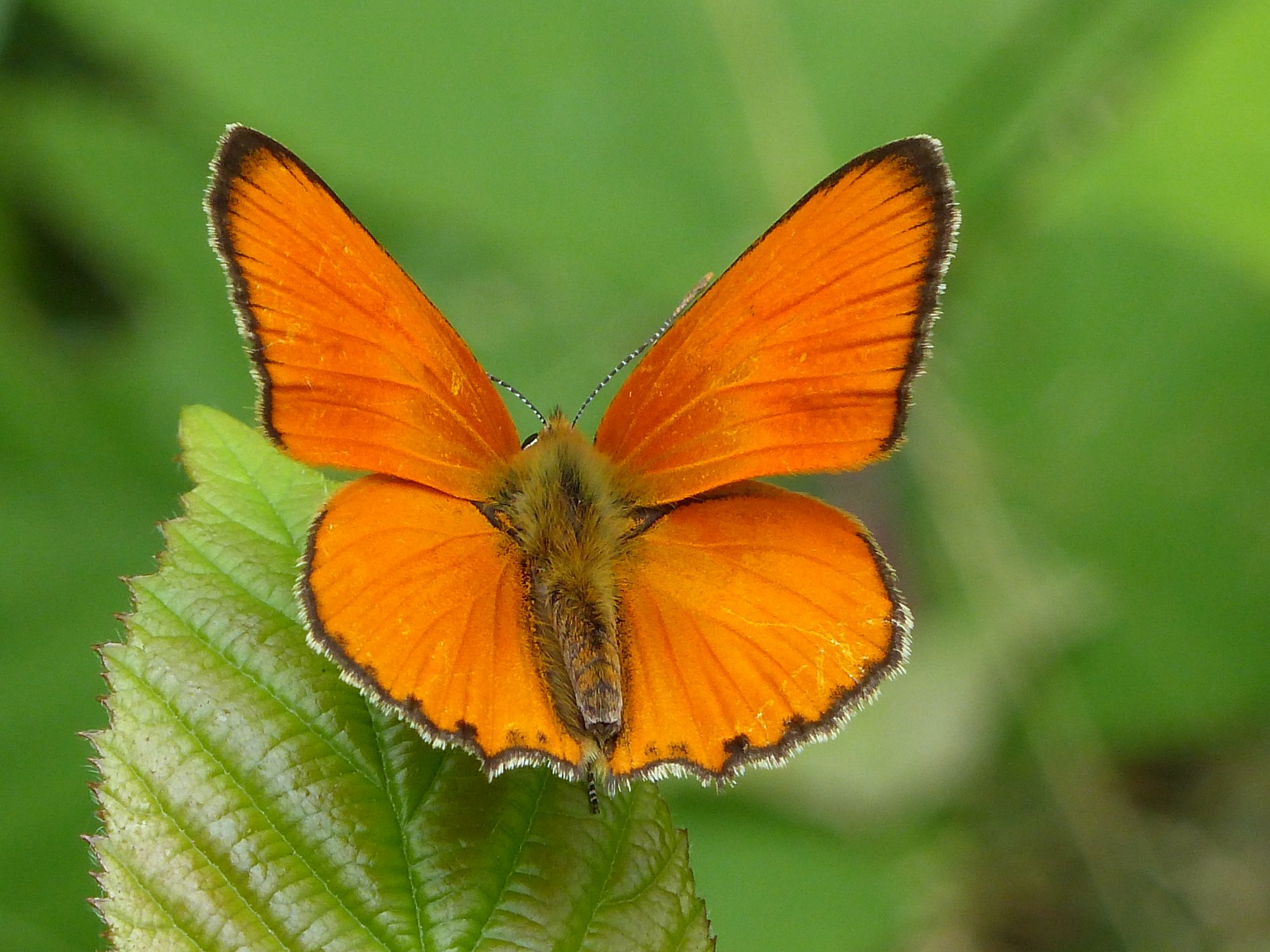 Flügeloberseiten der Männchen intensiv orange glänzend, ohne schwarze Punkte, mit schwarzen Flügelrändern und weißen Fransen. Weibchen oberseits mit schwarzen und dunkelbraunen Punkten, die Vorderflügel blass orange, die Hinterflügel braun, mit einer orangen Binde vor dem Rand.
