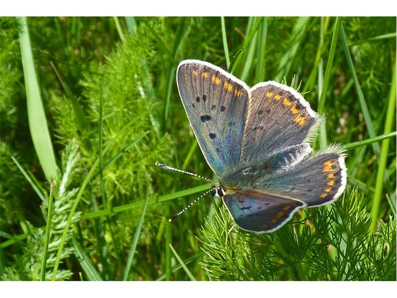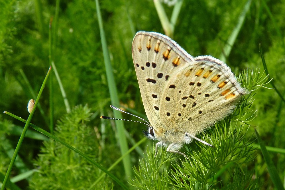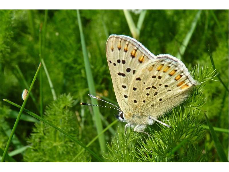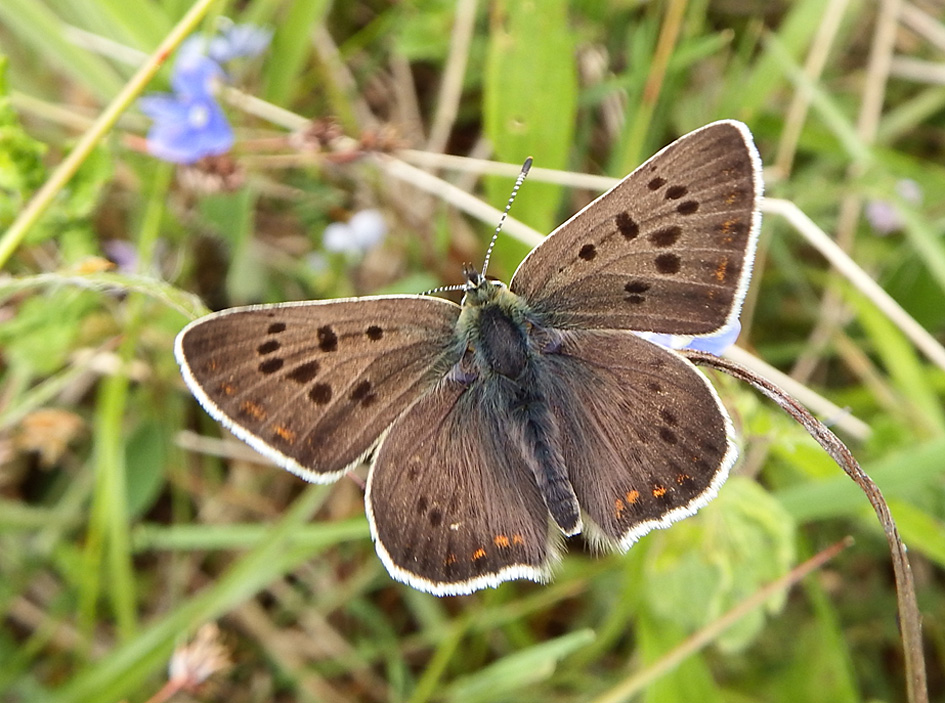 Ähnliche Art: Das Männchen ähnelt dem Weibchen des Violetten Feuerfalters (Lycaena alciphron), das auf den Unterseiten der Hinterflügel im mittleren Bereich vor dem Hinterrand jedoch weniger schwarze Punkte besitzt.