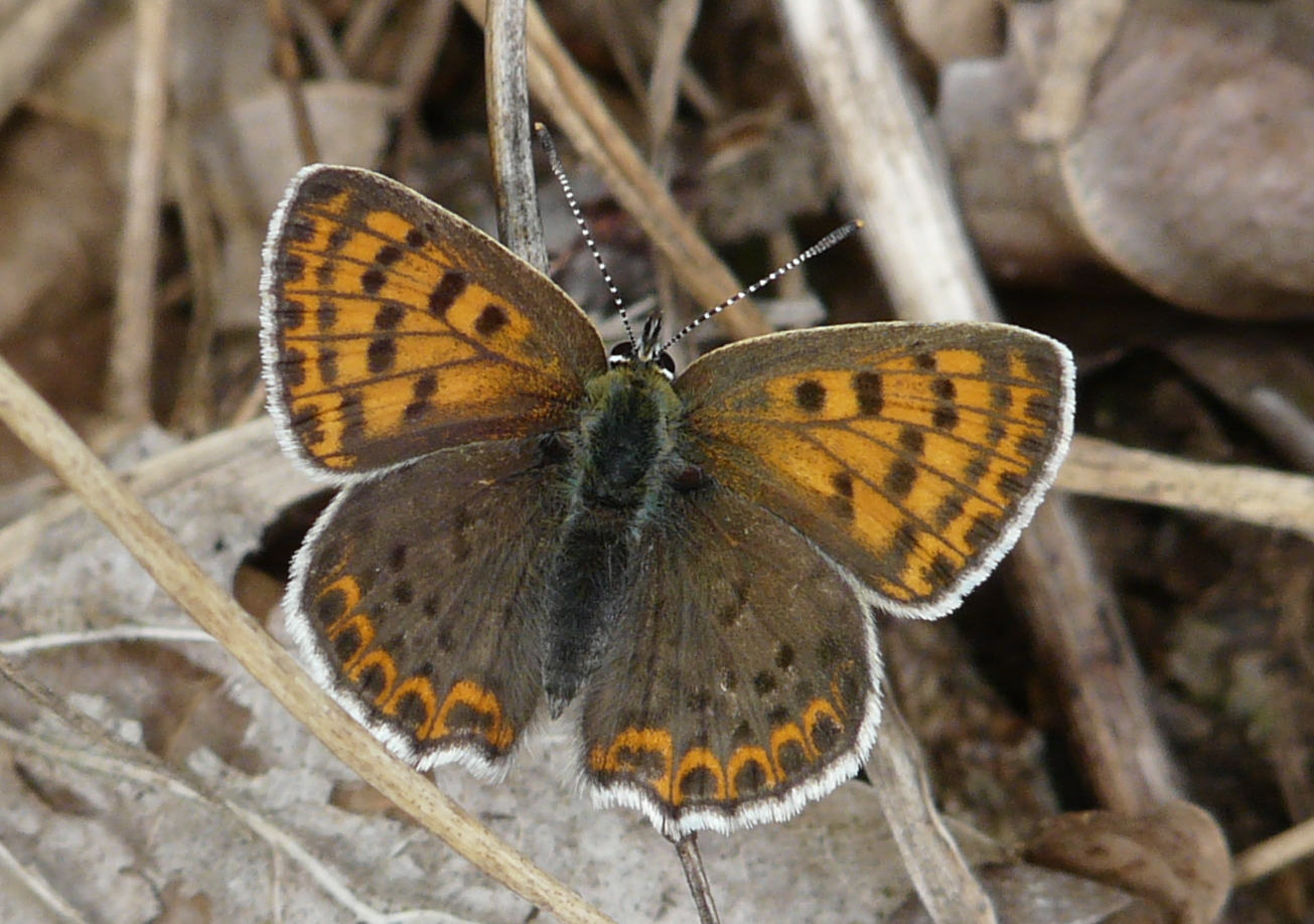Das Weibchen ähnelt dem Kleinen Feuerfalter (Lycaena phlaeas), der oberseits auf den Vorderflügeln breite braune Ränder, auf den Hinterflügeln vor dem Hinterrand ein orangenes Band und unterseits hellbraune Hinterflügel mit undeutlichen kleinen schwarzen Punkten aufweist.