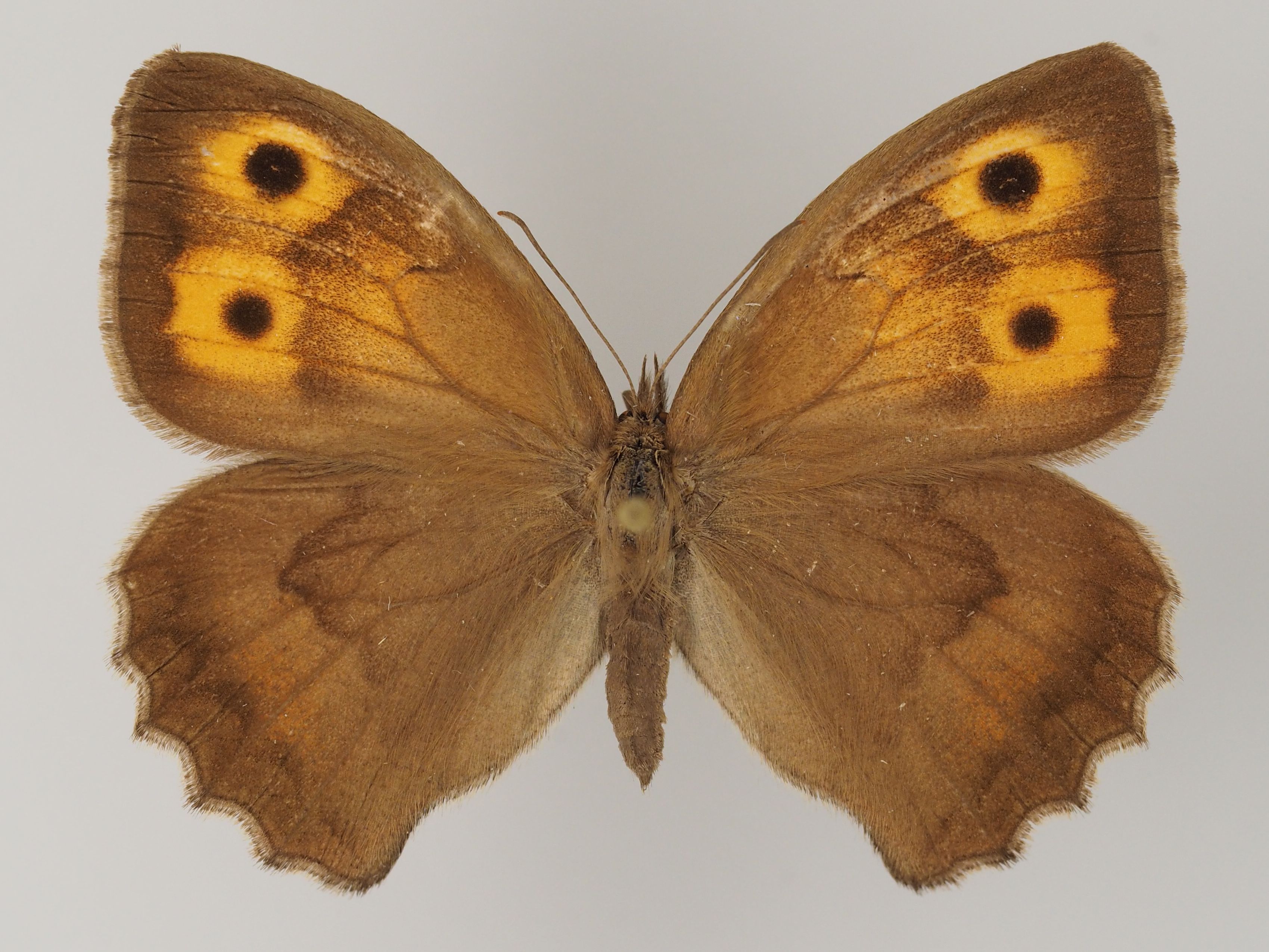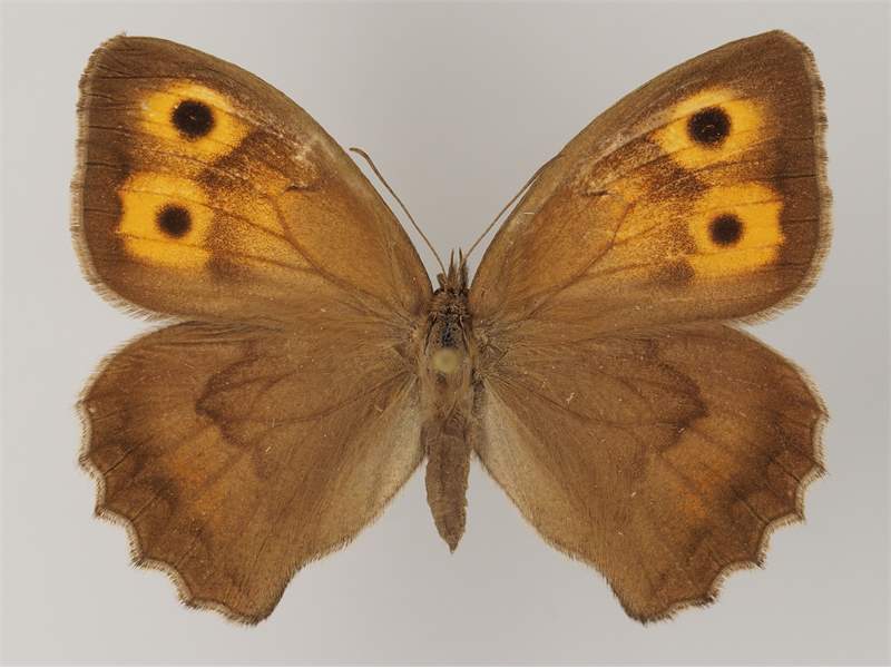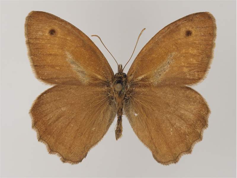 Flügeloberseiten hellbraun; Vorderflügel des Männchens mit einem Augenfleck vor der Flügelspitze sowie einem grau glänzenden bindenförmigen Duftschuppenfleck, der nahe der Flügelsbasis vom Hinterrand in Richtung Augenfleck verläuft; Vorderflügel des Weibchens mit zwei entfernt voneinander stehenden Augenflecken, die ihrerseits auf runden orangen Flecken sitzen, die orangen Flecke können miteinander verbunden sein; in Richtung Körper eine schwache orange Schattierung. Fransen hellbraun.