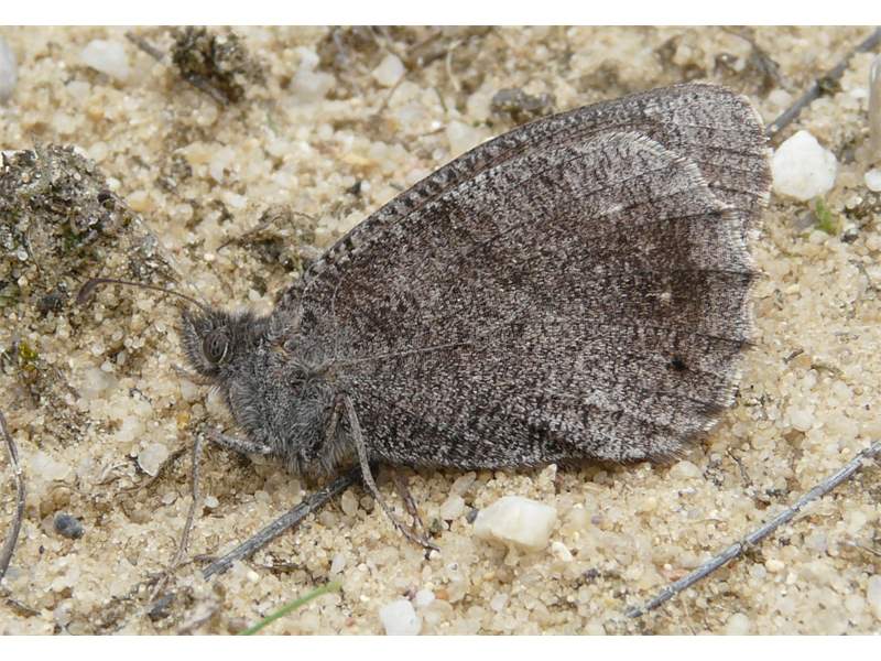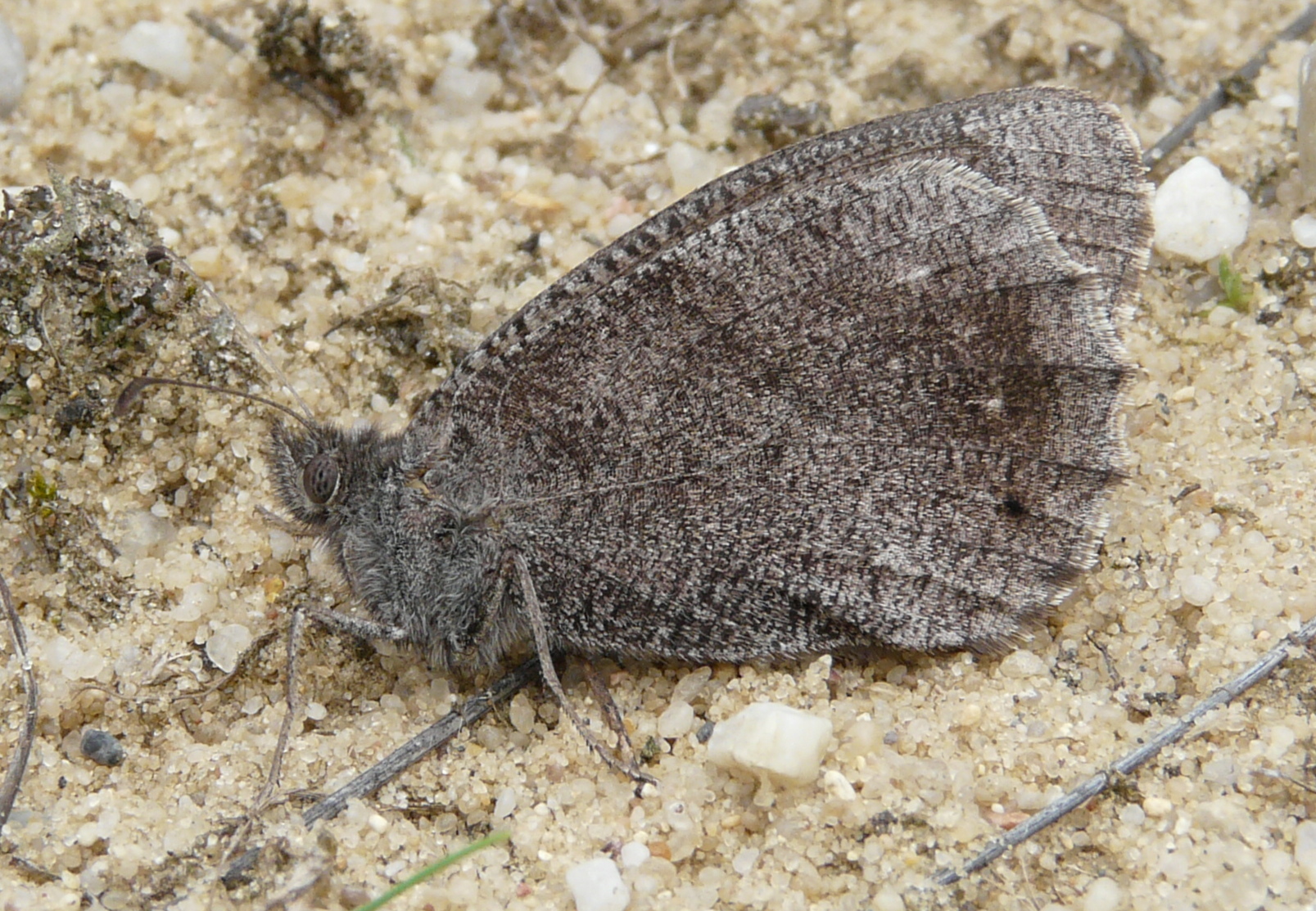 Sowohl auf den Flügelober- als auch Unterseiten dominiert die eisengraue Grundfarbe mit einer leicht bräunlichen Marmorierung die Falter dieser Augen- bzw. Grasfalterart (Satyrinae).