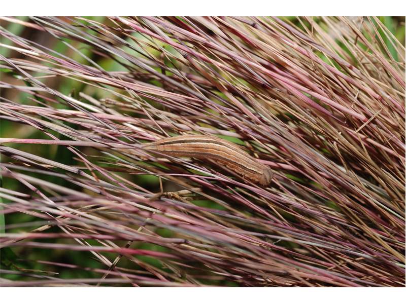 Larve der Kleinen Rostbinde (braune Farbvariante) an der Wirtspflanze Silbergras, 06.07.2010. (© Susanne Kurze)( Bild vergrößern)