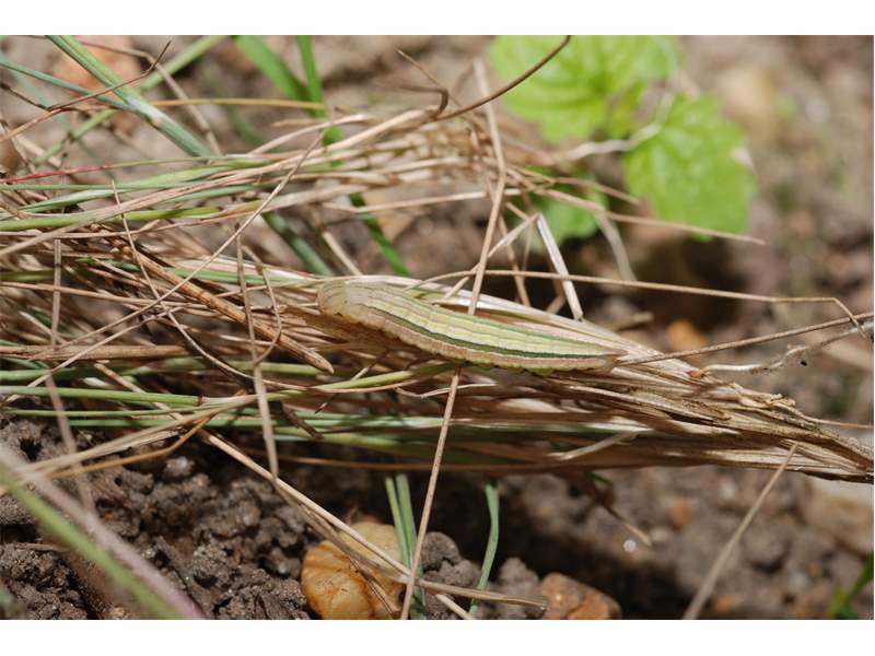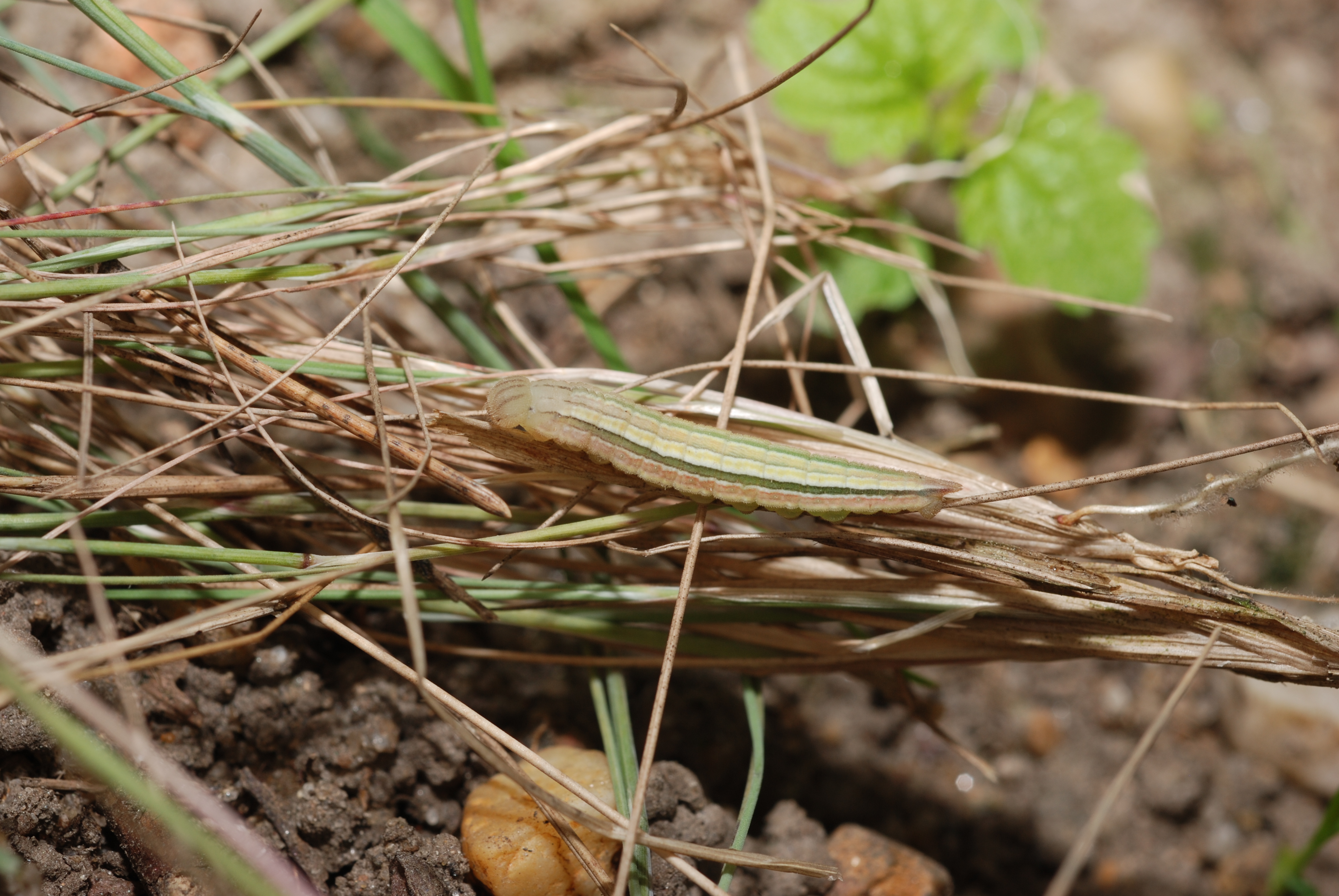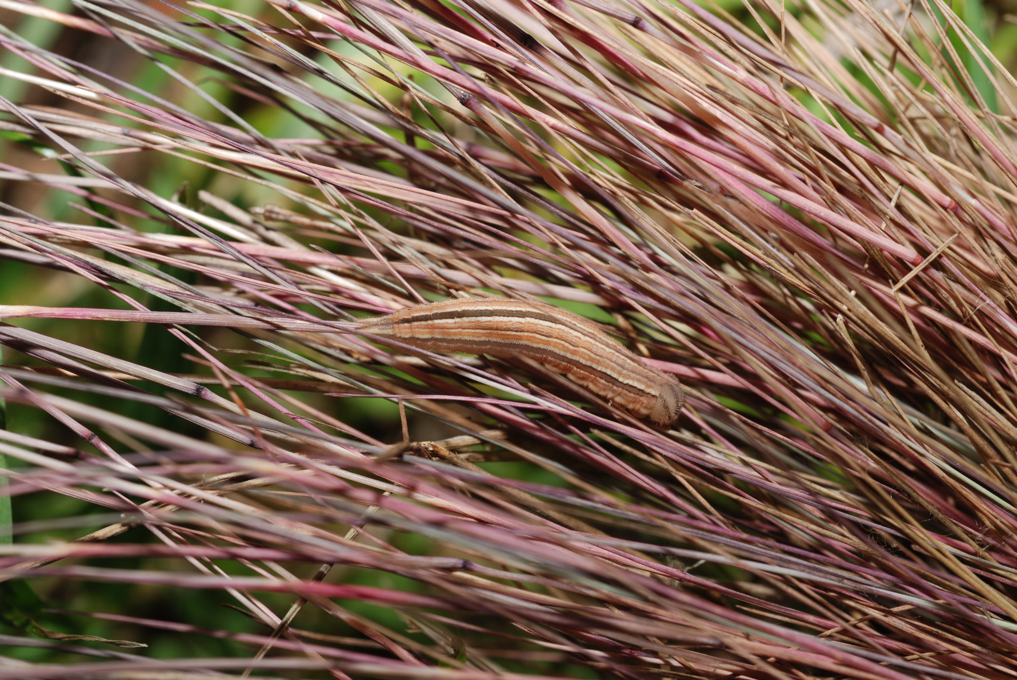 Larve der Kleinen Rostbinde (braune Farbvariante) an der Wirtspflanze Silbergras, 06.07.2010.