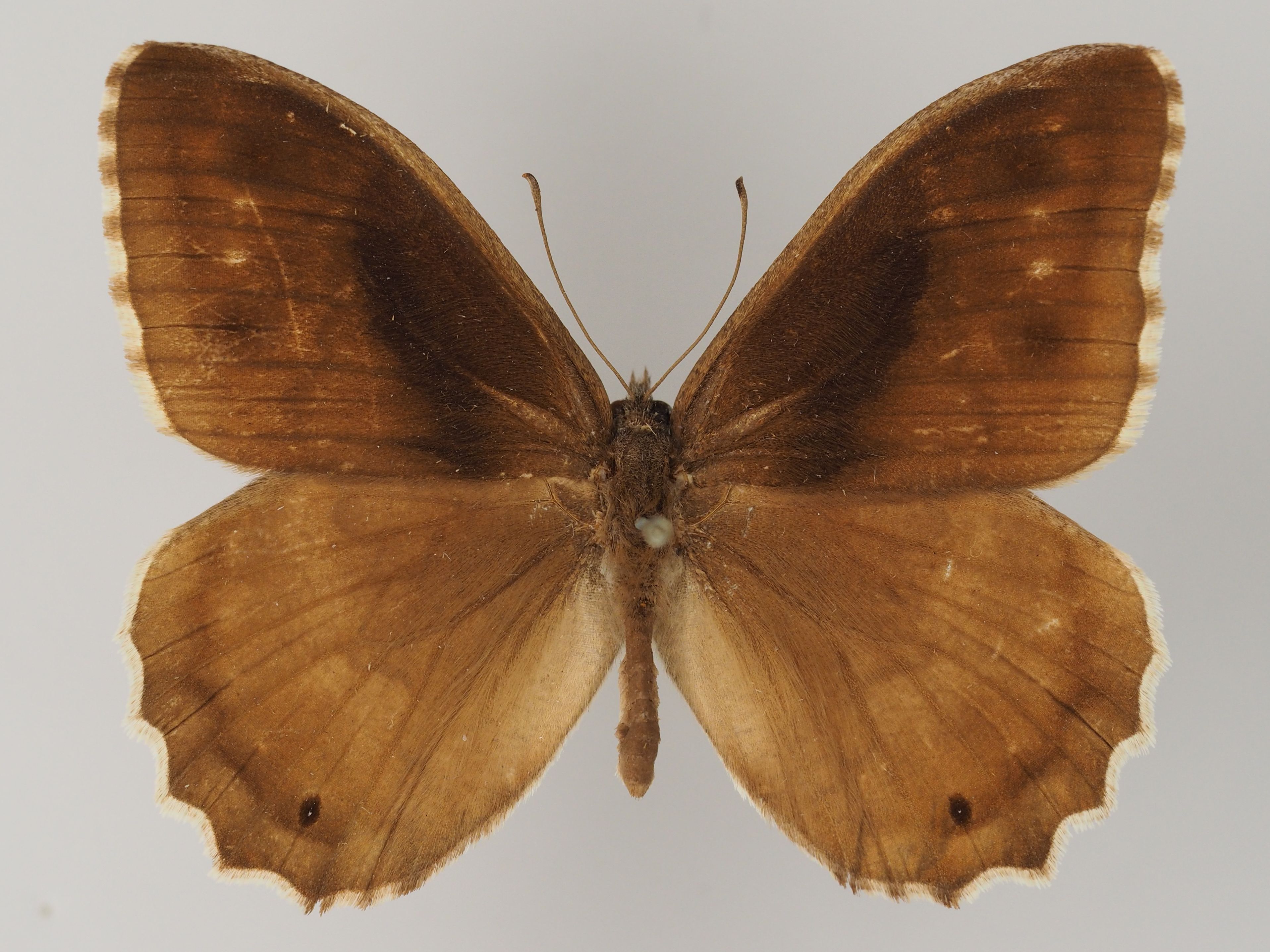 Flügeloberseiten dunkelbraun, Vorderflügel mit zwei Augenflecken, zwischen denen zwei kleine weiße Punkte liegen; Hinterflügel mit einem kleinen Augenfleck.