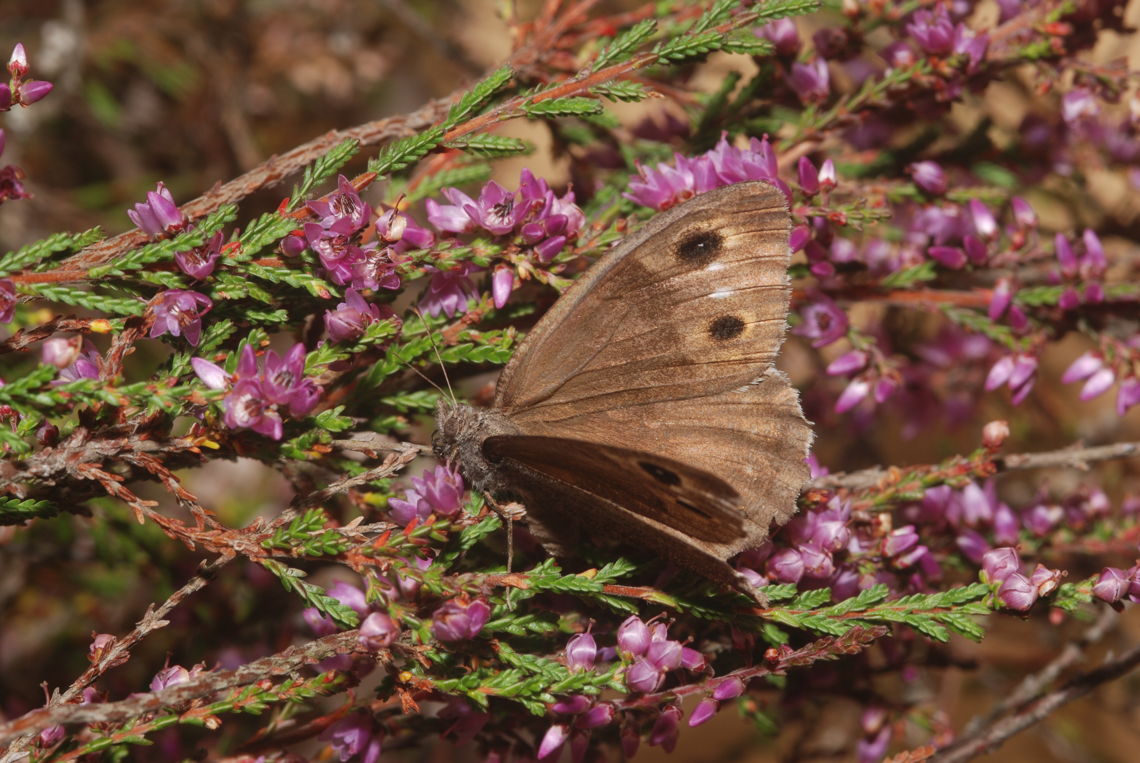 Weibchen der Kleinen Rostbinde. Deutlich erkennbar sind die beiden weißen Punkte auf der Vorderflügeloberseite zwischen den Augenflecken, 20.09.2010.
