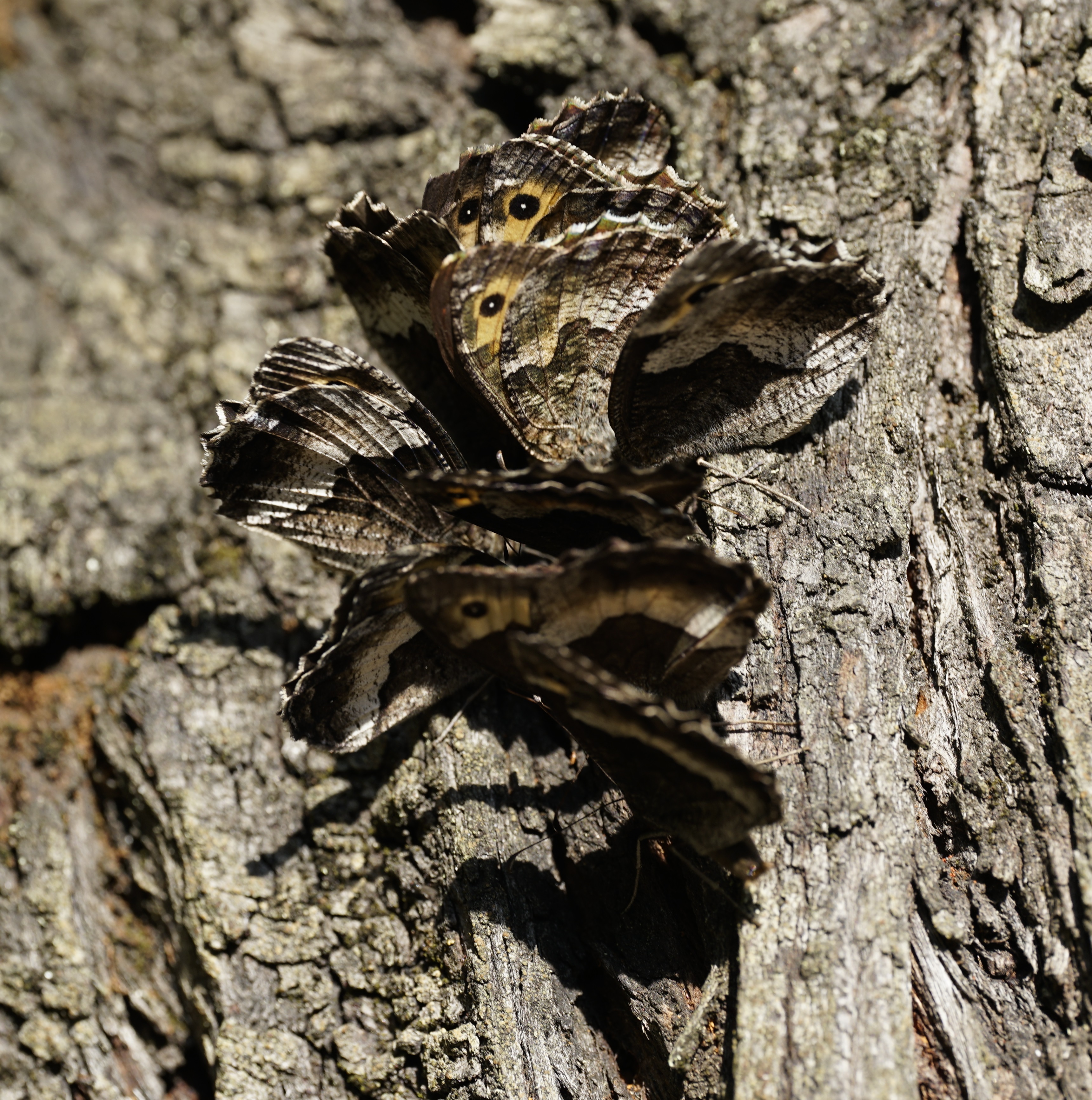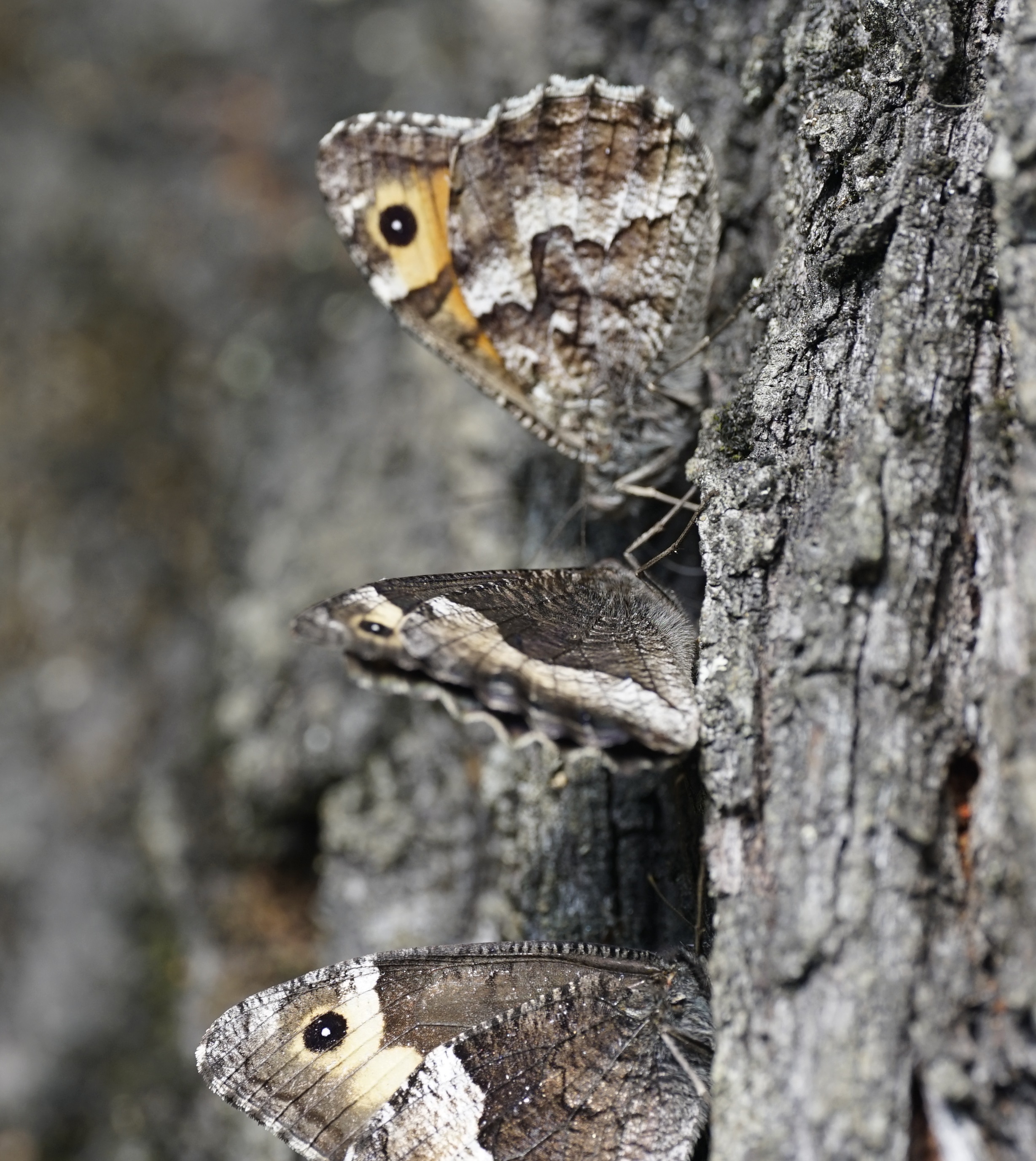 Leippe-Torno, 5. Juli 2022, an verletzter Rinde der Pflaume saugen auf engstem Raum bis zu 15 Falter gleichzeitig, Rostbinden und Waldpförtner. Sie lassen sich auch durch Anpusten und Berühren nicht vertreiben.