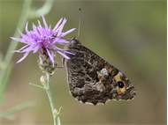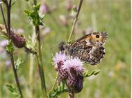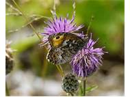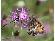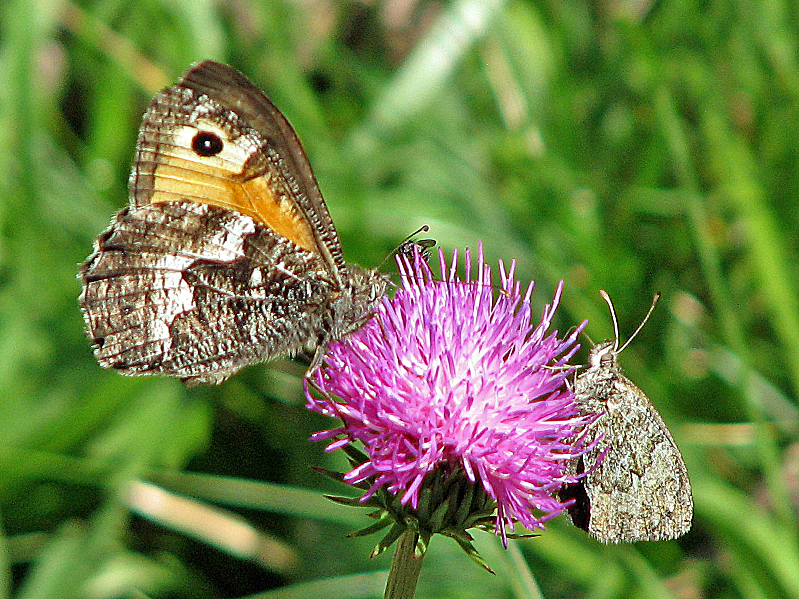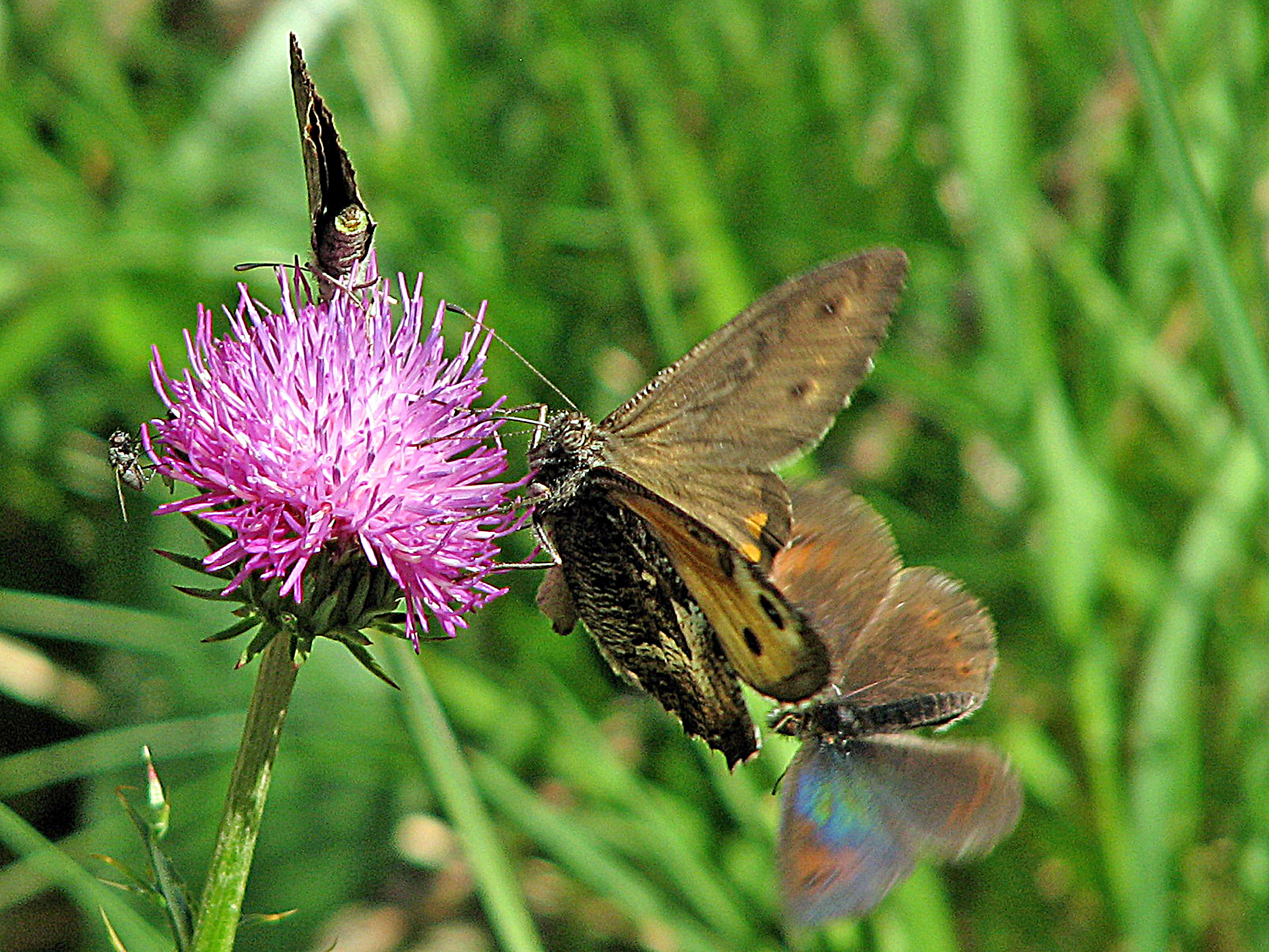Rostbinde, gemeinsam mit Schillernden Mohrenfaltern an einer Distelblüte, oberhalb von Pejo (Dolomiten), ca. 1600 m hoch gelegen, Ende Juli 2008