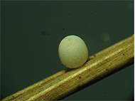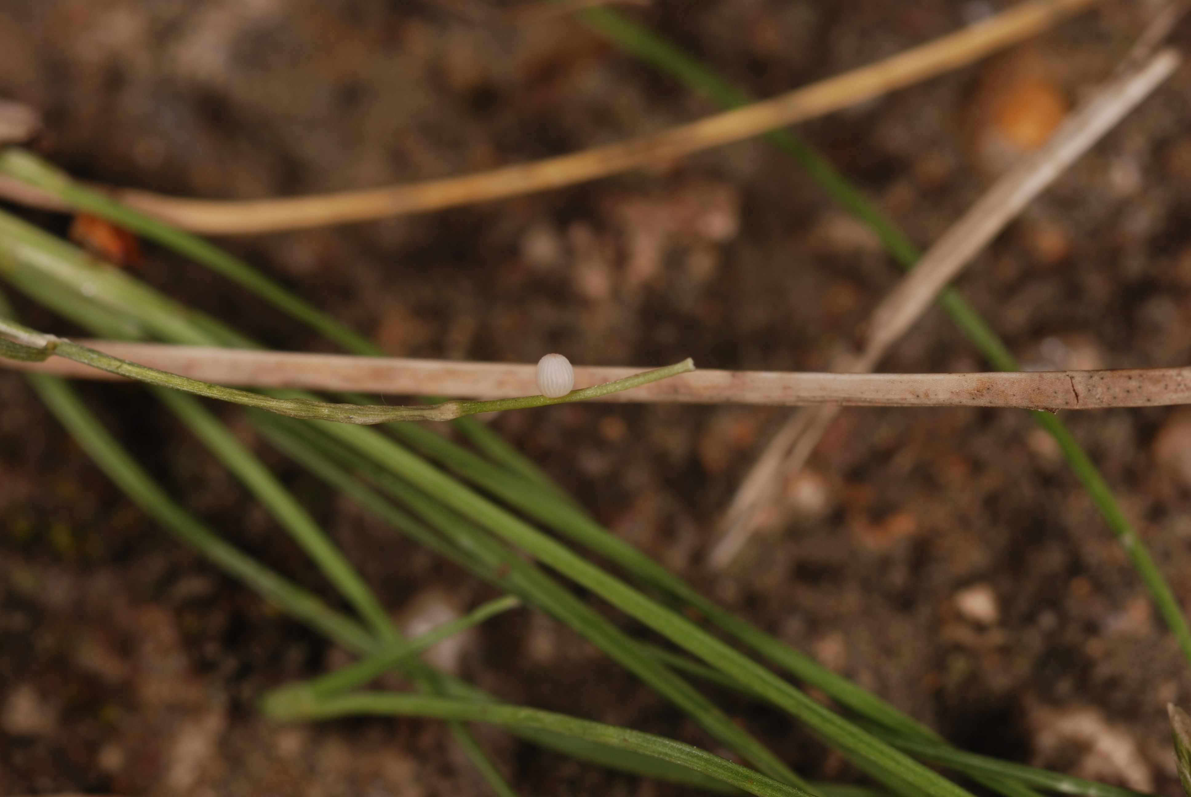 Am 27.8. 2016 legte das Weibchen einer Rostbinde dieses Ei an dürre Grashalme ab. Nochten, 27.08.2016.