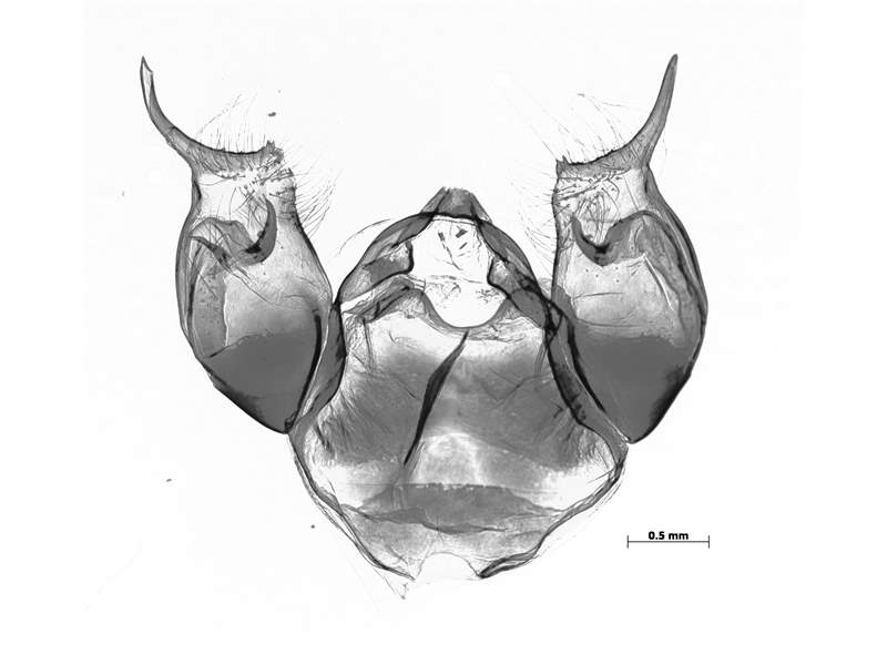 An dem männliche Kopulationsorgan befinden sich kleine, kaum ausgeprägte Harpen und der Processus posteriores besteht aus einer langen nach vorn weisenden Spitze.
