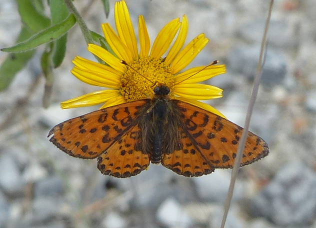 Flügeloberseiten orange mit schwarzen Adern sowie schwarzen Flecken, die eher einzeln und nur teilweise zusammenhängend sind. Außenrand schwarz, Fransen schwarz-weiß gescheckt. Das Männchen in der Grundfarbe intensiv orange, das Weibchen braun-orange.
