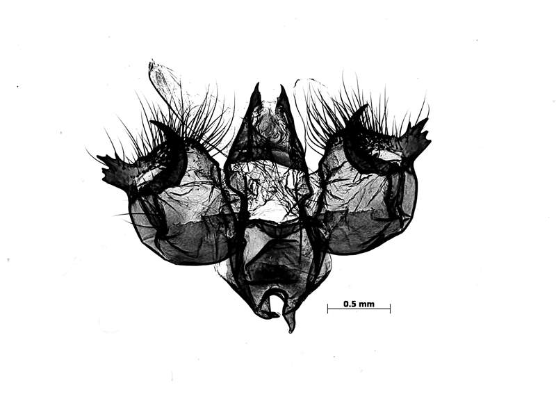 Das männliche Kopulationsorgan besitzt einen Uncus mit zwei enggestellten und hakenförmig zugeneigten Spitzen. Von dem fast quadratischen und zangenförmigen Processus posteriores sind stark voneinander abweichende Formen bekannt (Urbahn 1952; Segerer 2001).
