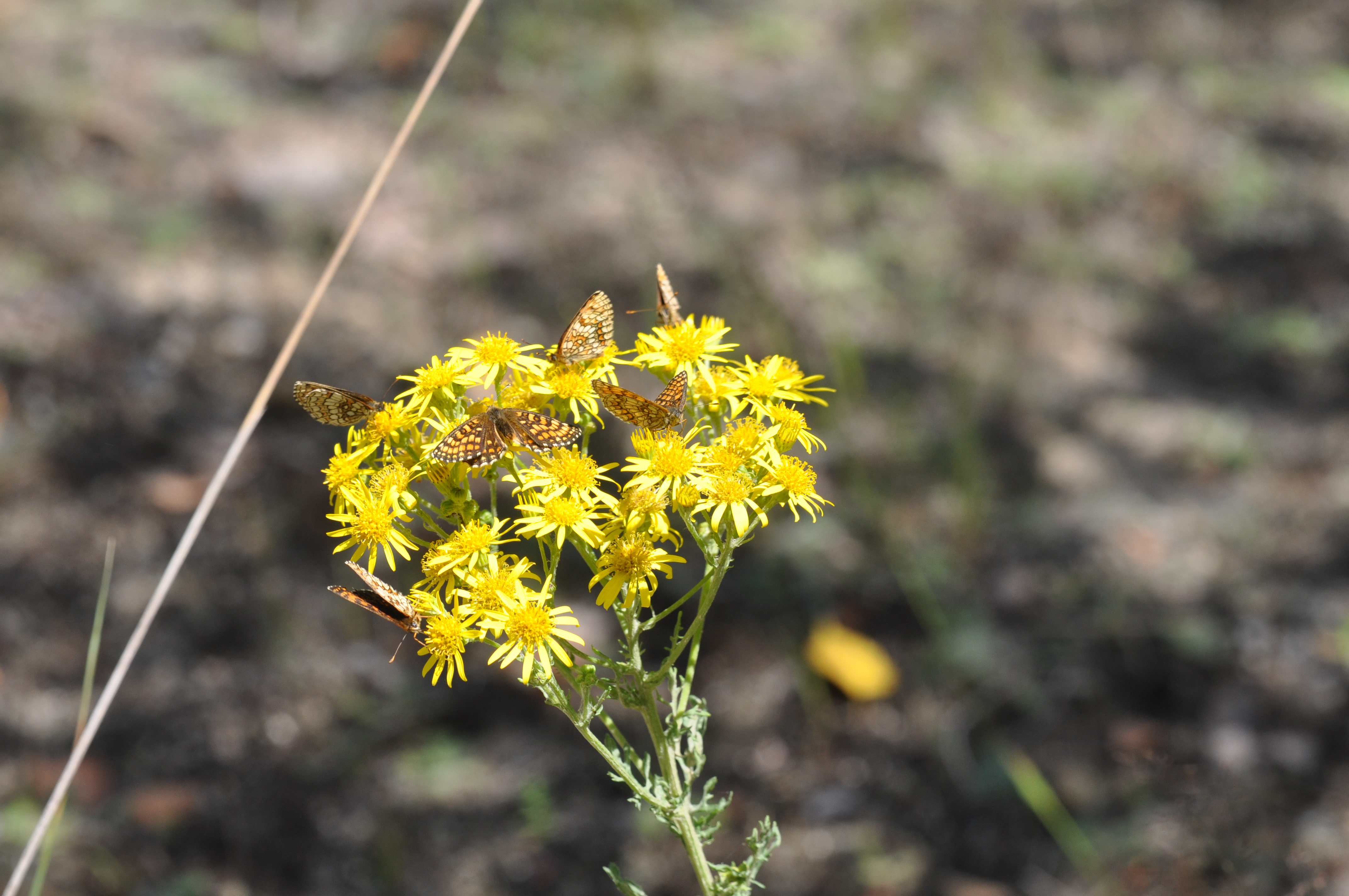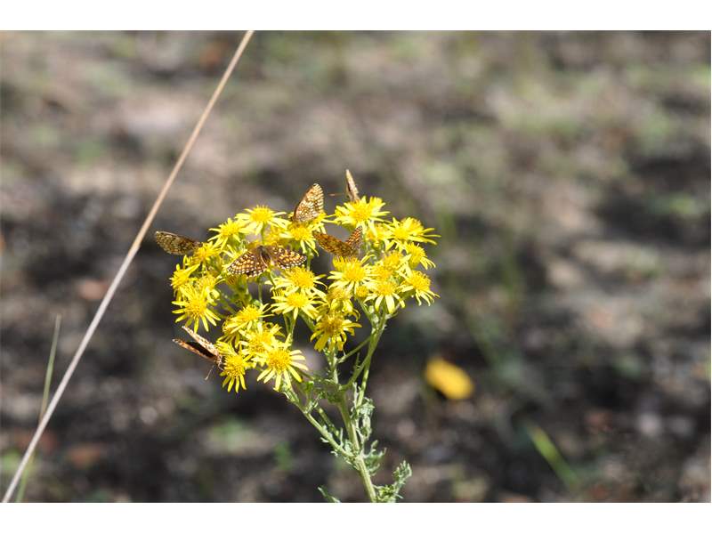 Mehrere Wachtelweizenscheckenfalter tummeln sich auf einem Blütenstand des Jakobskreuzkrautes. Juli 2014, nordwestlich Bärwalde (© Matthias Nuß)( Bild vergrößern)