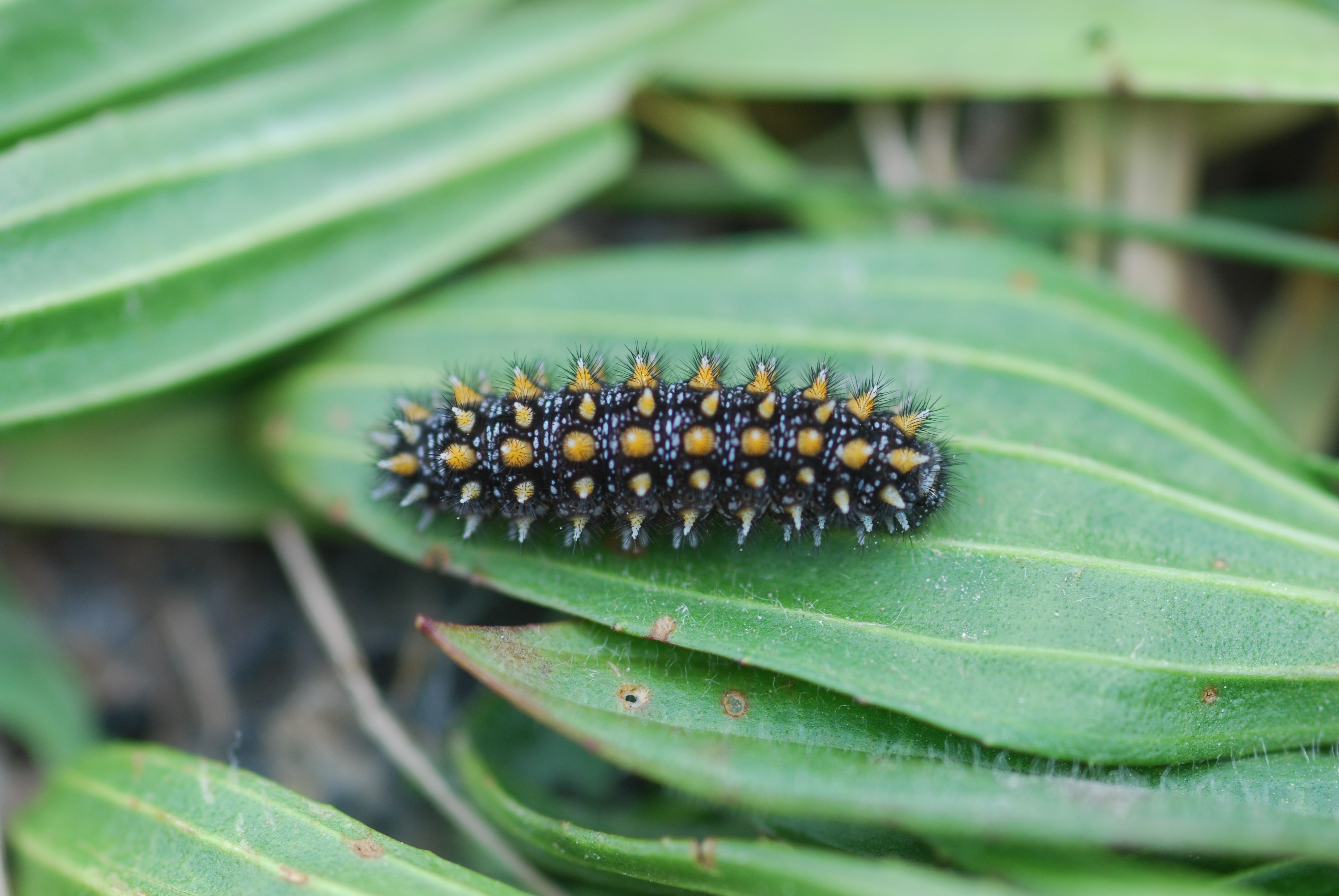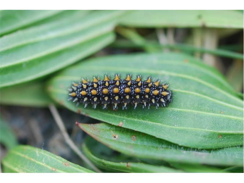 Erwachsene Larve von Melitaea athalia auf Wegerich ( Plantago) (© Susanne Kurze)( Bild vergrößern)