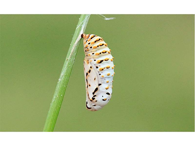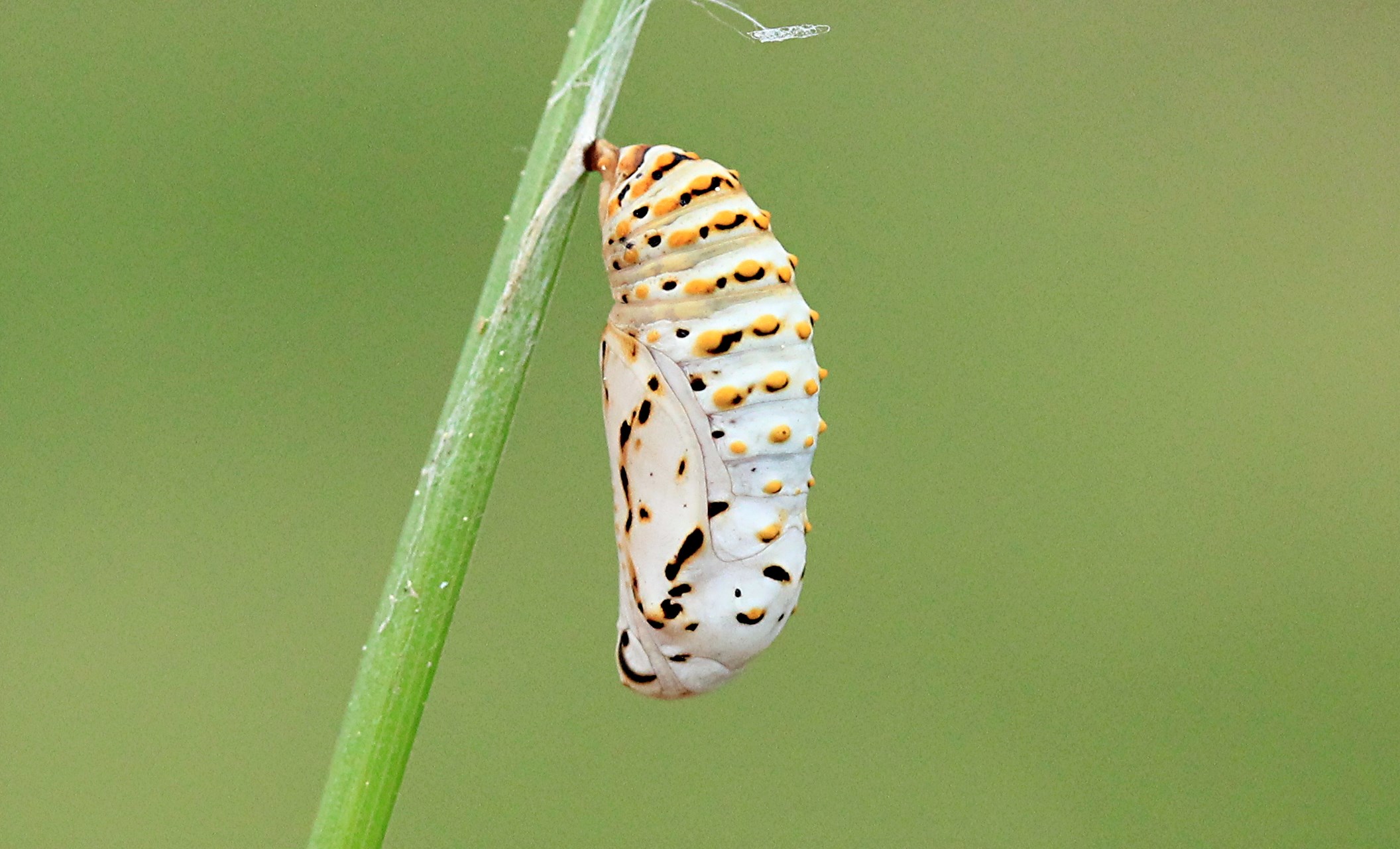 Die aurinia-Larven verpuppen sich an dürrem Gras als Stürzpuppe. Mit ihrer weißen Grundfärbung und die orangen Flecken sind sie gut getarnt und unverwechselbar