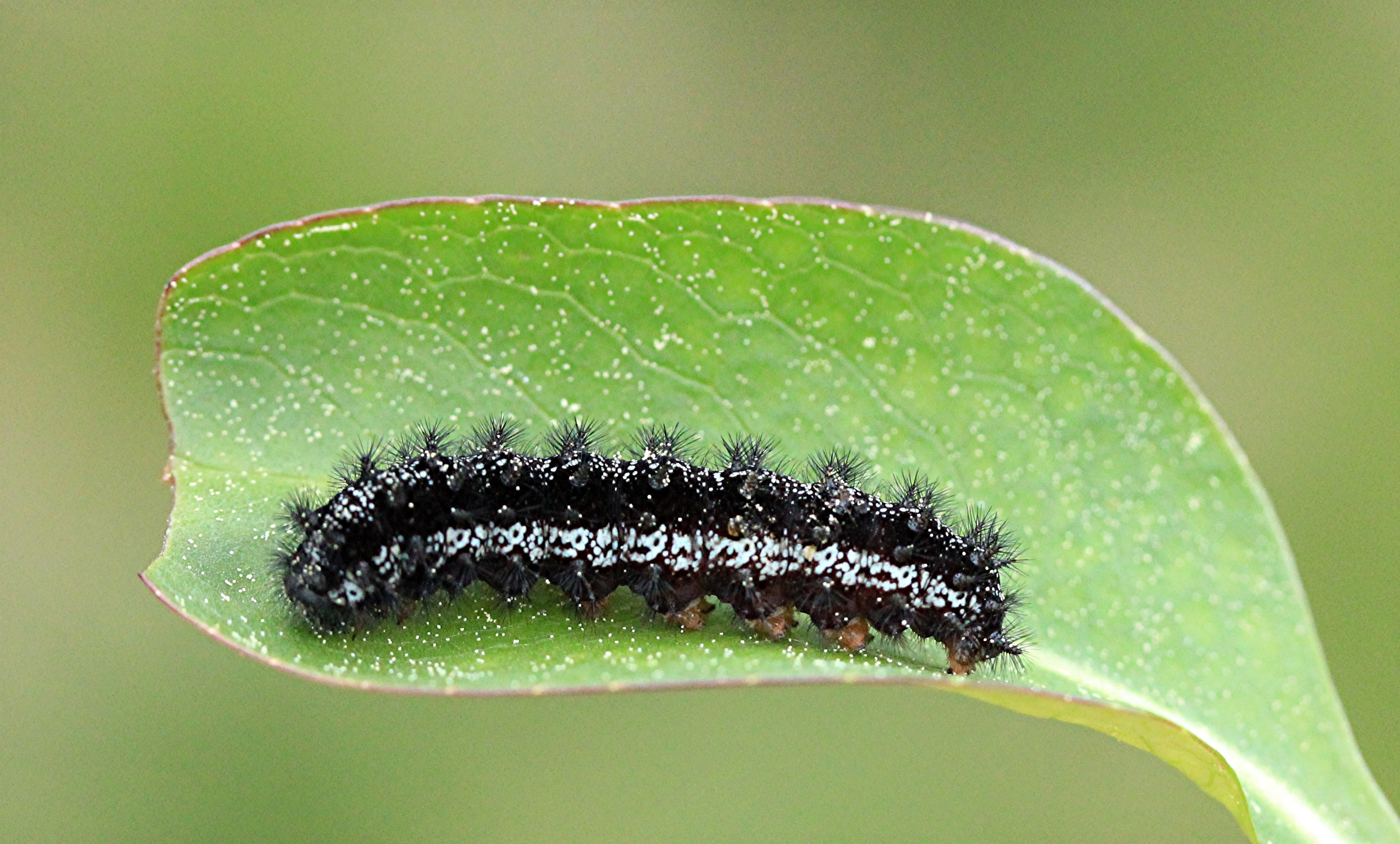 Larve am Blatt des Teufelsabbiss. Vogtland, April 2014