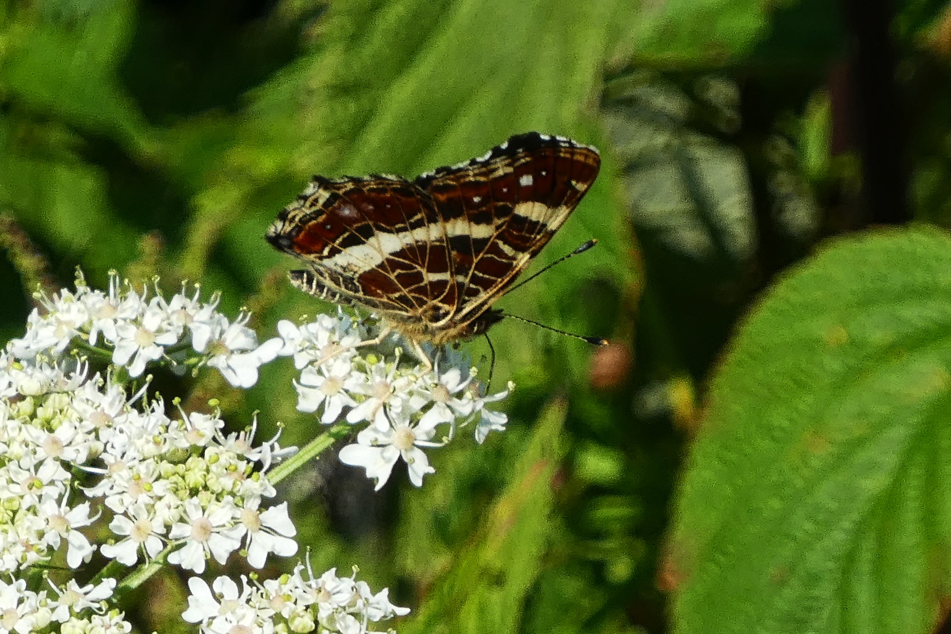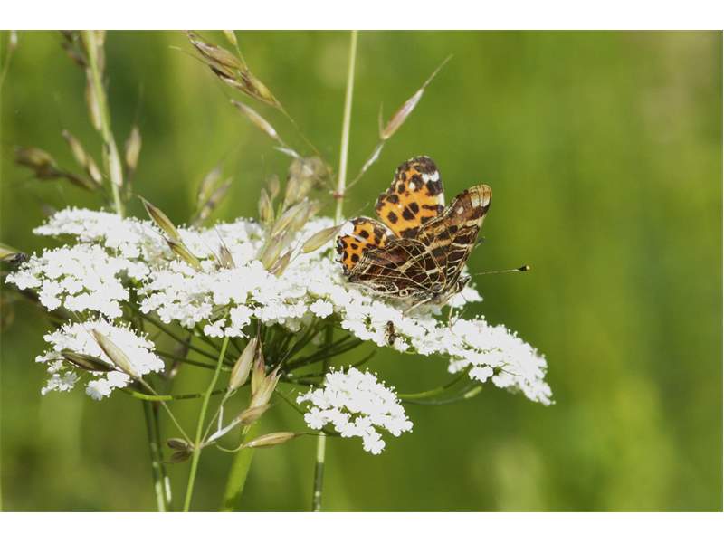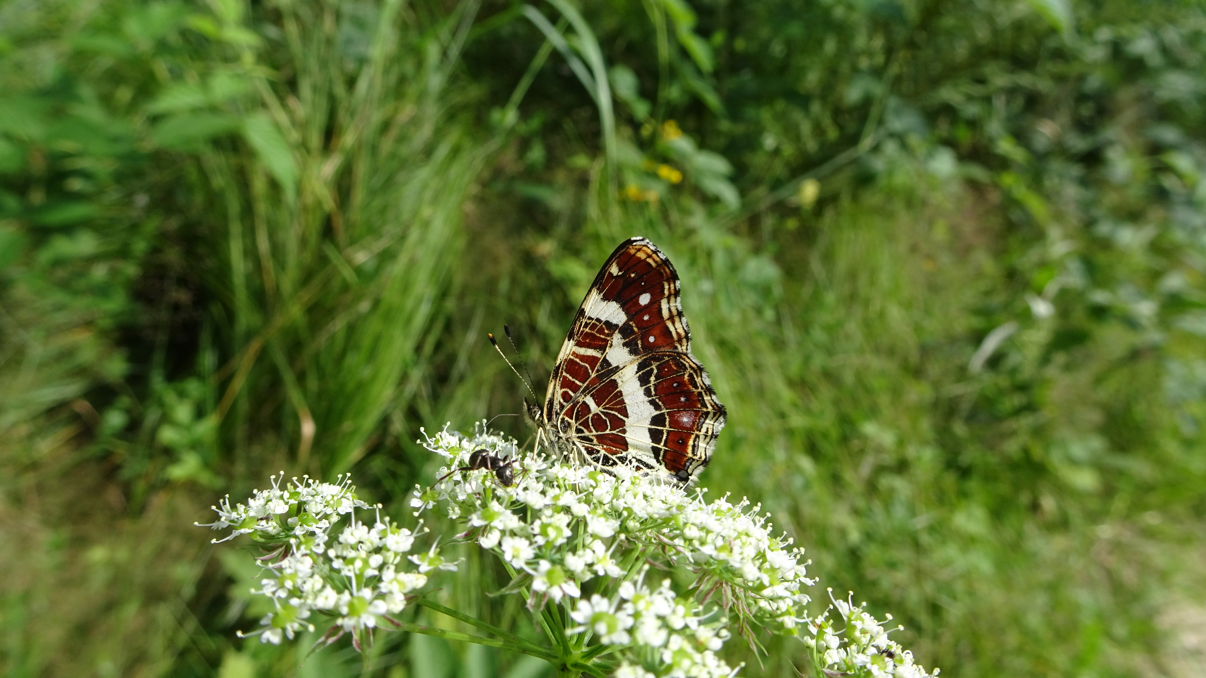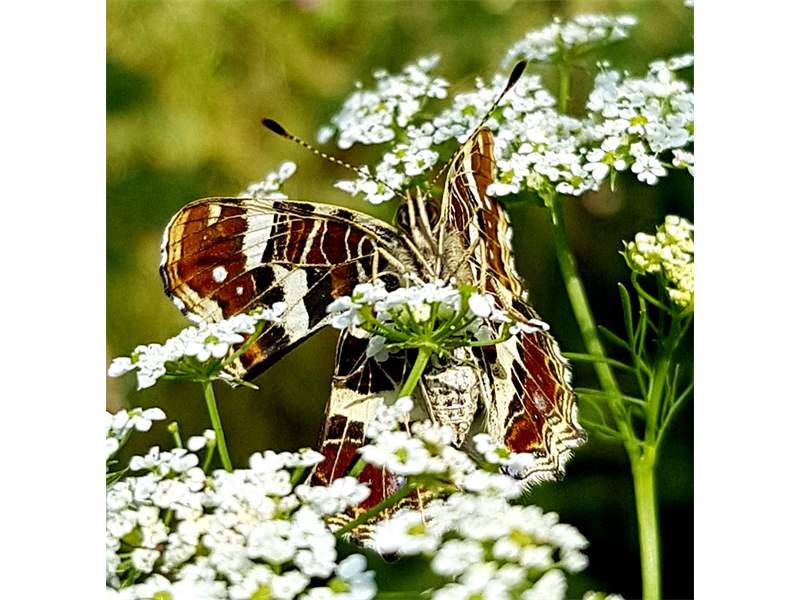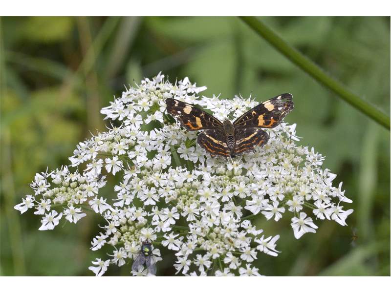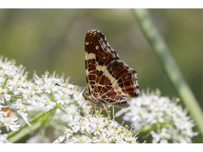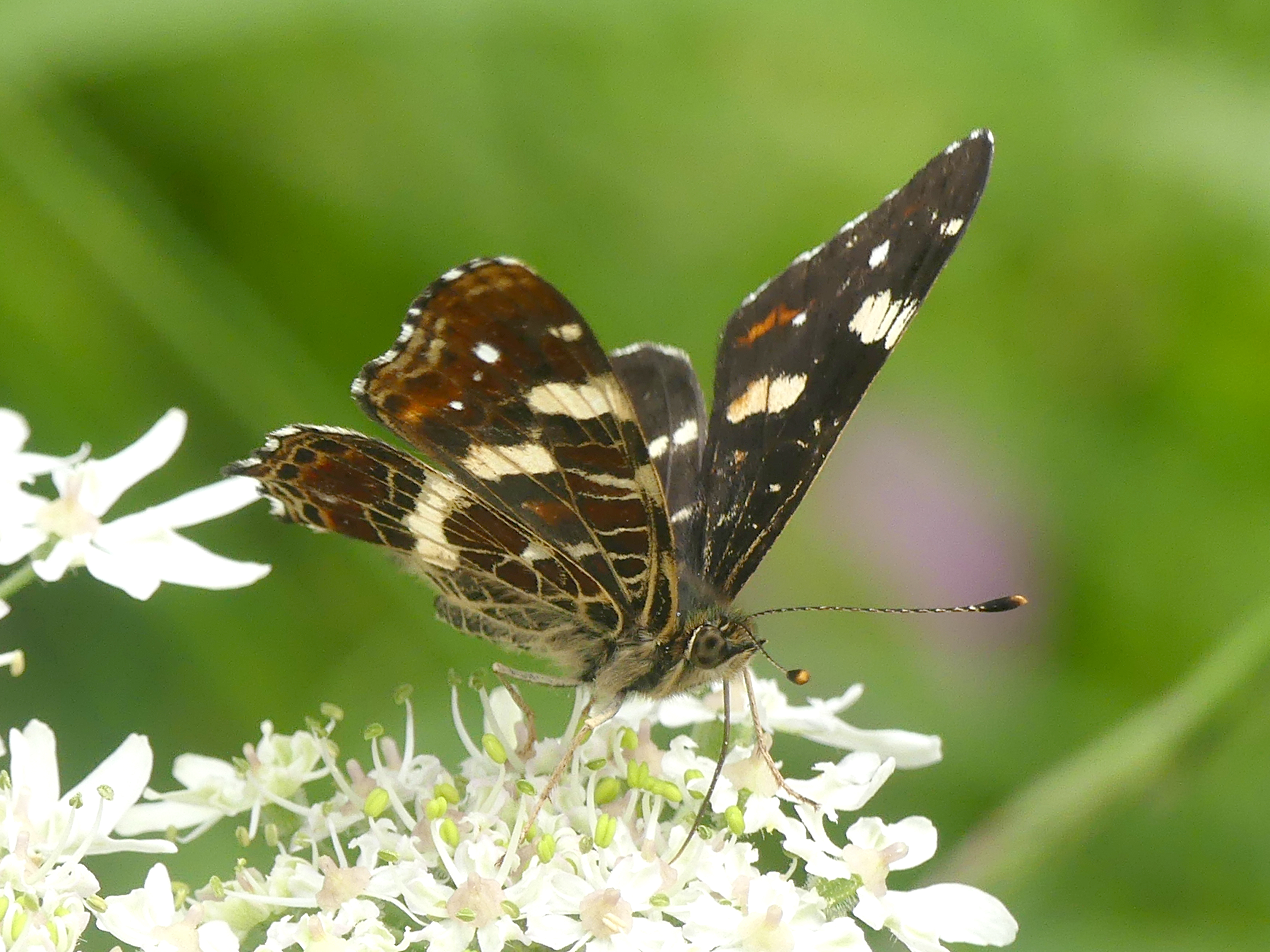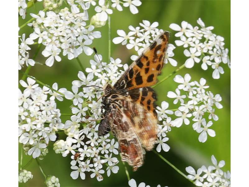 Landkärtchen, Sommergeneration der Schmetterlingsart auf Nektarspender Doldenblüte fotografiert, Falteroberseite im Sichtfeld, Ende Juni 2022, Auwald bei 06254 Horburg-Masslau (Sachsen-Anhalt) (© Heinz Sass)( Bild vergrößern)