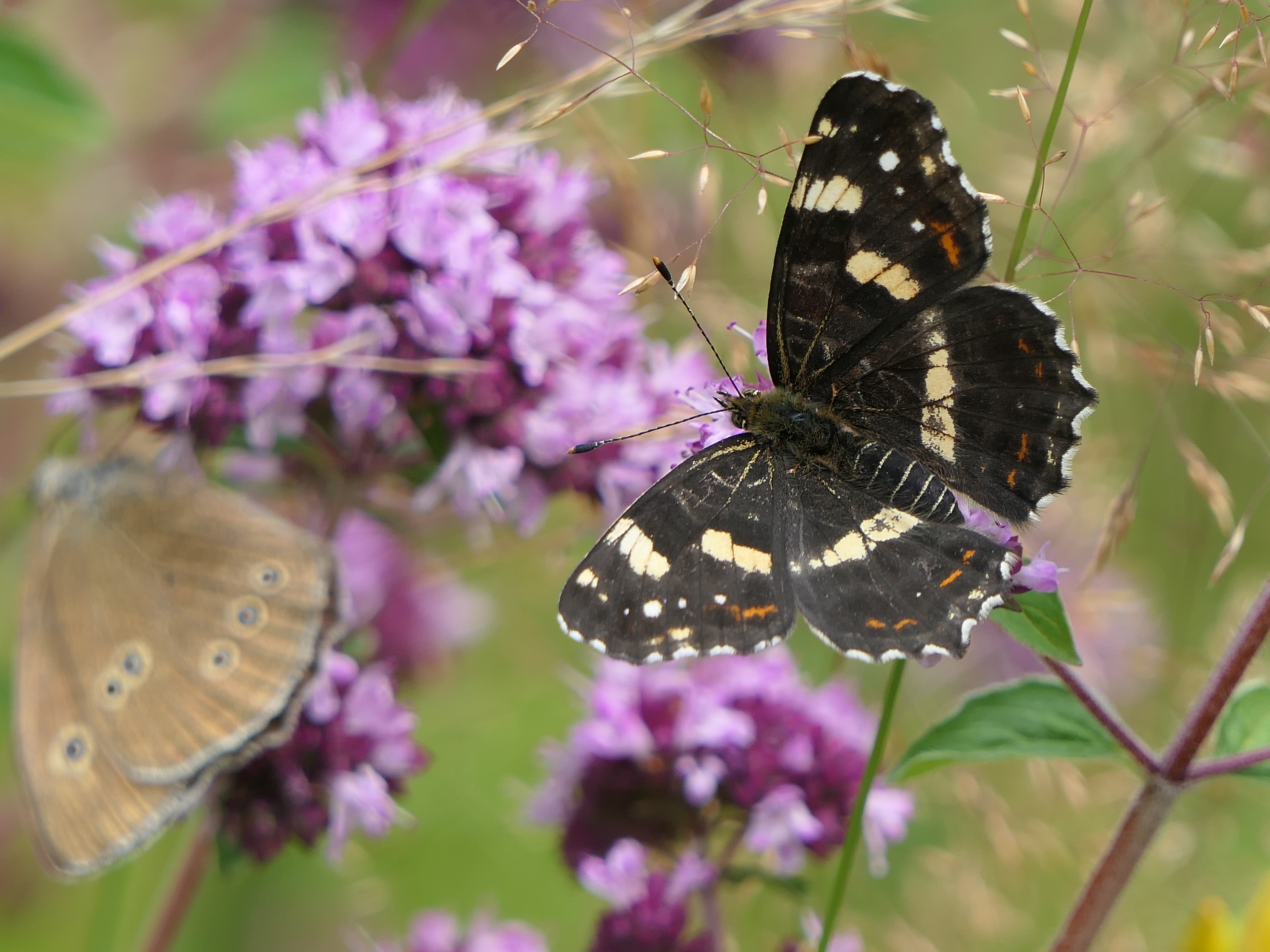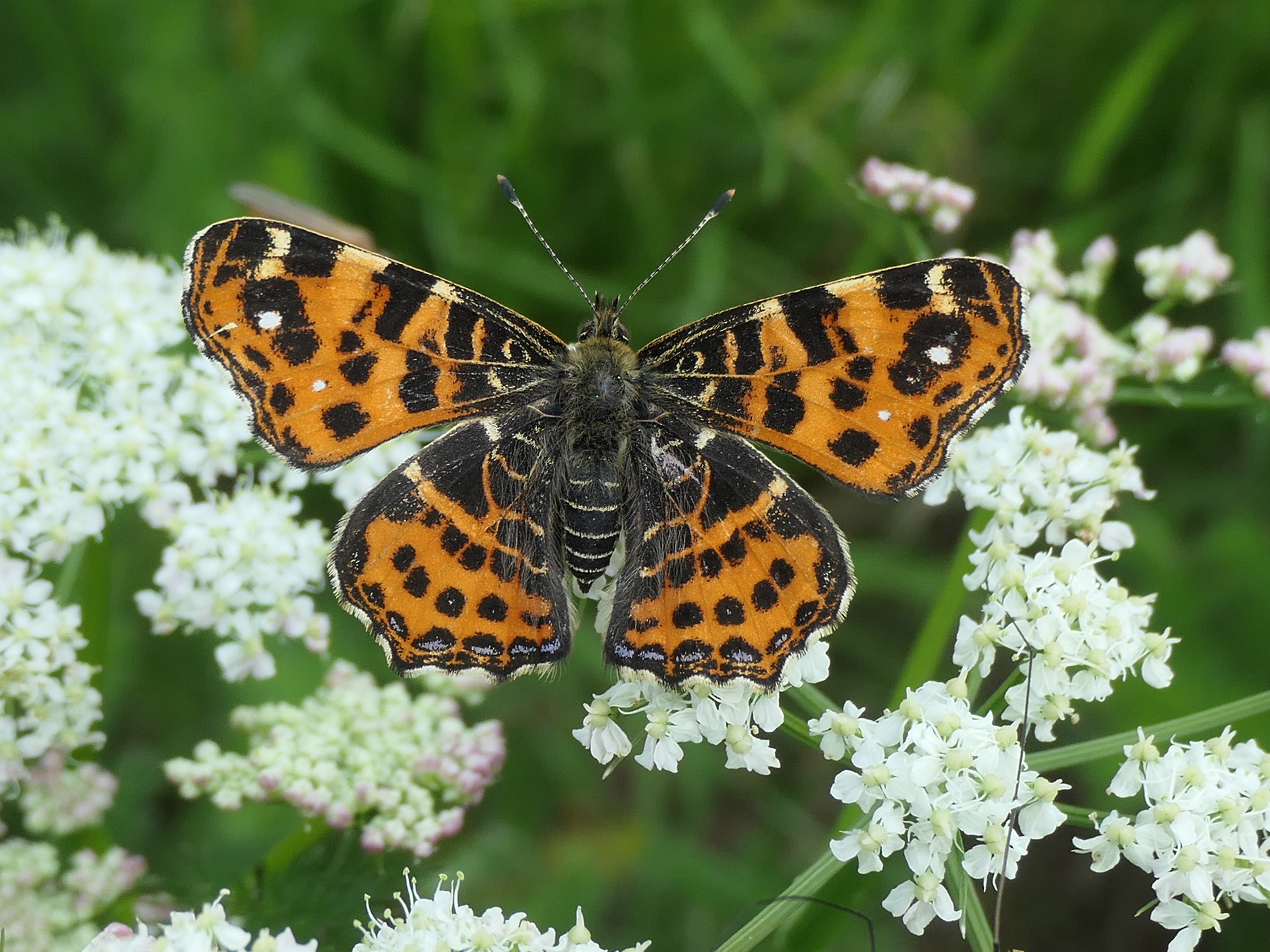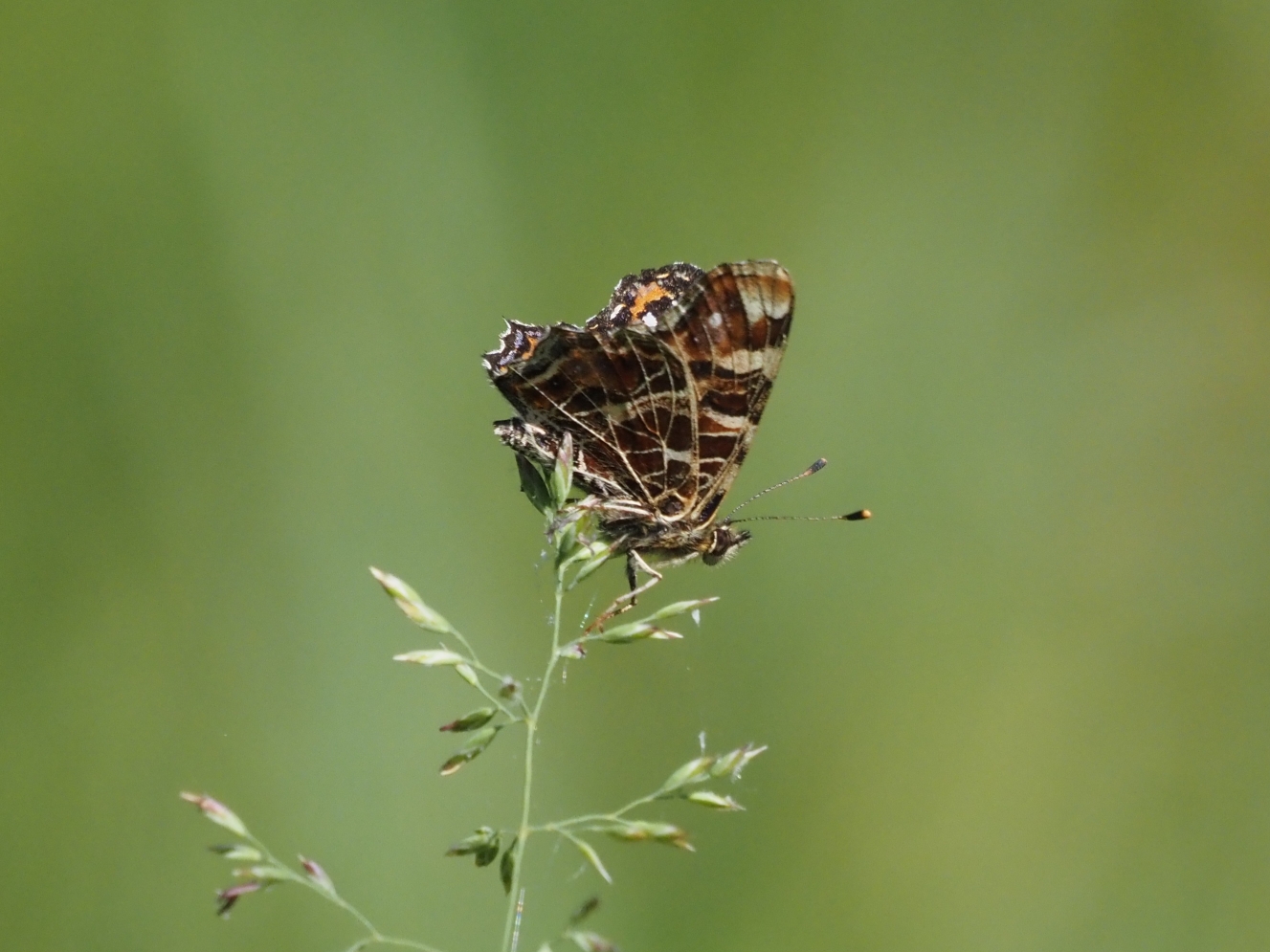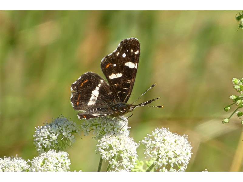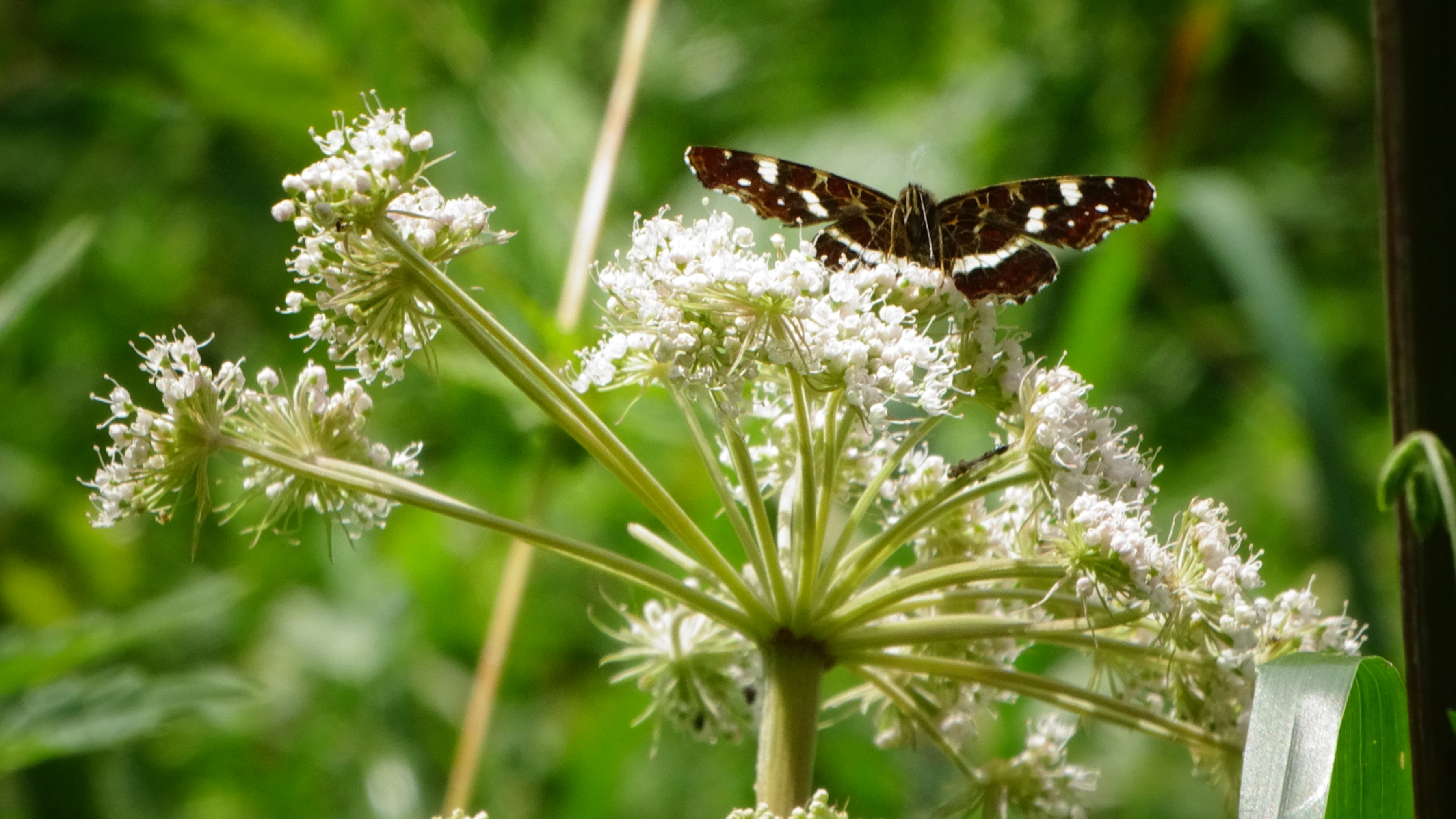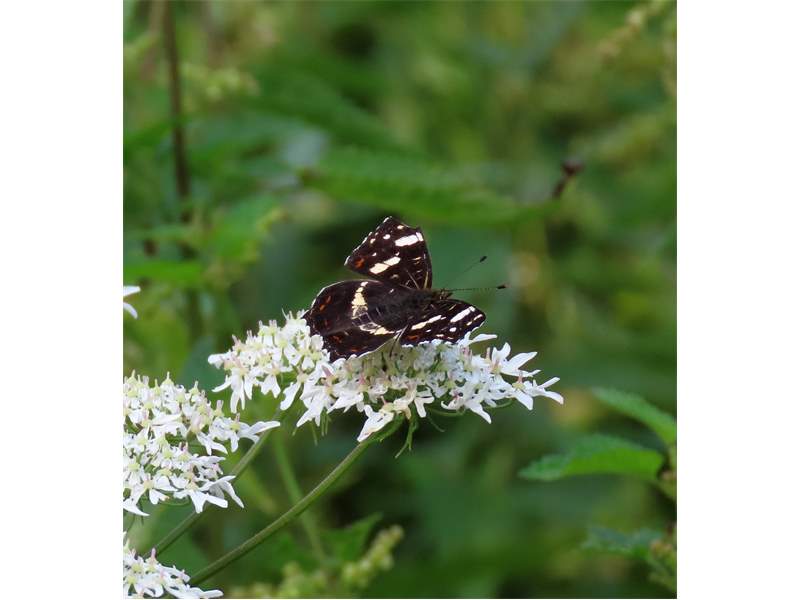 Landkärtchen, Sommergeneration der Schmetterlingsart auf Nektarspender Doldenblüte fotografiert, Falteroberseite im Sichtfeld, Ende Juni 2022, Auwald bei 06254 Horburg-Masslau (Sachsen-Anhalt) (© Heinz Sass)( Bild vergrößern)