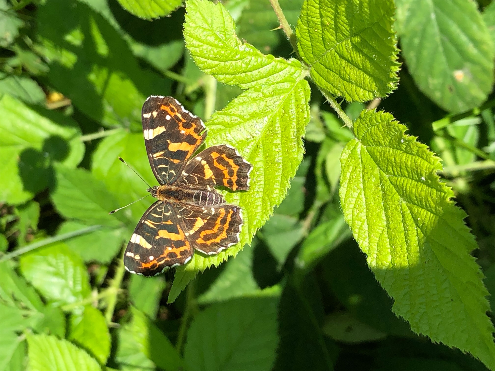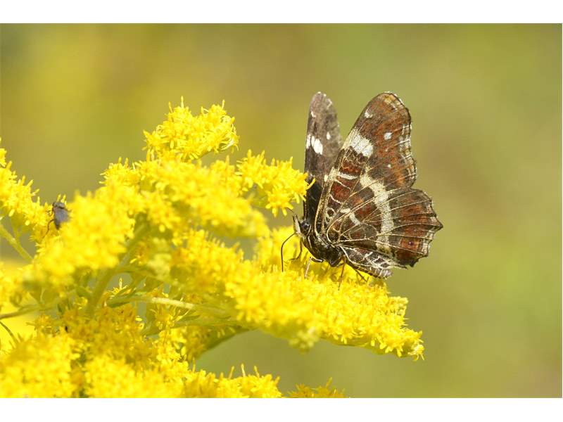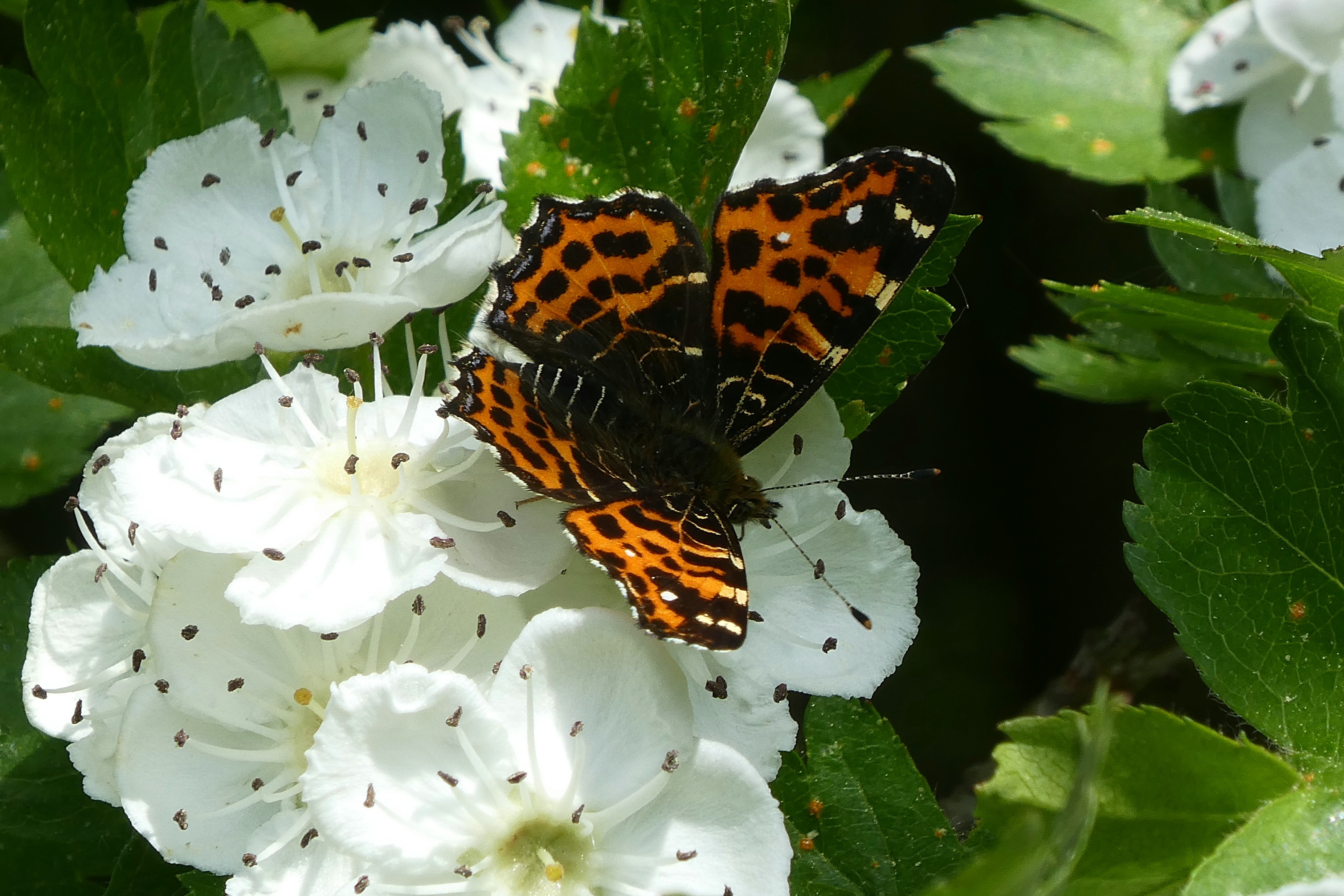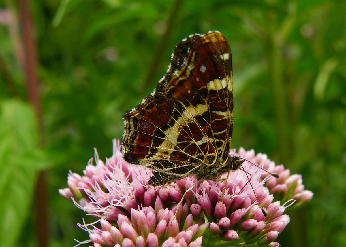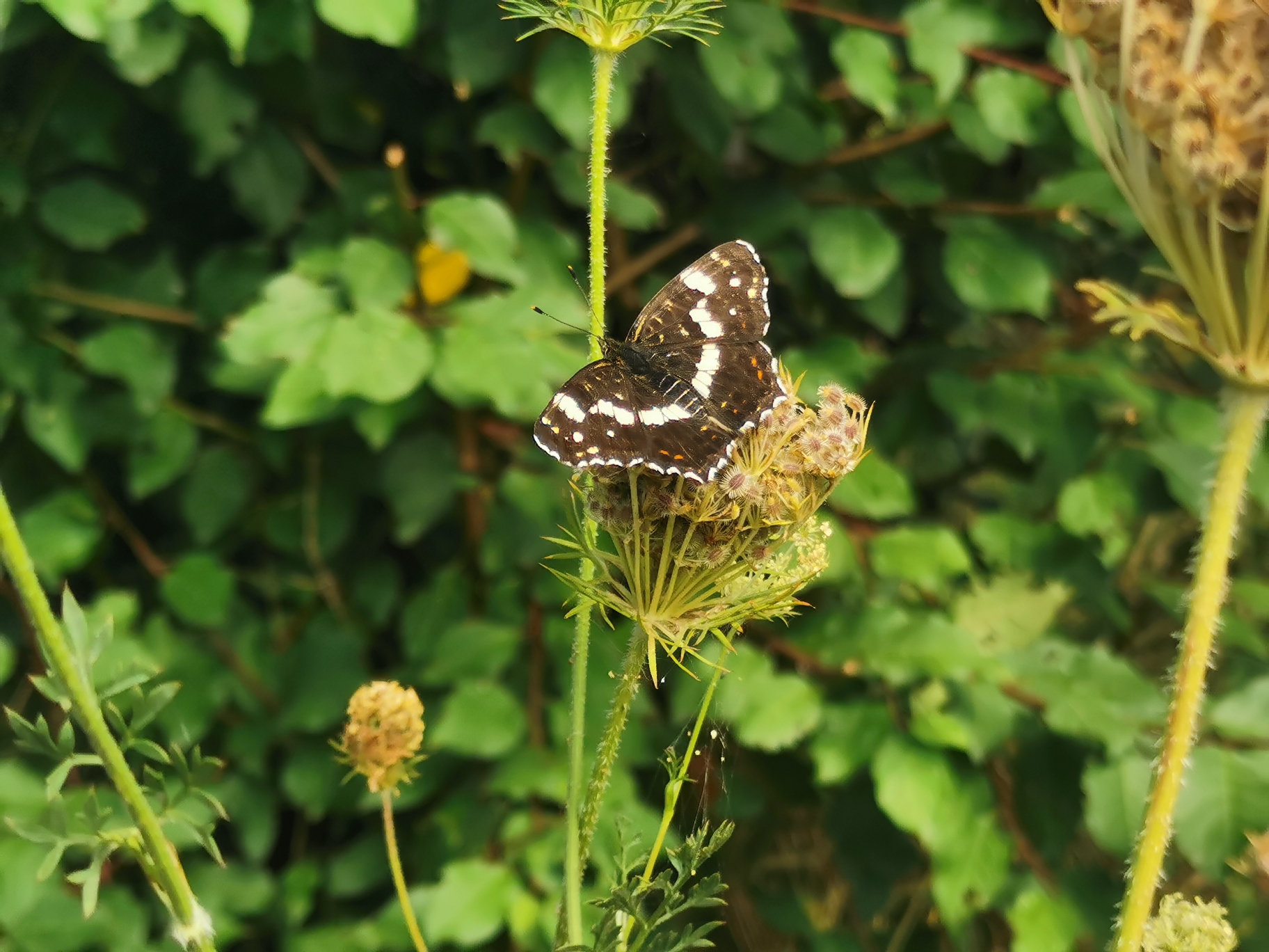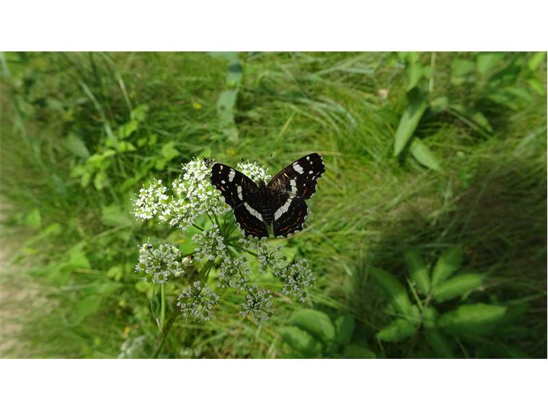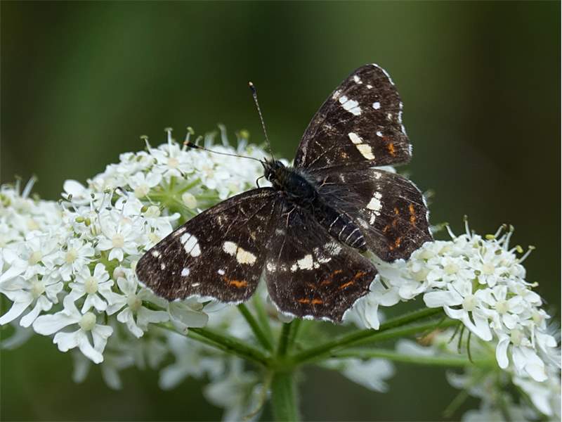 Landkärtchen, Sommergeneration der Schmetterlingsart auf Nektarspender Doldenblüte fotografiert, Falteroberseite im Sichtfeld, Ende Juni 2022, Auwald bei 06254 Horburg-Masslau (Sachsen-Anhalt) (© Heinz Sass)( Bild vergrößern)