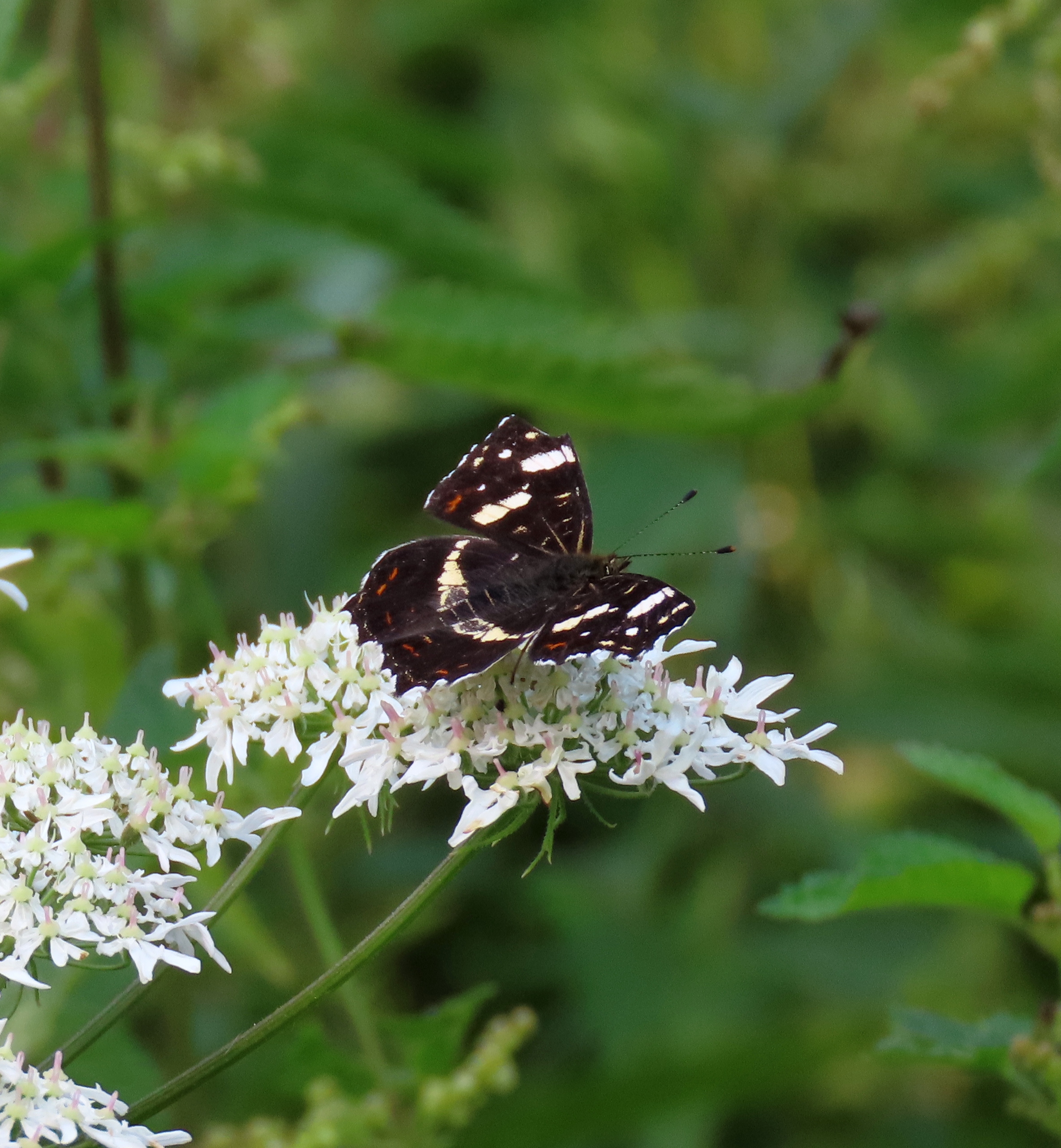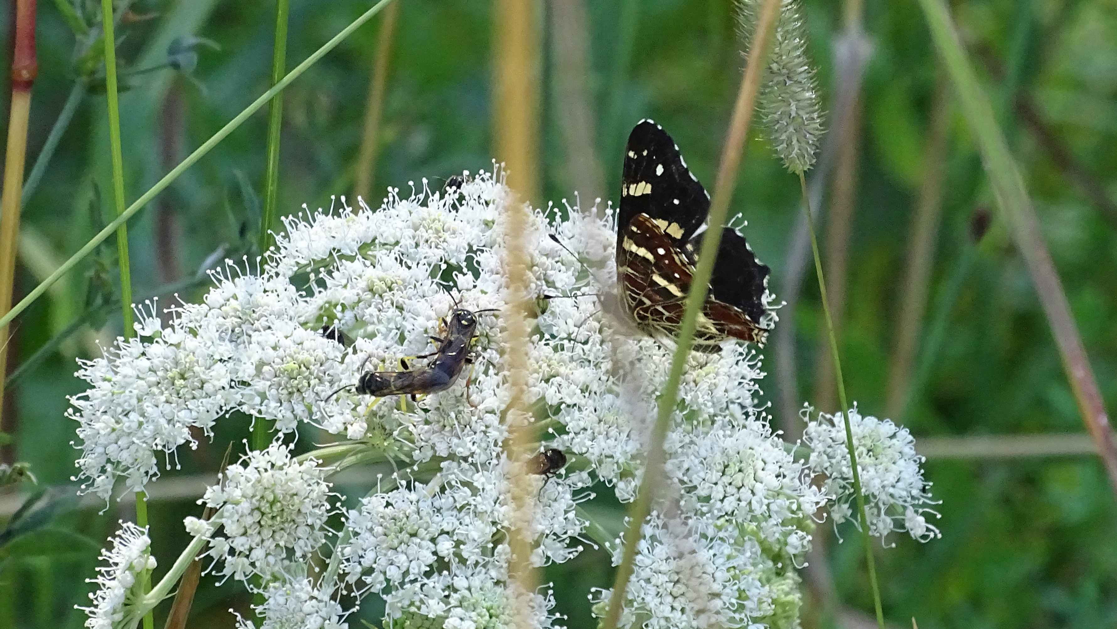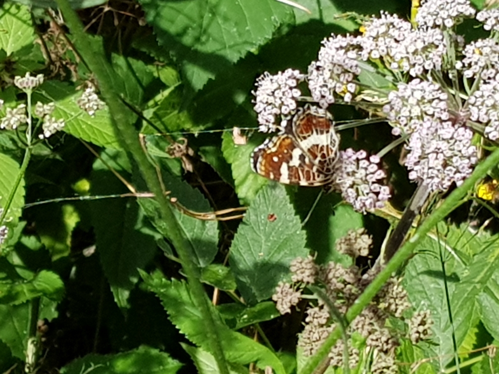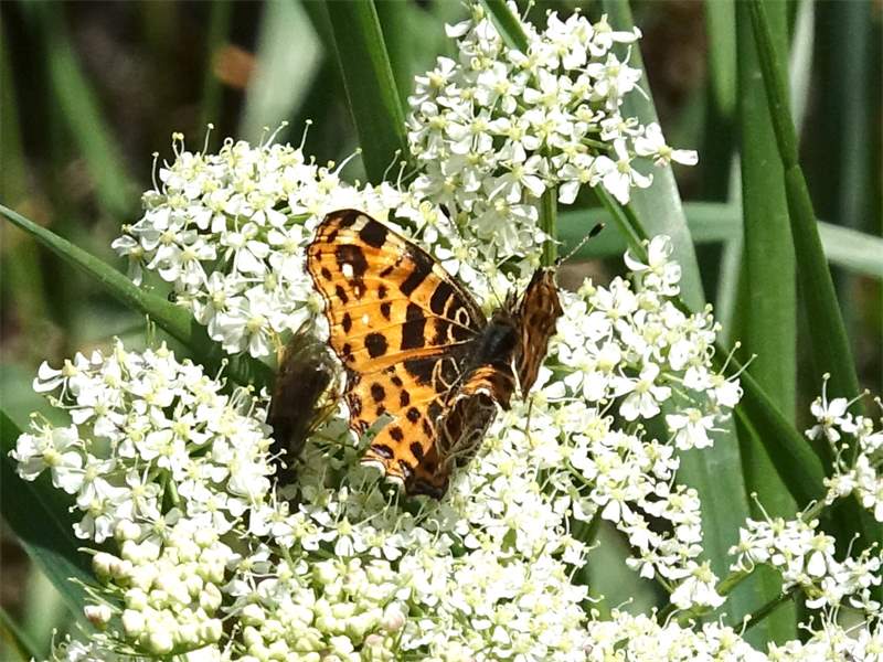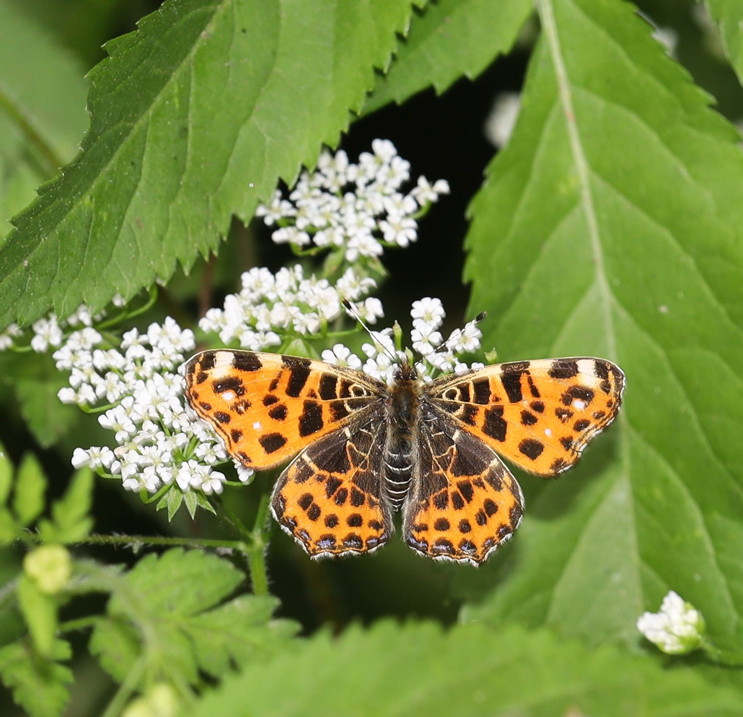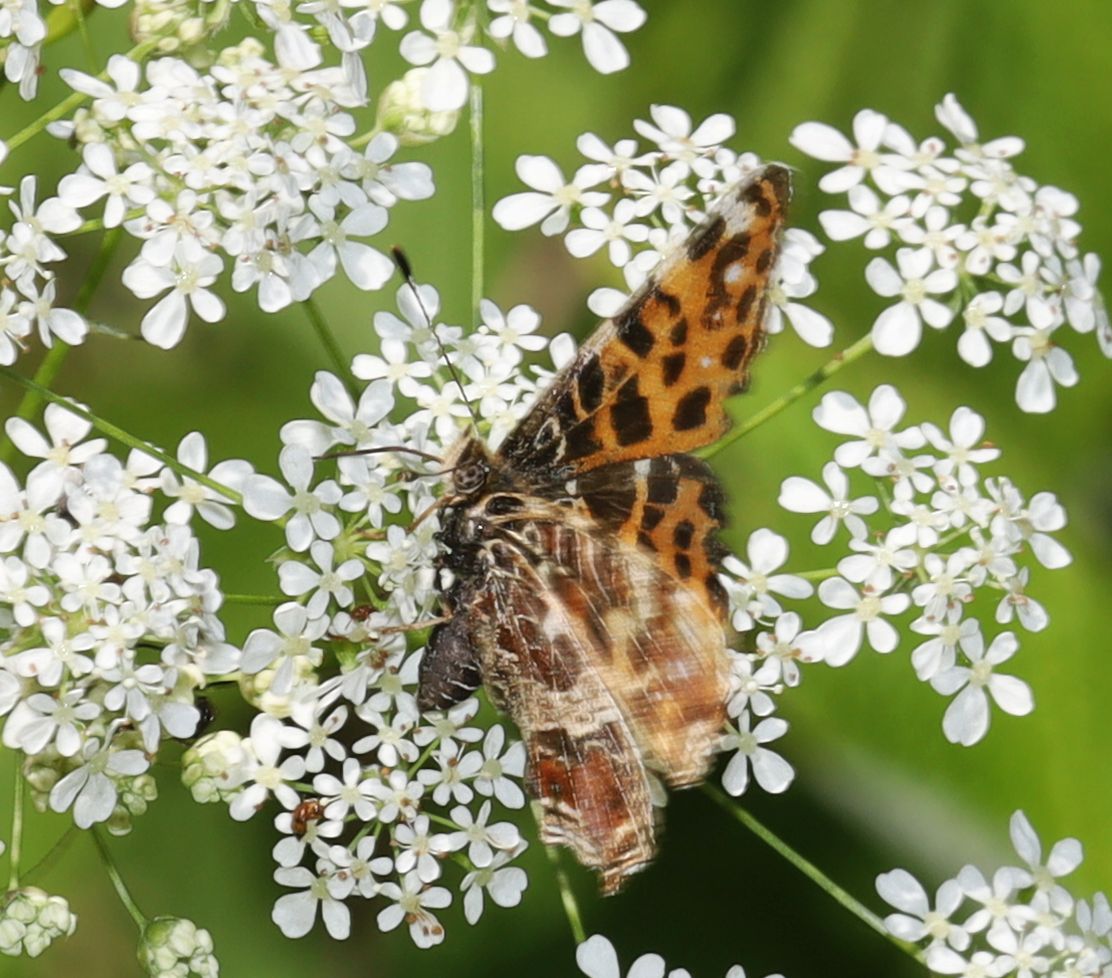 Landkärtchen, Sommergeneration der Schmetterlingsart auf Nektarspender Doldenblüte fotografiert, Falteroberseite im Sichtfeld, Ende Juni 2022, Auwald bei 06254 Horburg-Masslau (Sachsen-Anhalt)