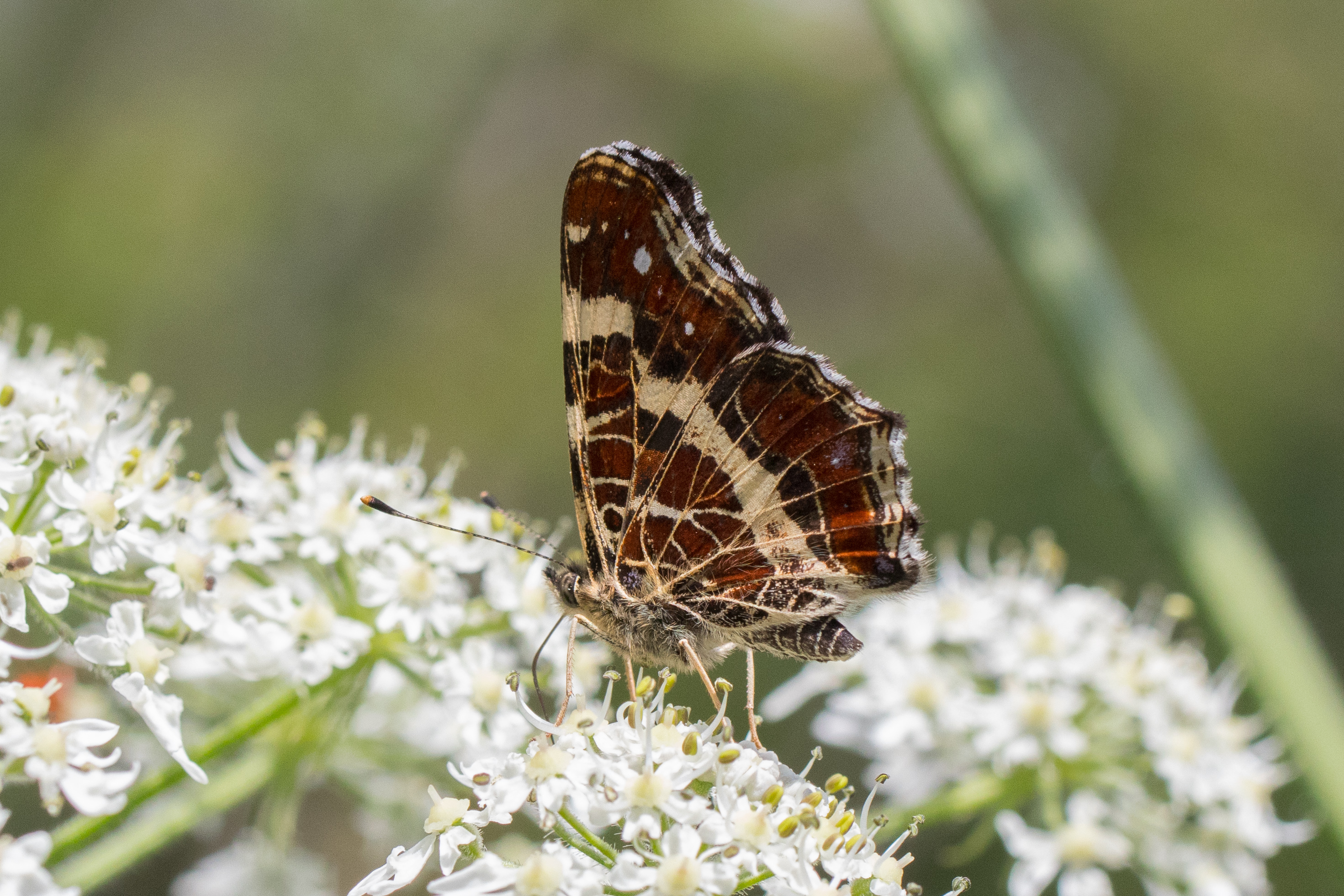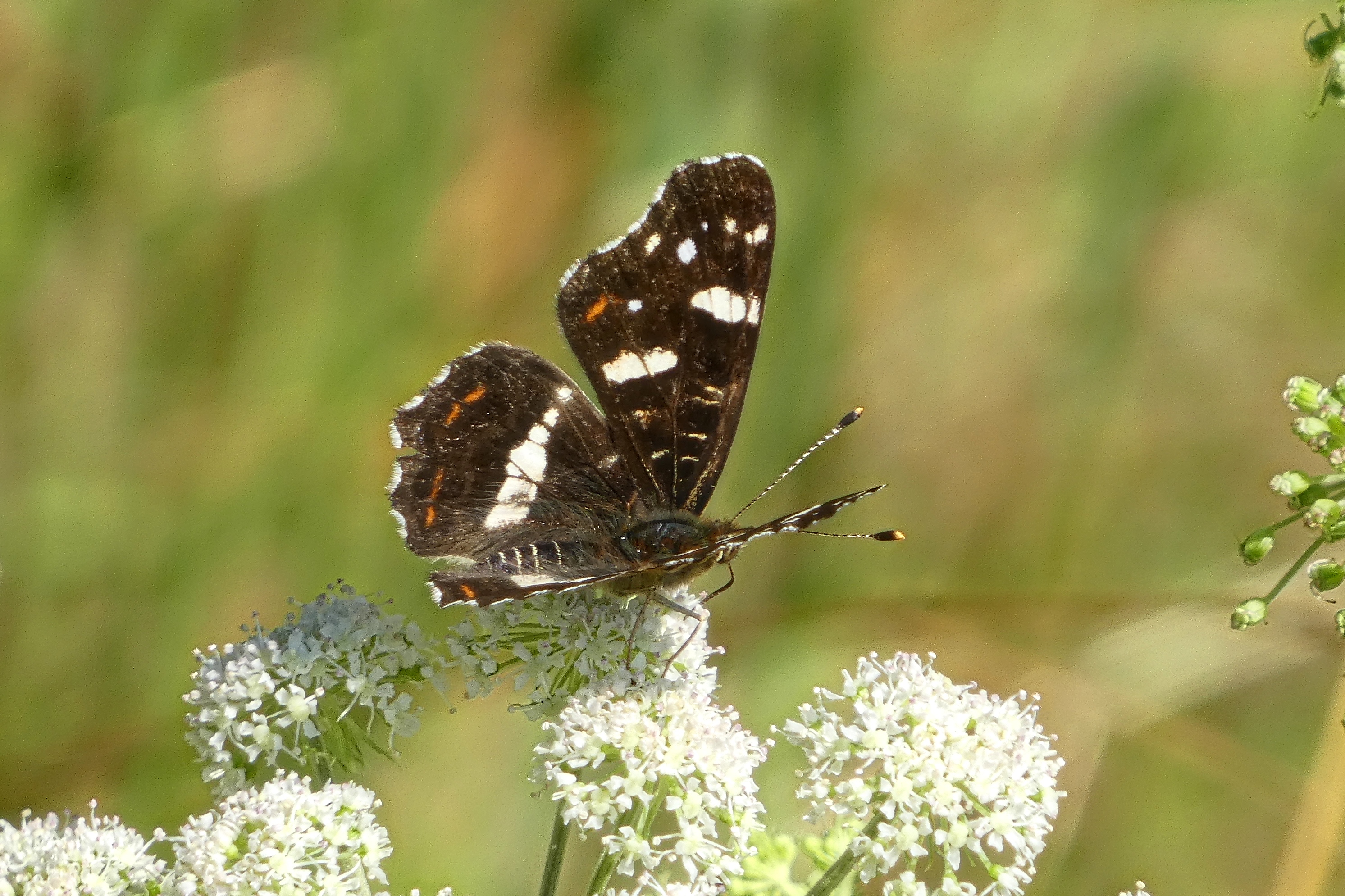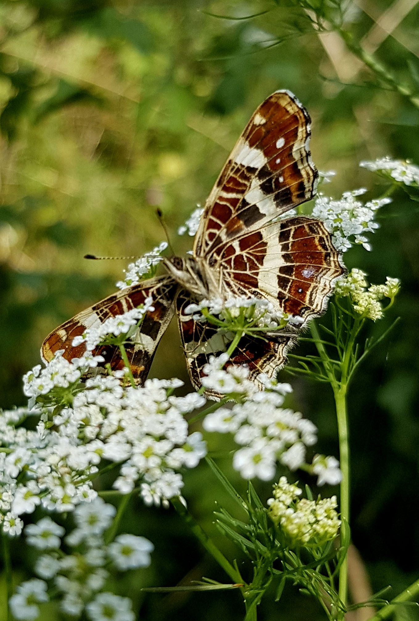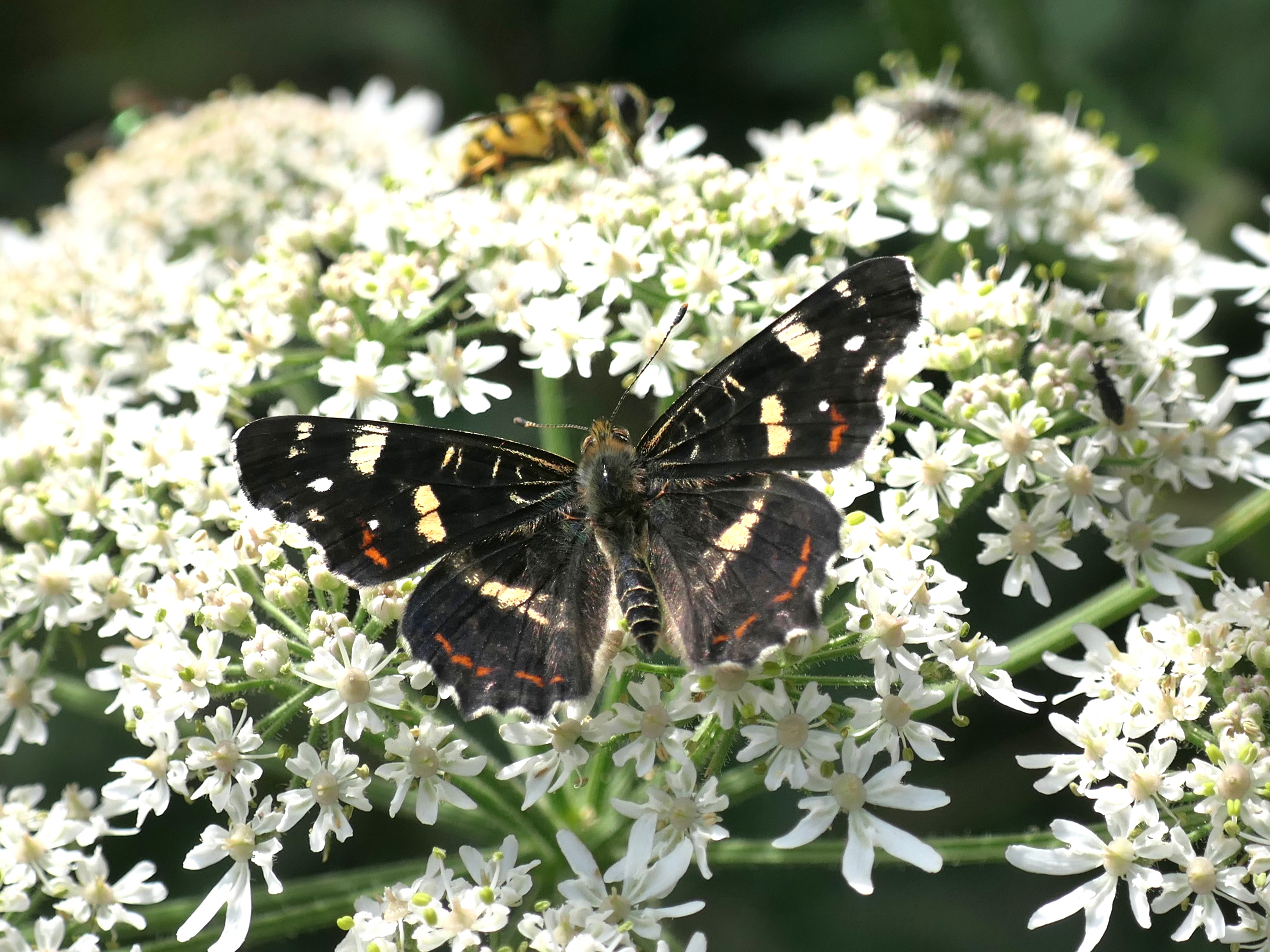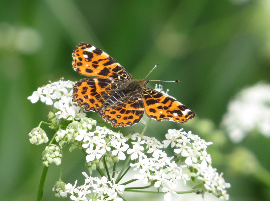 Landkärtchen, Sommergeneration der Schmetterlingsart auf Nektarspender Doldenblüte fotografiert, Falteroberseite im Sichtfeld, Ende Juni 2022, Auwald bei 06254 Horburg-Masslau (Sachsen-Anhalt)