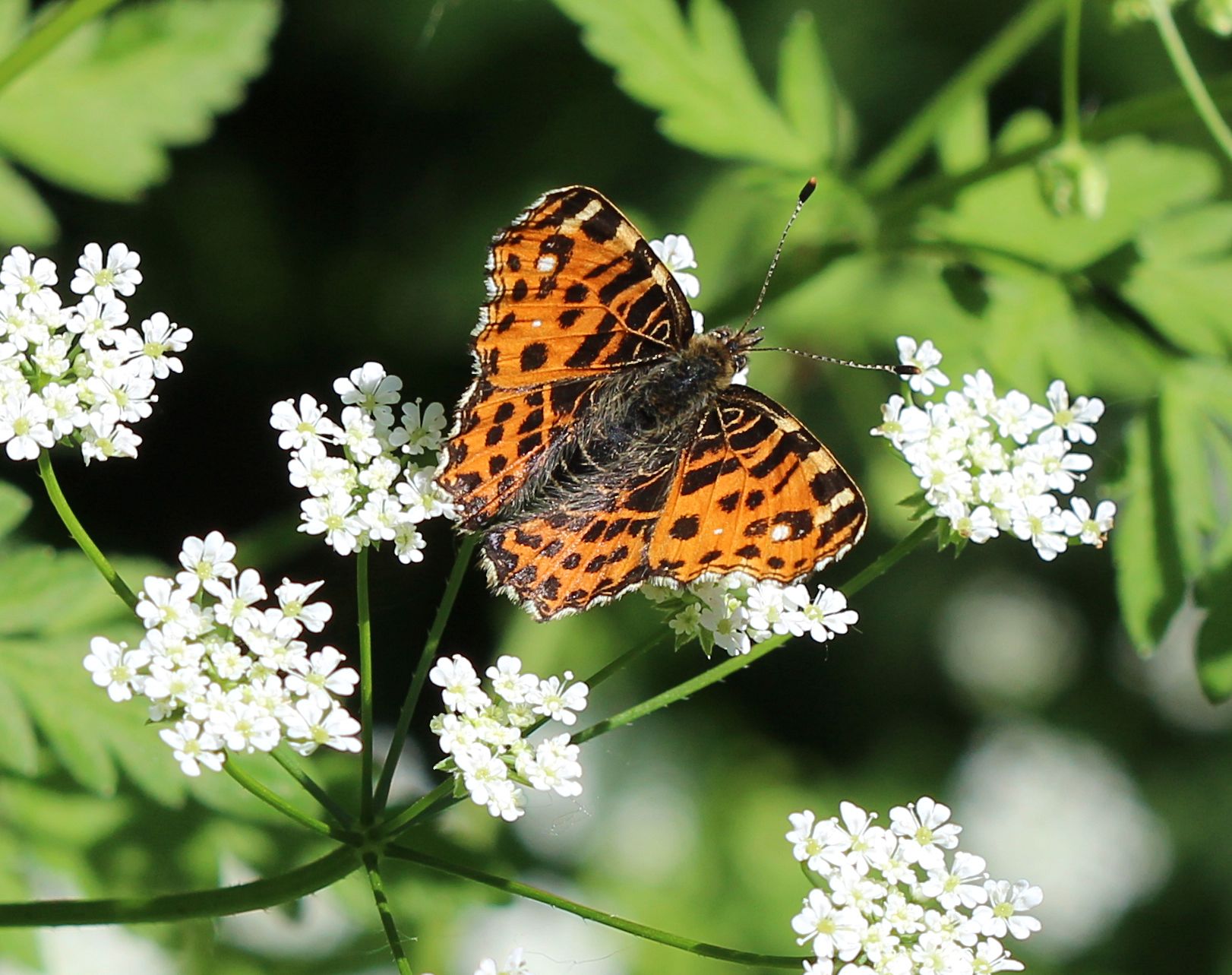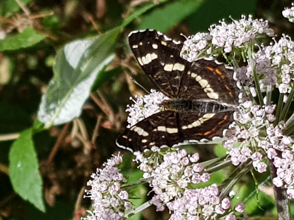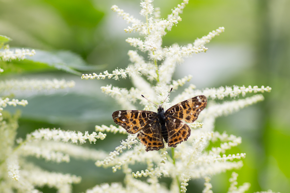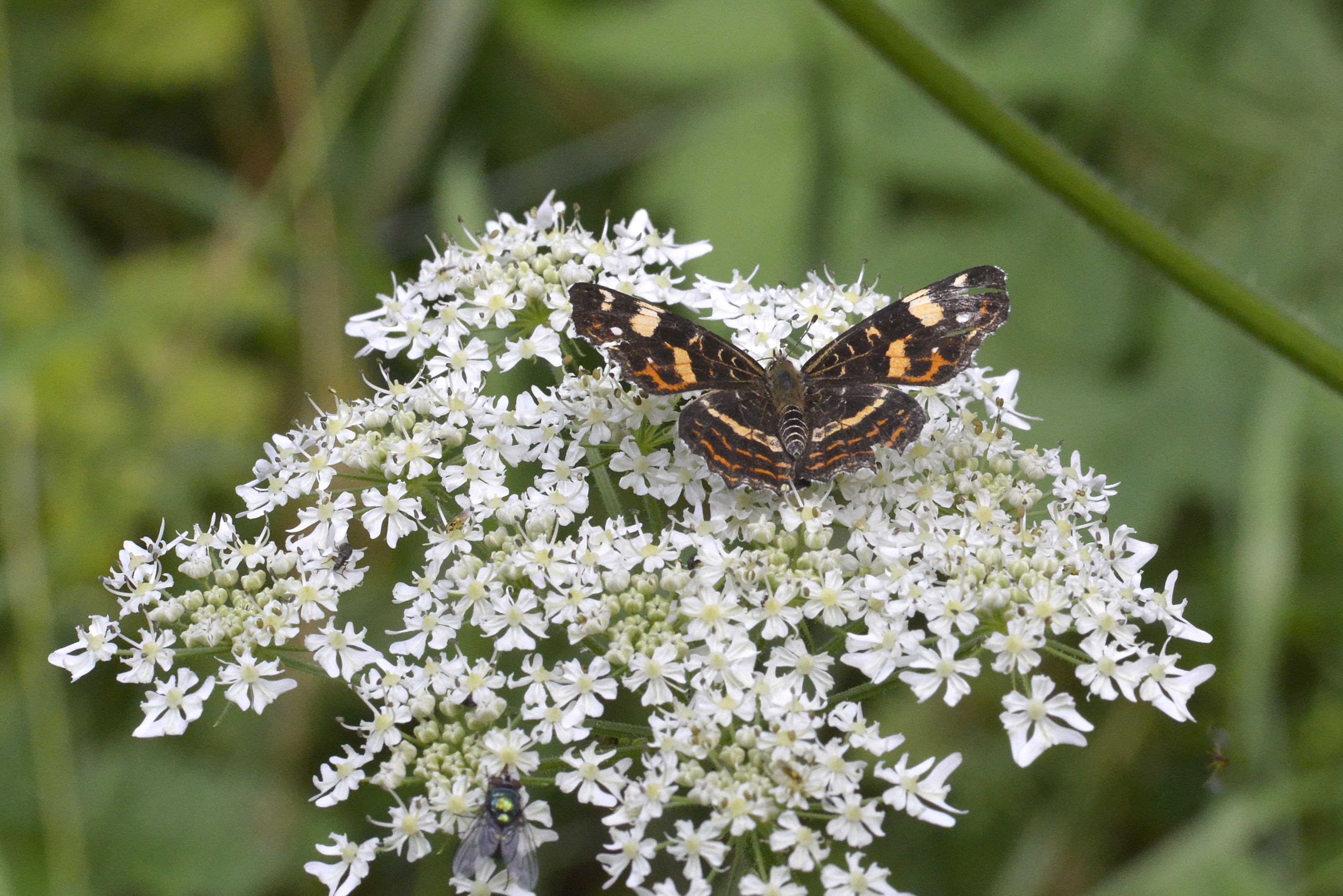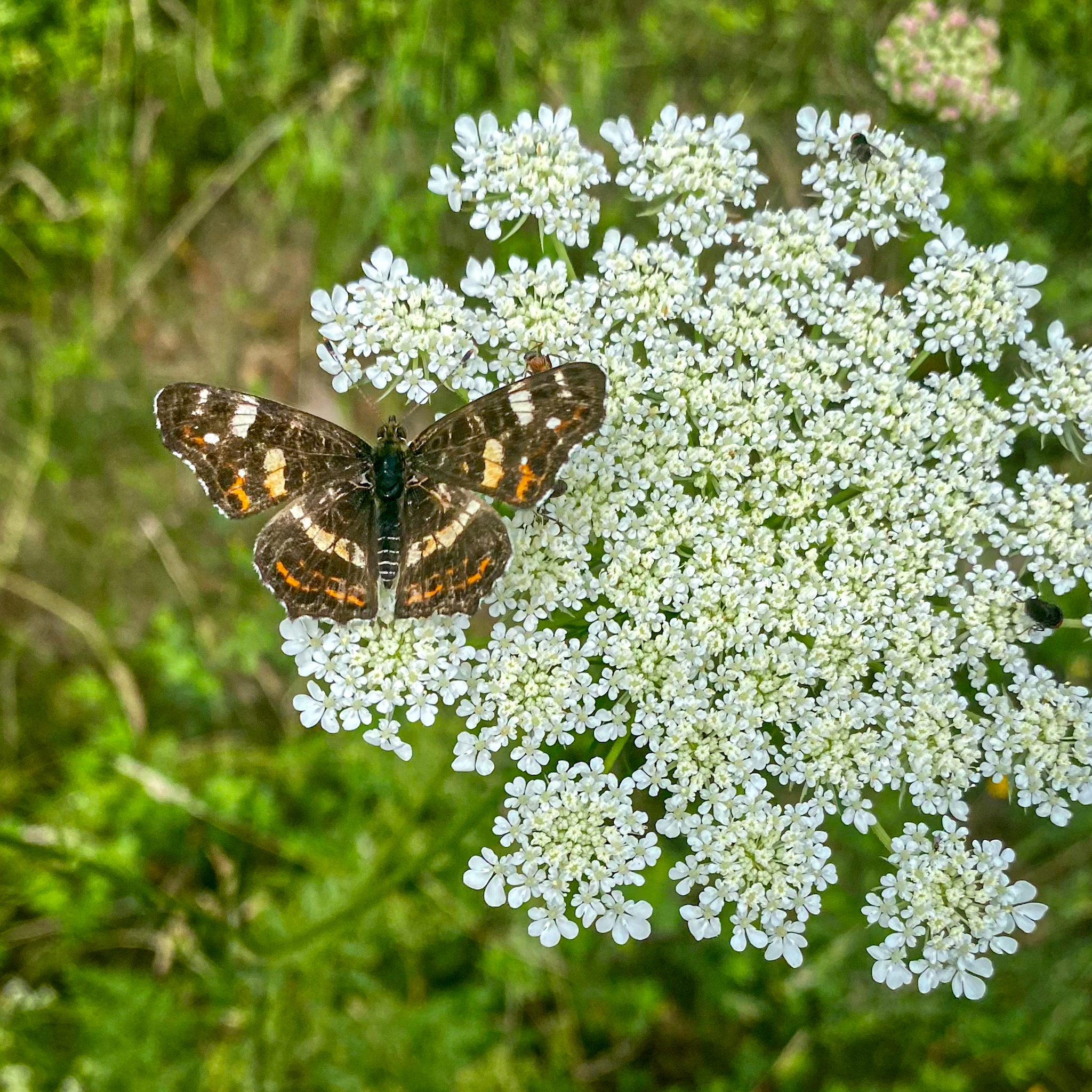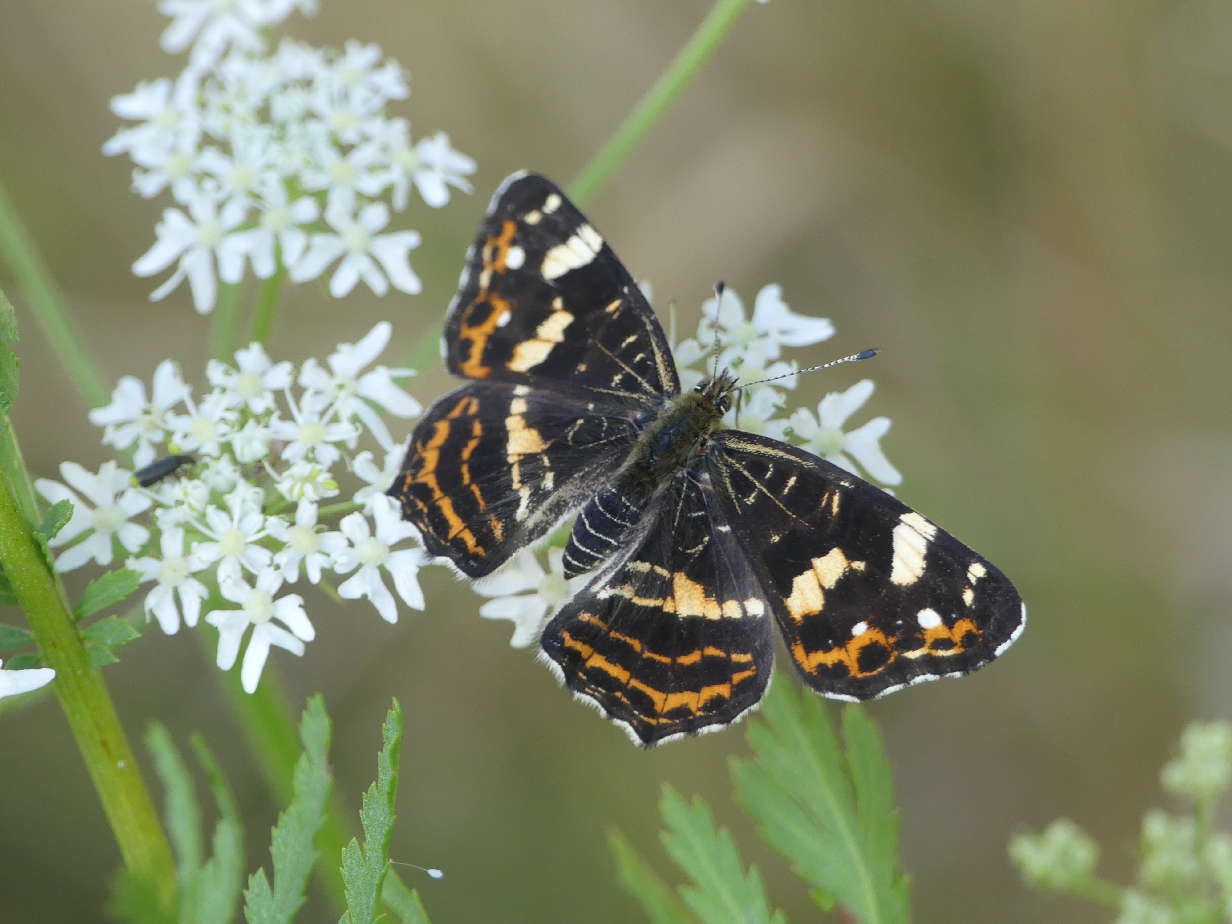 Landkärtchen, Sommergeneration der Schmetterlingsart auf Nektarspender Doldenblüte fotografiert, Falteroberseite im Sichtfeld, Ende Juni 2022, Auwald bei 06254 Horburg-Masslau (Sachsen-Anhalt)