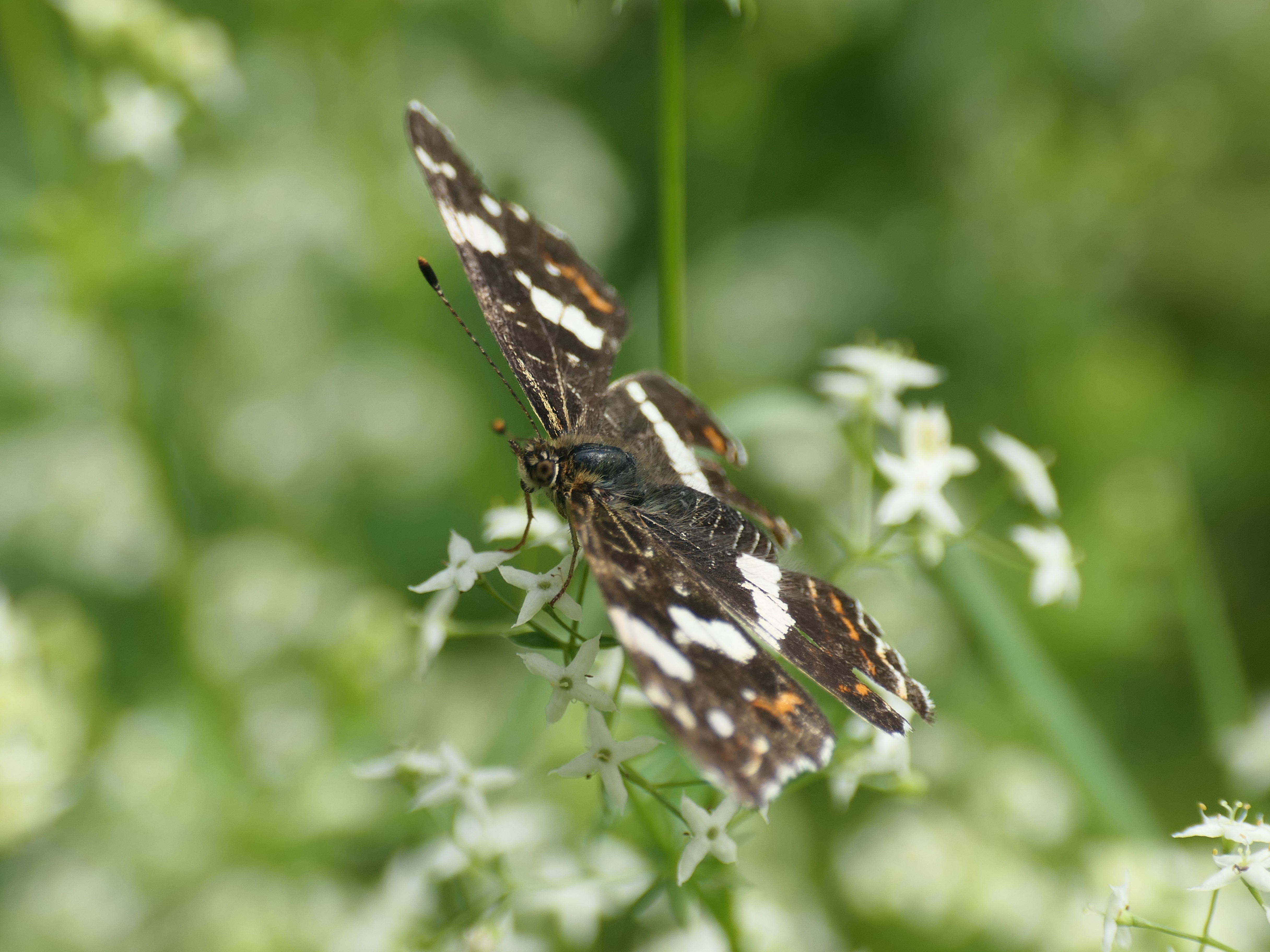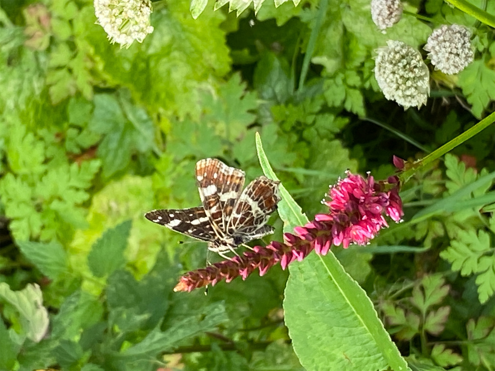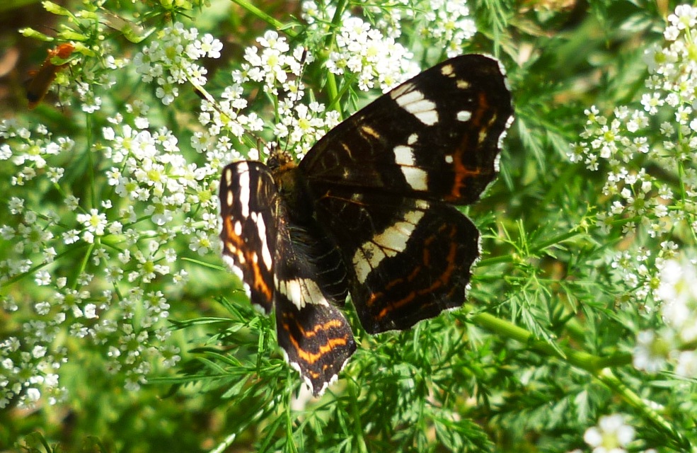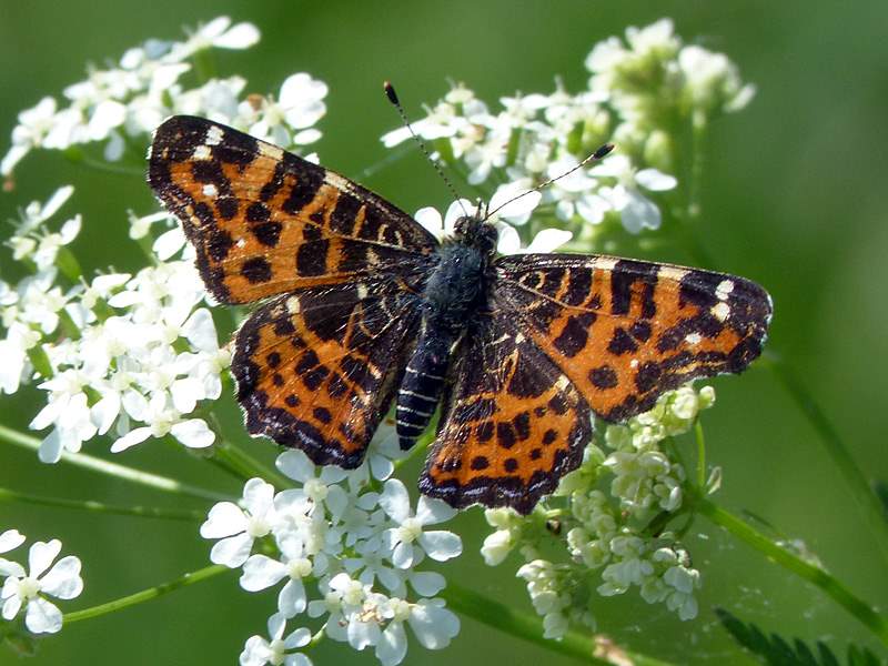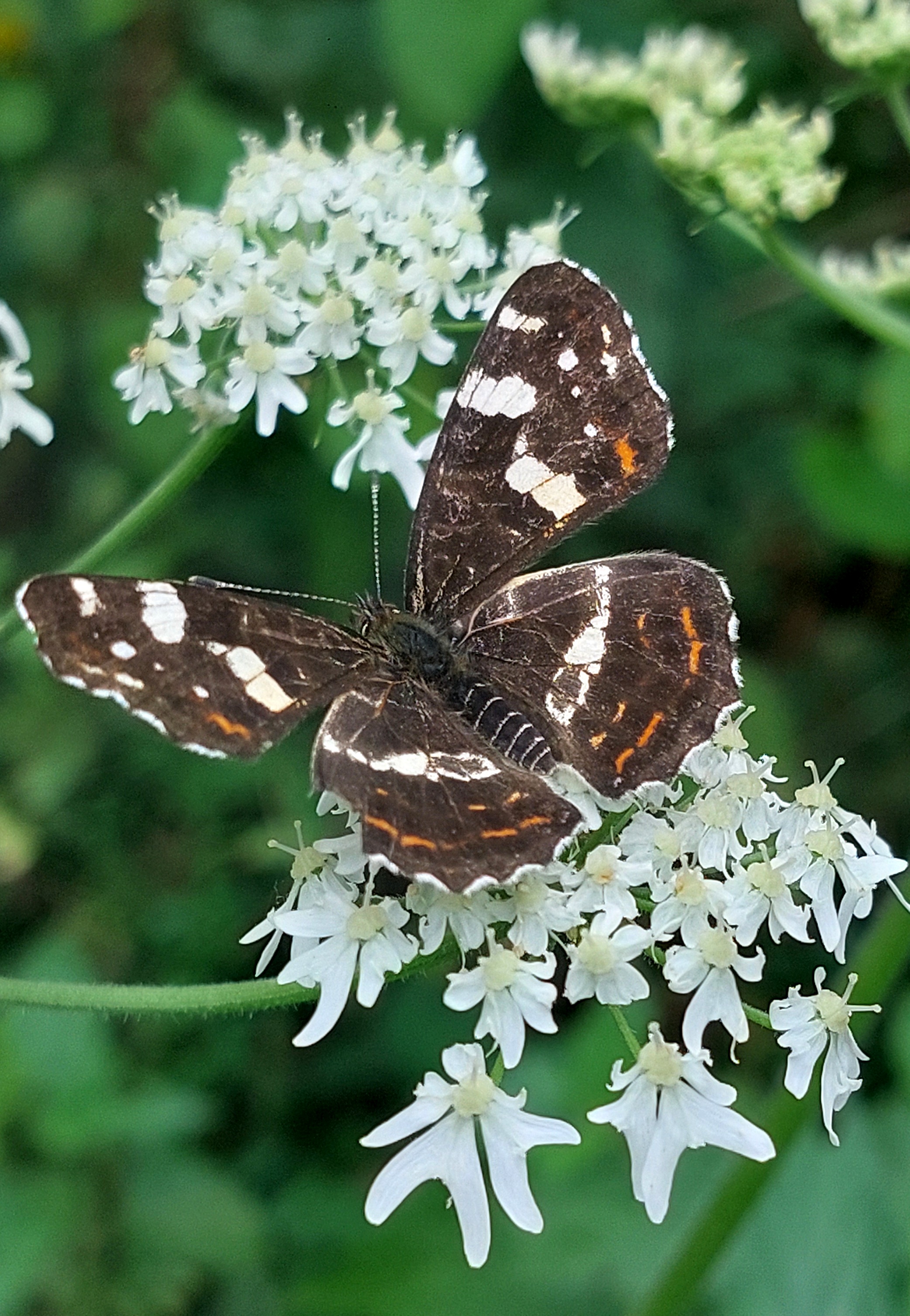 Landkärtchen, Sommergeneration der Schmetterlingsart auf Nektarspender Doldenblüte fotografiert, Falteroberseite im Sichtfeld, Ende Juni 2022, Auwald bei 06254 Horburg-Masslau (Sachsen-Anhalt)