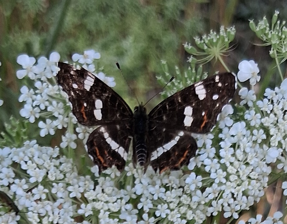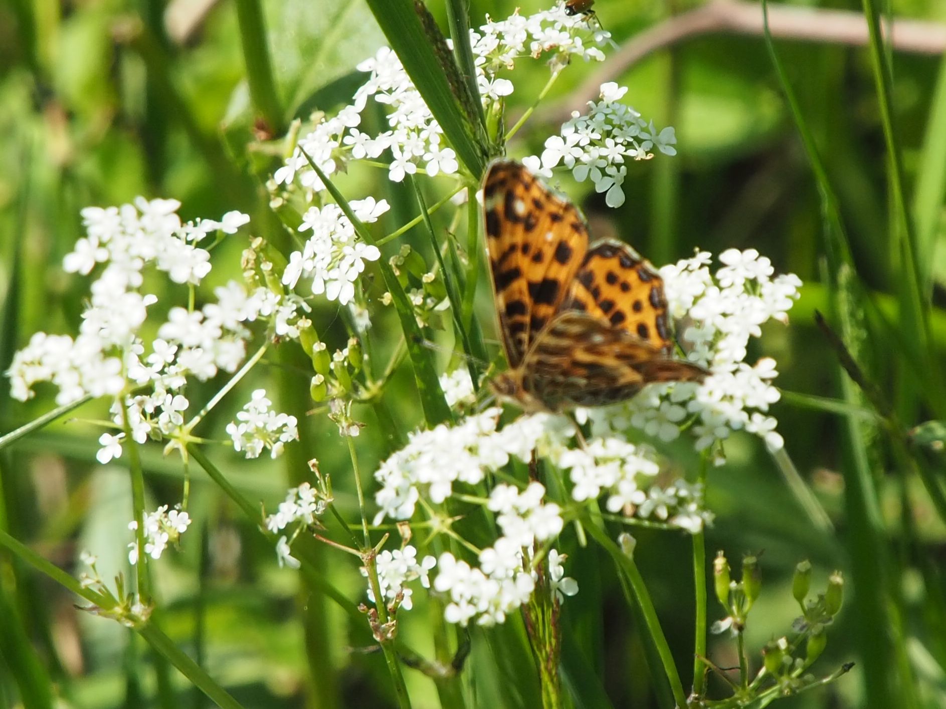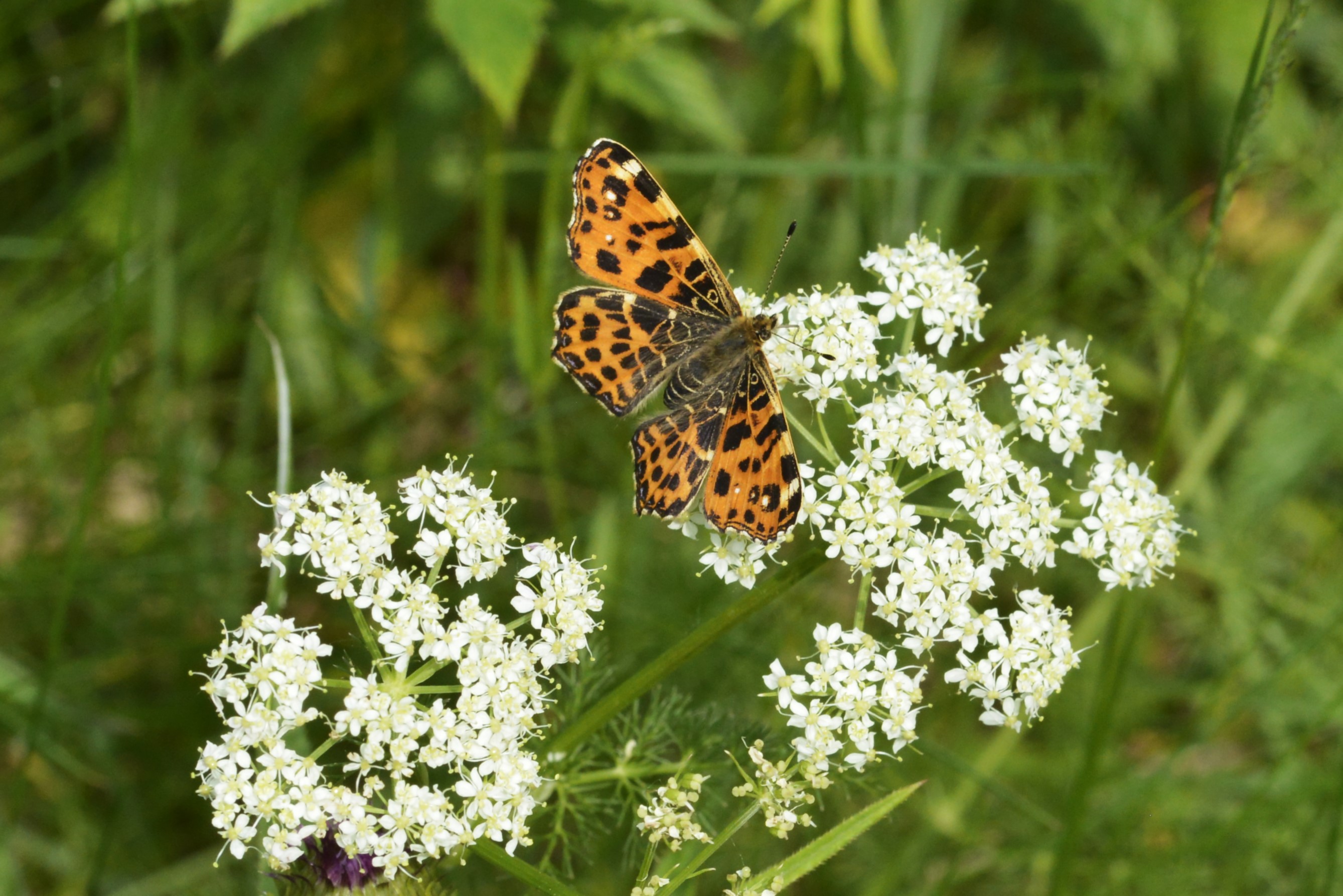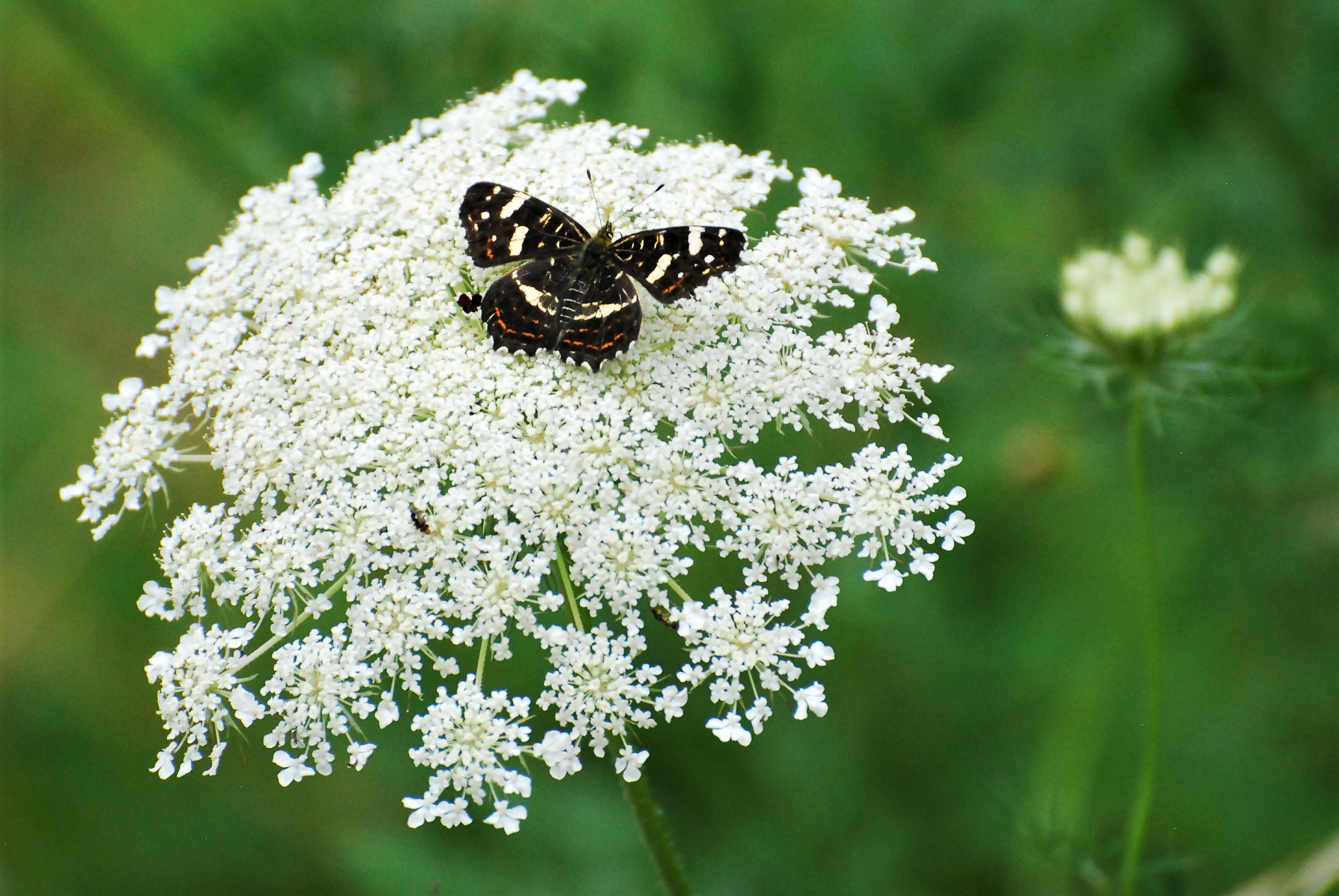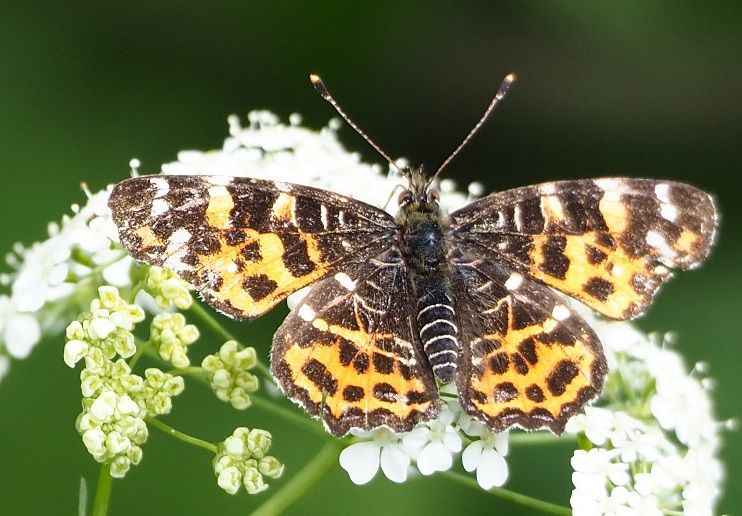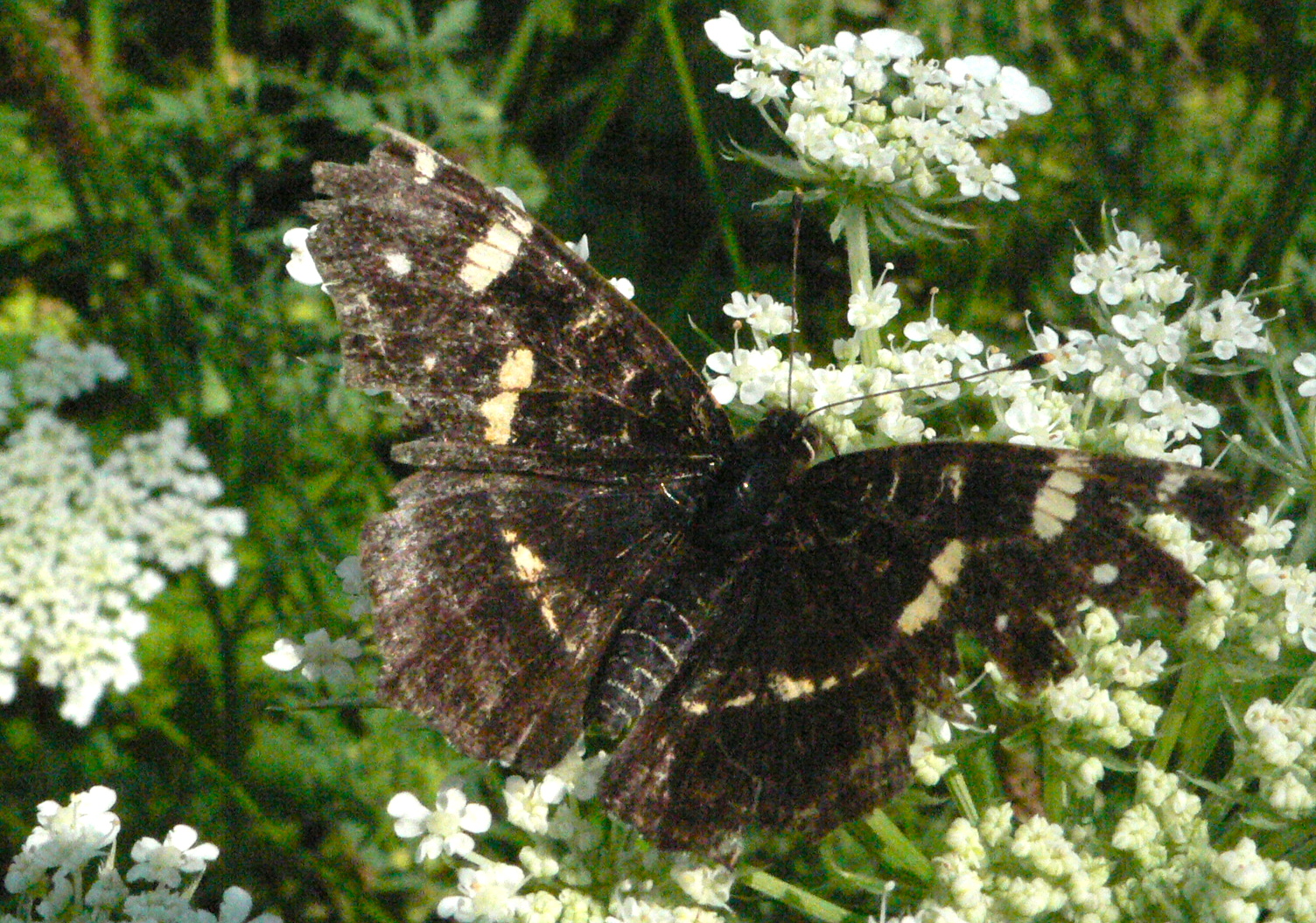 Landkärtchen, Sommergeneration der Schmetterlingsart auf Nektarspender Doldenblüte fotografiert, Falteroberseite im Sichtfeld, Ende Juni 2022, Auwald bei 06254 Horburg-Masslau (Sachsen-Anhalt)