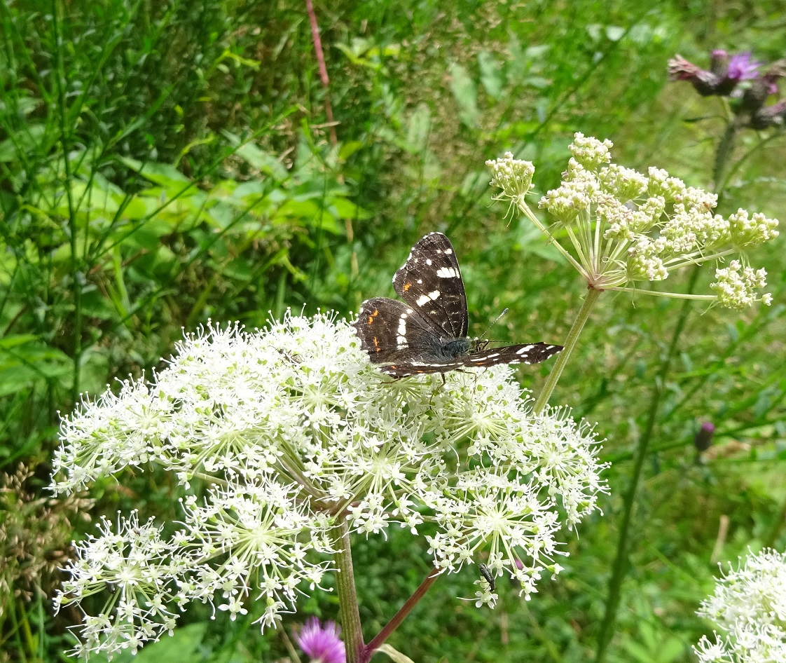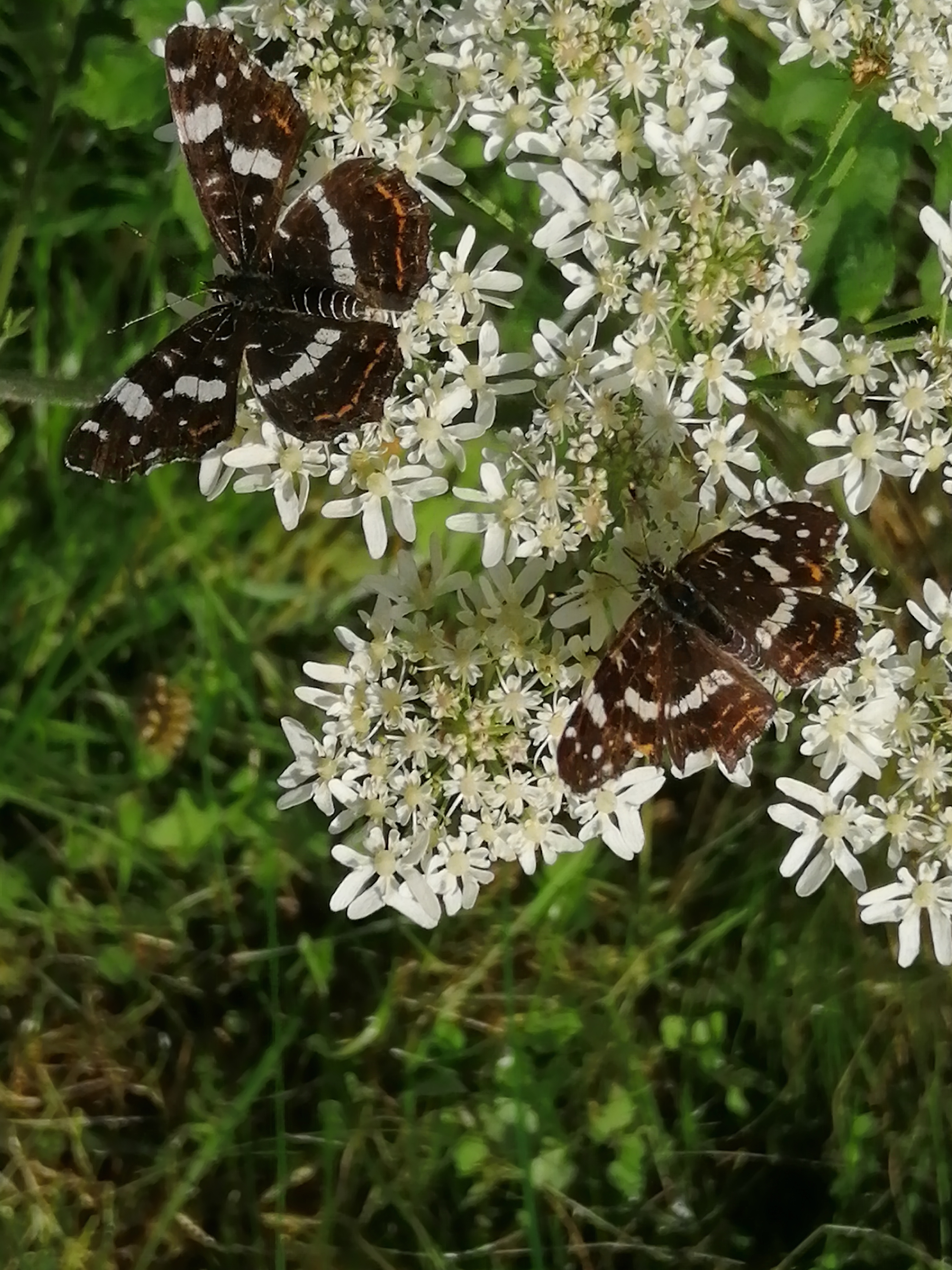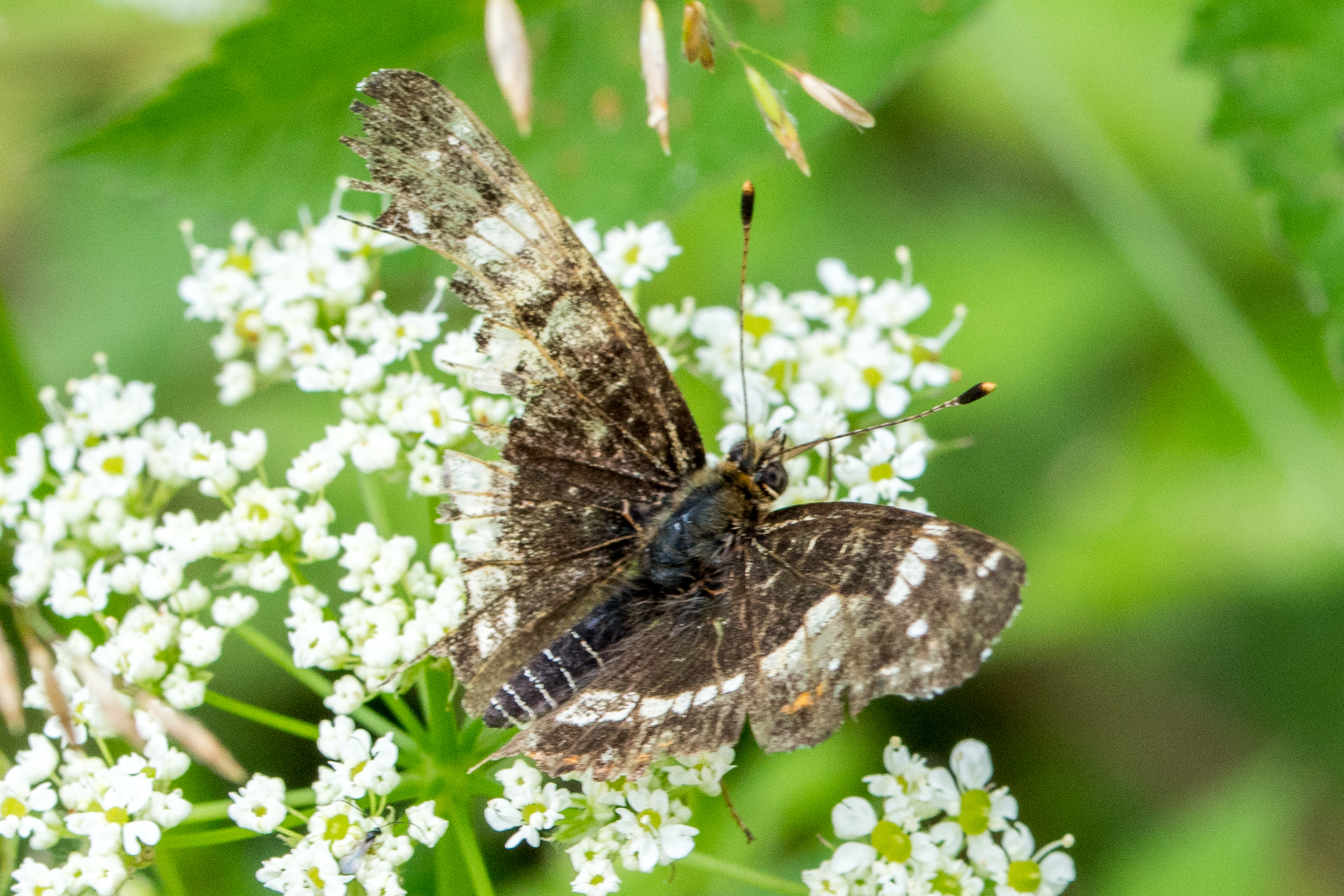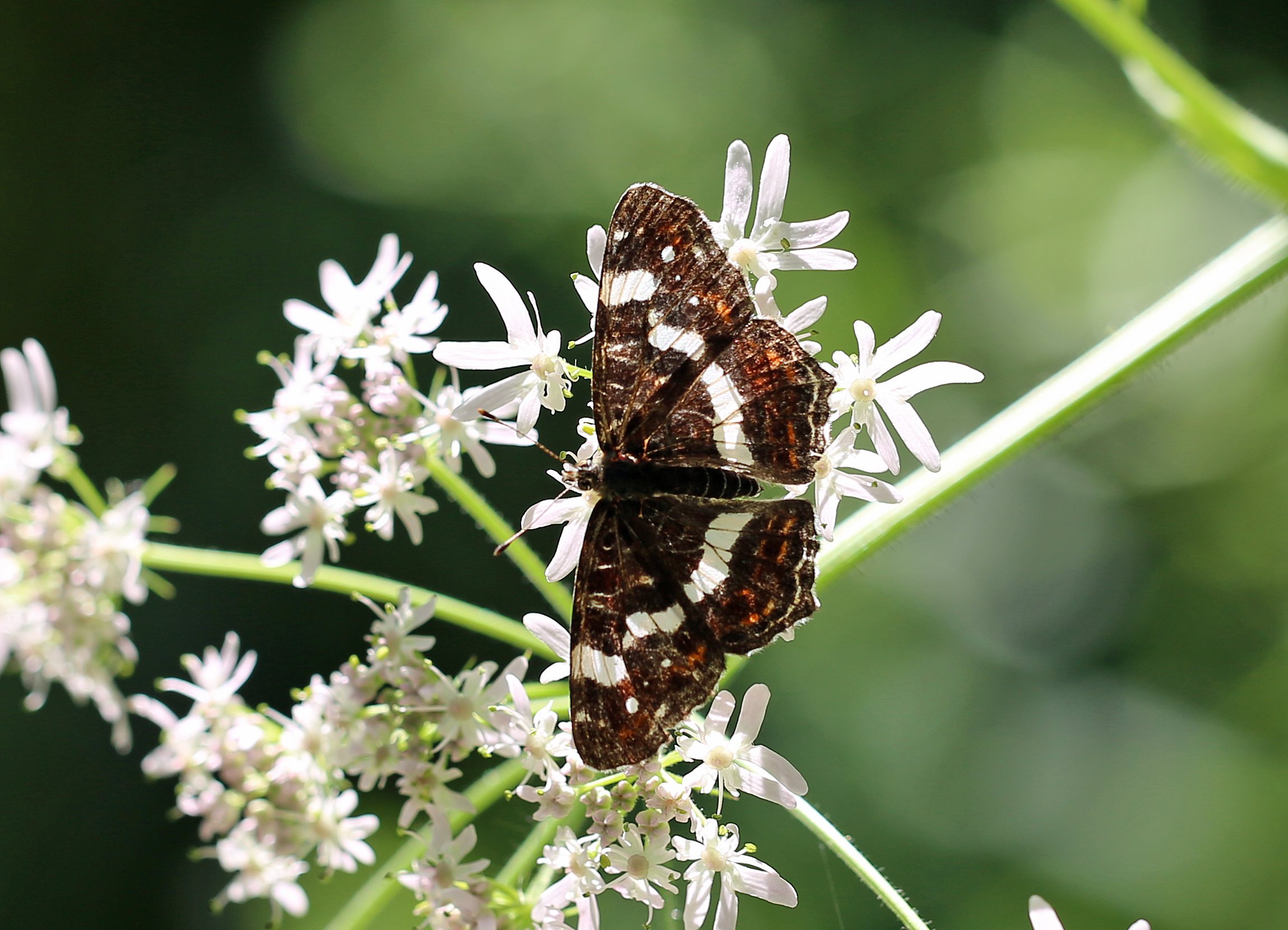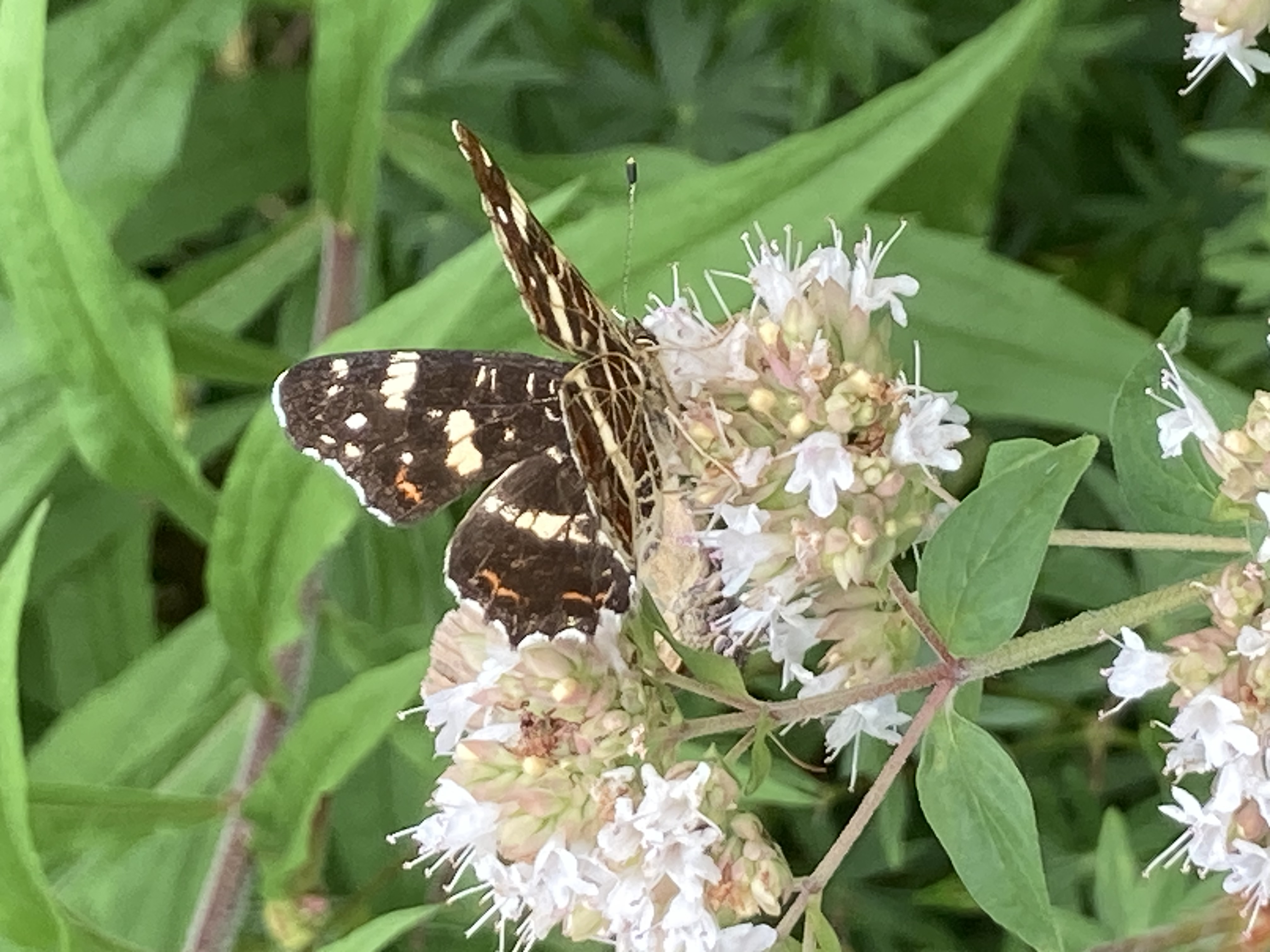 Landkärtchen, Sommergeneration der Schmetterlingsart auf Nektarspender Doldenblüte fotografiert, Falteroberseite im Sichtfeld, Ende Juni 2022, Auwald bei 06254 Horburg-Masslau (Sachsen-Anhalt)