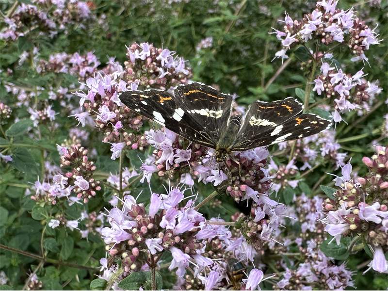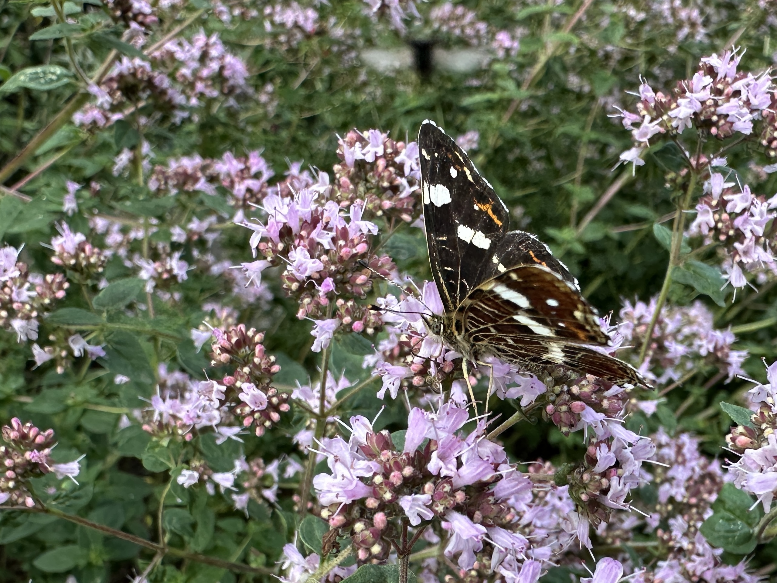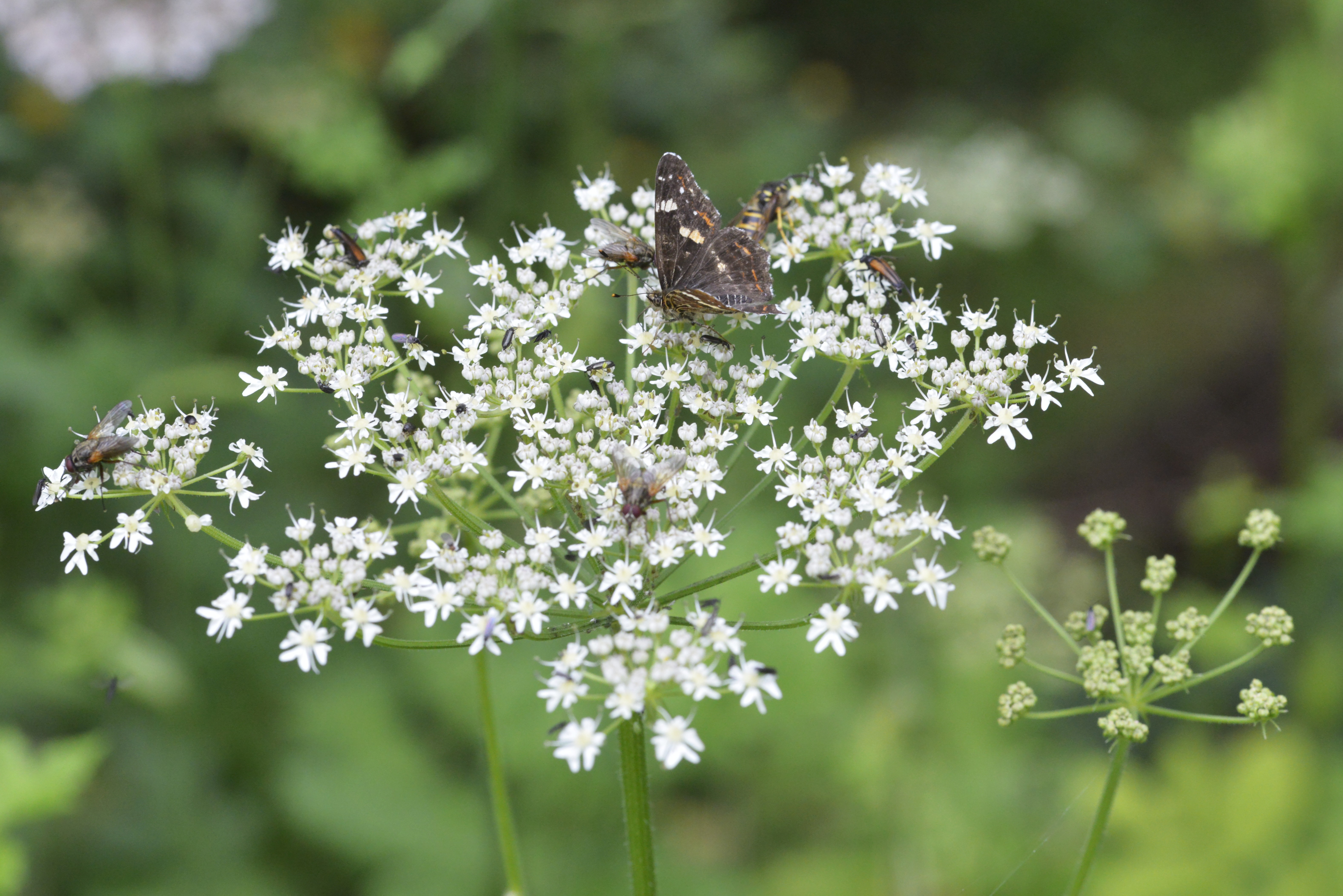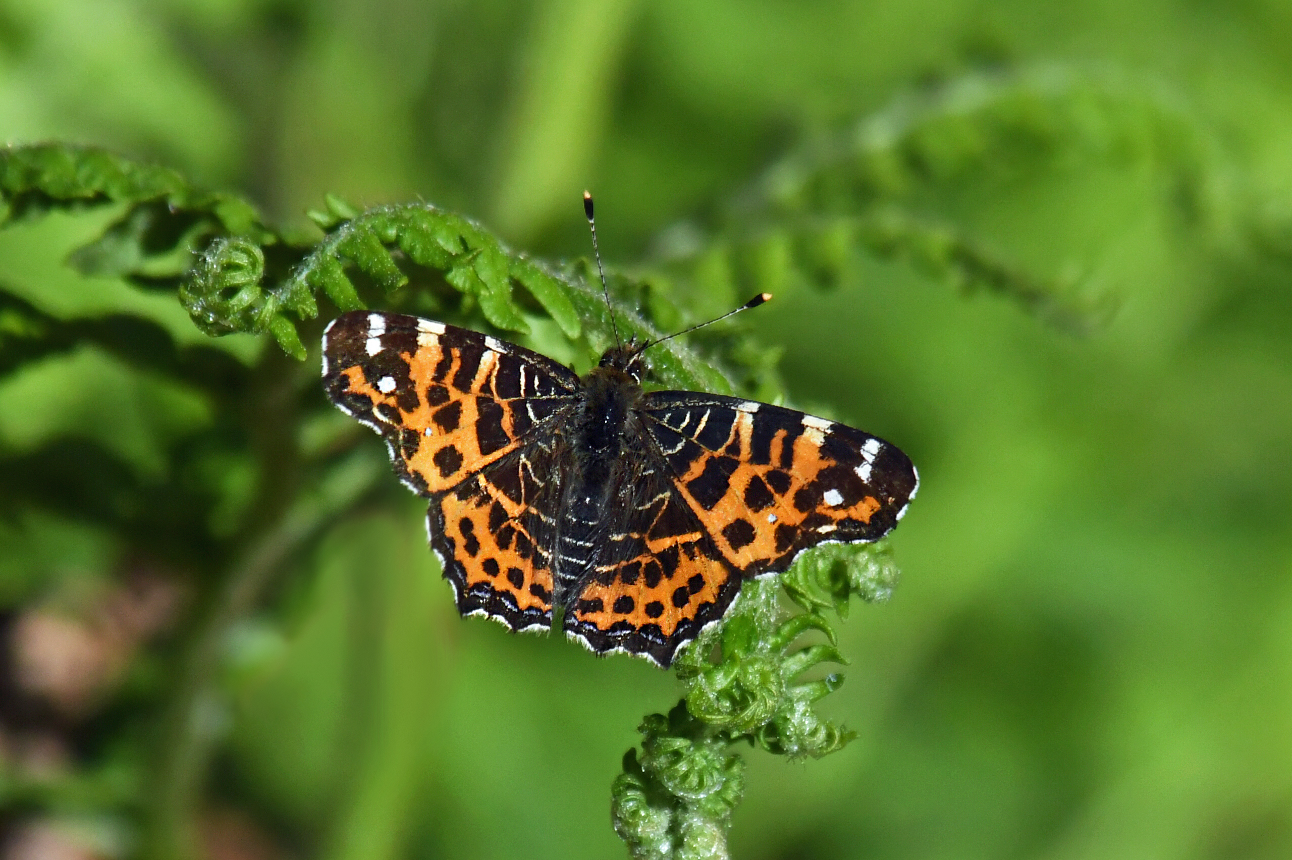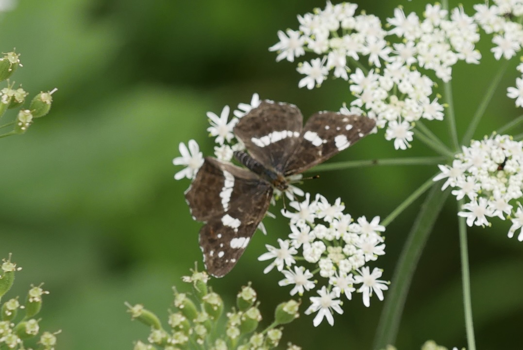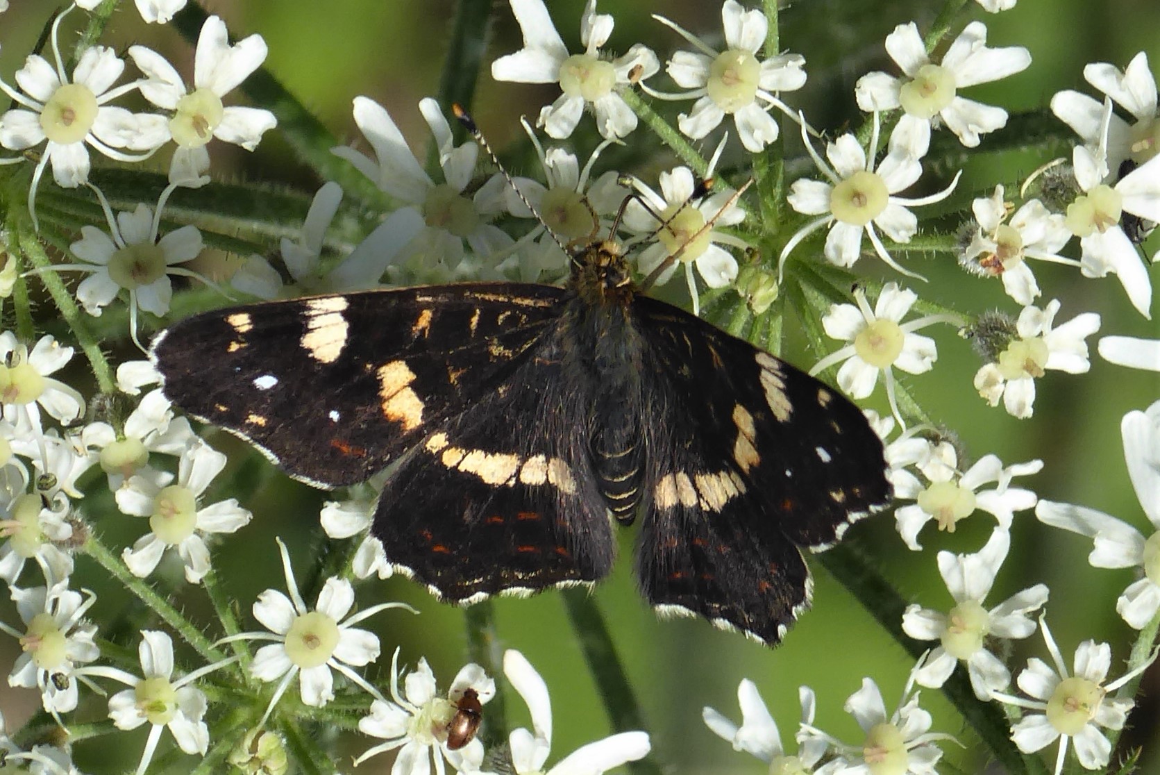 Landkärtchen, Sommergeneration der Schmetterlingsart auf Nektarspender Doldenblüte fotografiert, Falteroberseite im Sichtfeld, Ende Juni 2022, Auwald bei 06254 Horburg-Masslau (Sachsen-Anhalt)