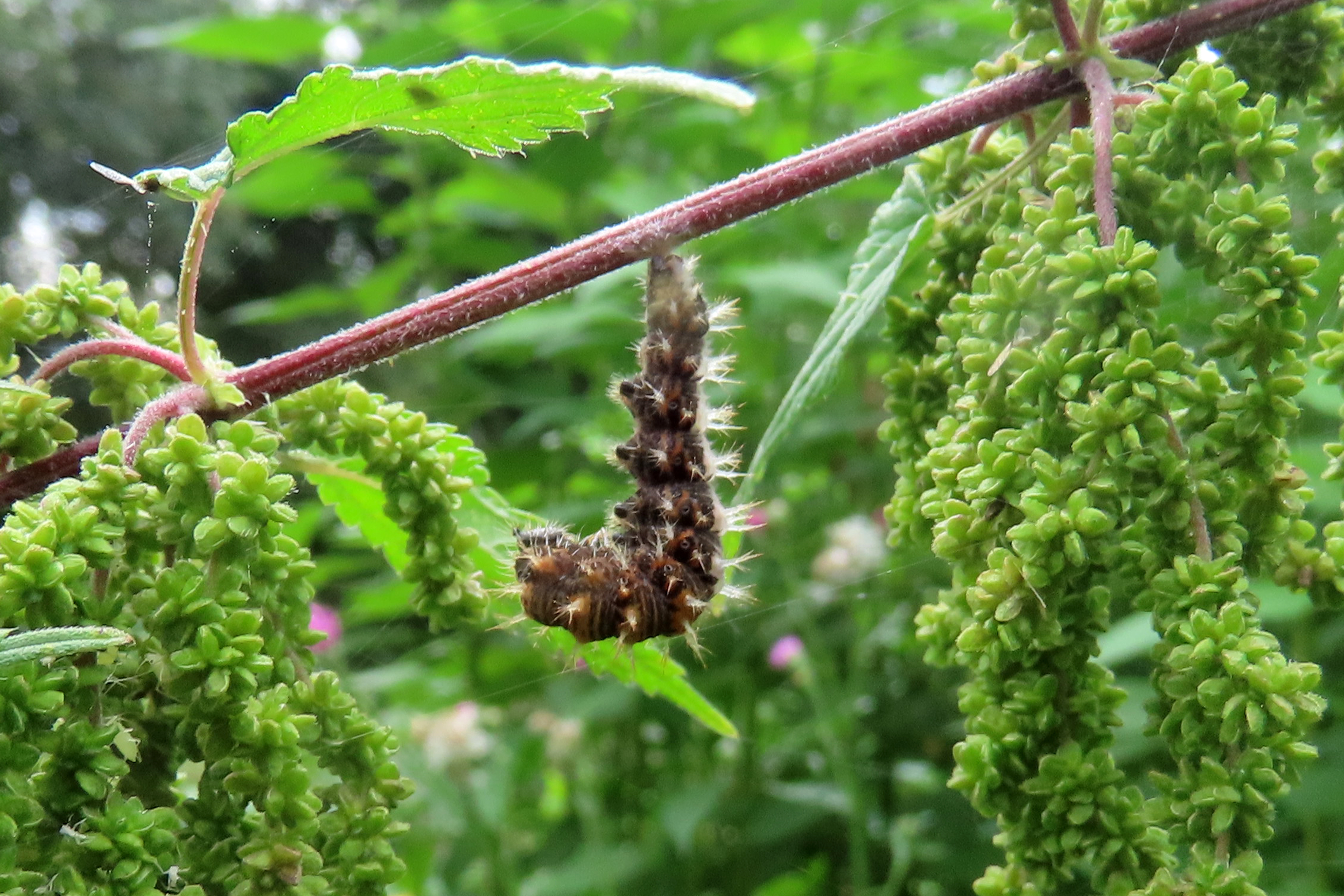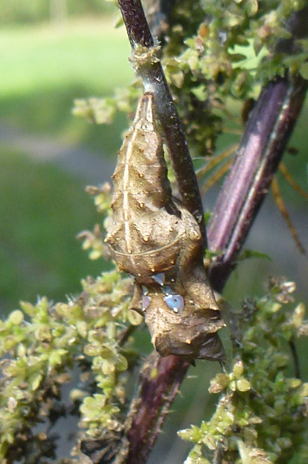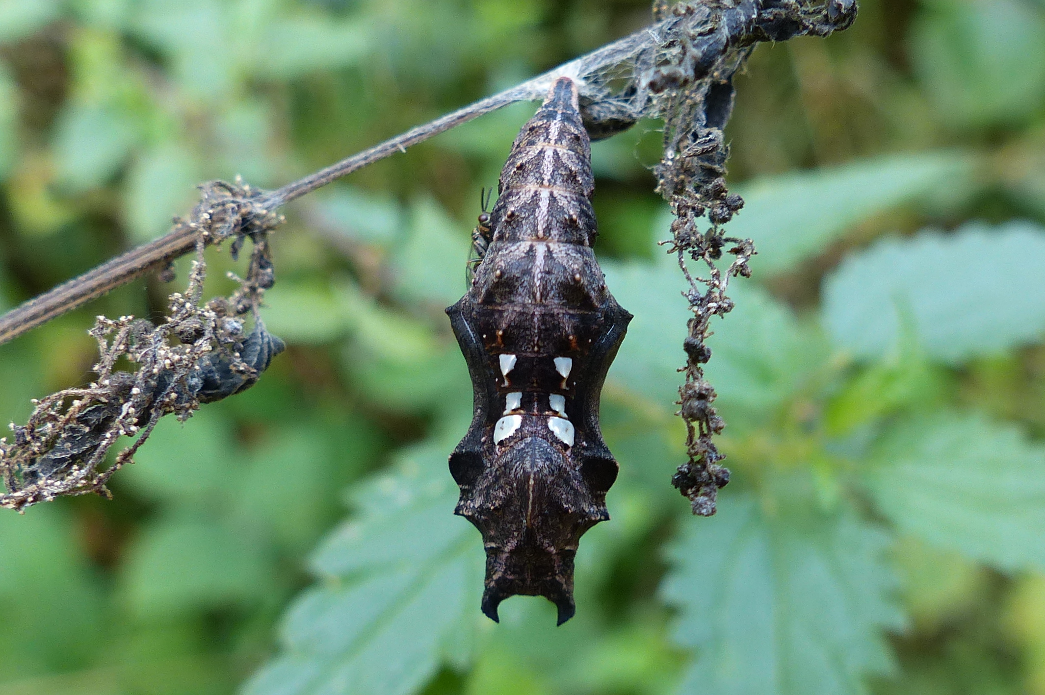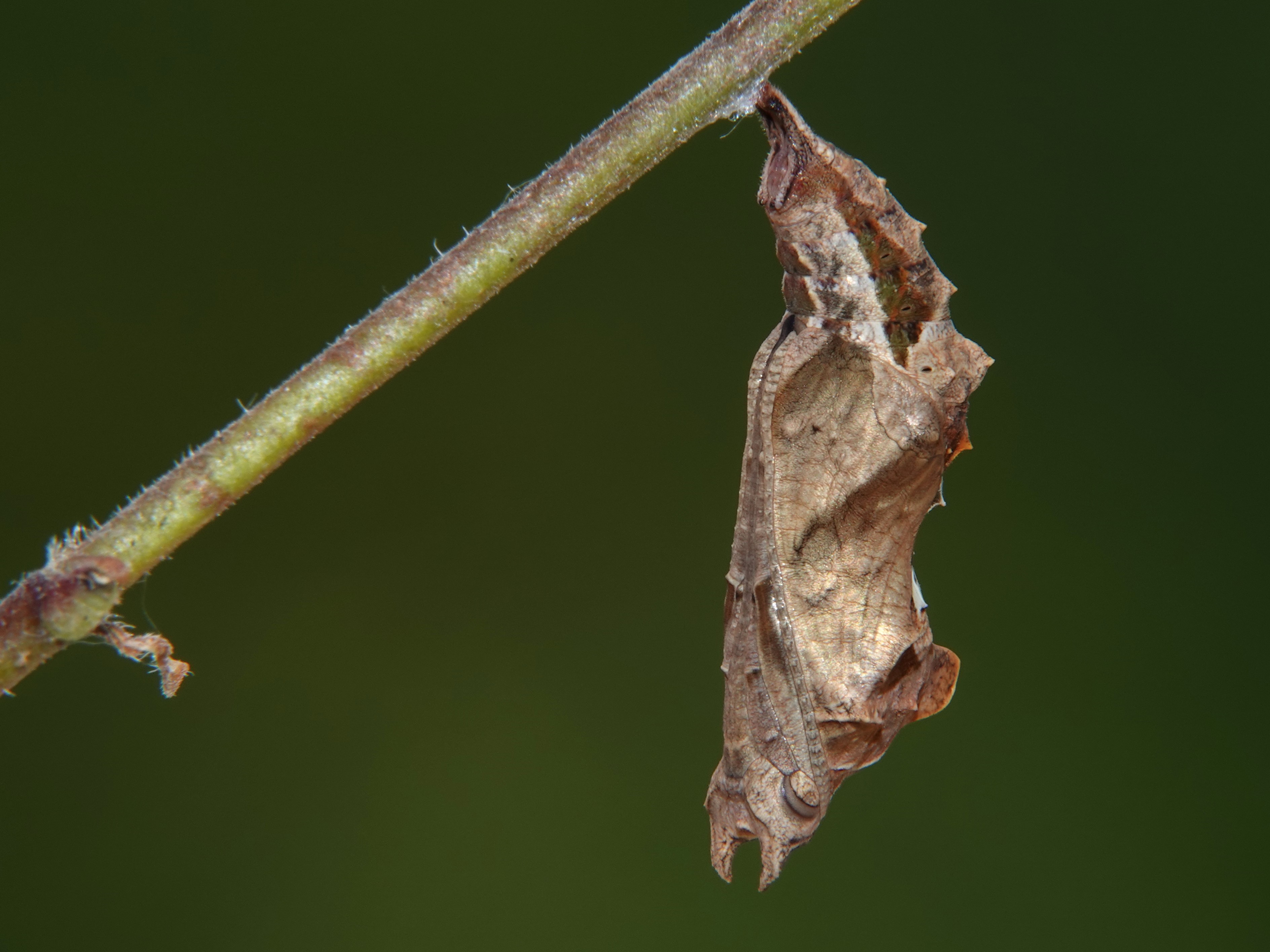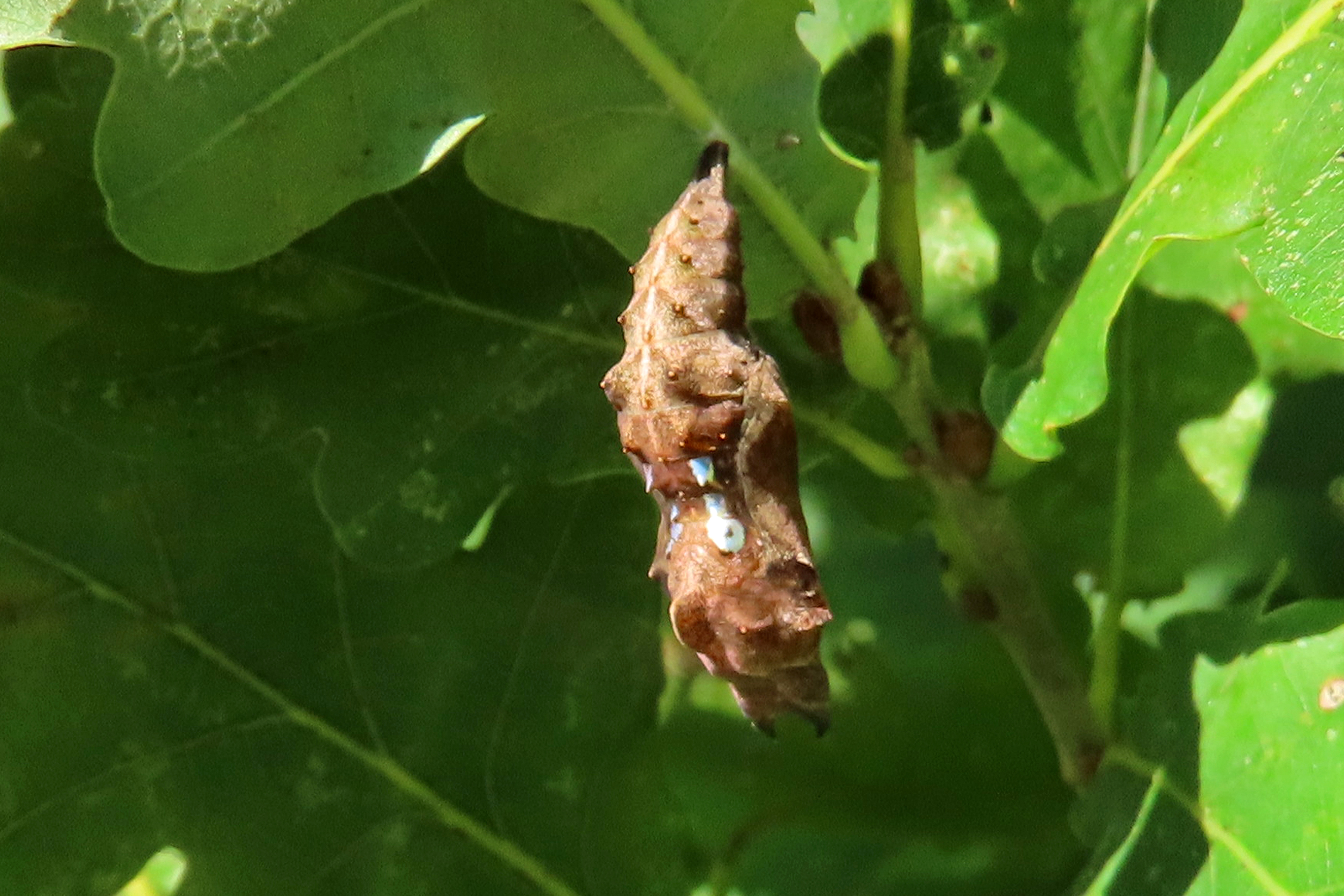 C-Falter (Polygonia c-album (Linnaeus, 1758)), Puppe an Flatterulme, Großer Garten Dresden, 24. Mai 2019