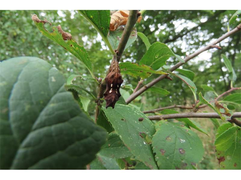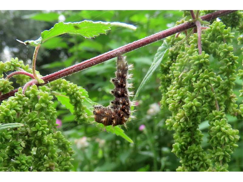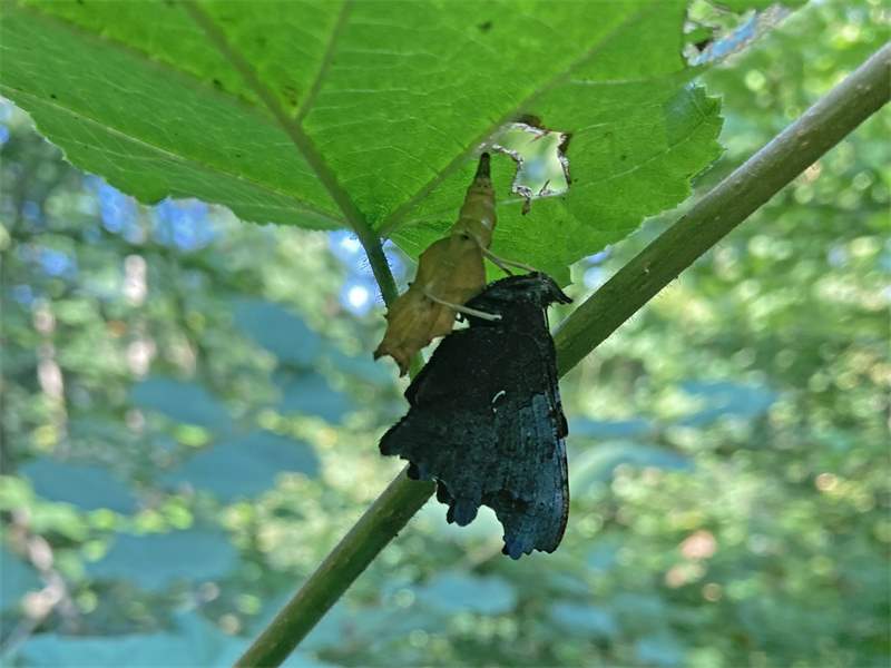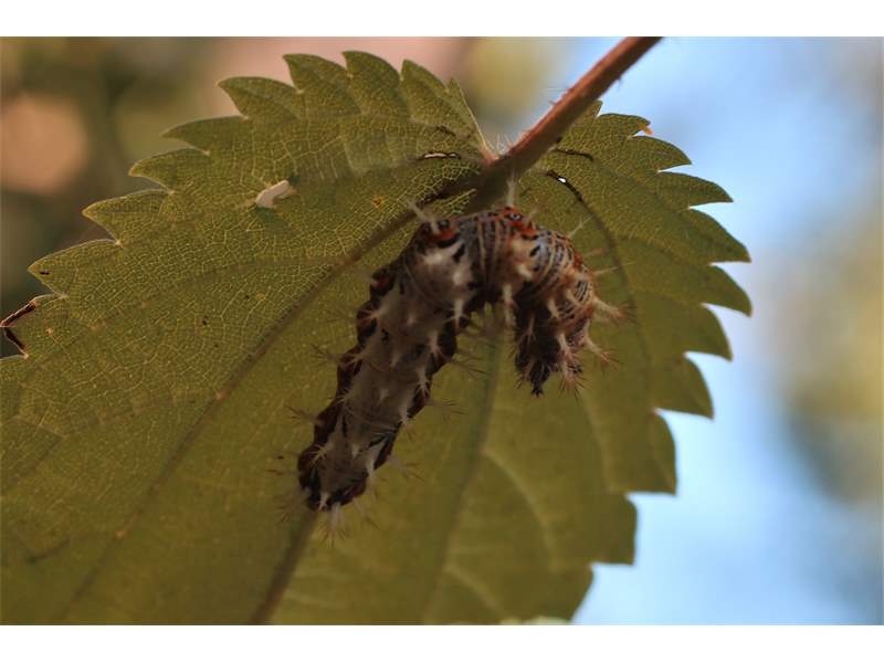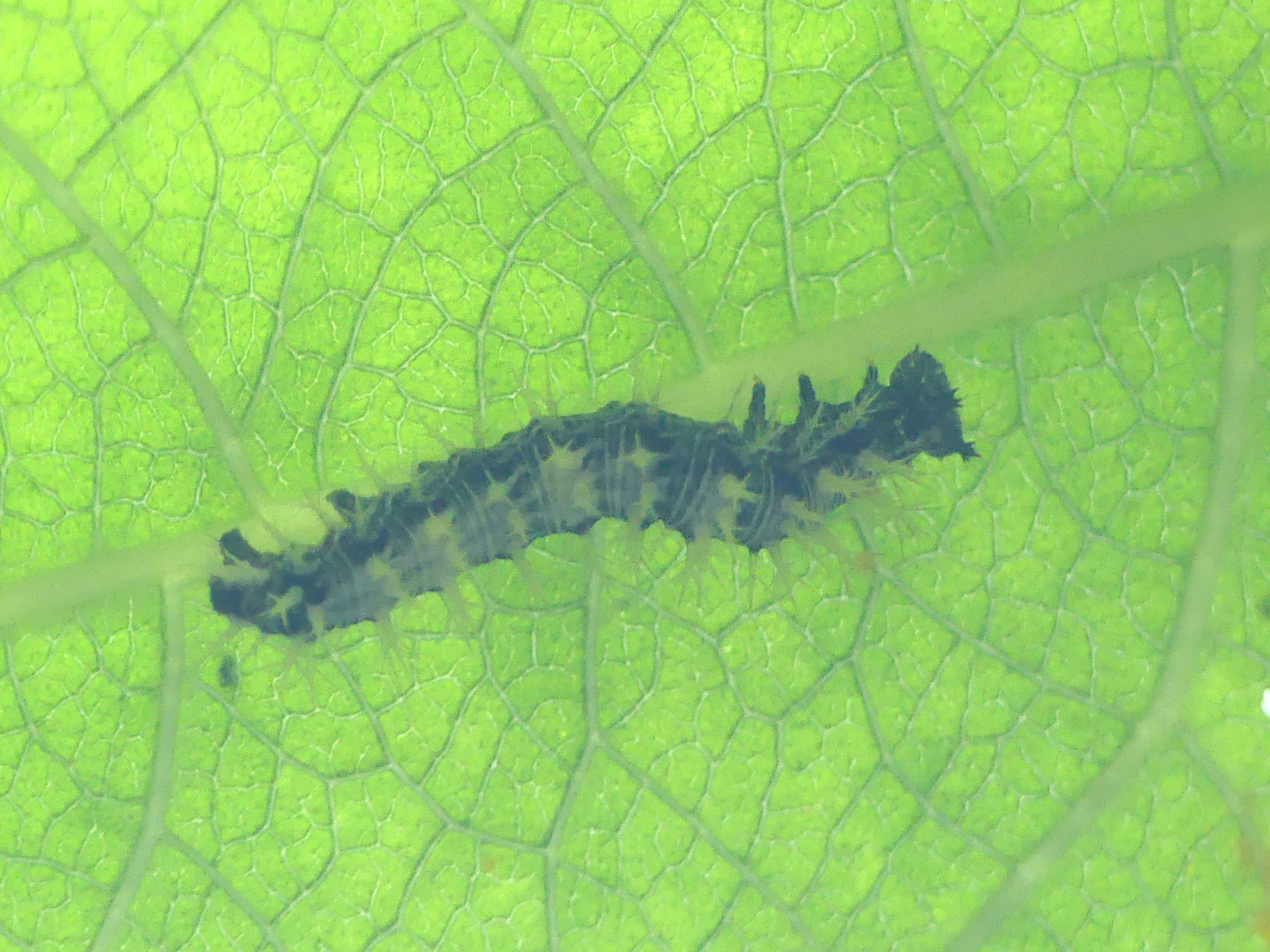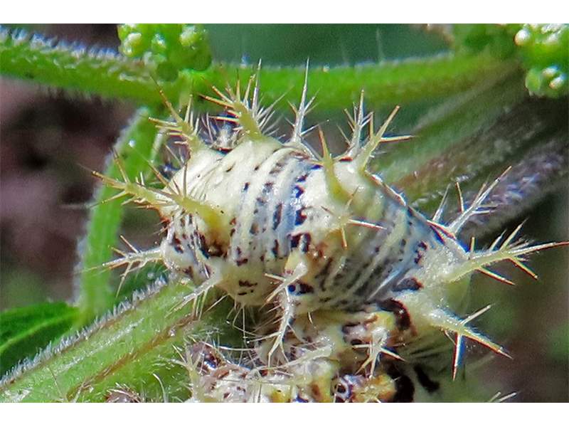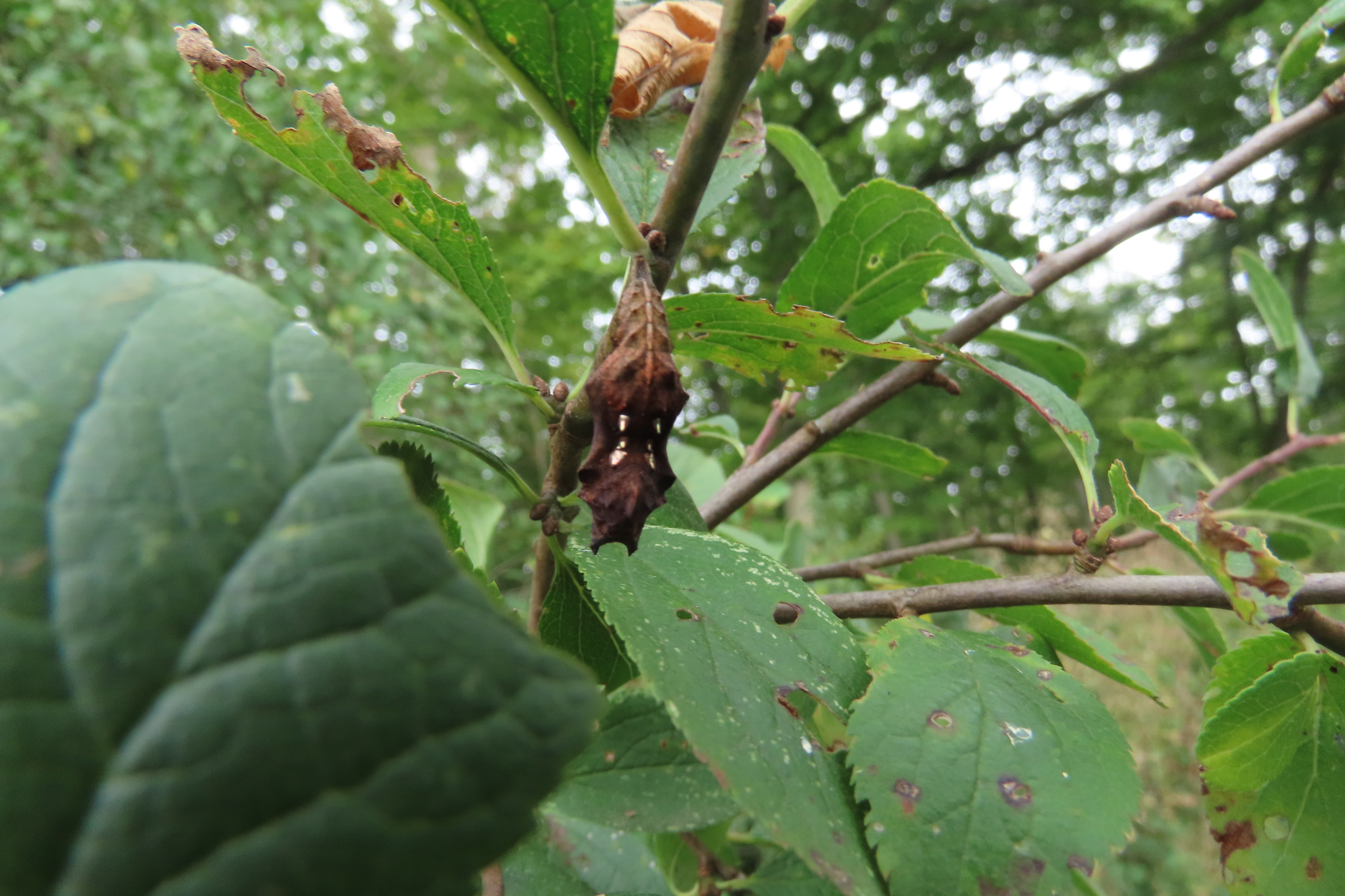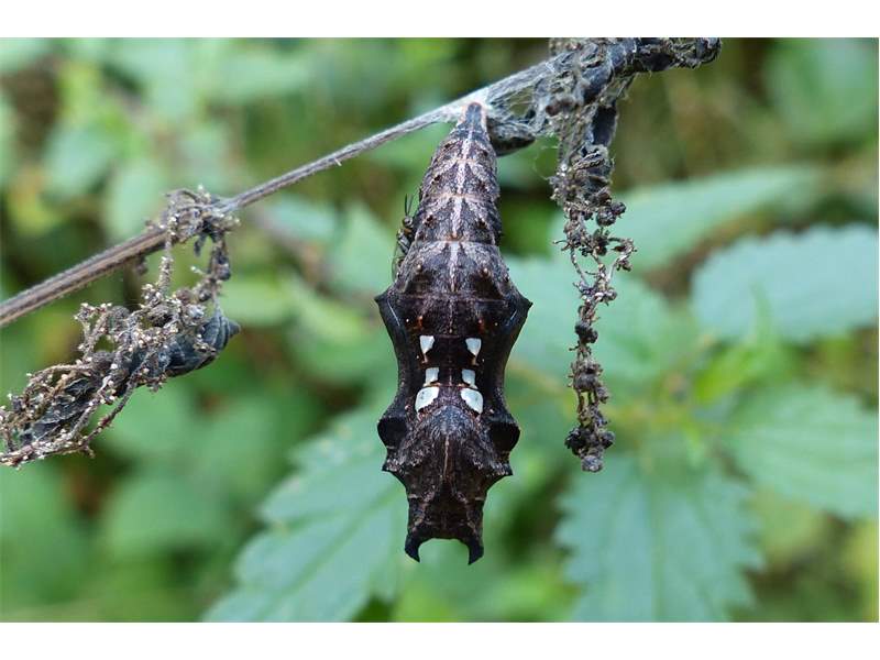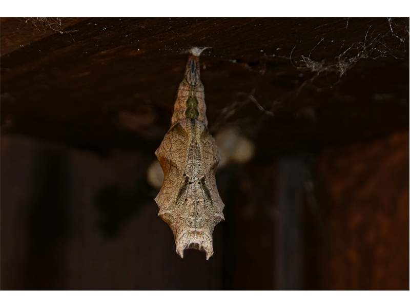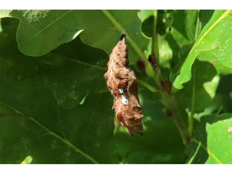C-Falter (Polygonia c-album (Linnaeus, 1758)), Puppe an Flatterulme, Großer Garten Dresden, 24. Mai 2019 (© Lucas Langer)( Bild vergrößern)