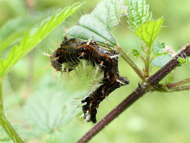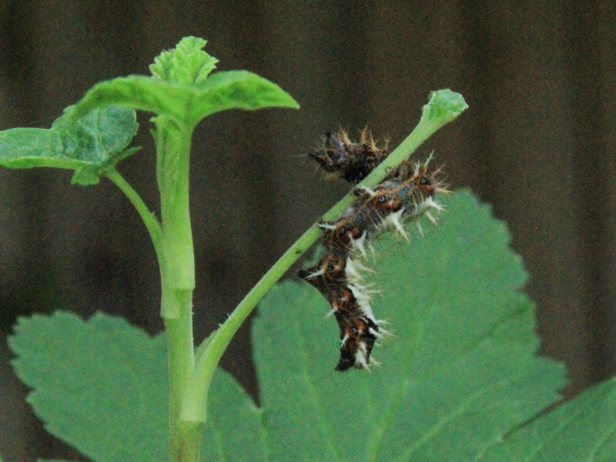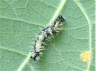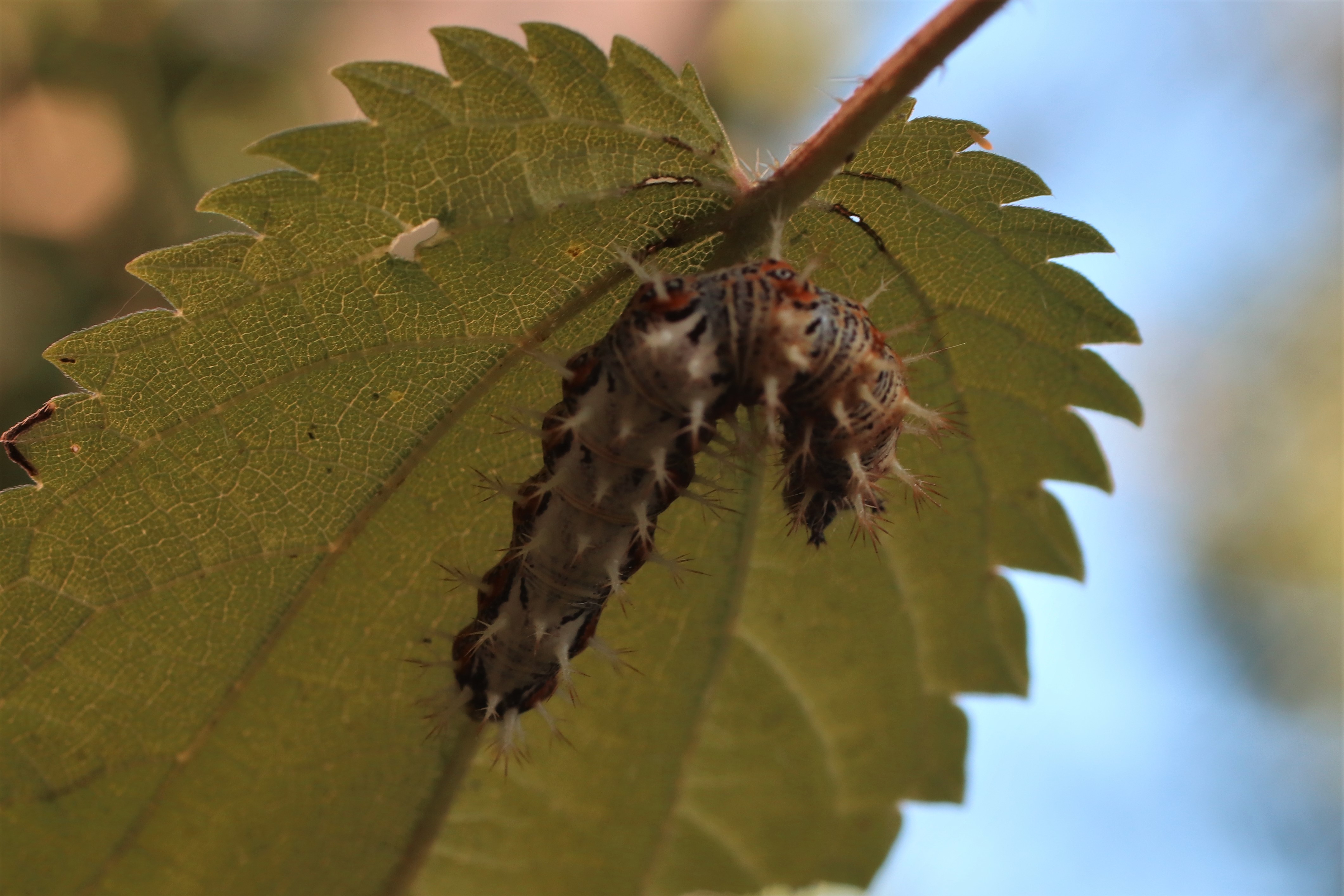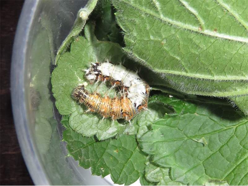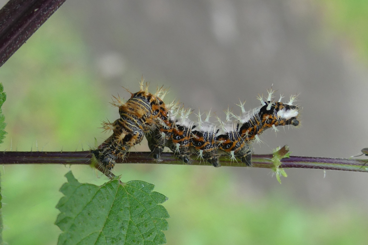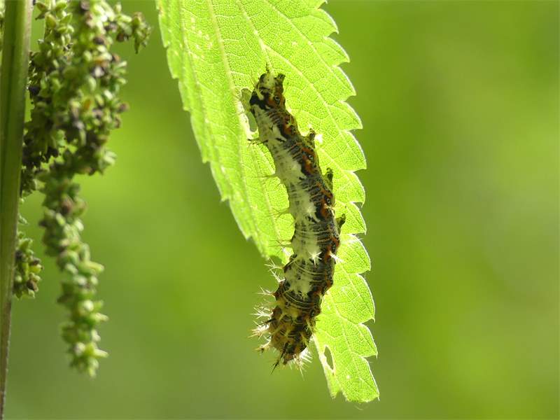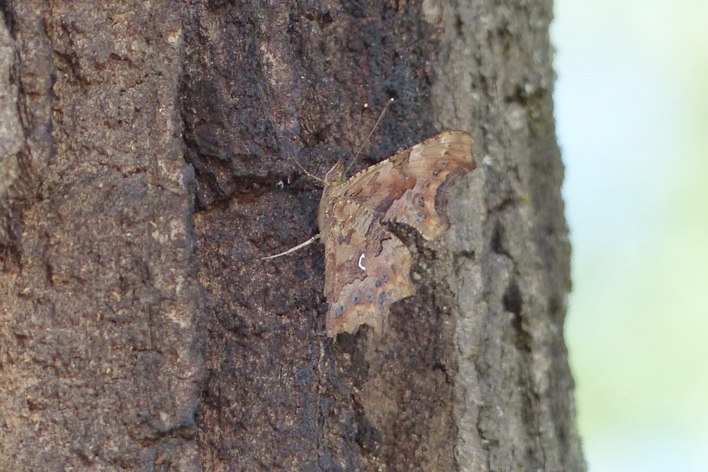 C-Falter (Polygonia c-album (Linnaeus, 1758)), Puppe an Flatterulme, Großer Garten Dresden, 24. Mai 2019 (© Lucas Langer)( Bild vergrößern)
