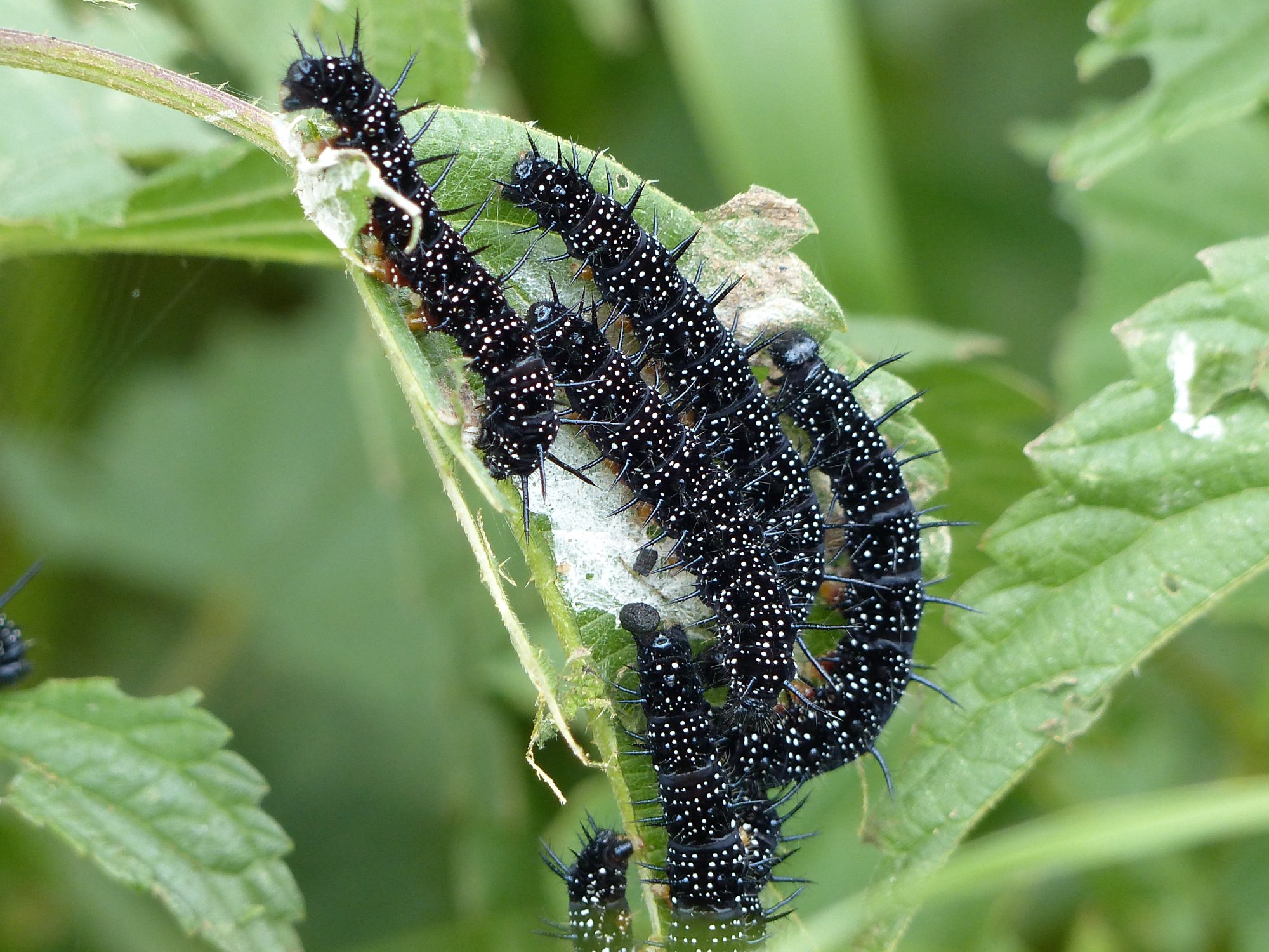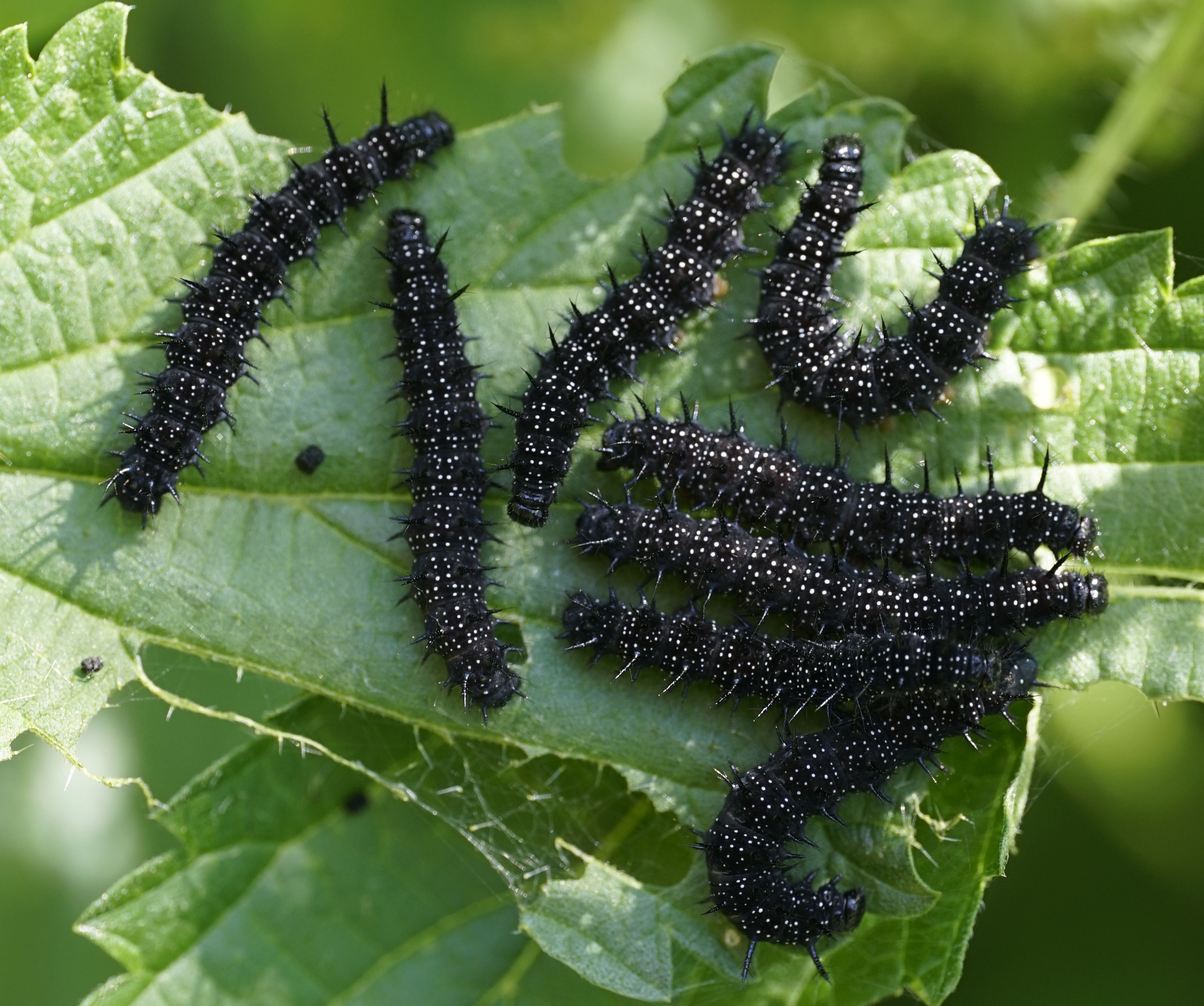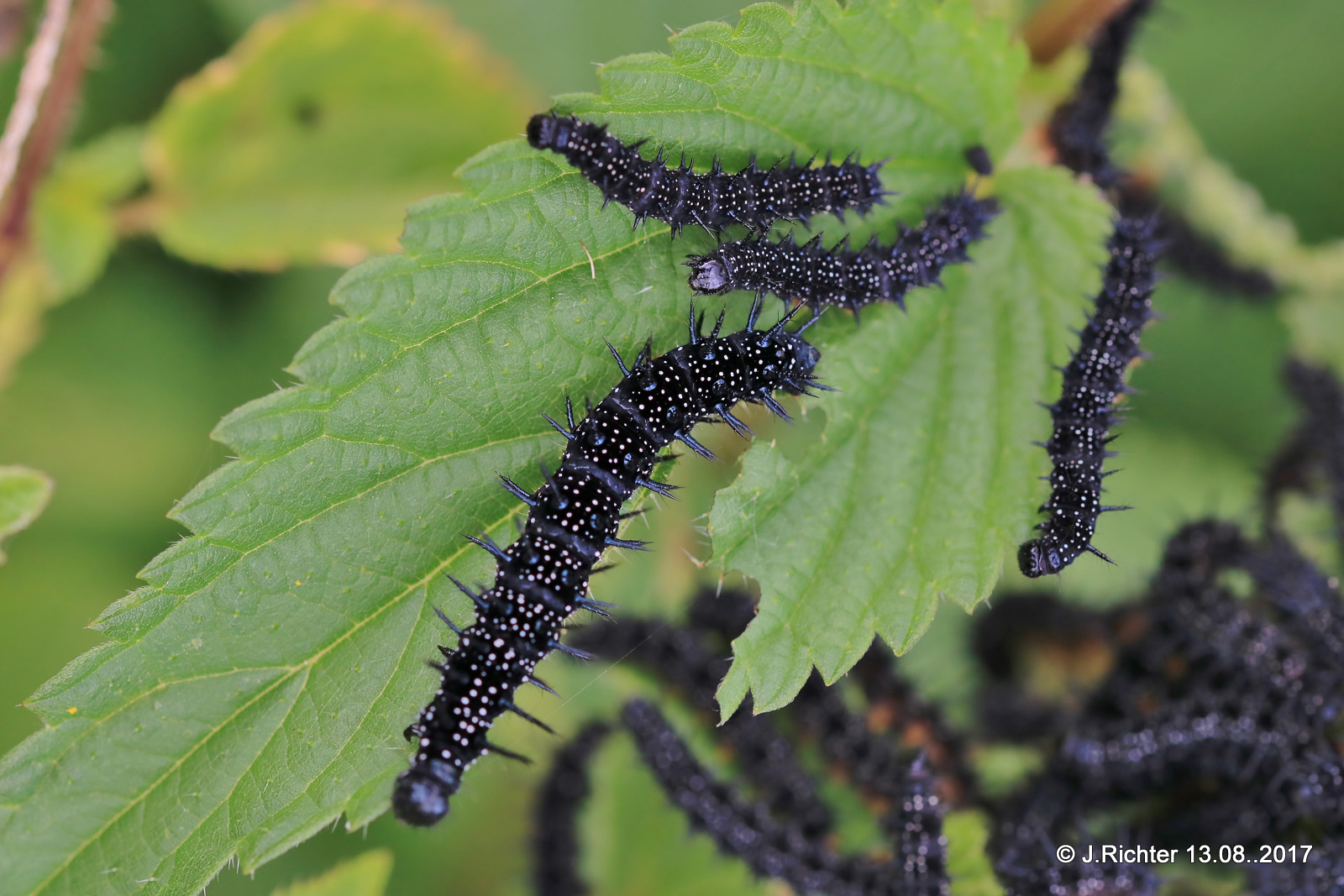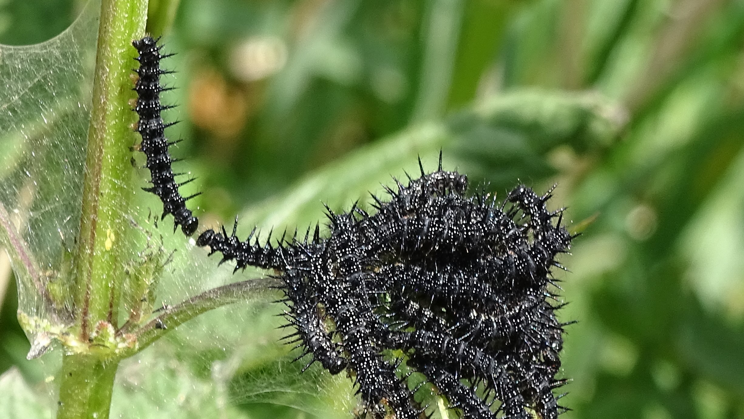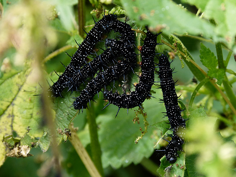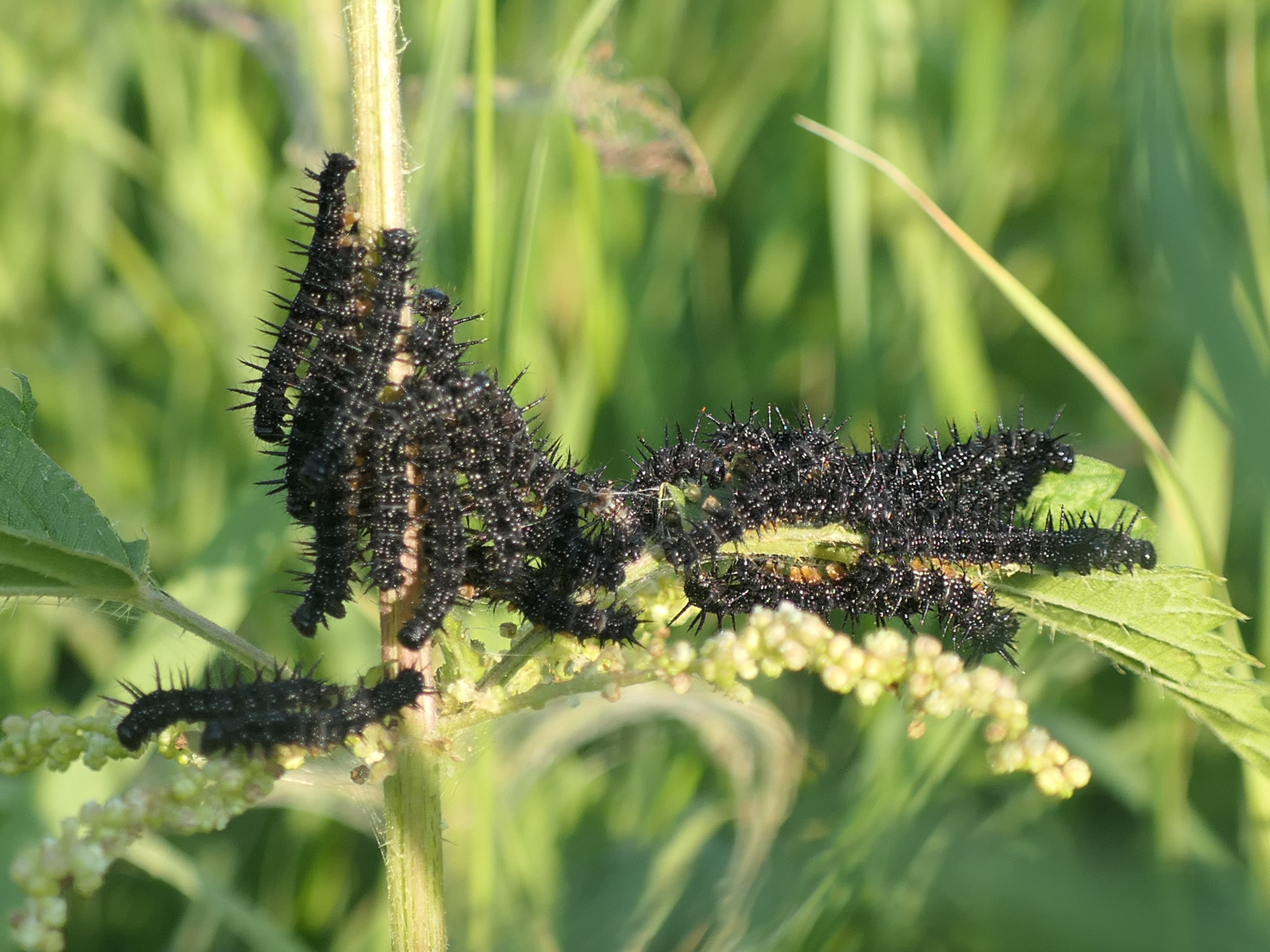 Tagpfauenauge (Aglais io (Linnaeus, 1758)), Larven in verschiedenen Entwicklungsstadien, bei Taubenheim, August 2016.