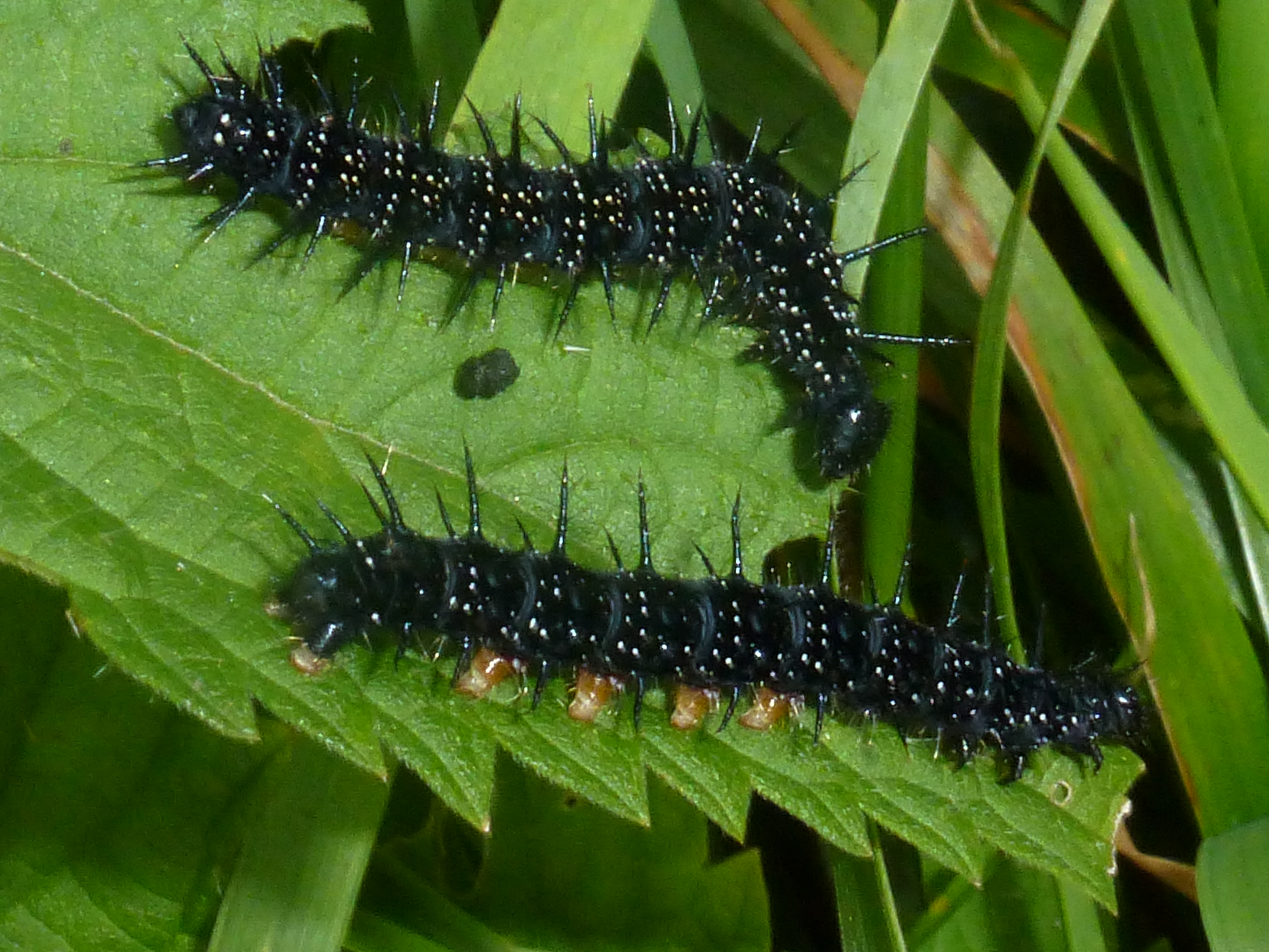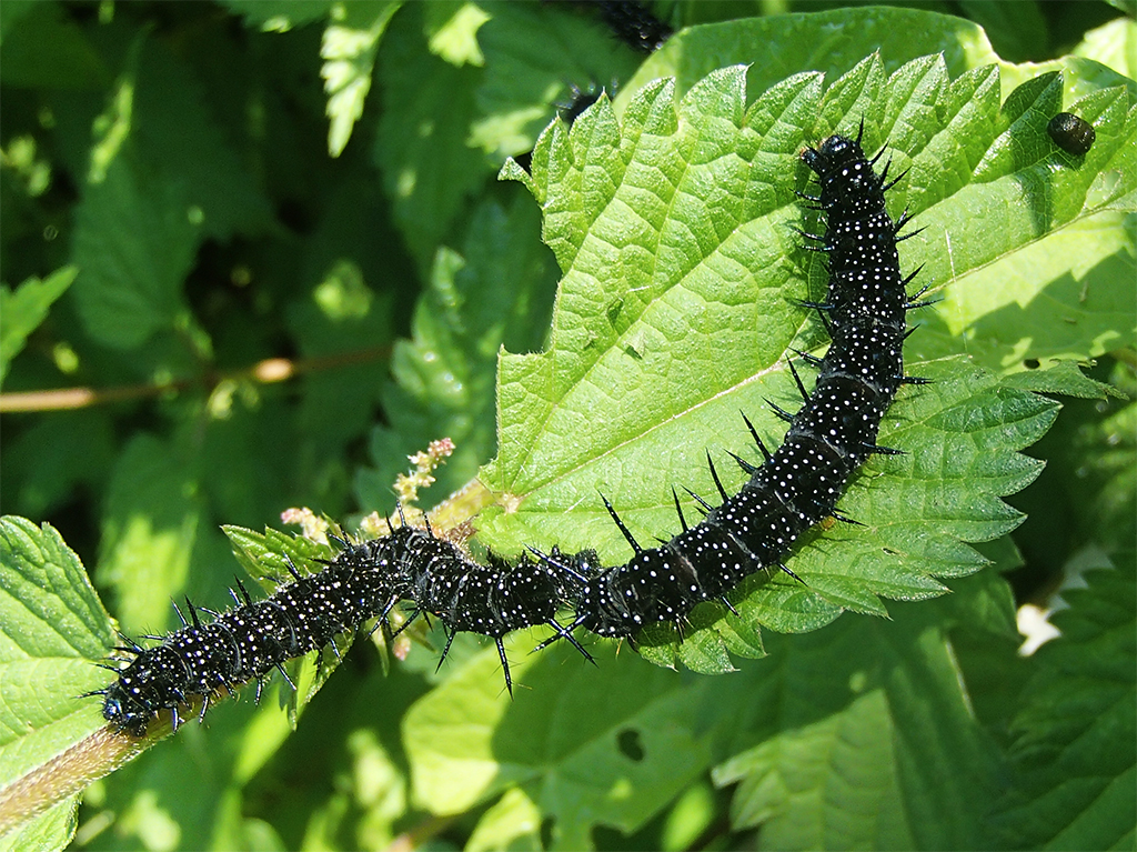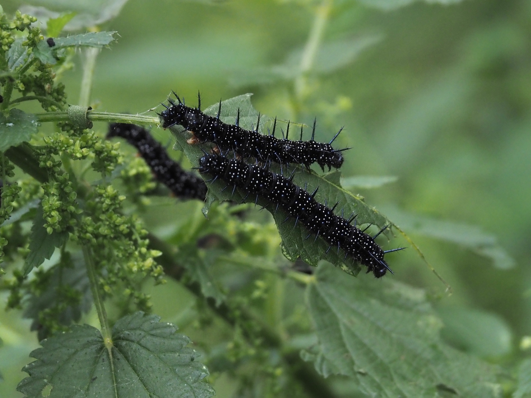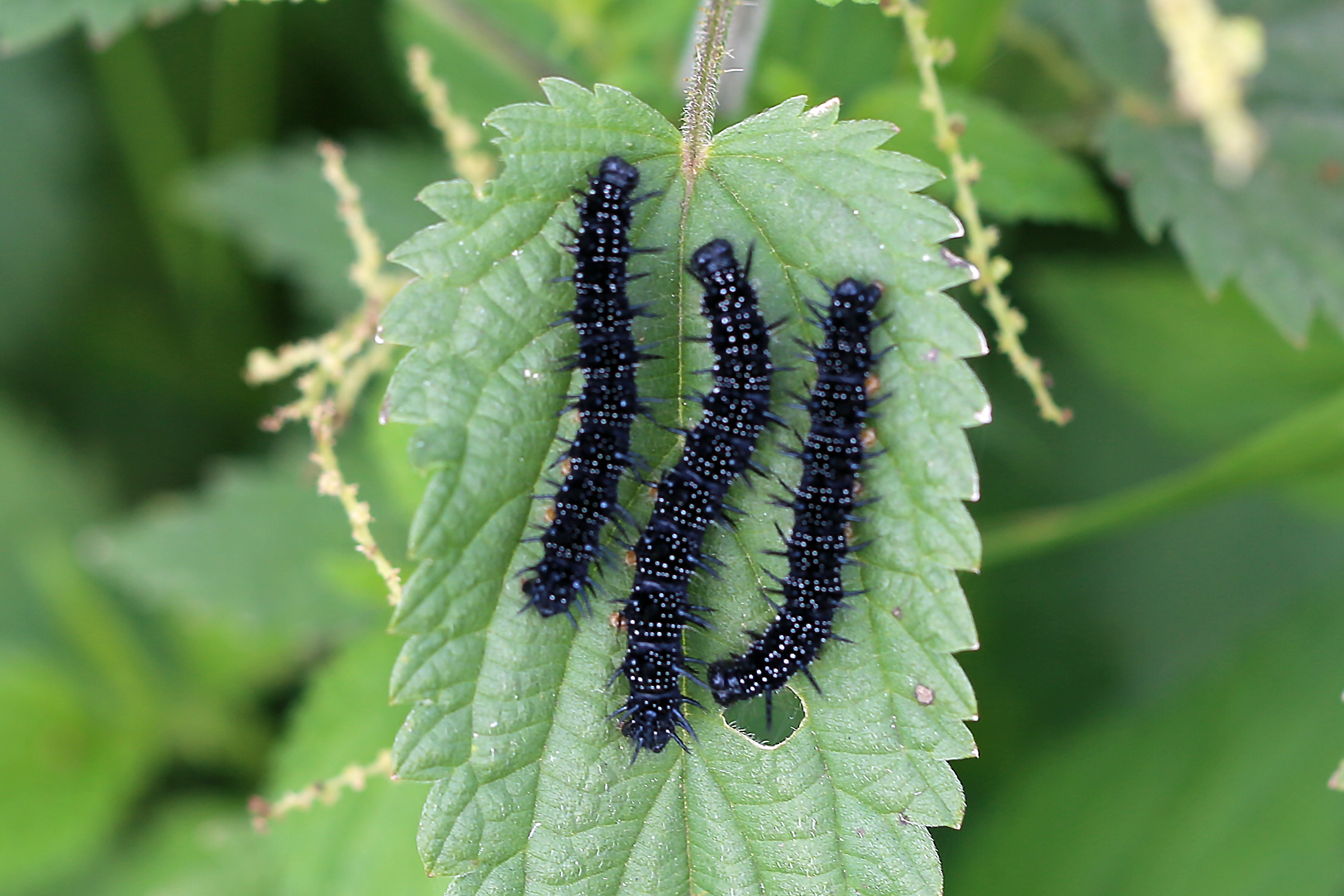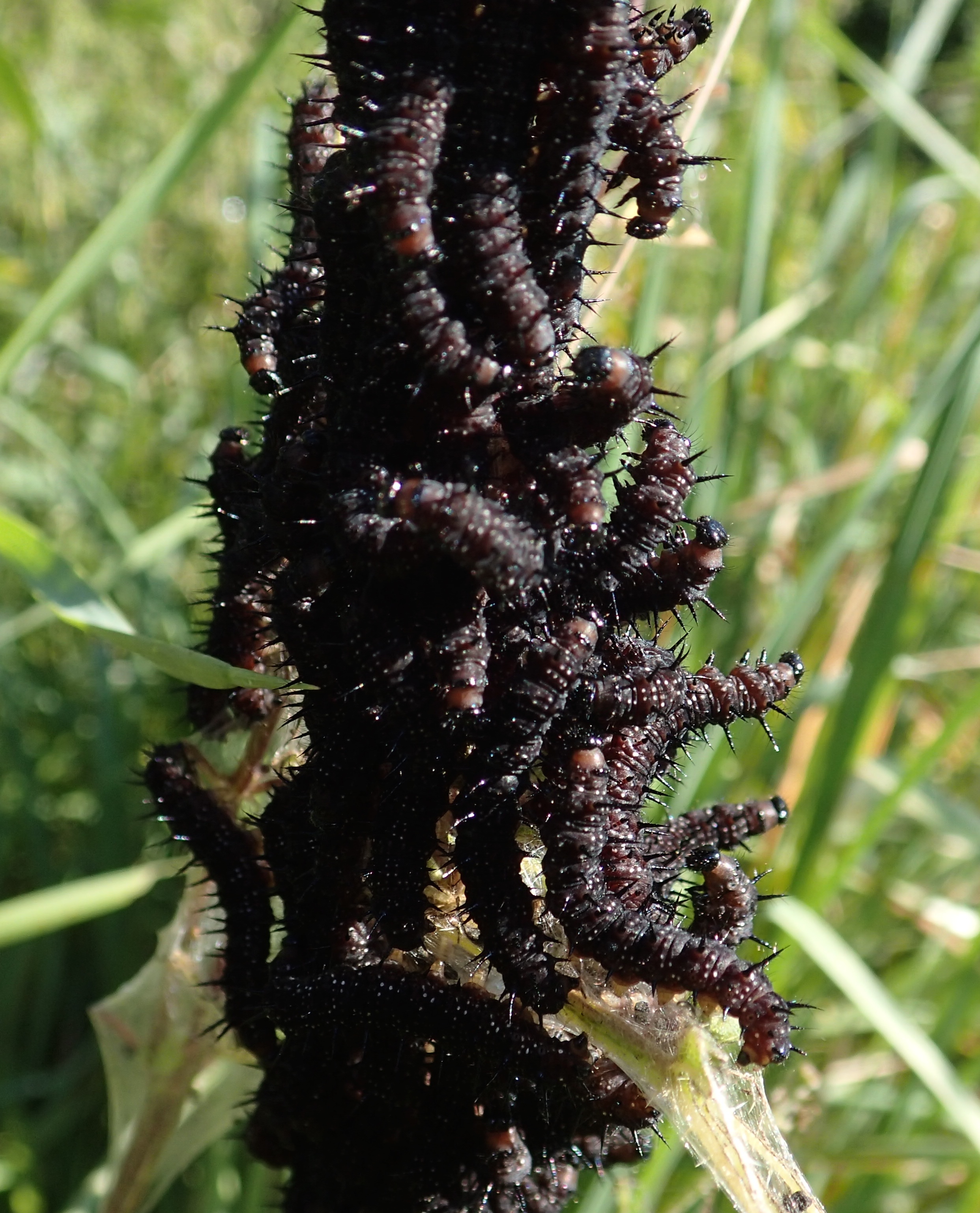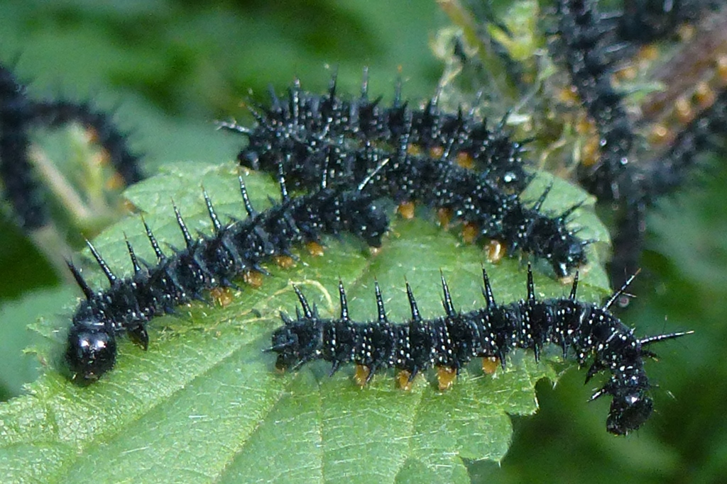 Tagpfauenauge (Aglais io (Linnaeus, 1758)), Larven in verschiedenen Entwicklungsstadien, bei Taubenheim, August 2016.