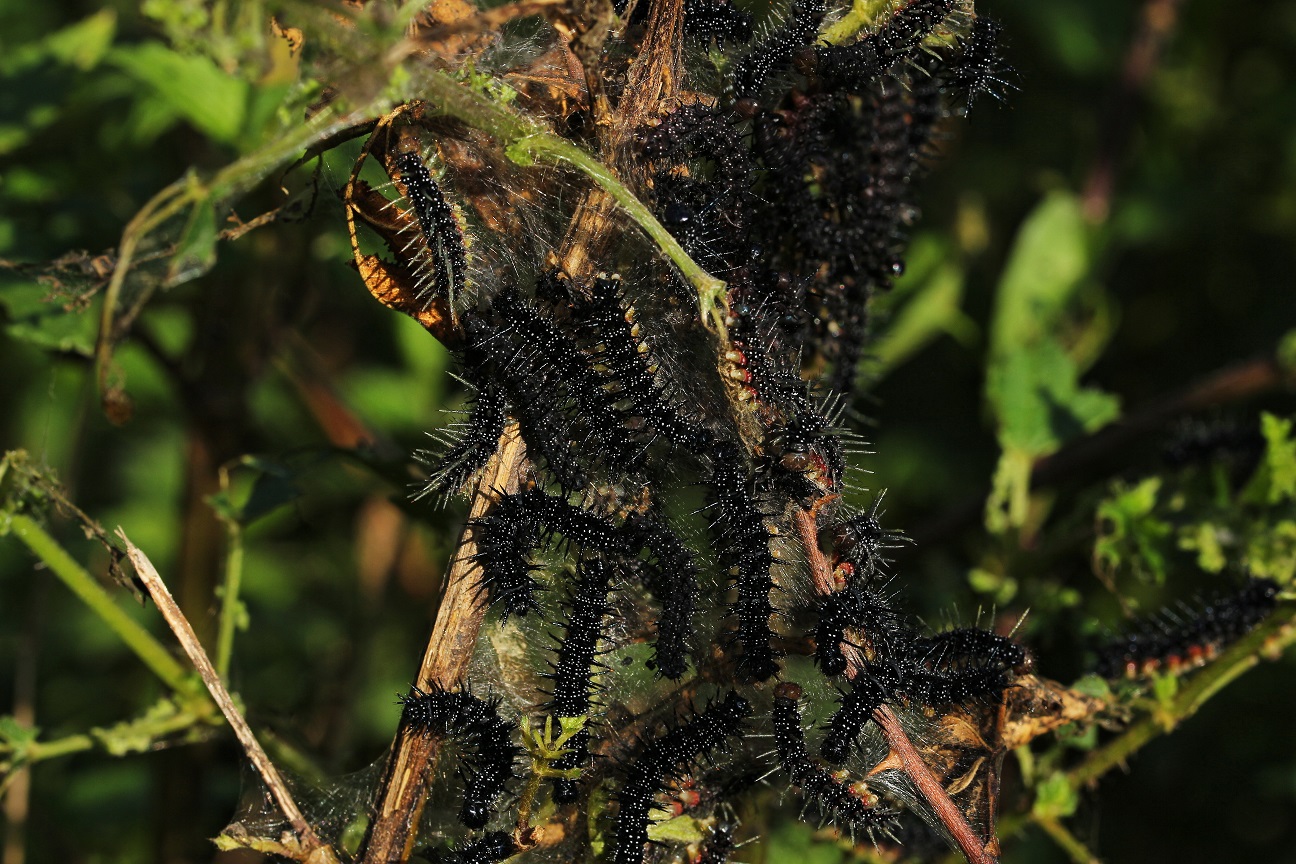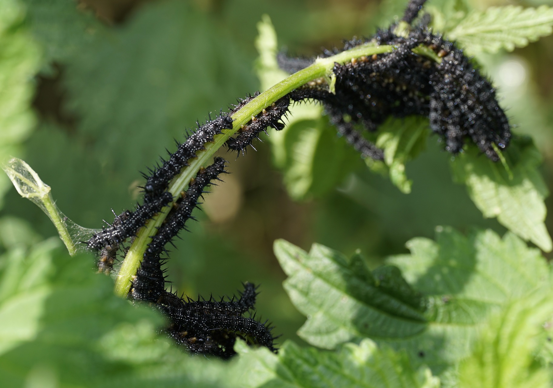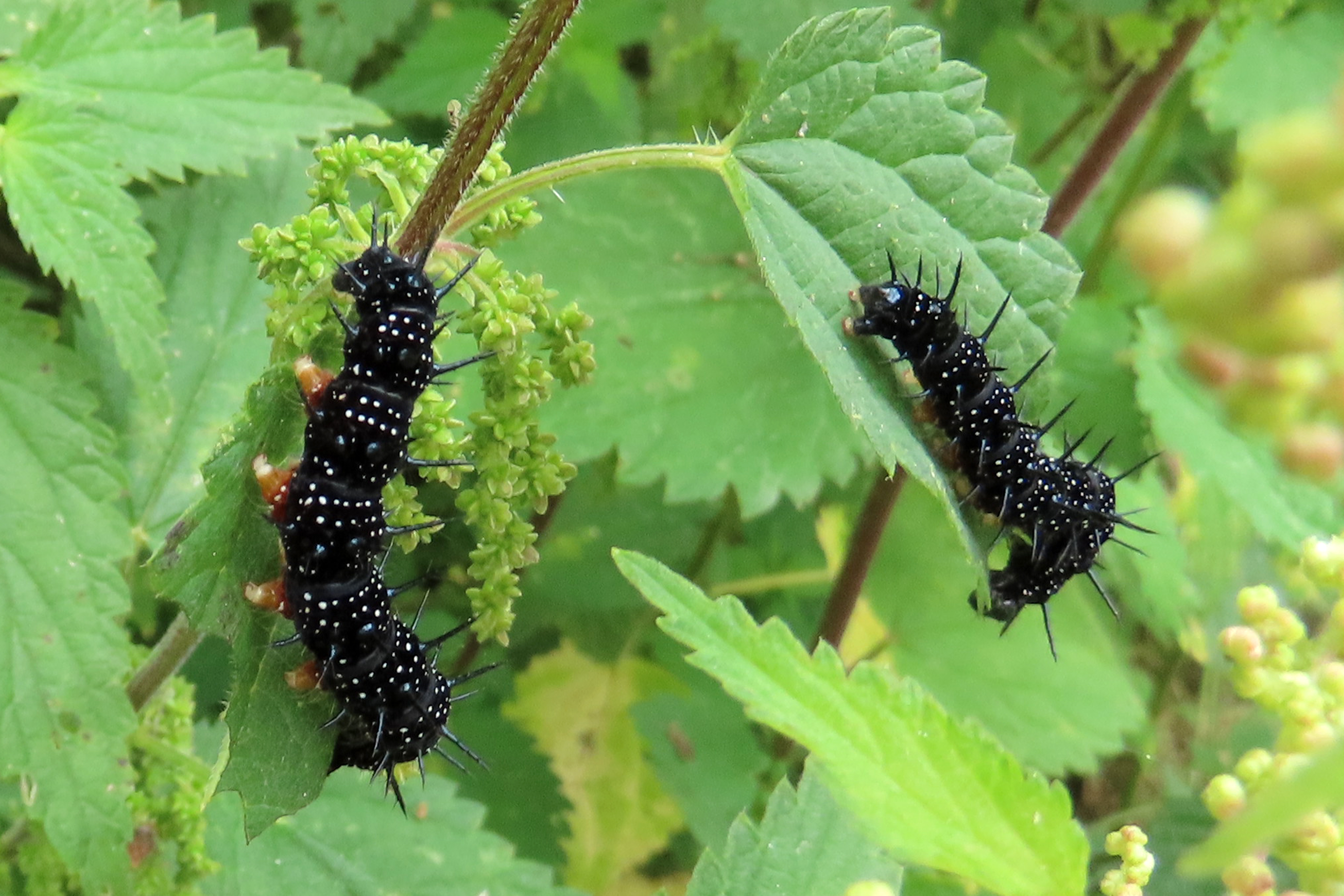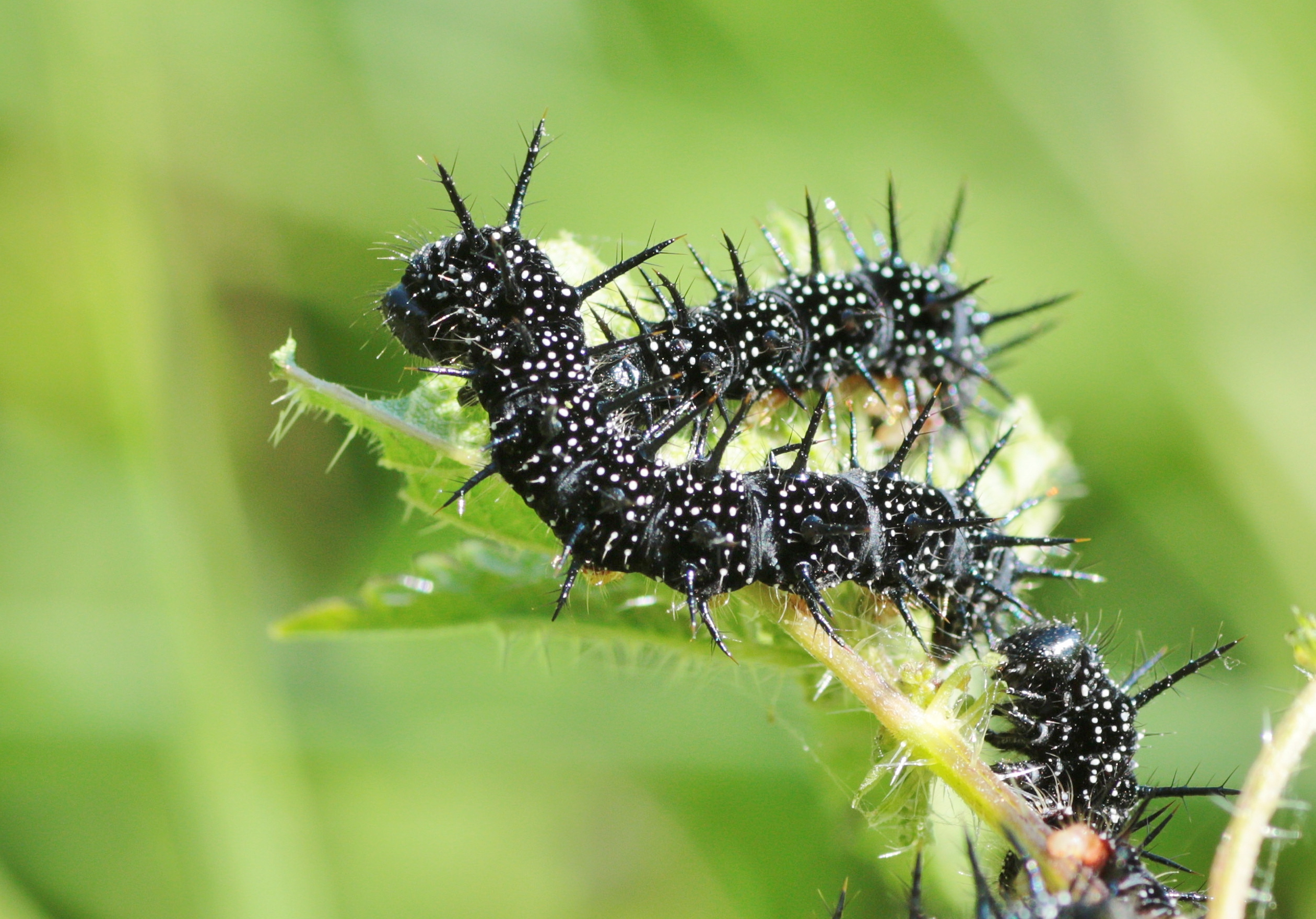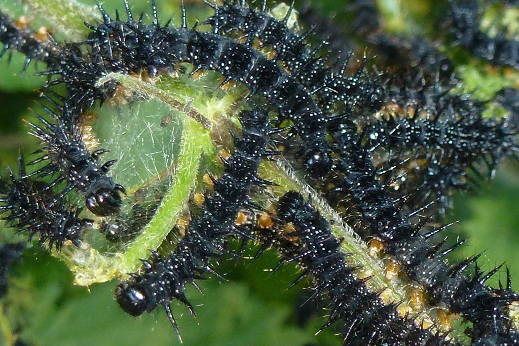 Tagpfauenauge (Aglais io (Linnaeus, 1758)), Larven in verschiedenen Entwicklungsstadien, bei Taubenheim, August 2016.