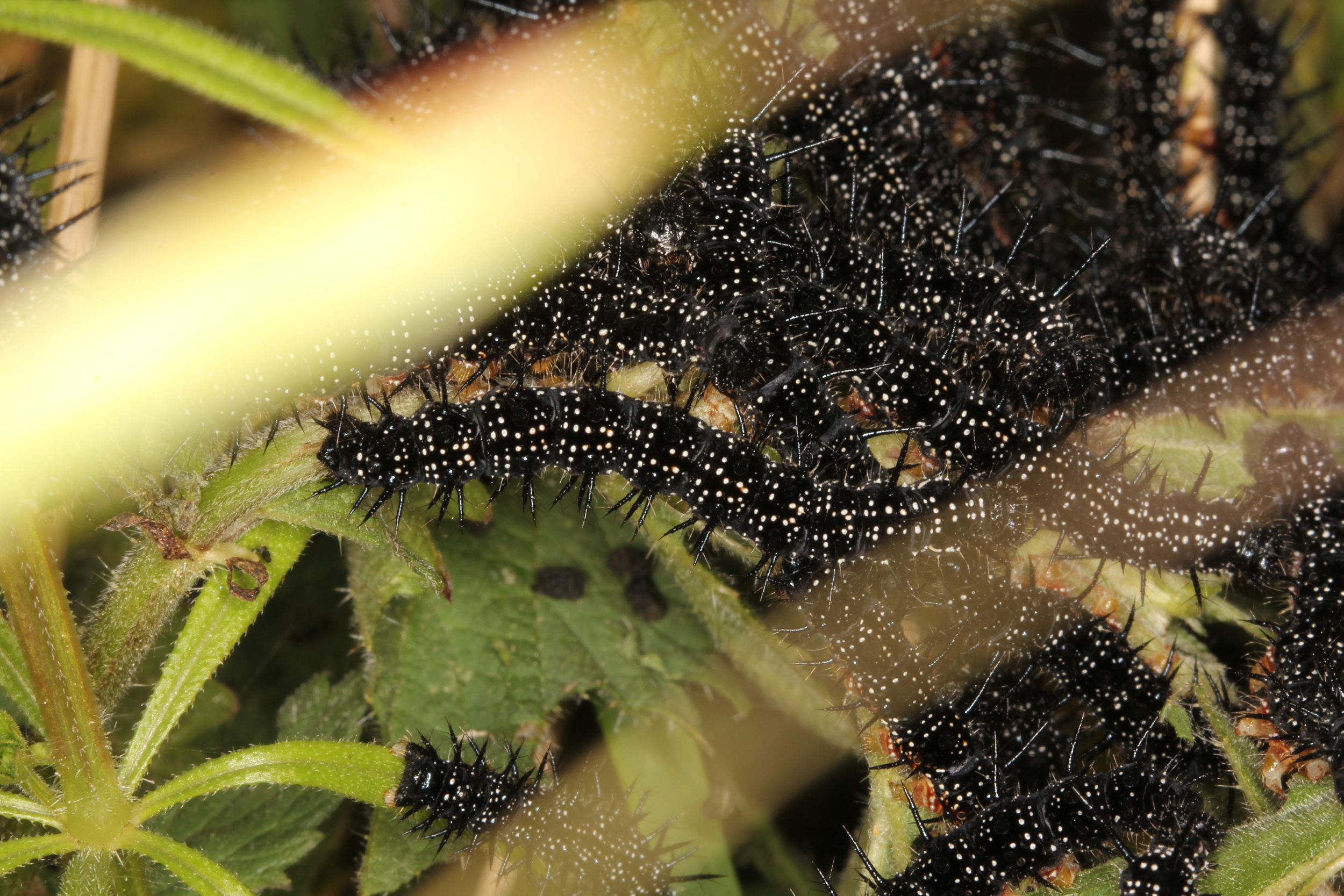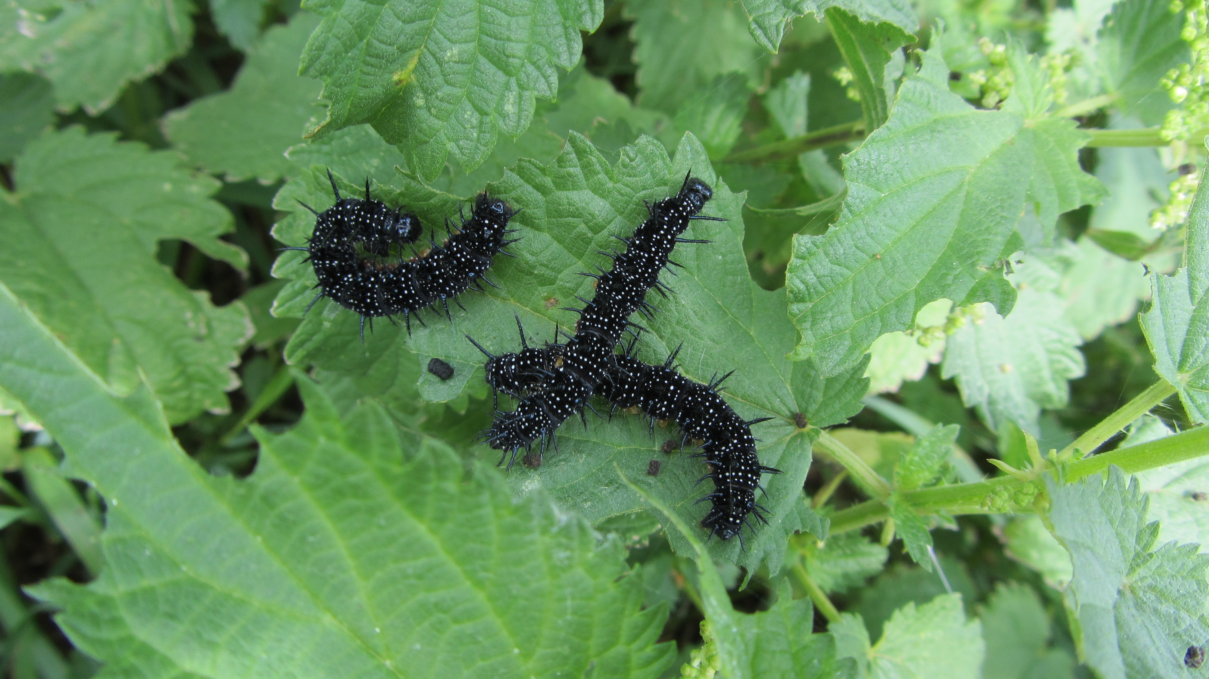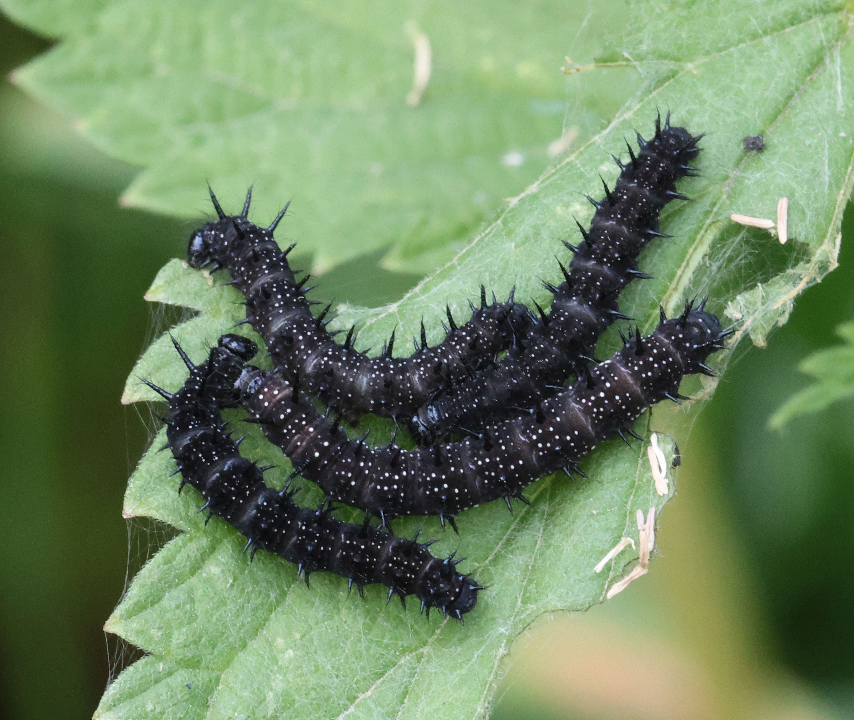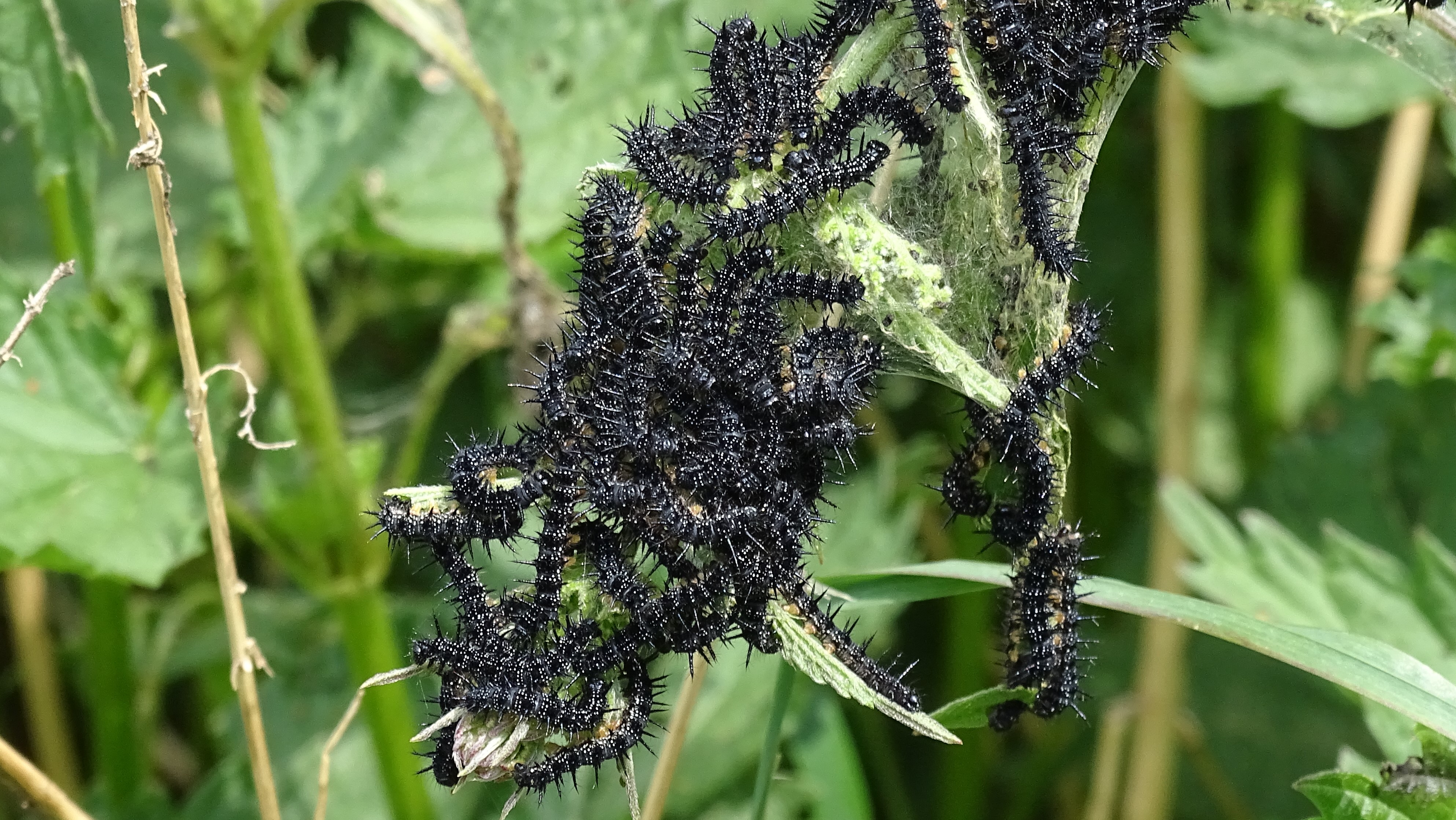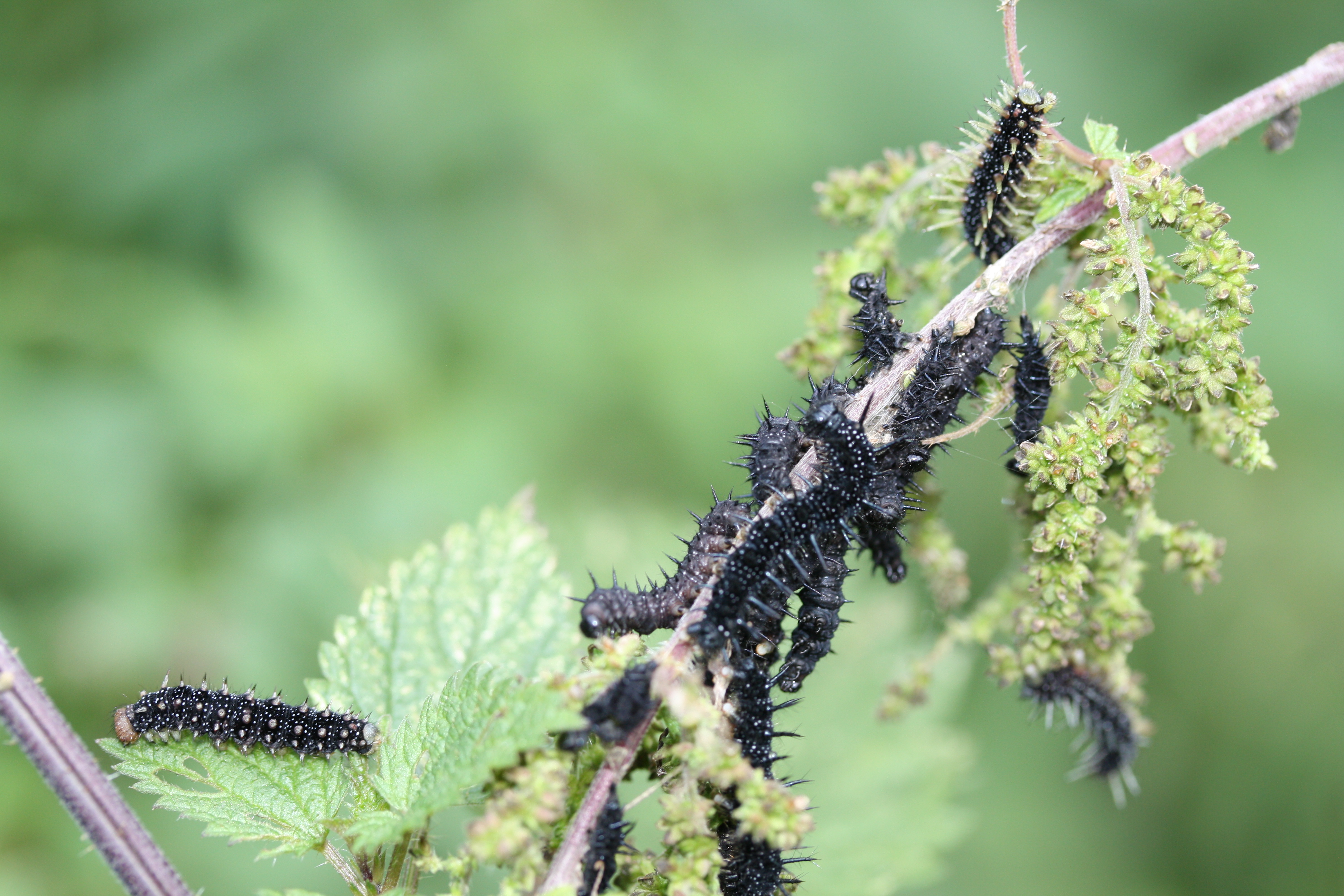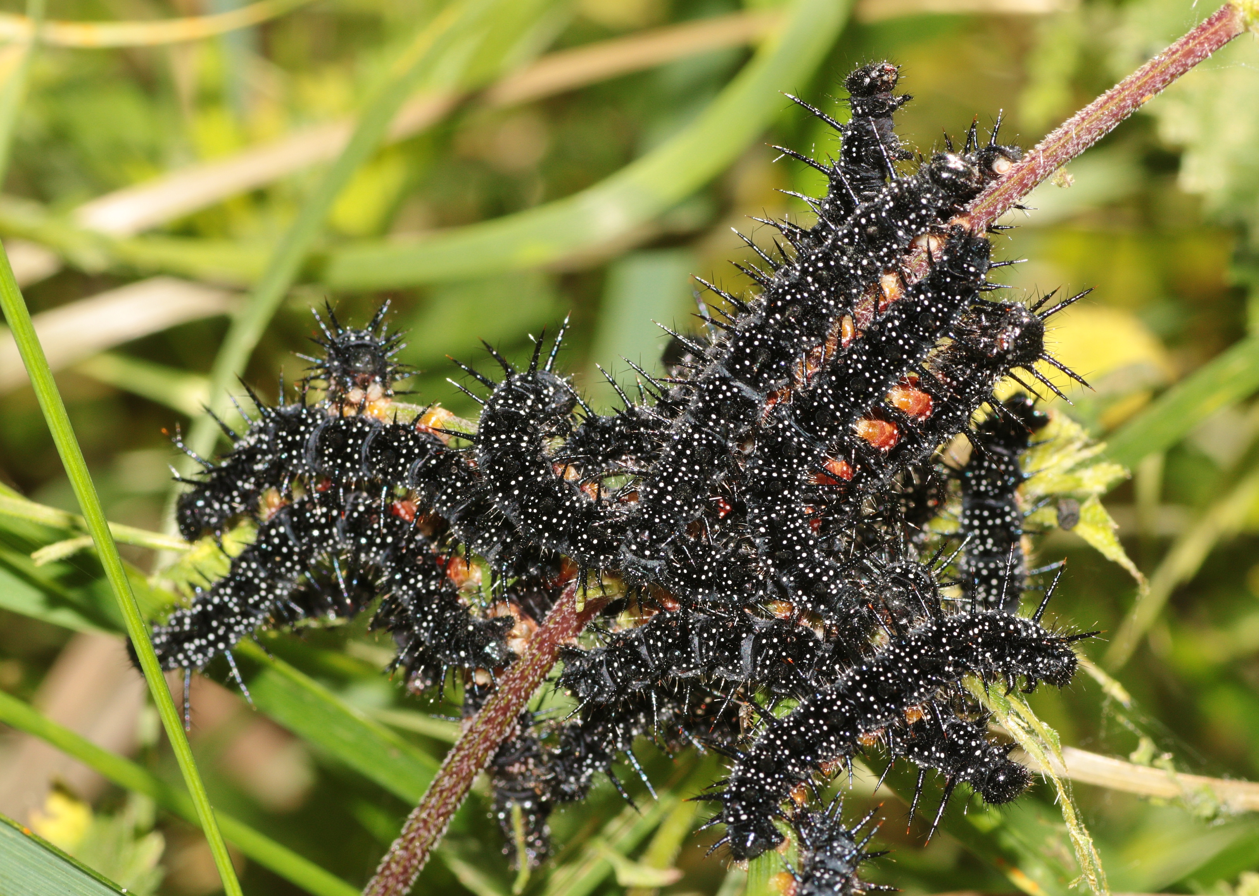Tagpfauenauge (Aglais io (Linnaeus, 1758)), Larven in verschiedenen Entwicklungsstadien, bei Taubenheim, August 2016.