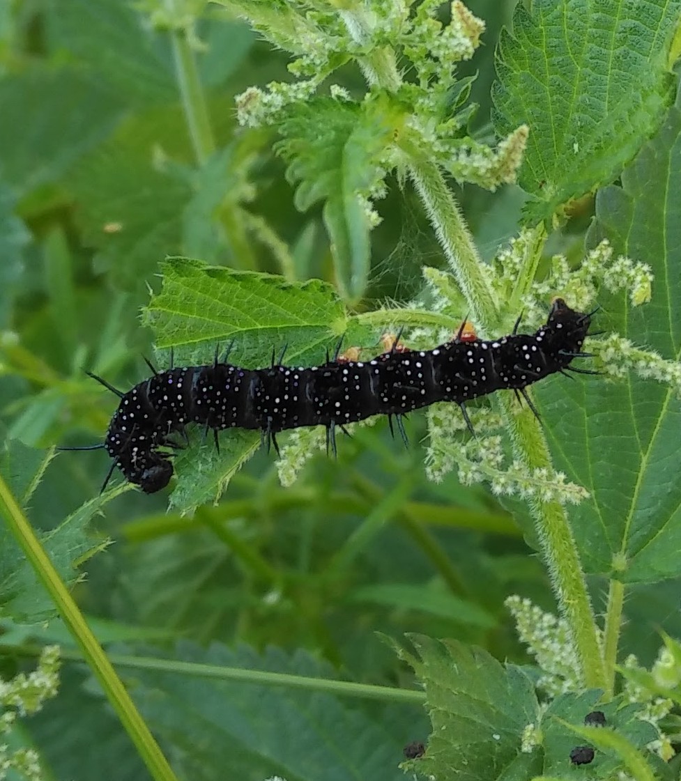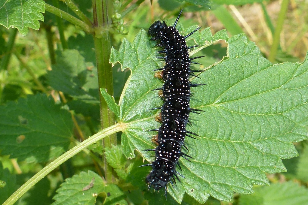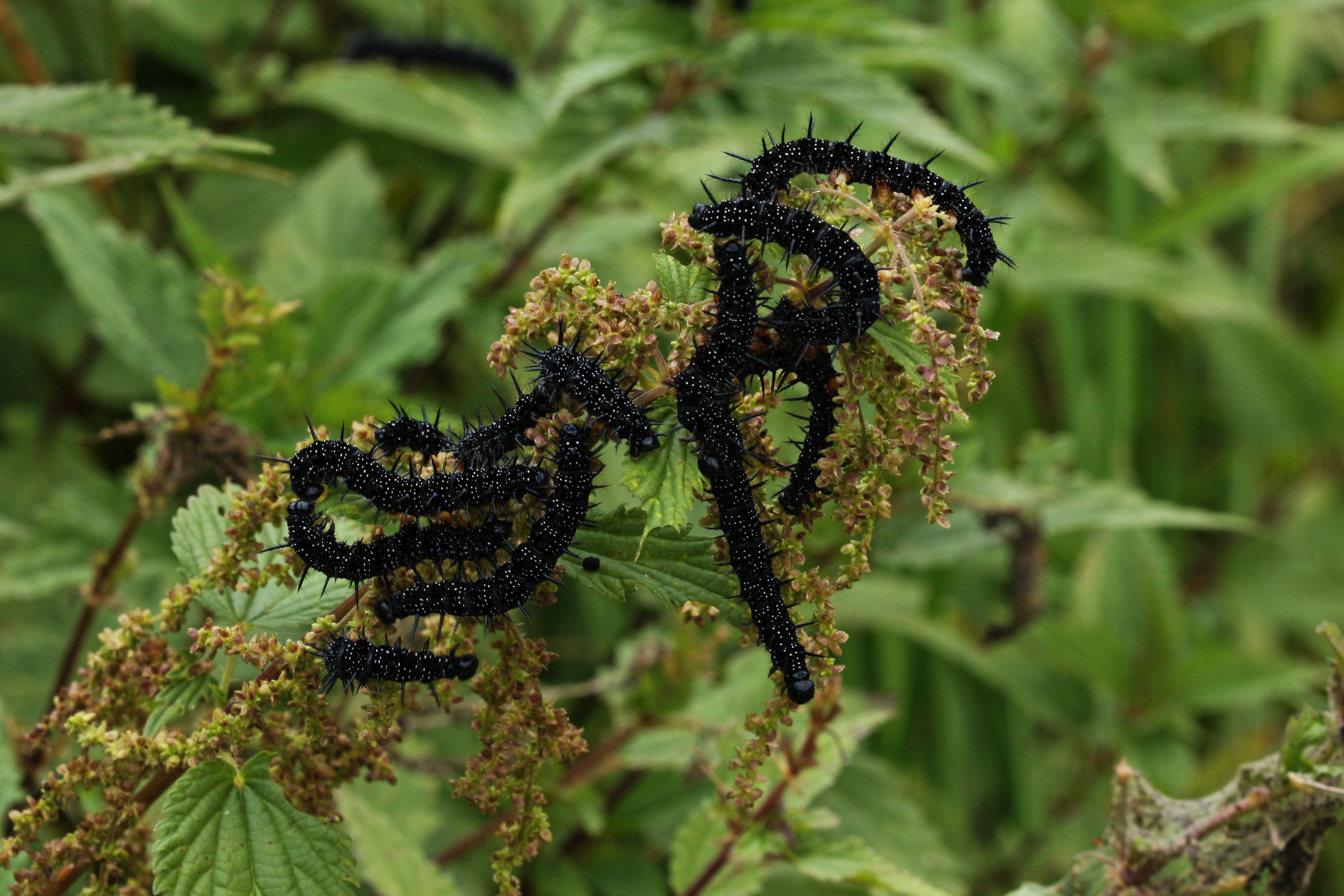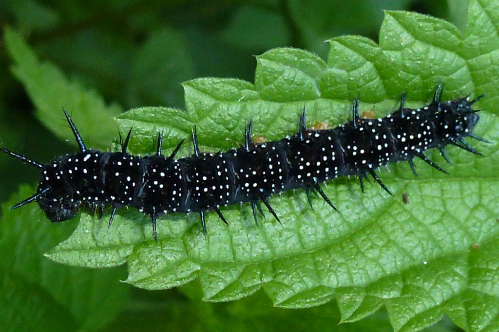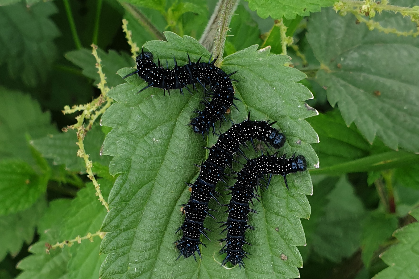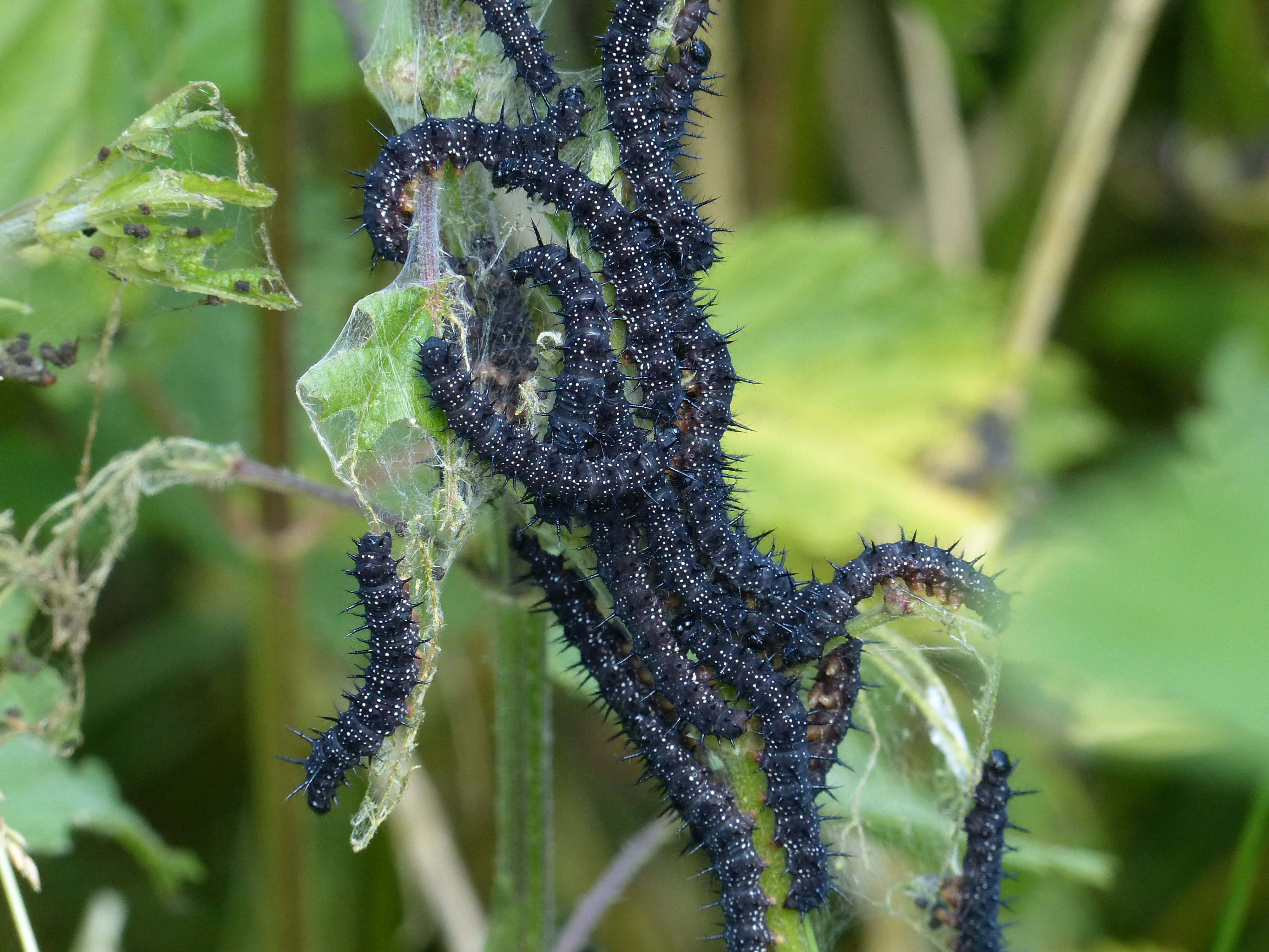 Tagpfauenauge (Aglais io (Linnaeus, 1758)), Larven in verschiedenen Entwicklungsstadien, bei Taubenheim, August 2016.