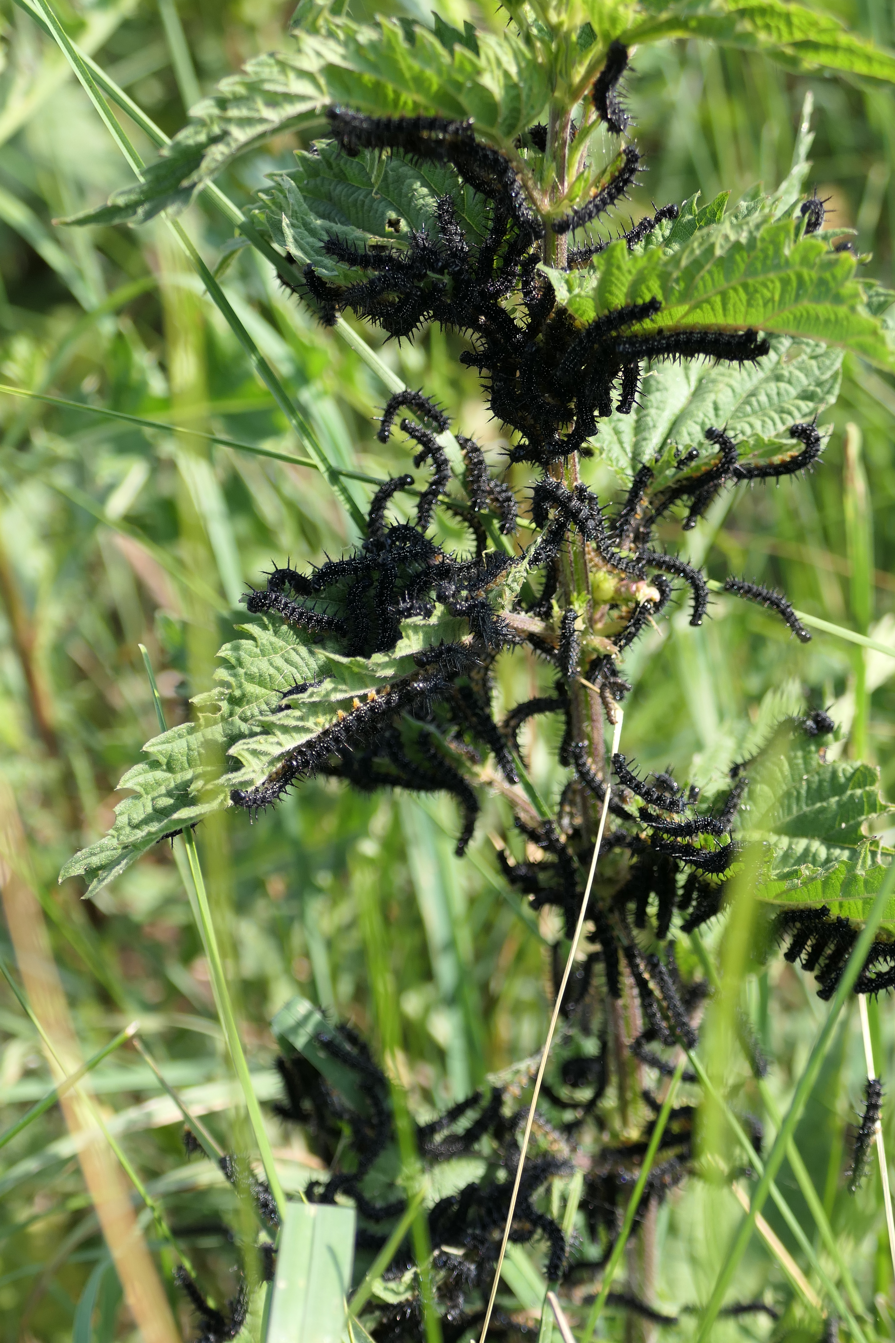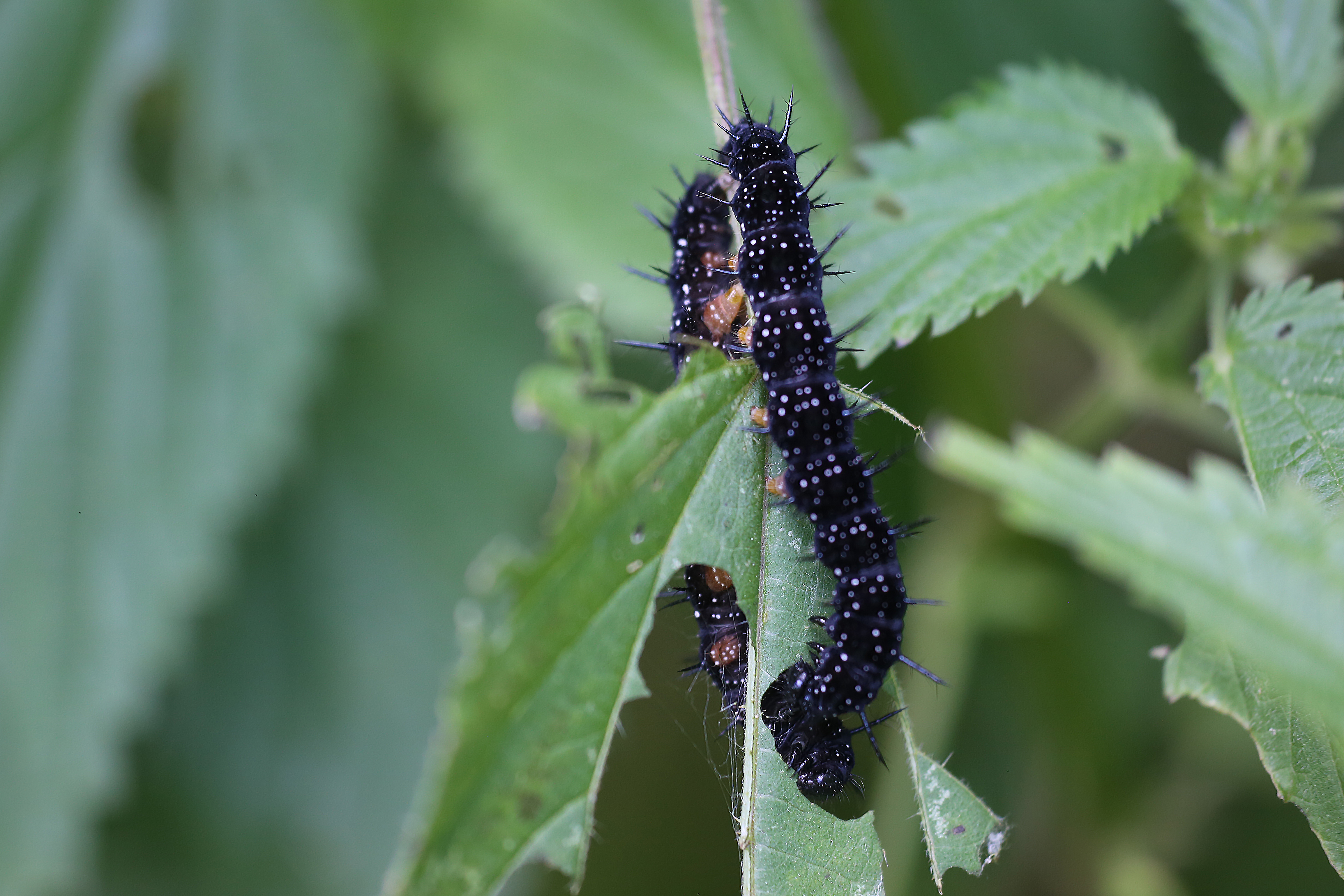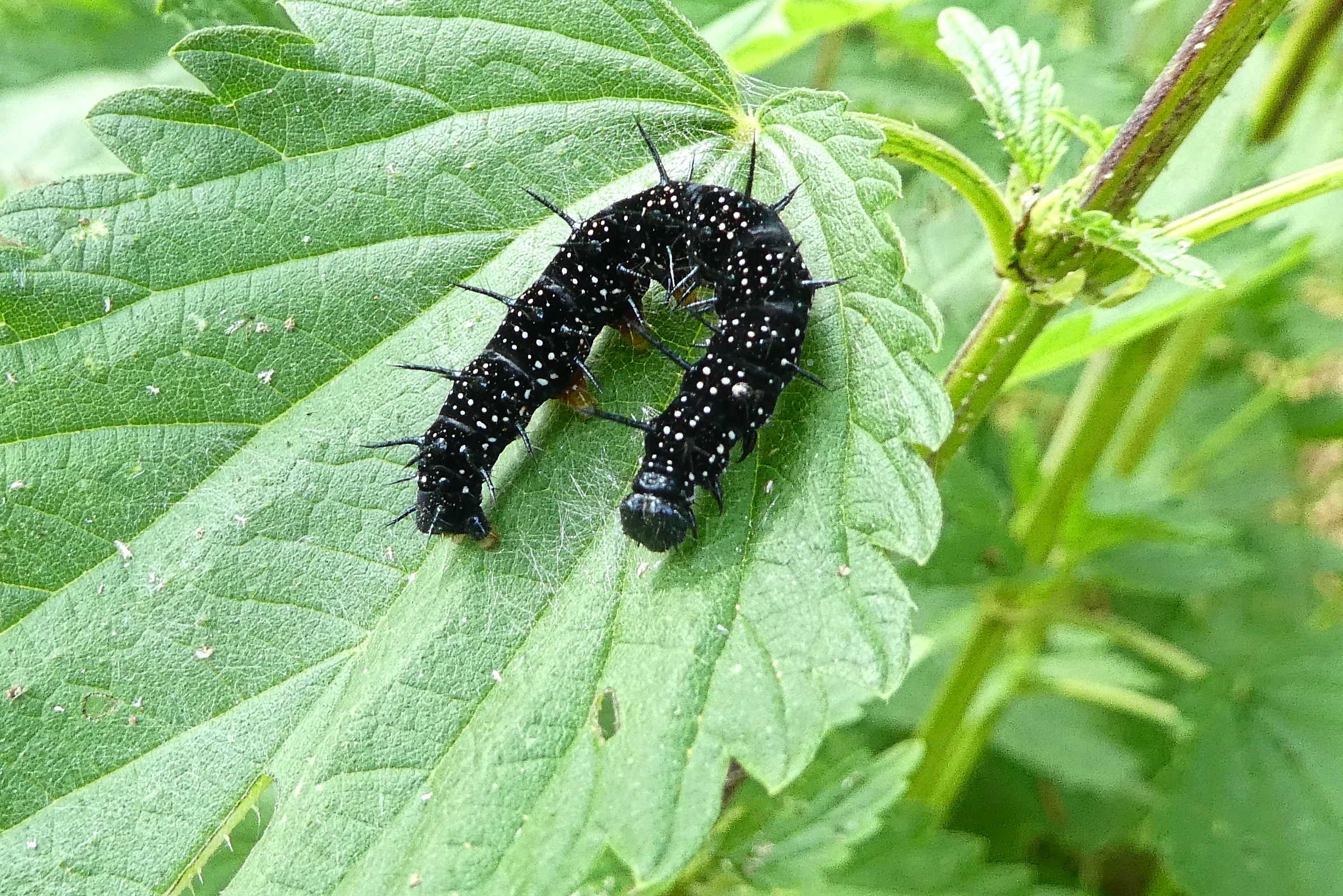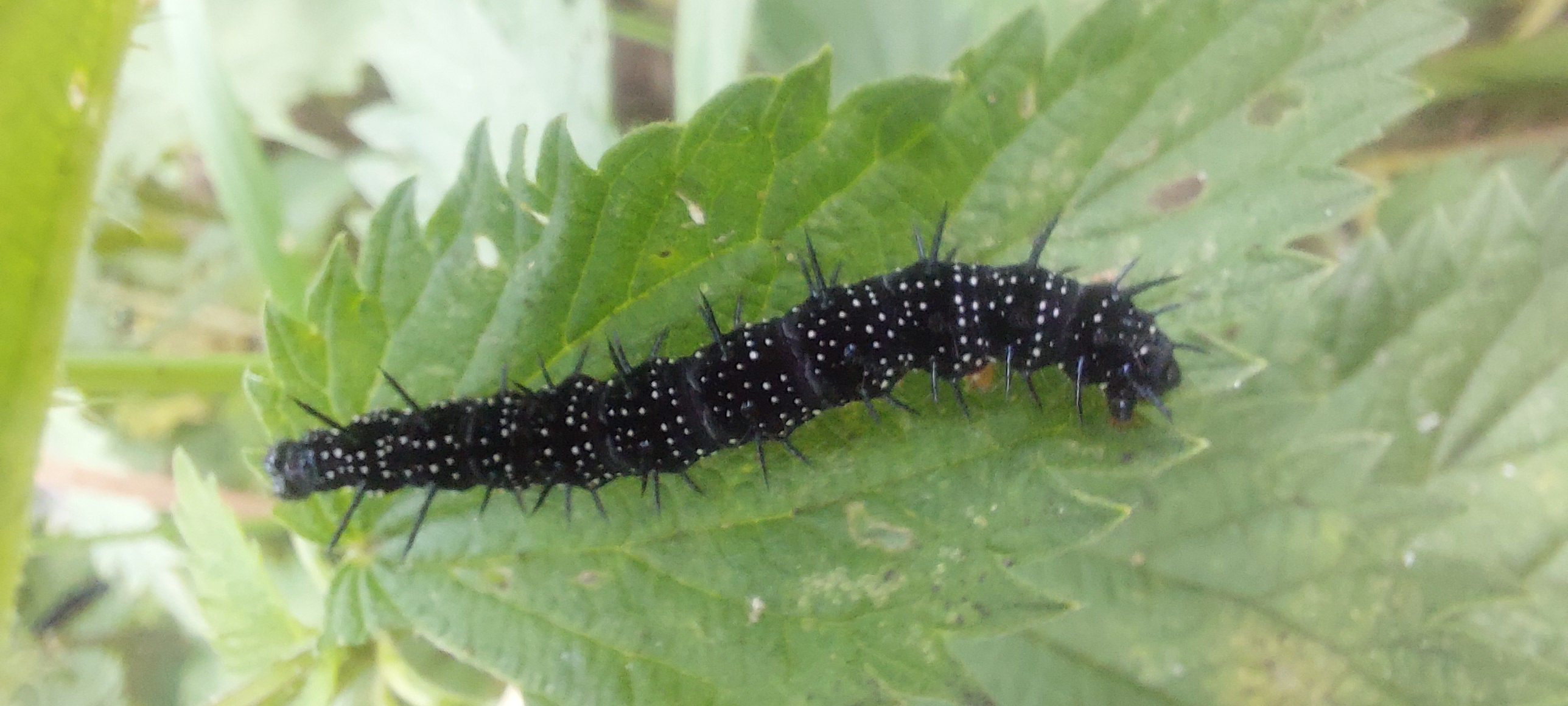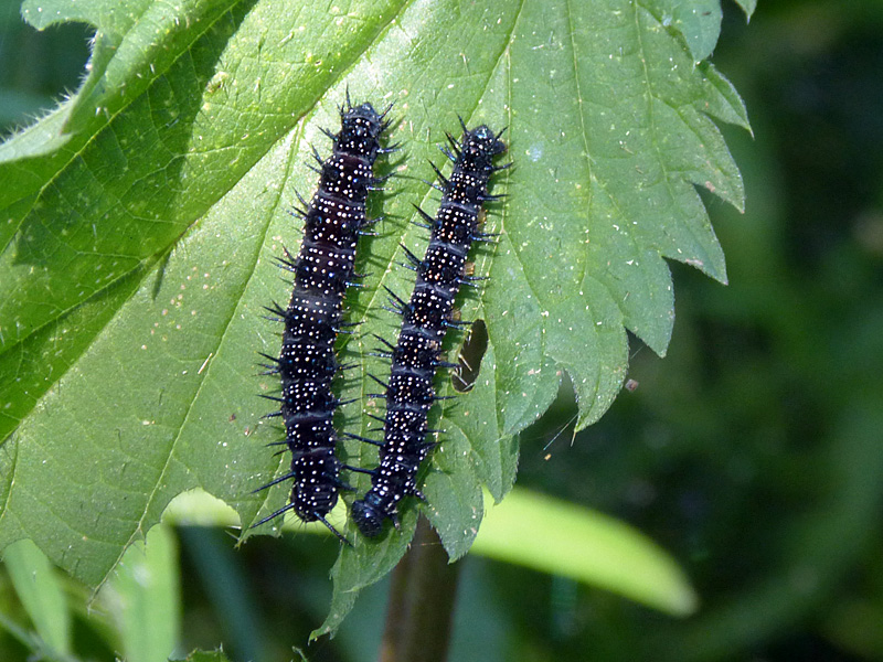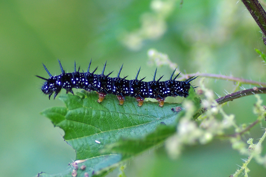 Tagpfauenauge (Aglais io (Linnaeus, 1758)), Larven in verschiedenen Entwicklungsstadien, bei Taubenheim, August 2016.