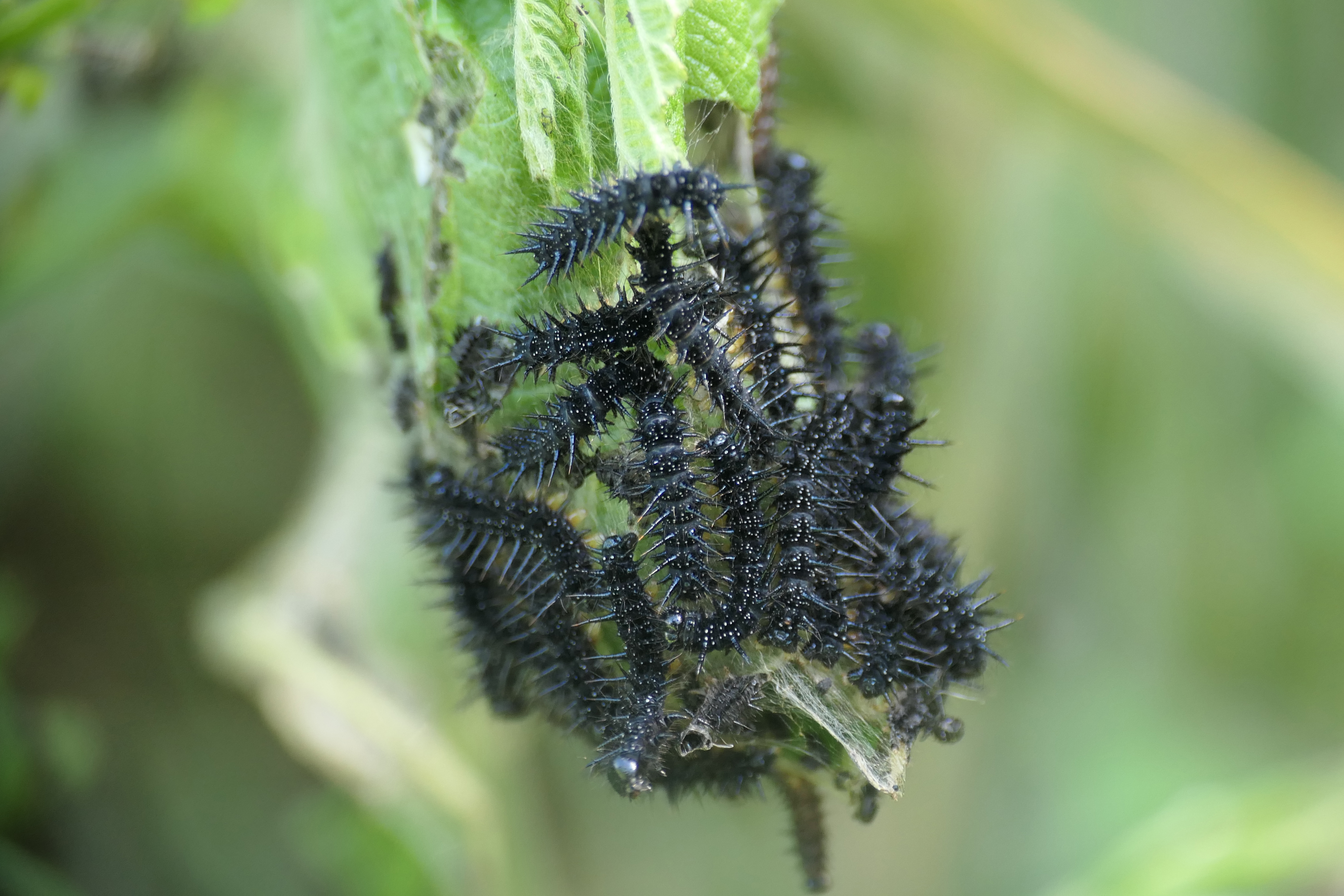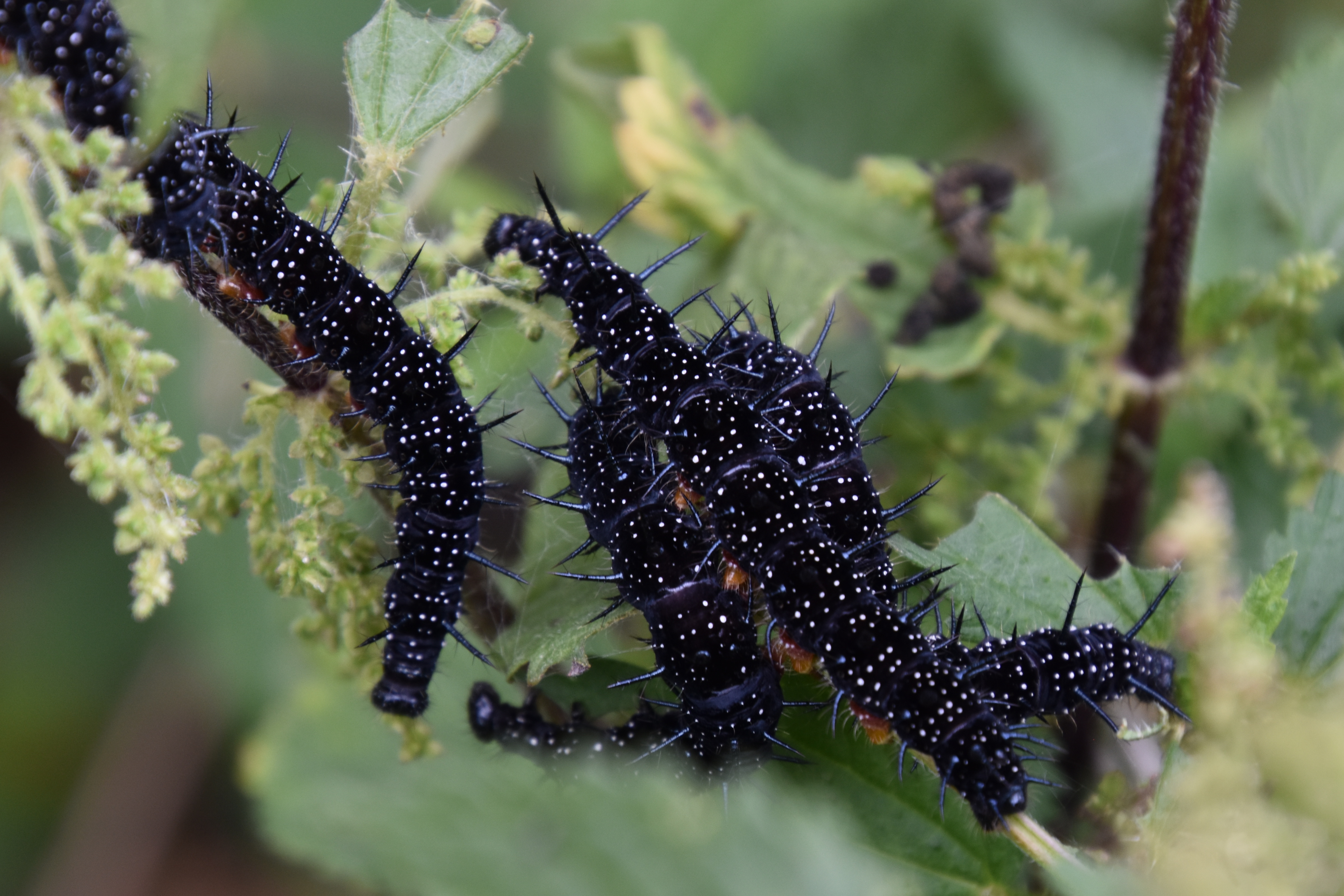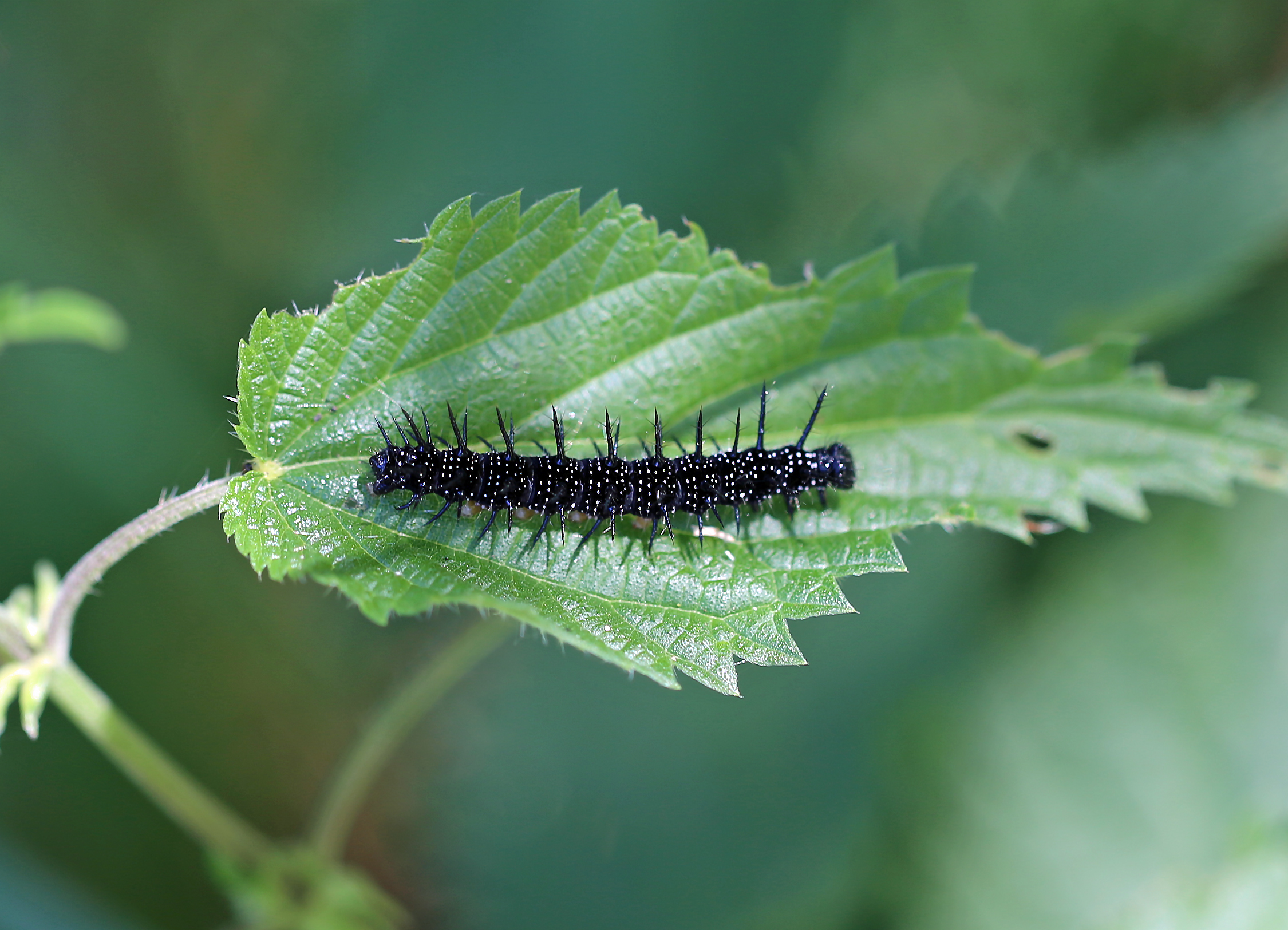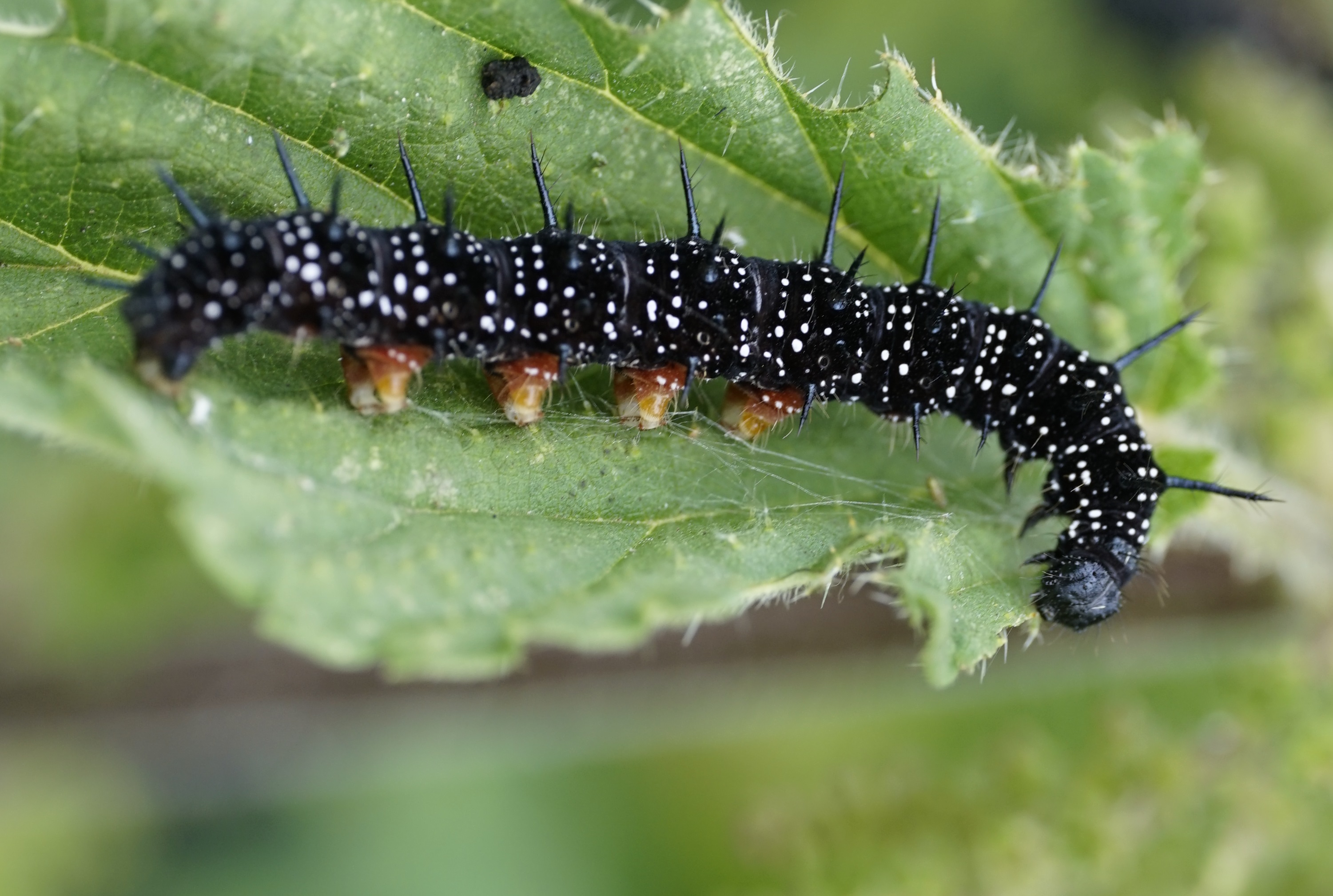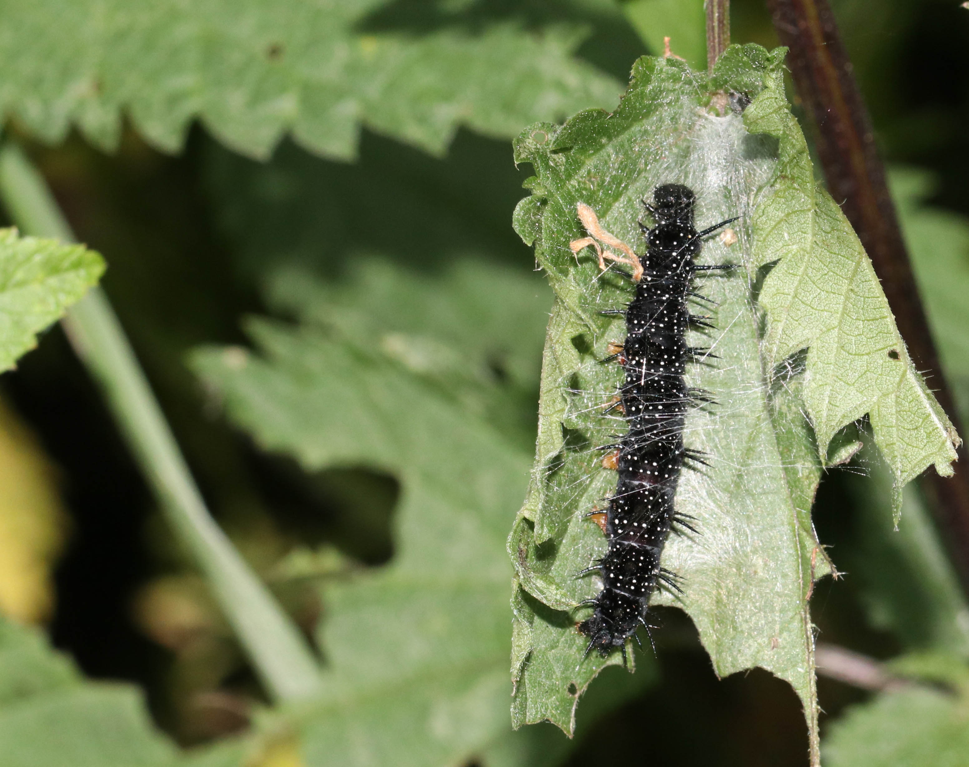 Tagpfauenauge (Aglais io (Linnaeus, 1758)), Larven in verschiedenen Entwicklungsstadien, bei Taubenheim, August 2016.