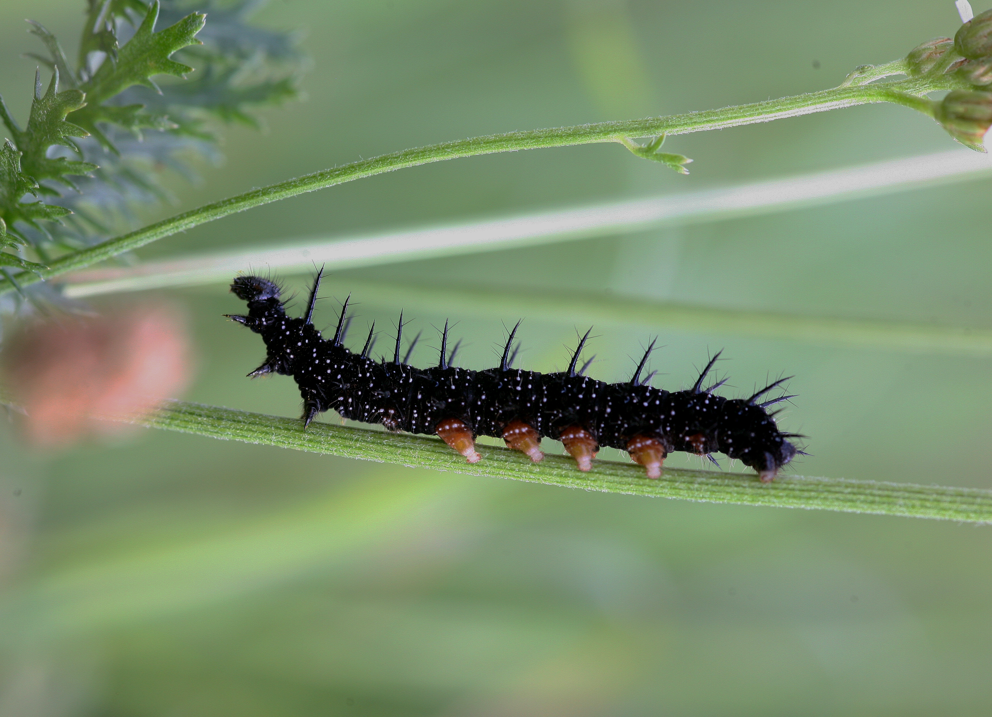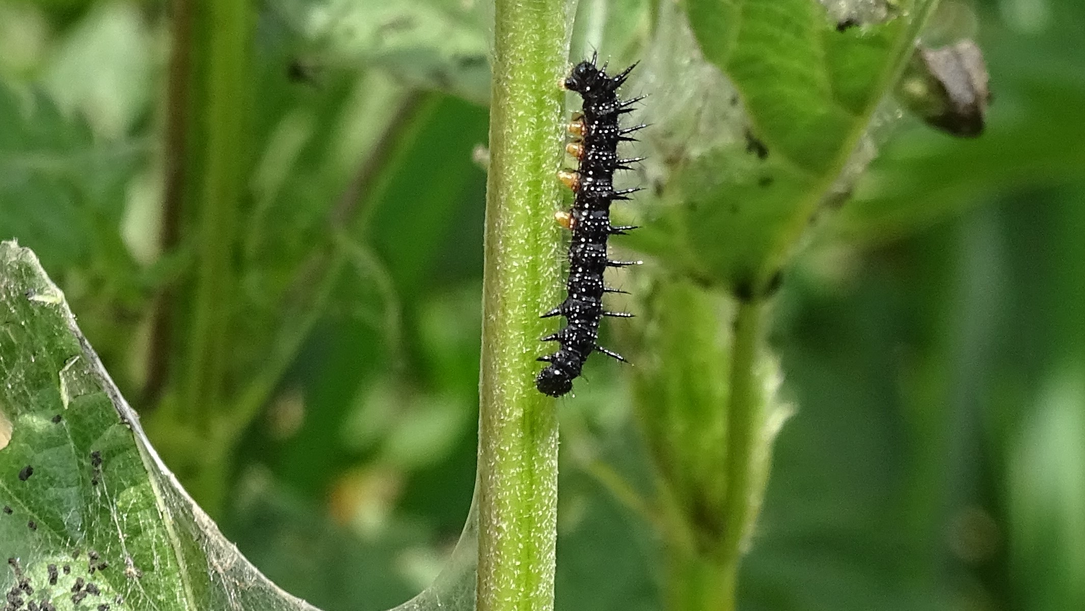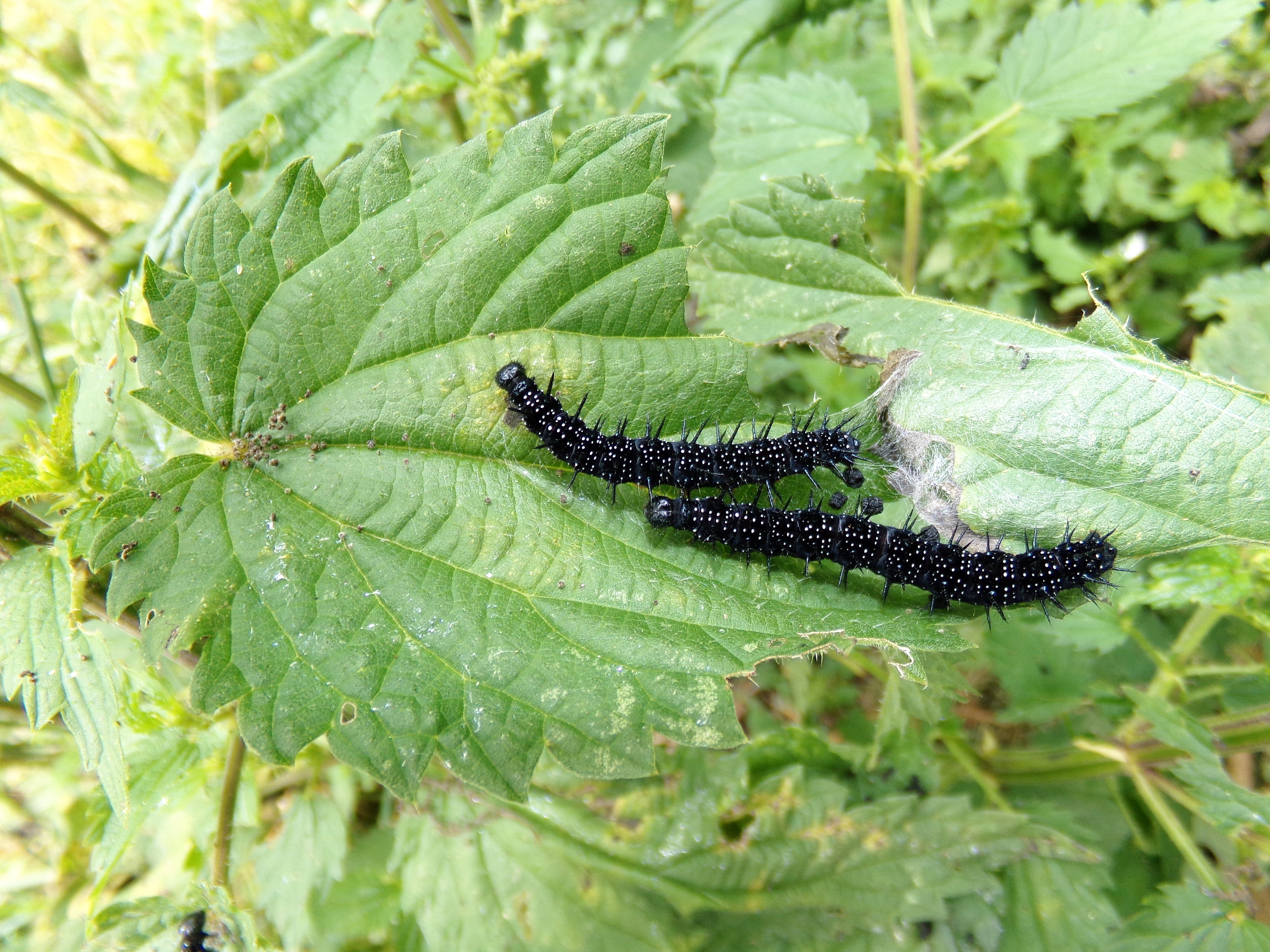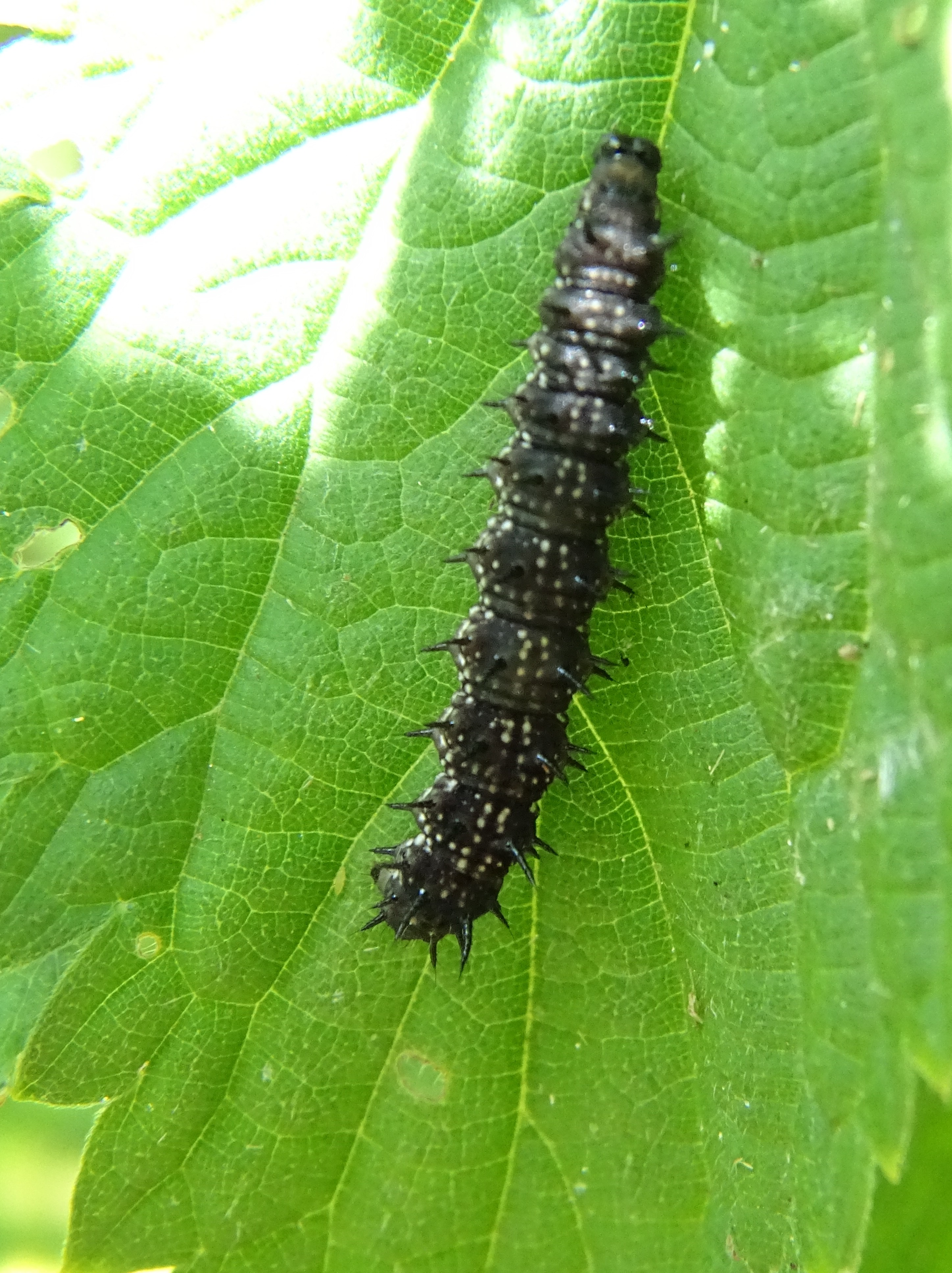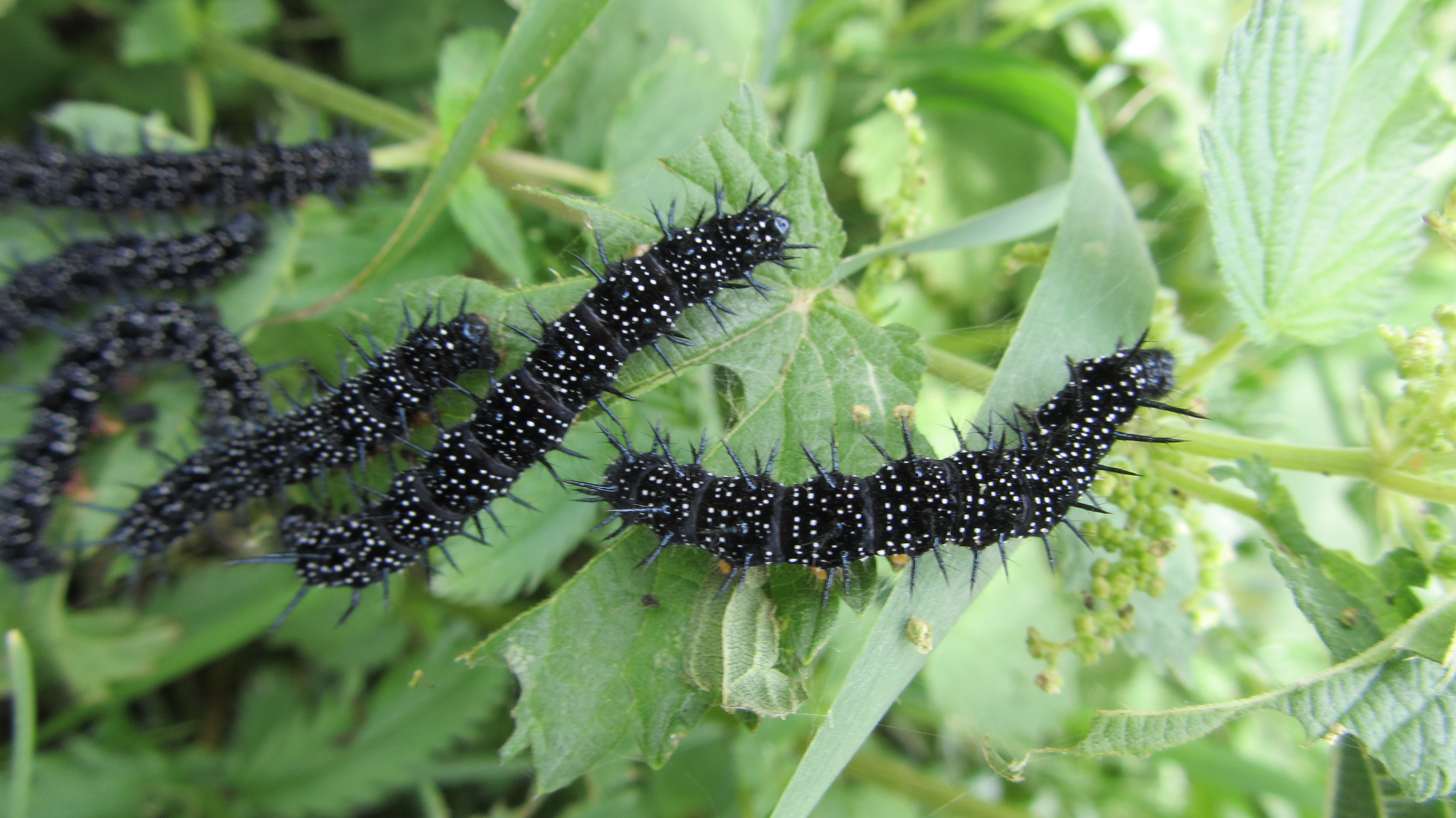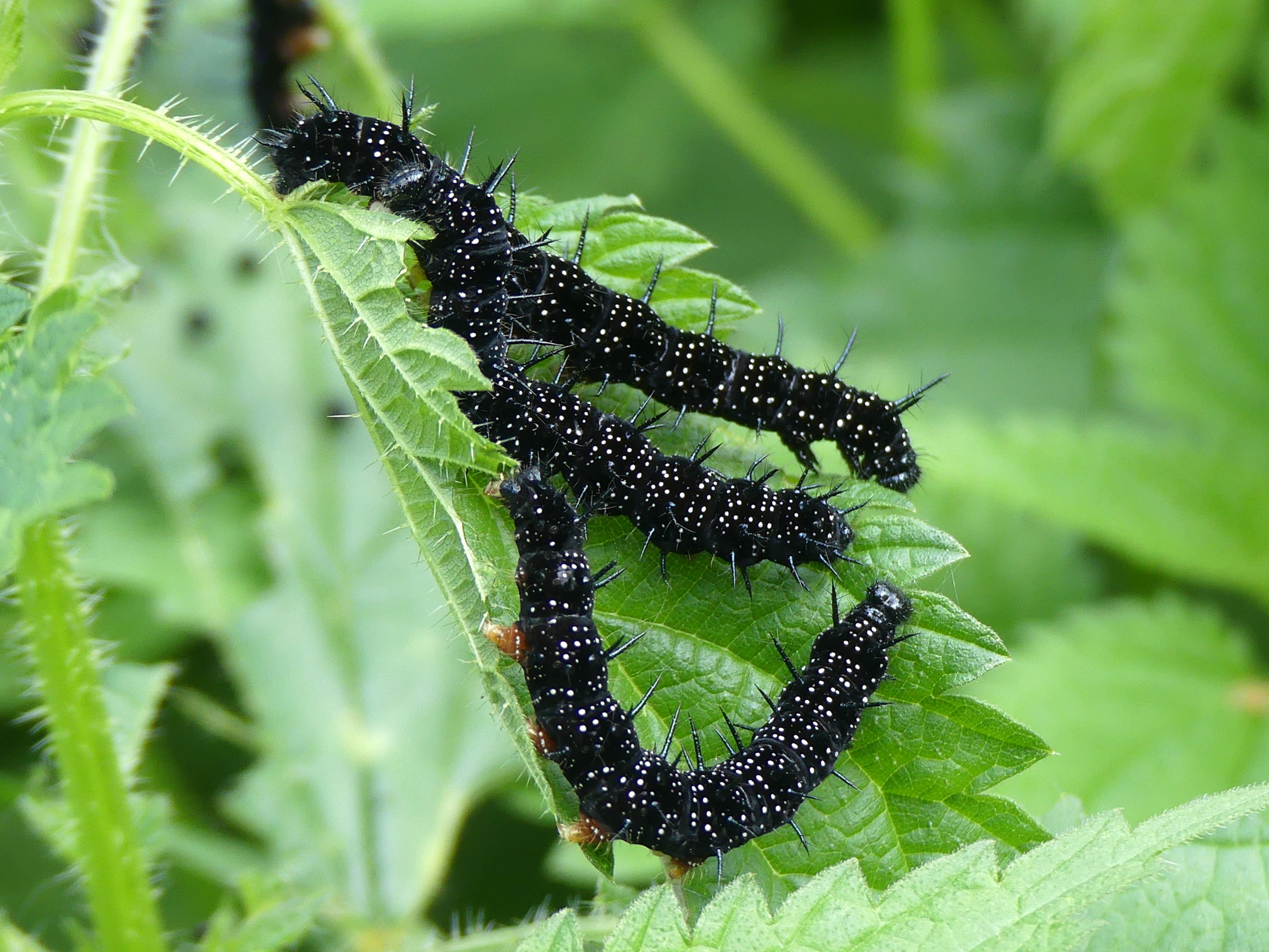 Tagpfauenauge (Aglais io (Linnaeus, 1758)), Larven in verschiedenen Entwicklungsstadien, bei Taubenheim, August 2016.
