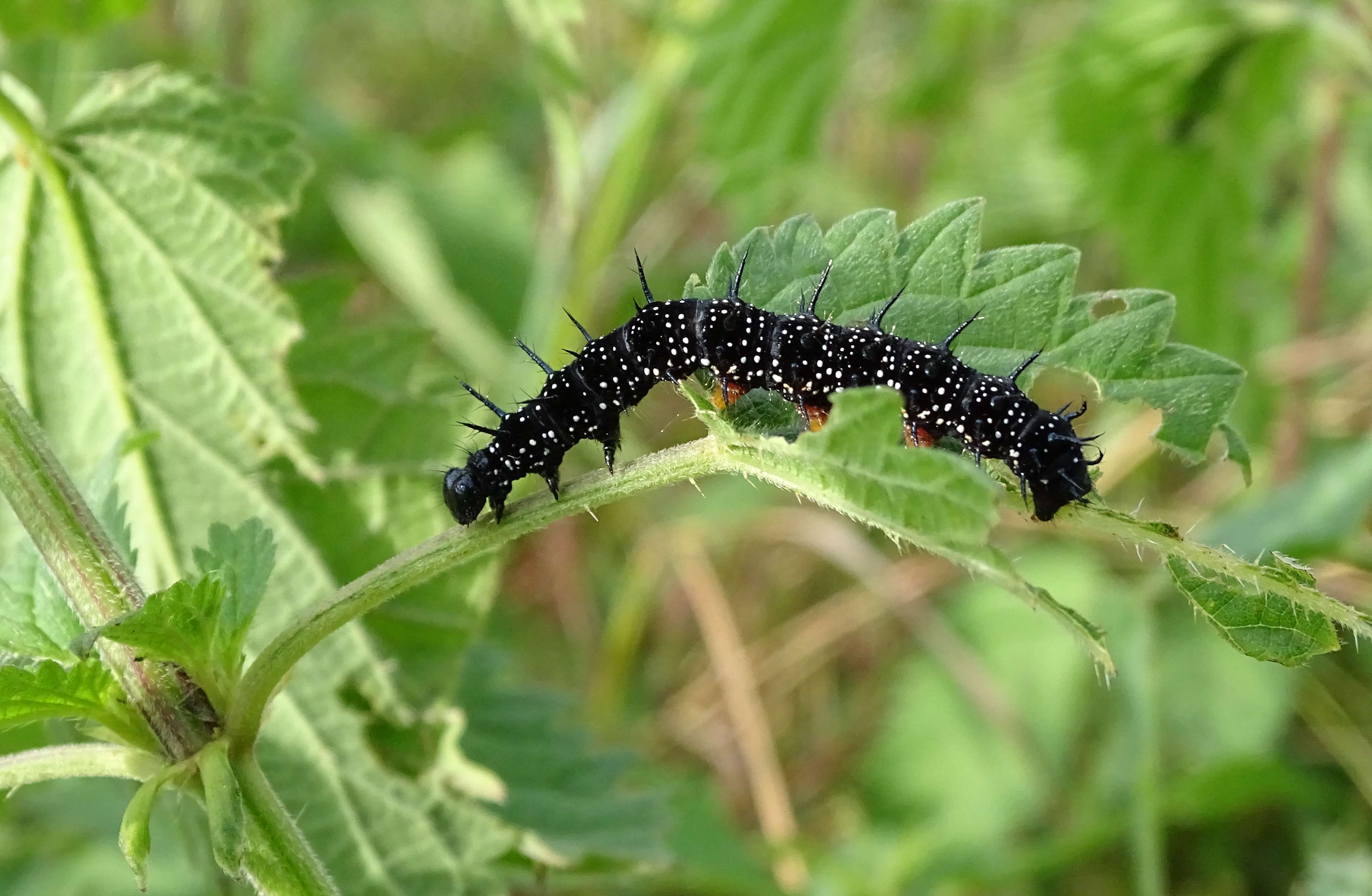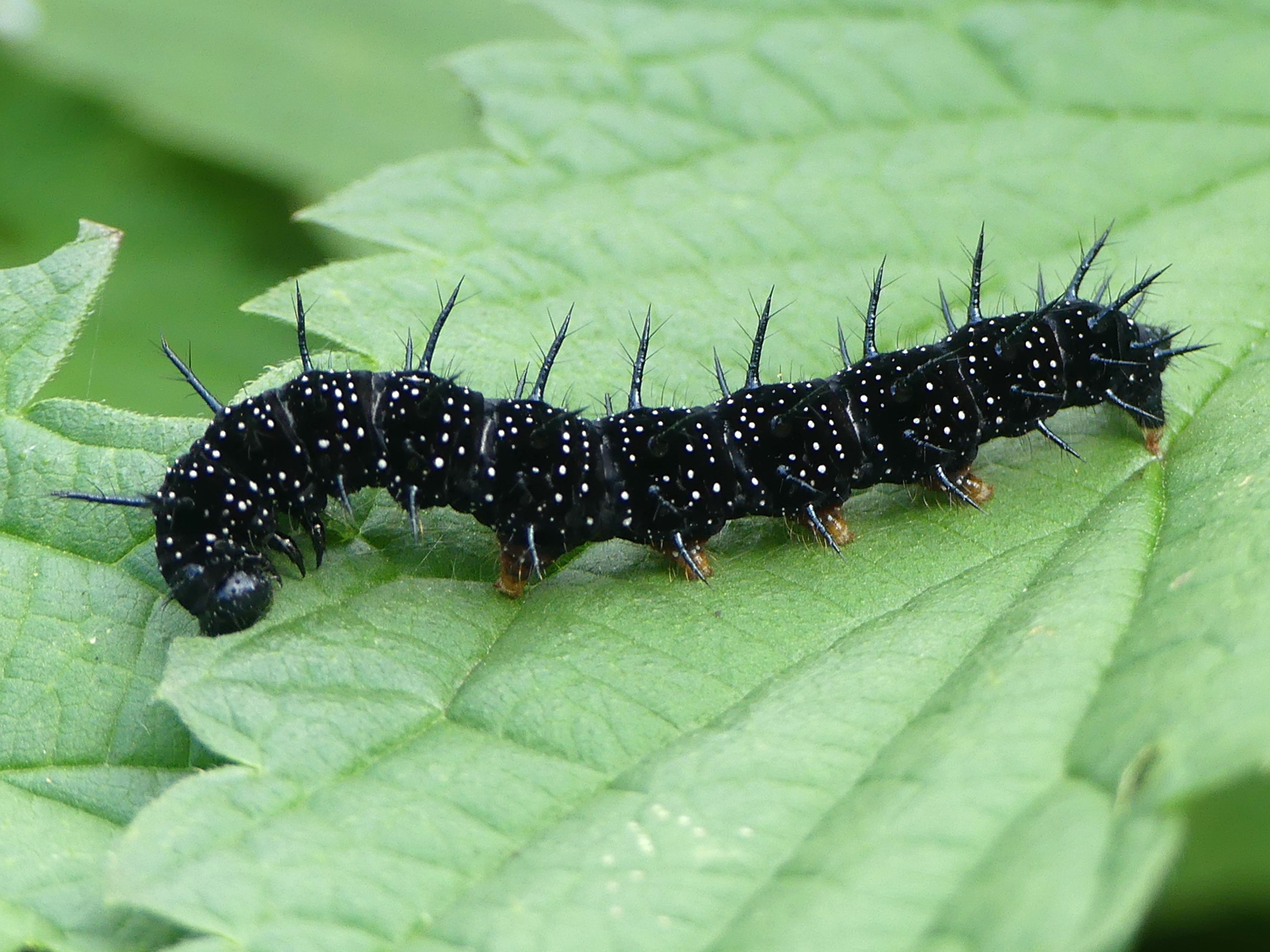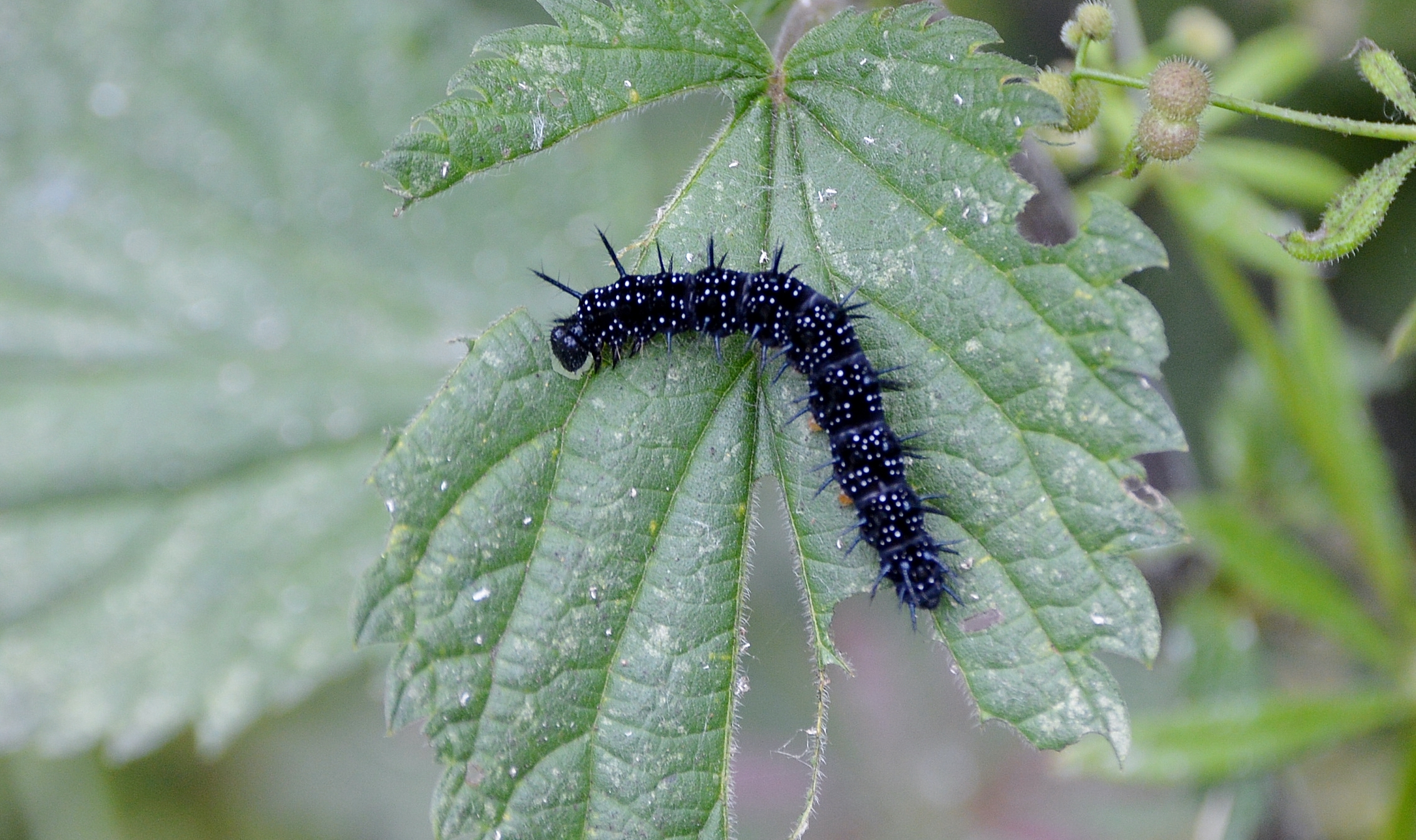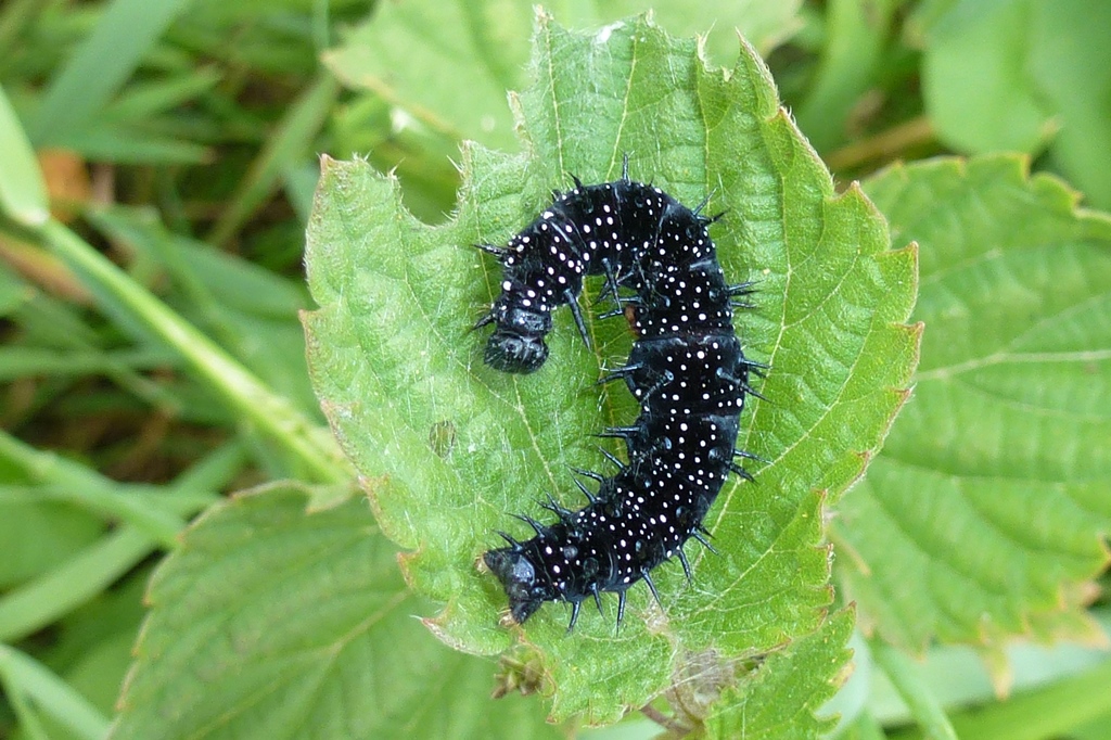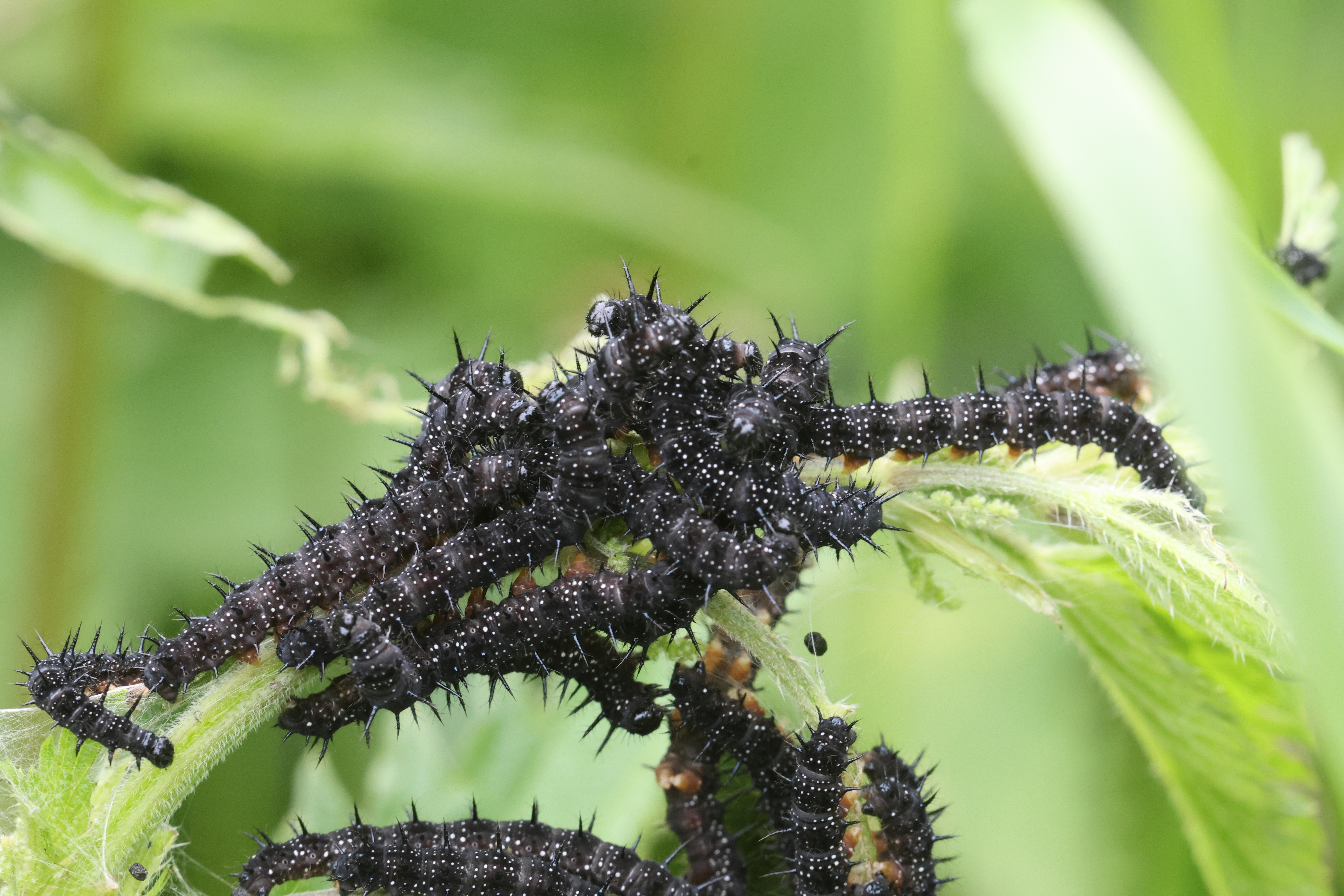 Tagpfauenauge (Aglais io (Linnaeus, 1758)), Larven in verschiedenen Entwicklungsstadien, bei Taubenheim, August 2016.