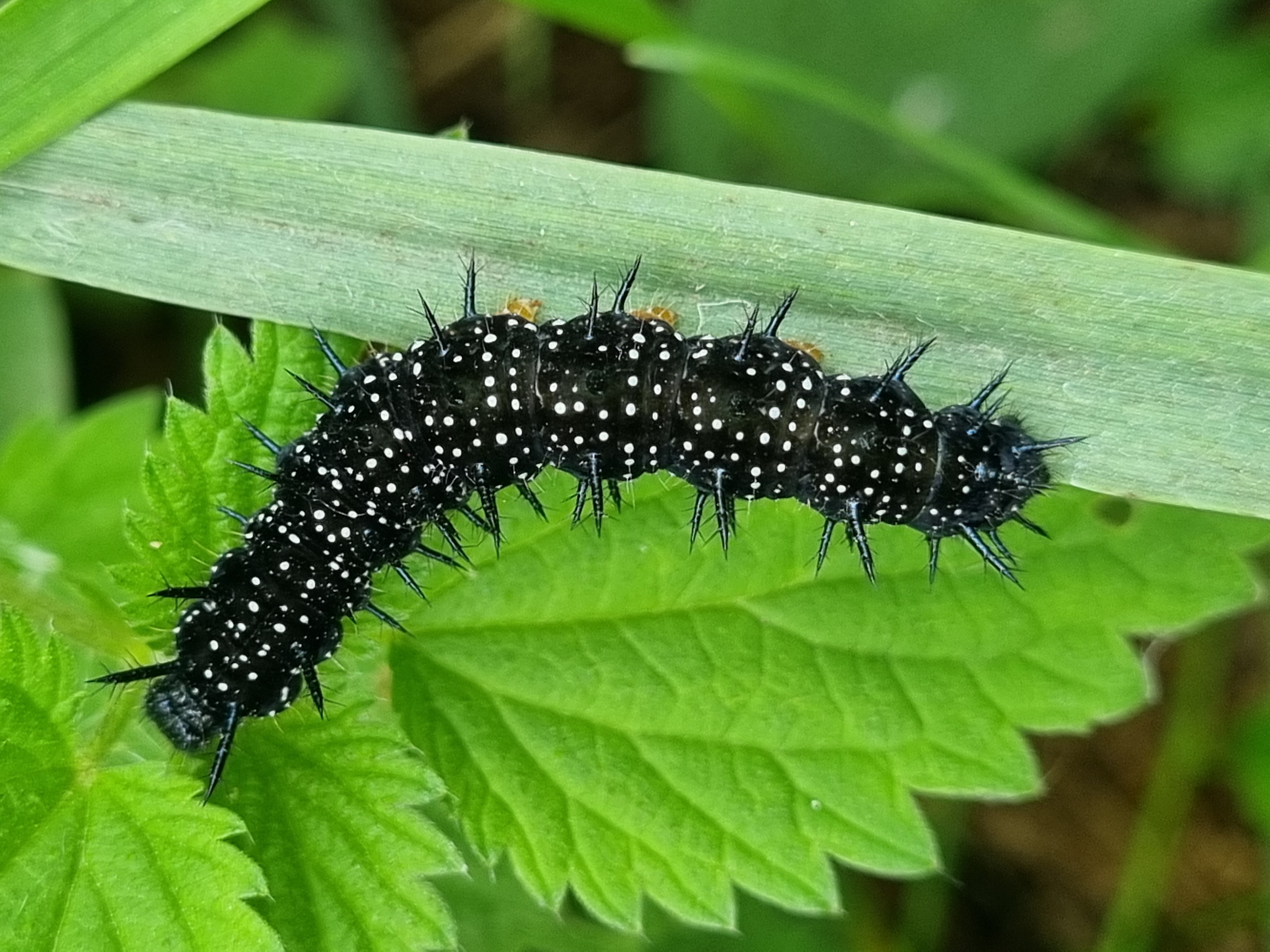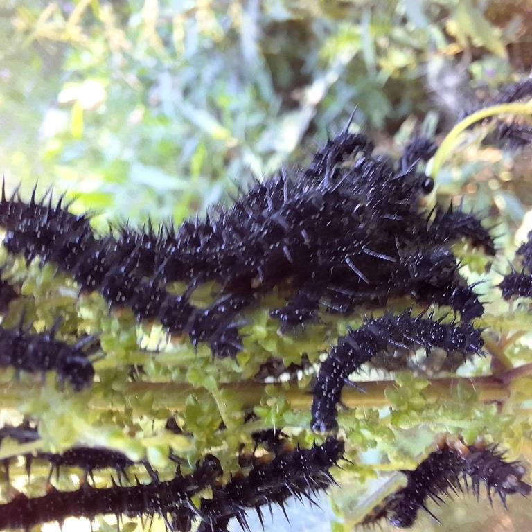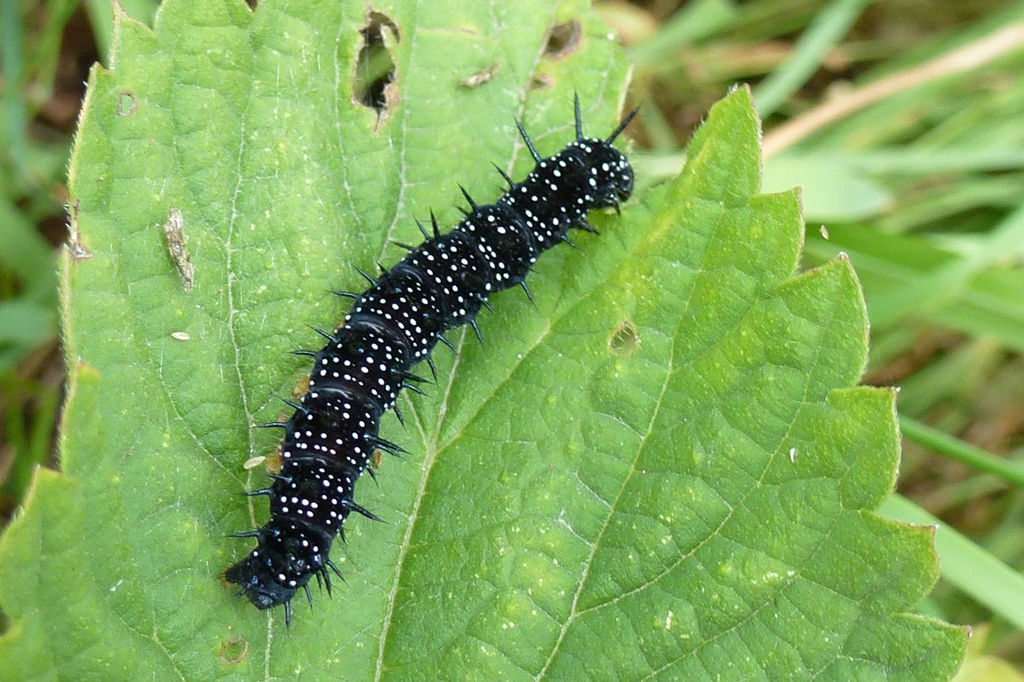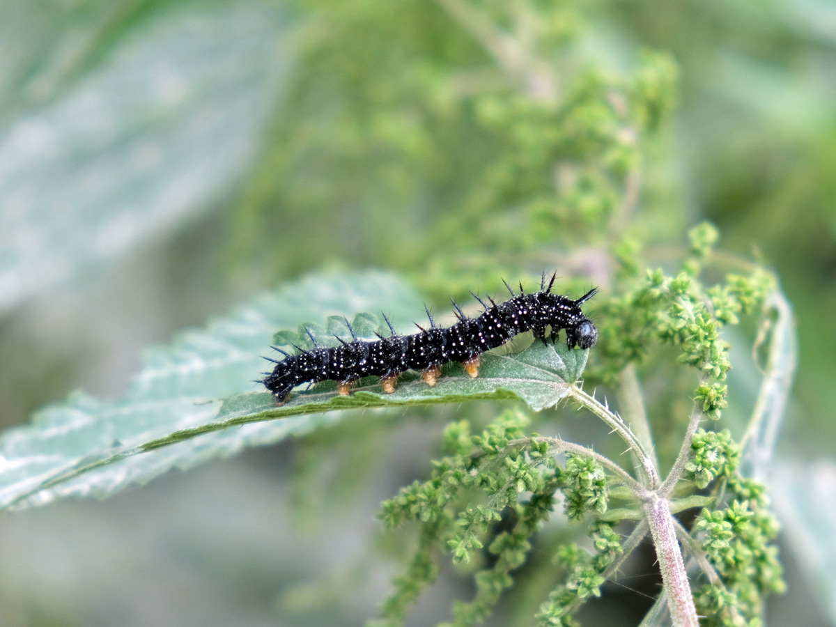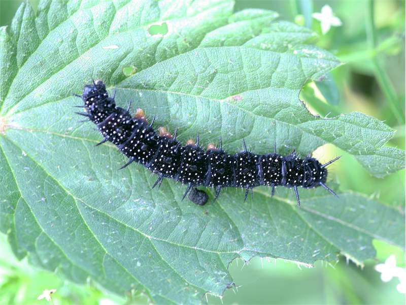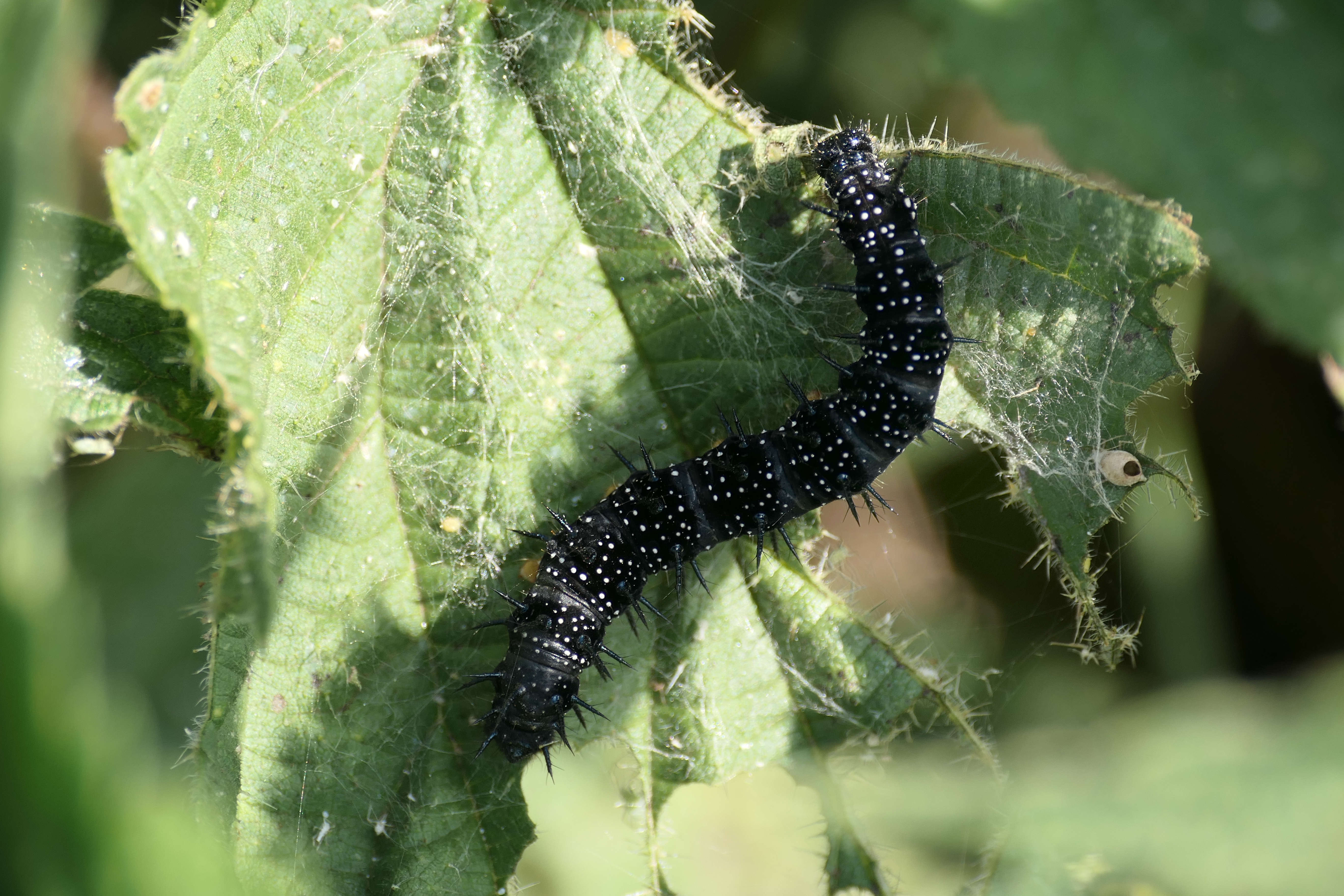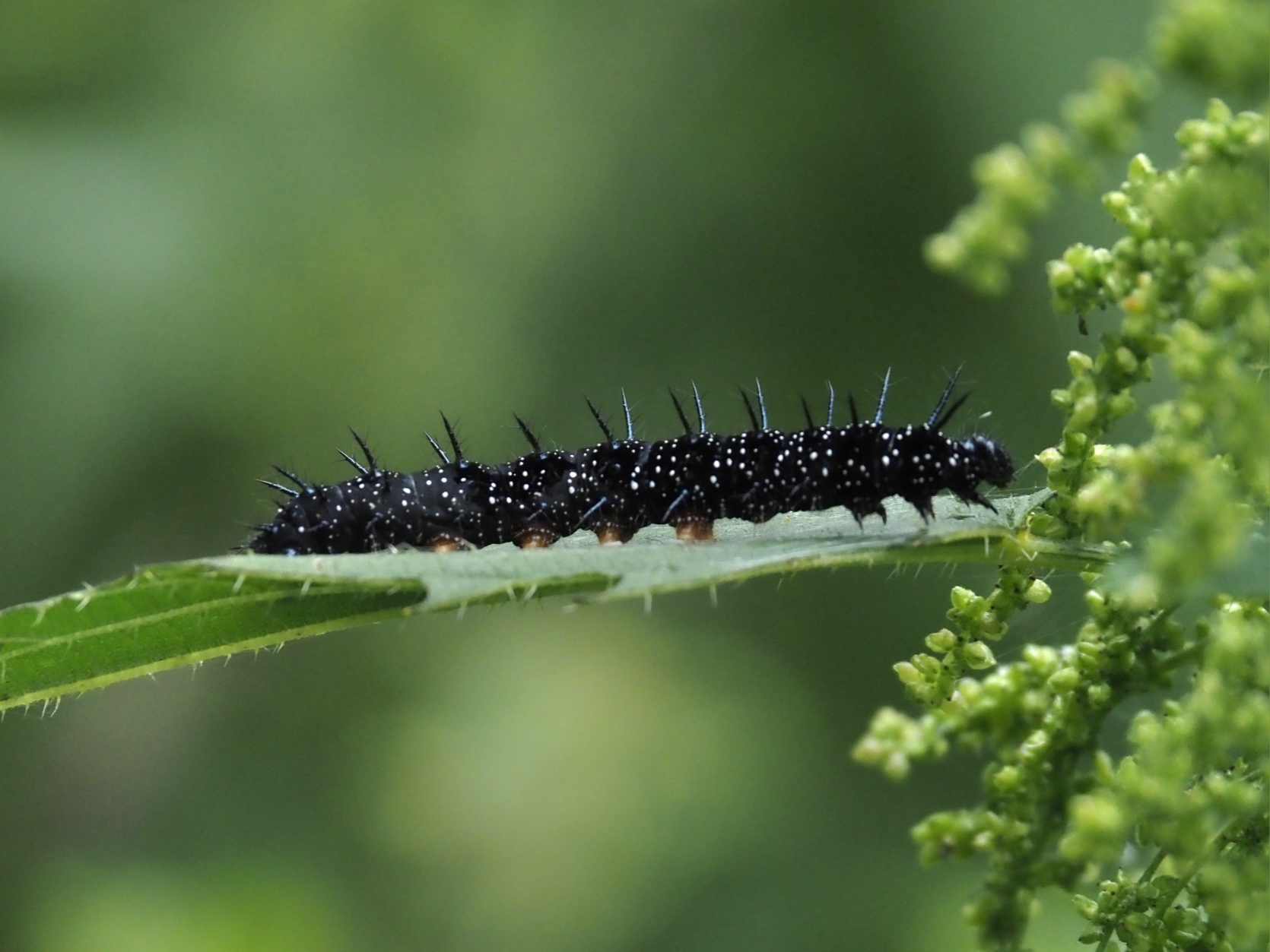 Tagpfauenauge (Aglais io (Linnaeus, 1758)), Larven in verschiedenen Entwicklungsstadien, bei Taubenheim, August 2016.