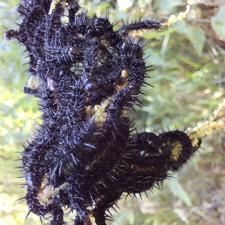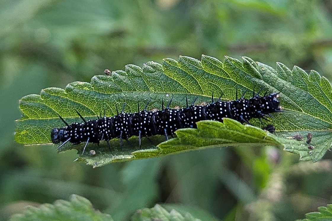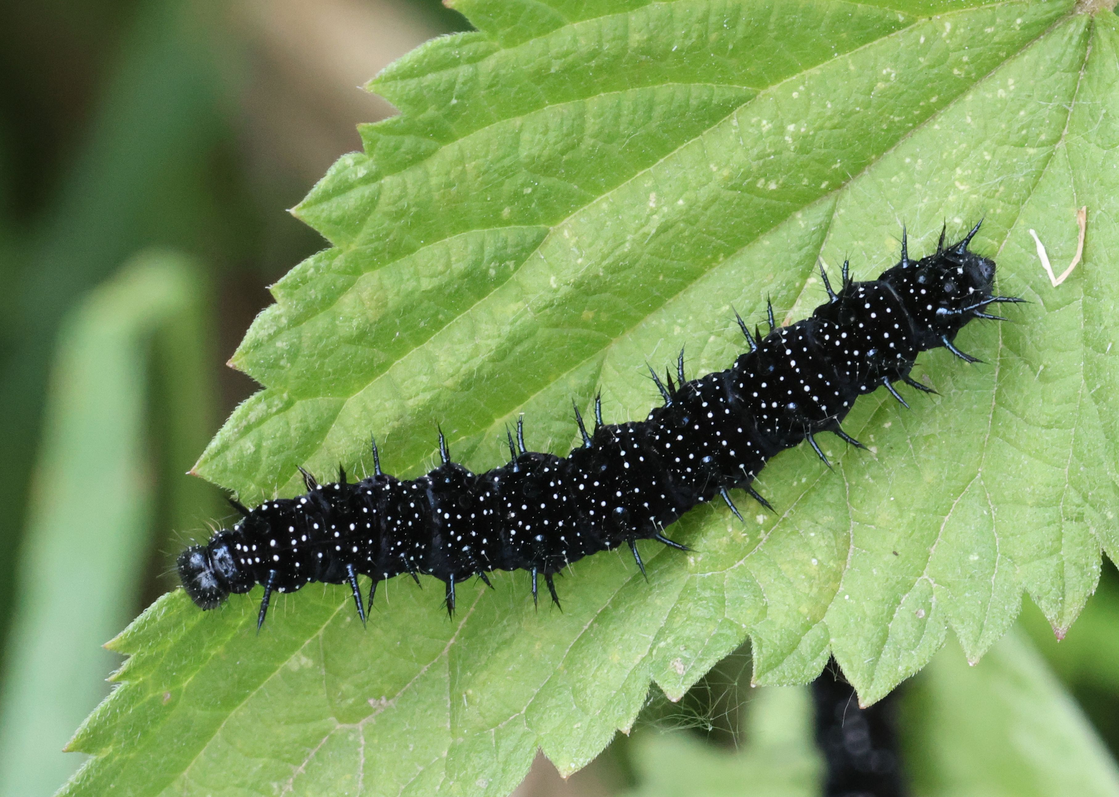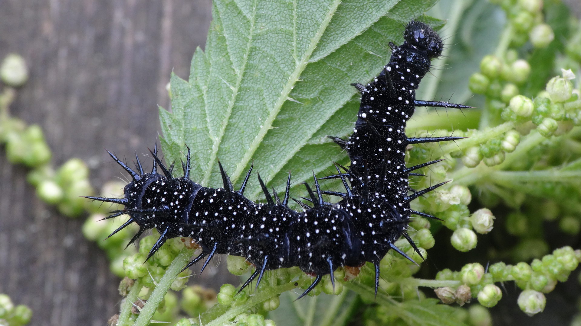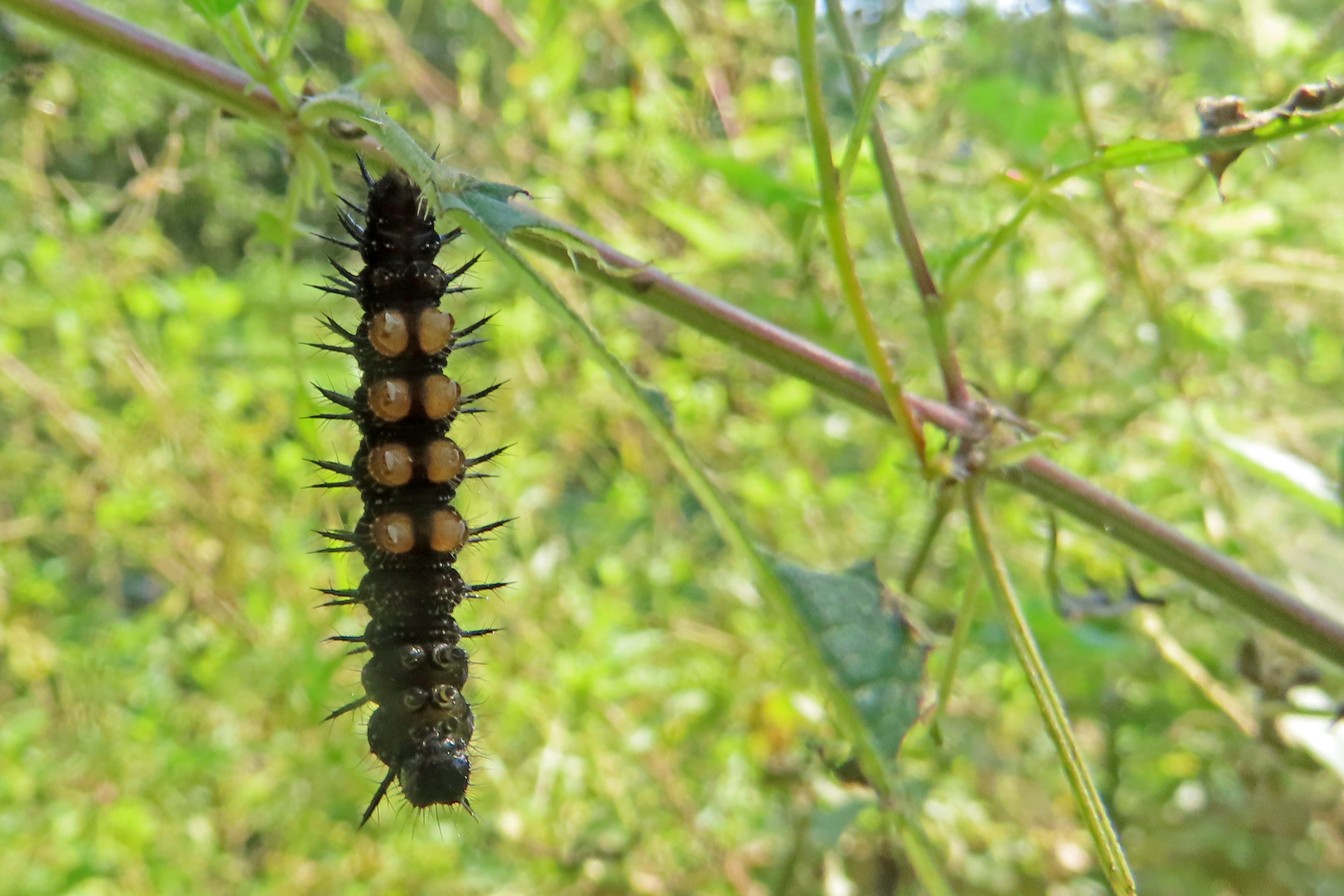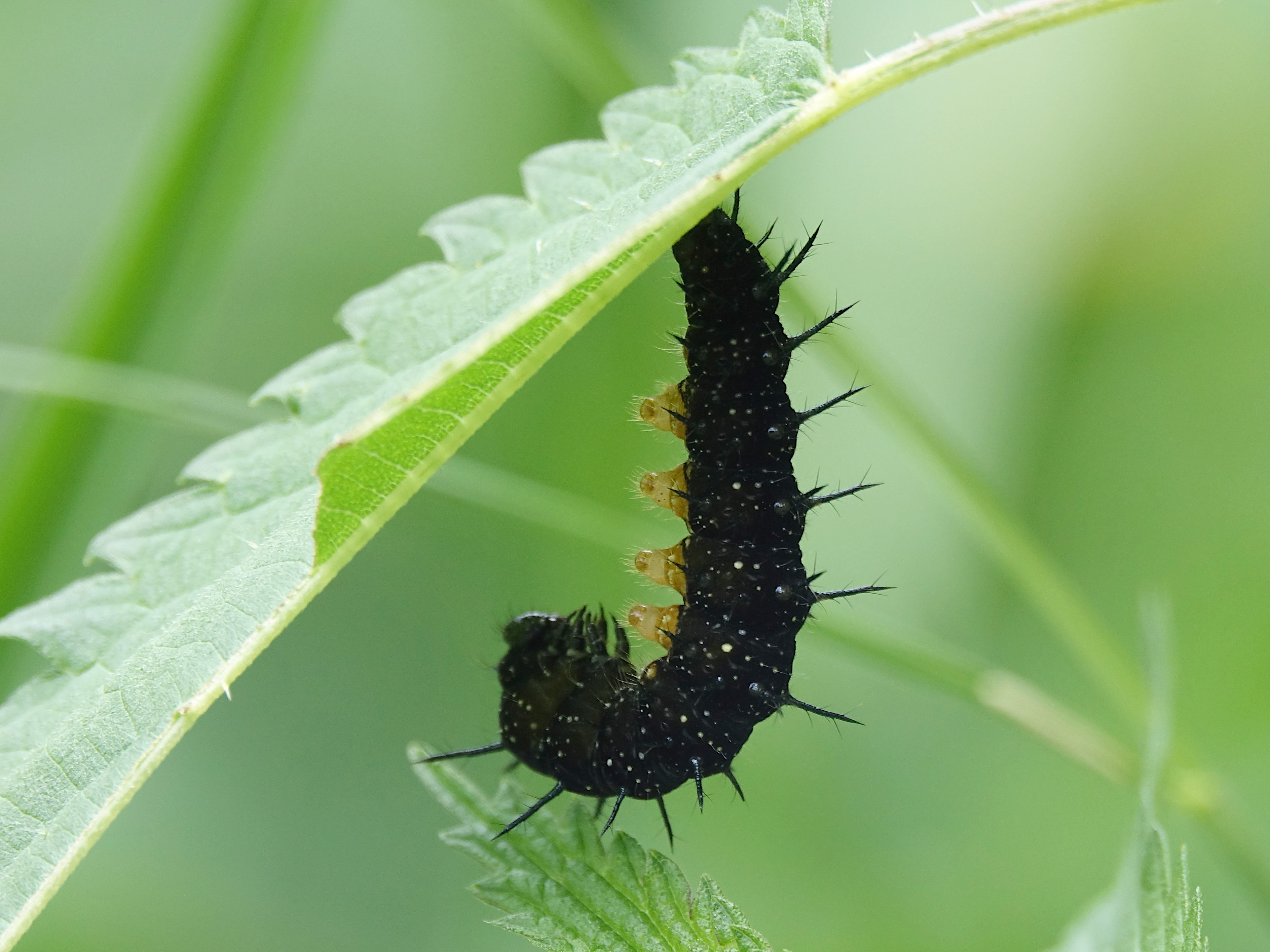 Tagpfauenauge (Aglais io (Linnaeus, 1758)), Larven in verschiedenen Entwicklungsstadien, bei Taubenheim, August 2016.