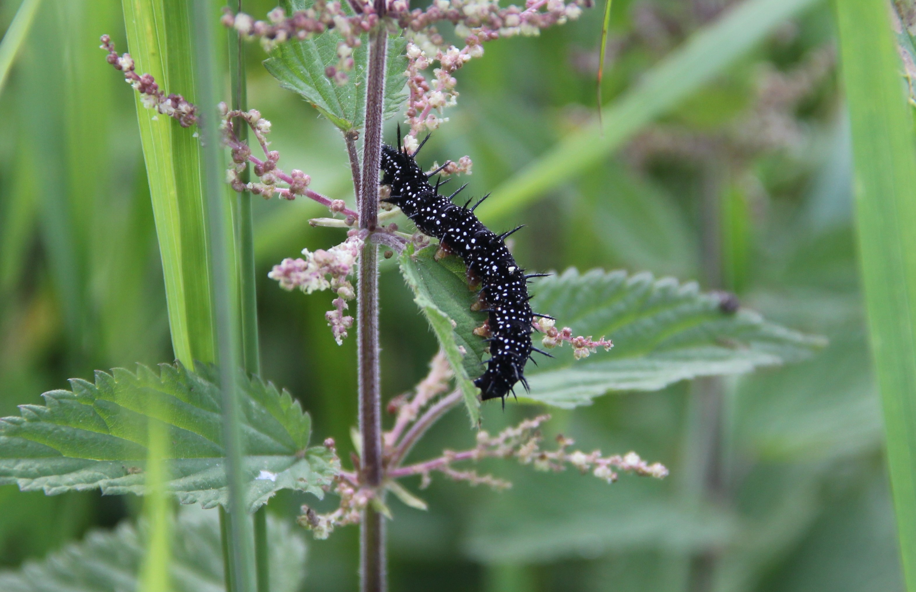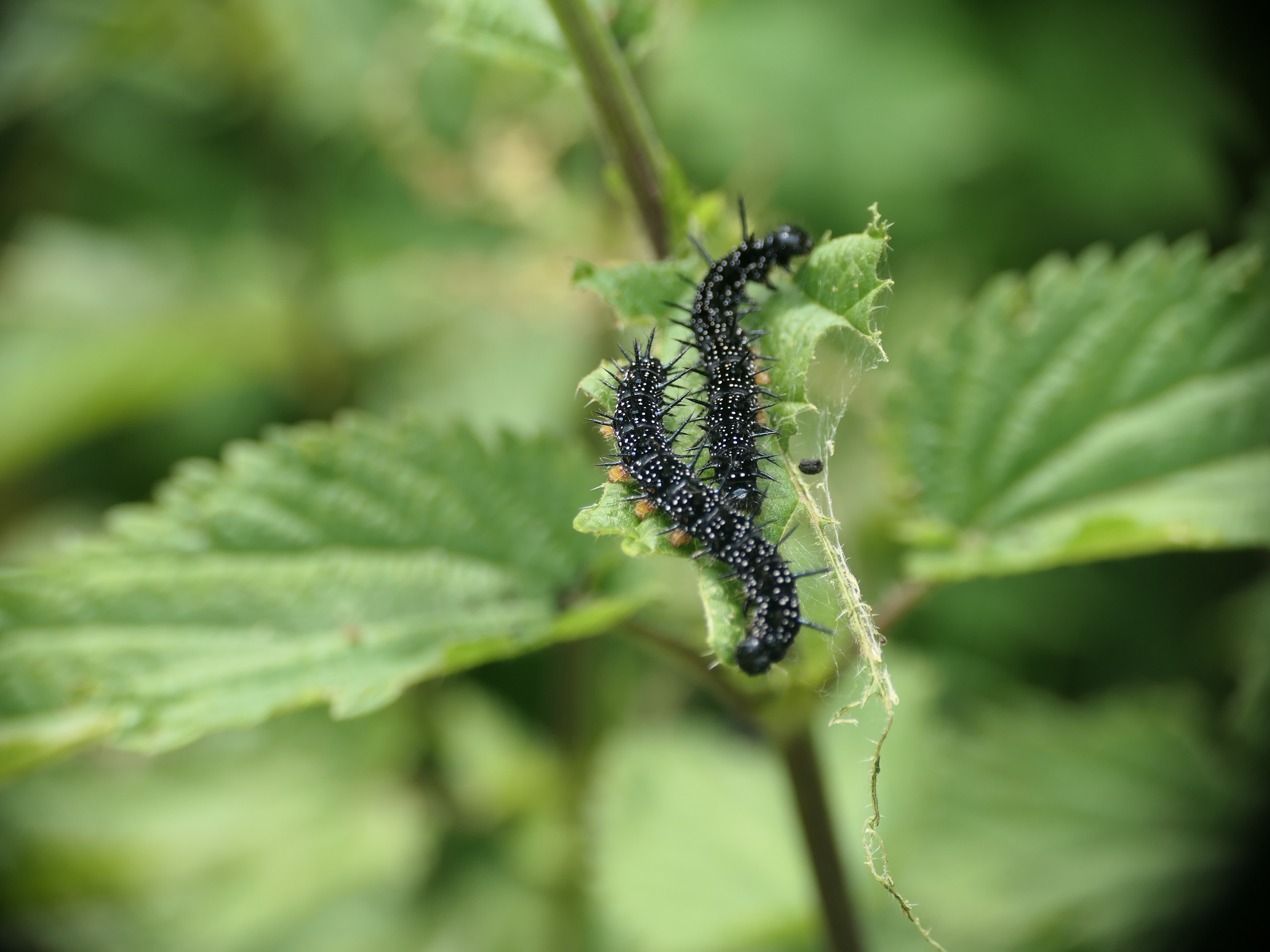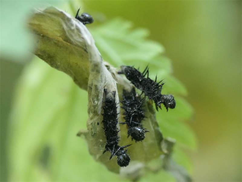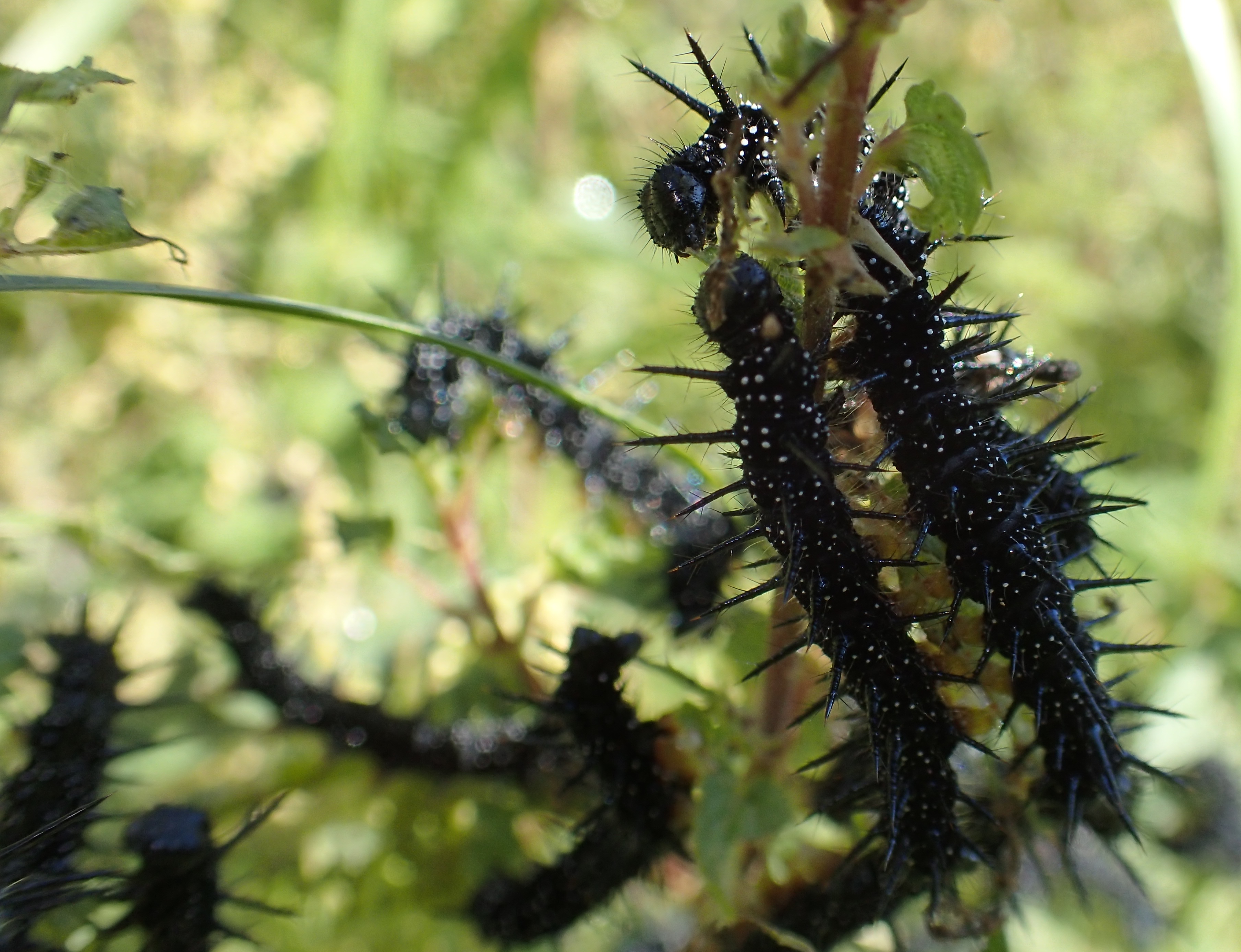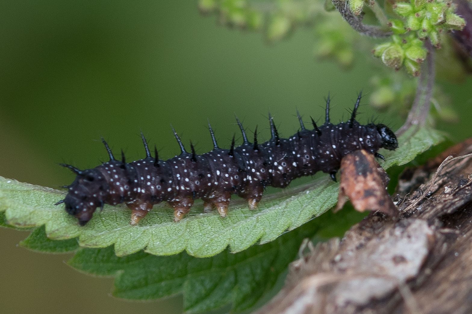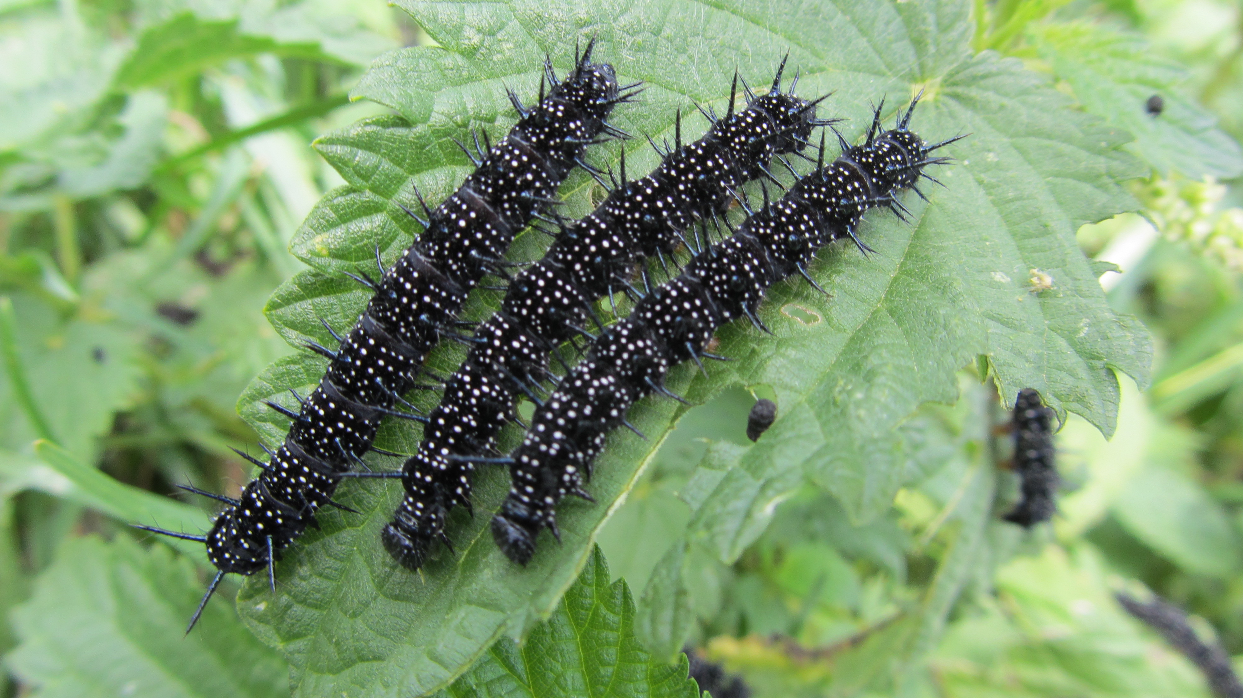 Tagpfauenauge (Aglais io (Linnaeus, 1758)), Larven in verschiedenen Entwicklungsstadien, bei Taubenheim, August 2016.