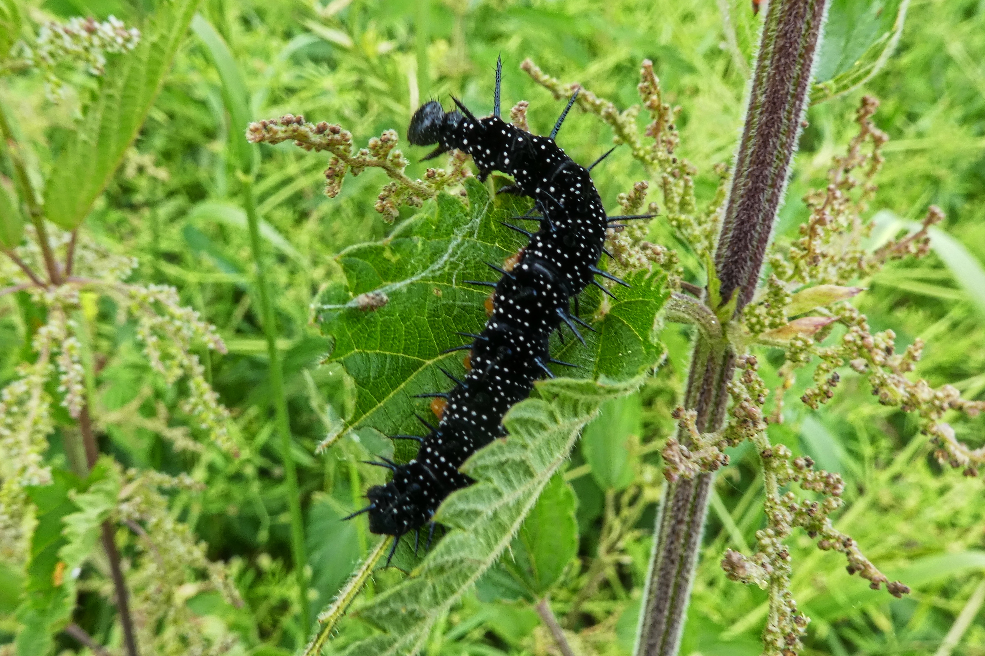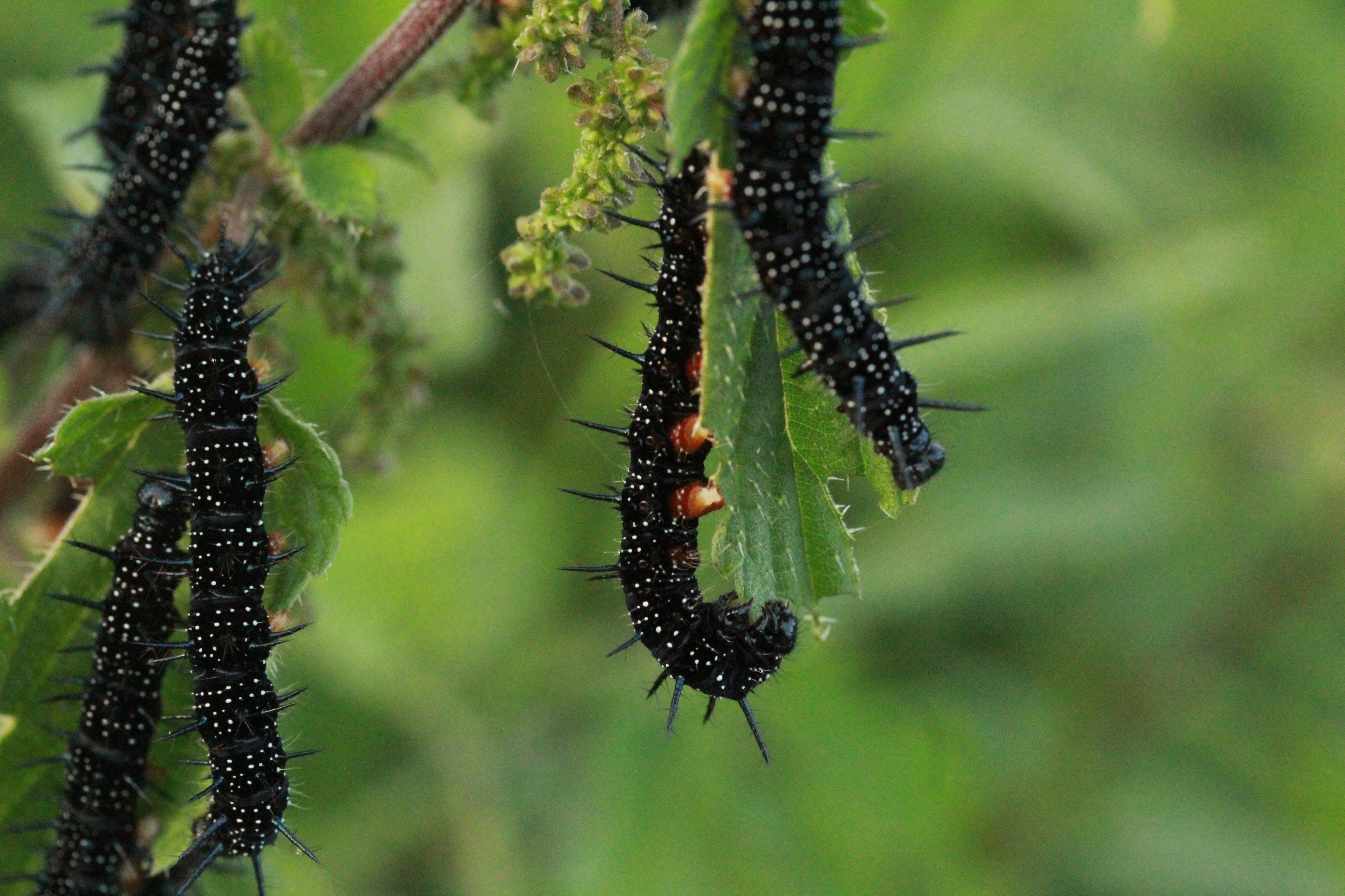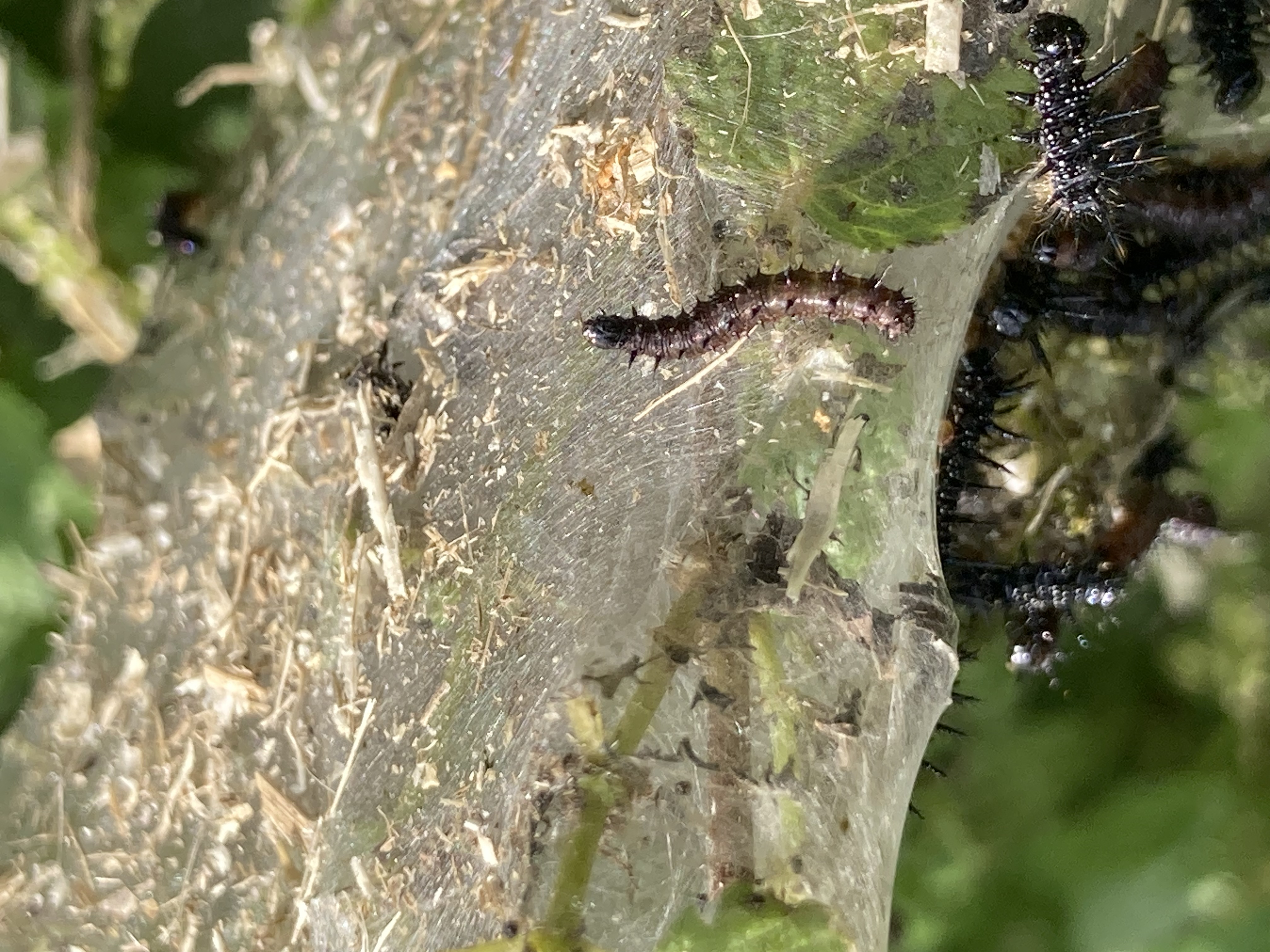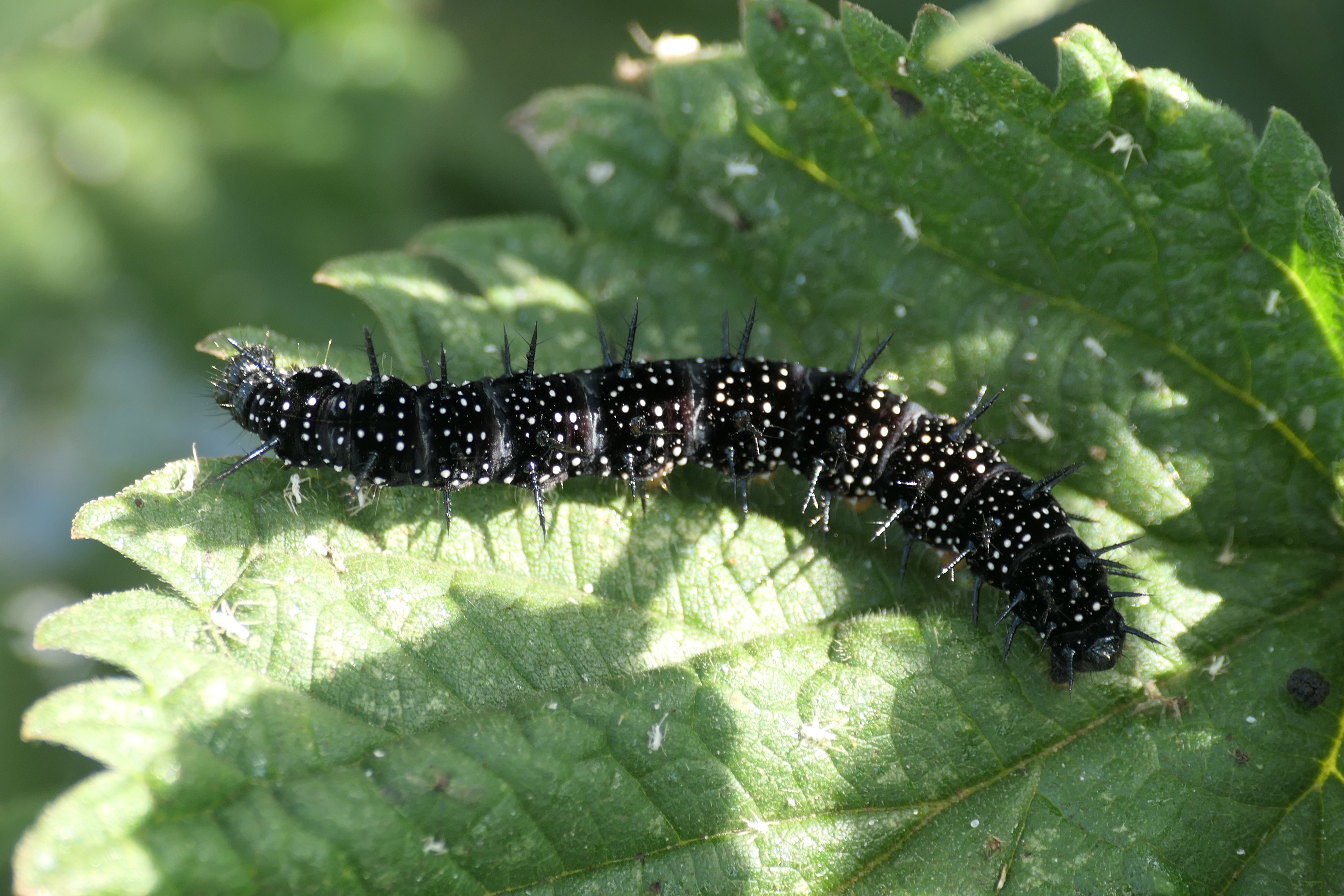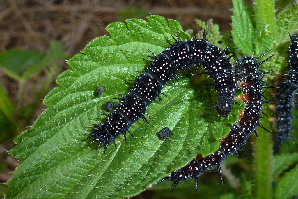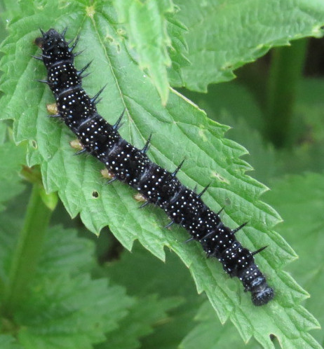 Tagpfauenauge (Aglais io (Linnaeus, 1758)), Larven in verschiedenen Entwicklungsstadien, bei Taubenheim, August 2016.