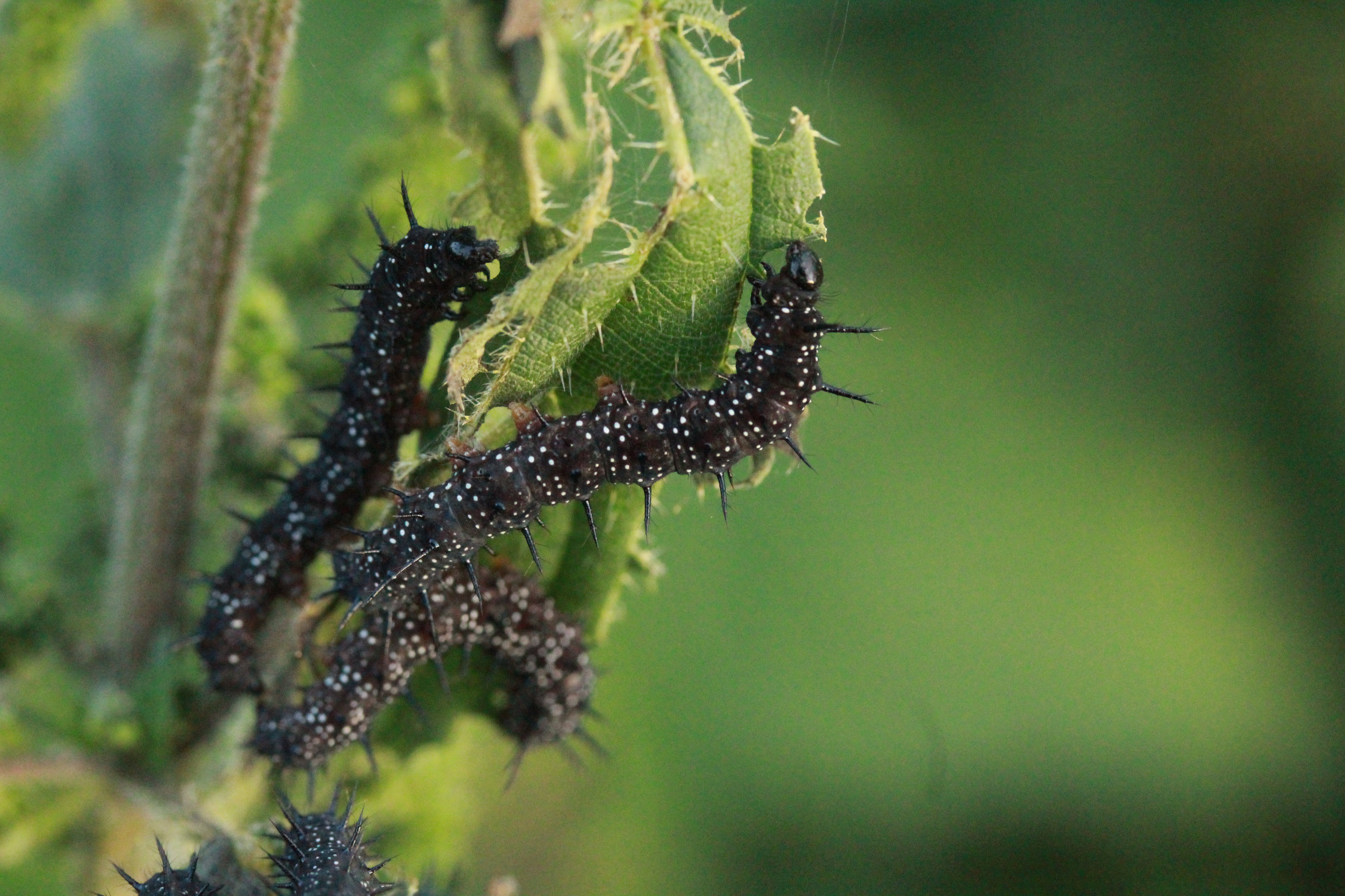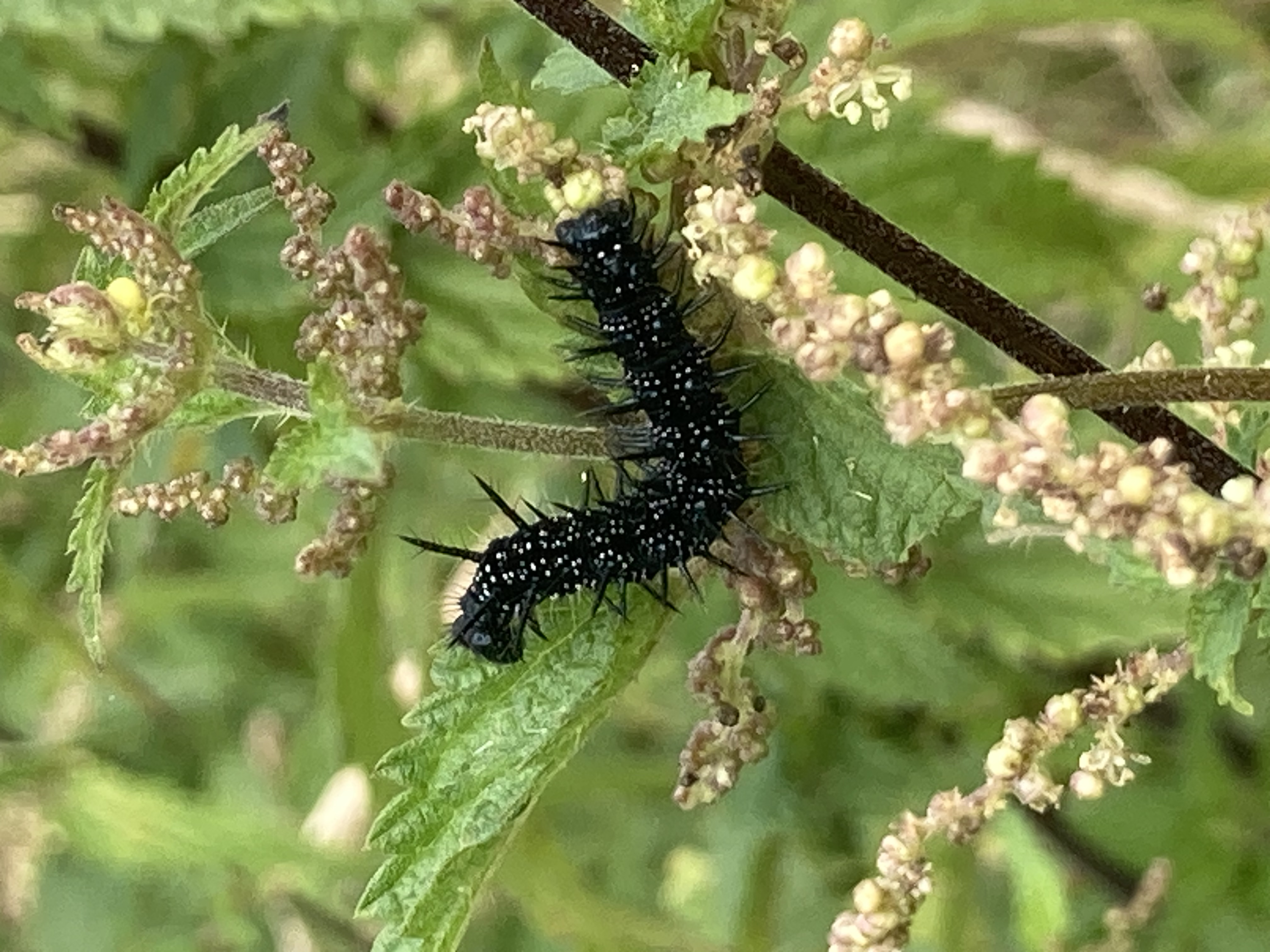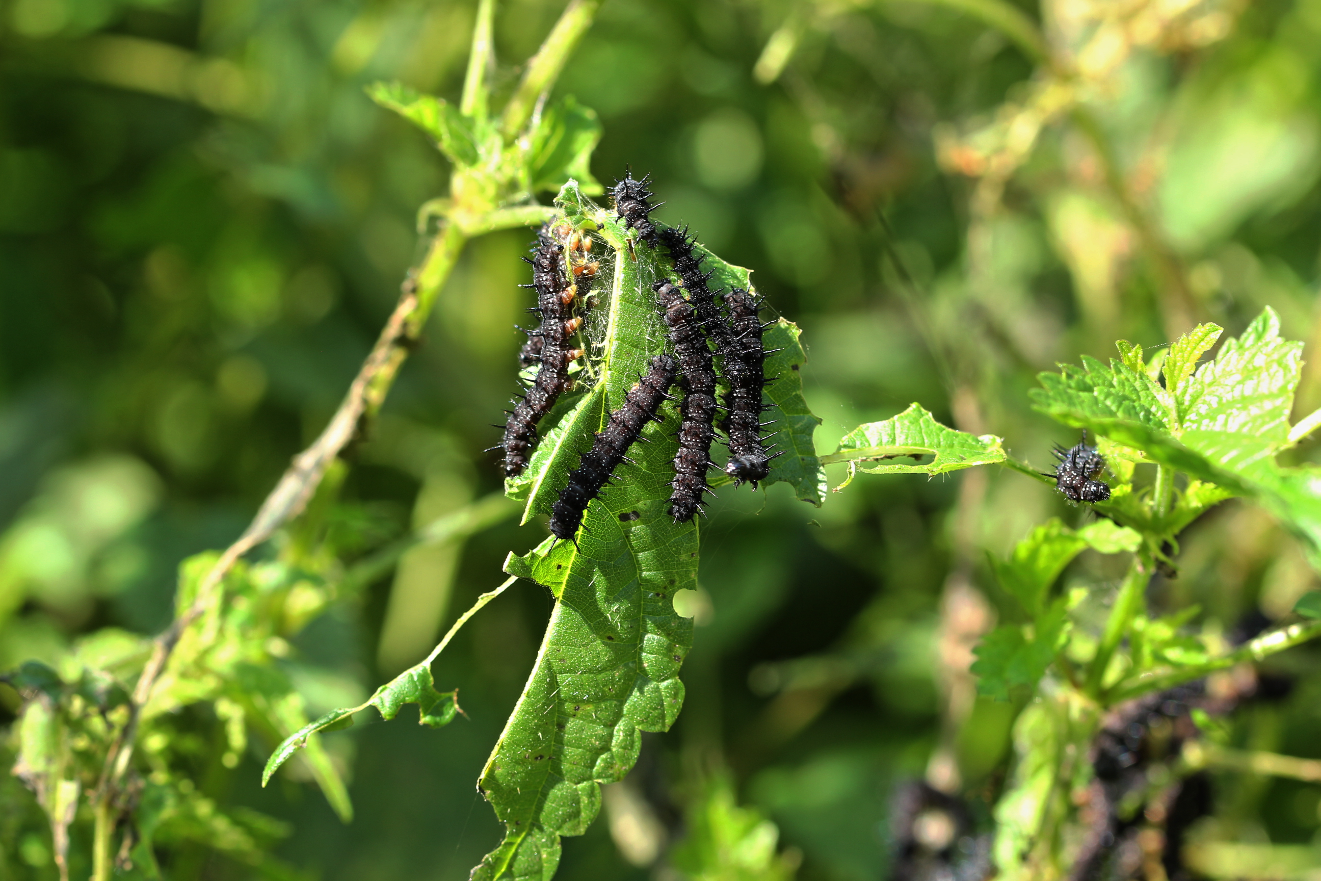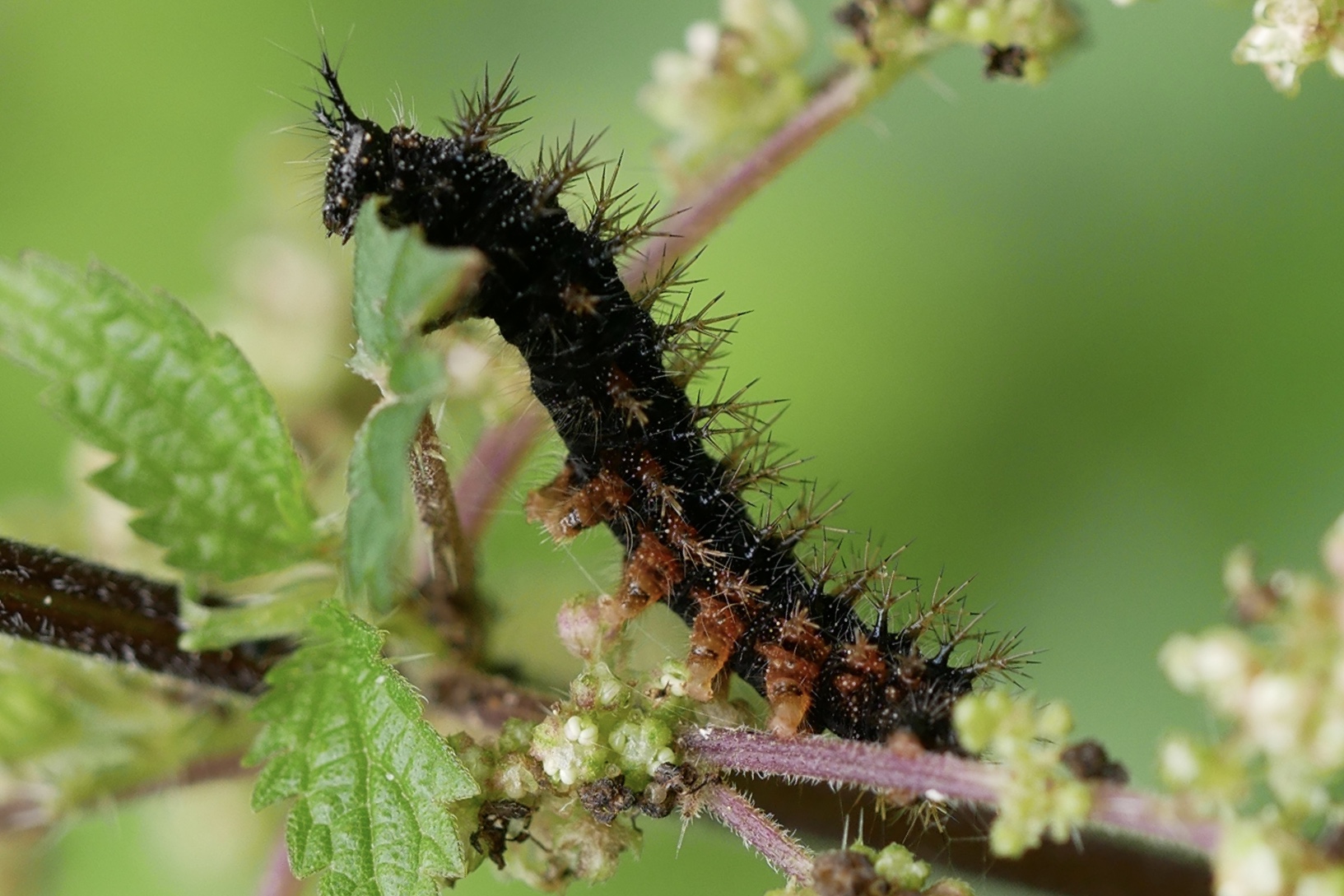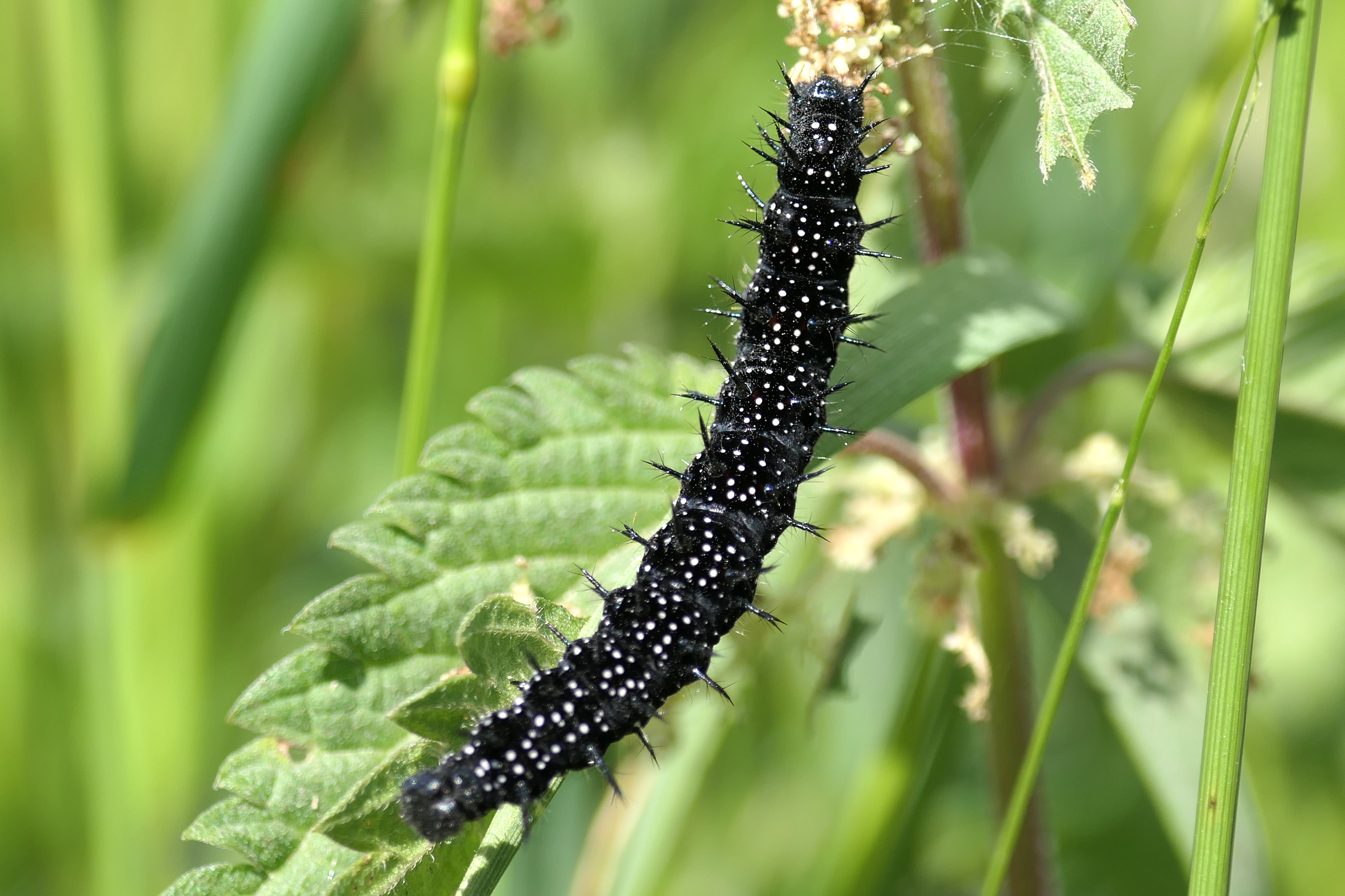 Tagpfauenauge (Aglais io (Linnaeus, 1758)), Larven in verschiedenen Entwicklungsstadien, bei Taubenheim, August 2016.