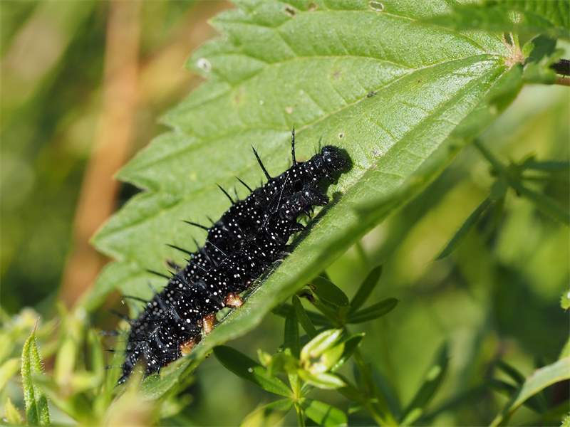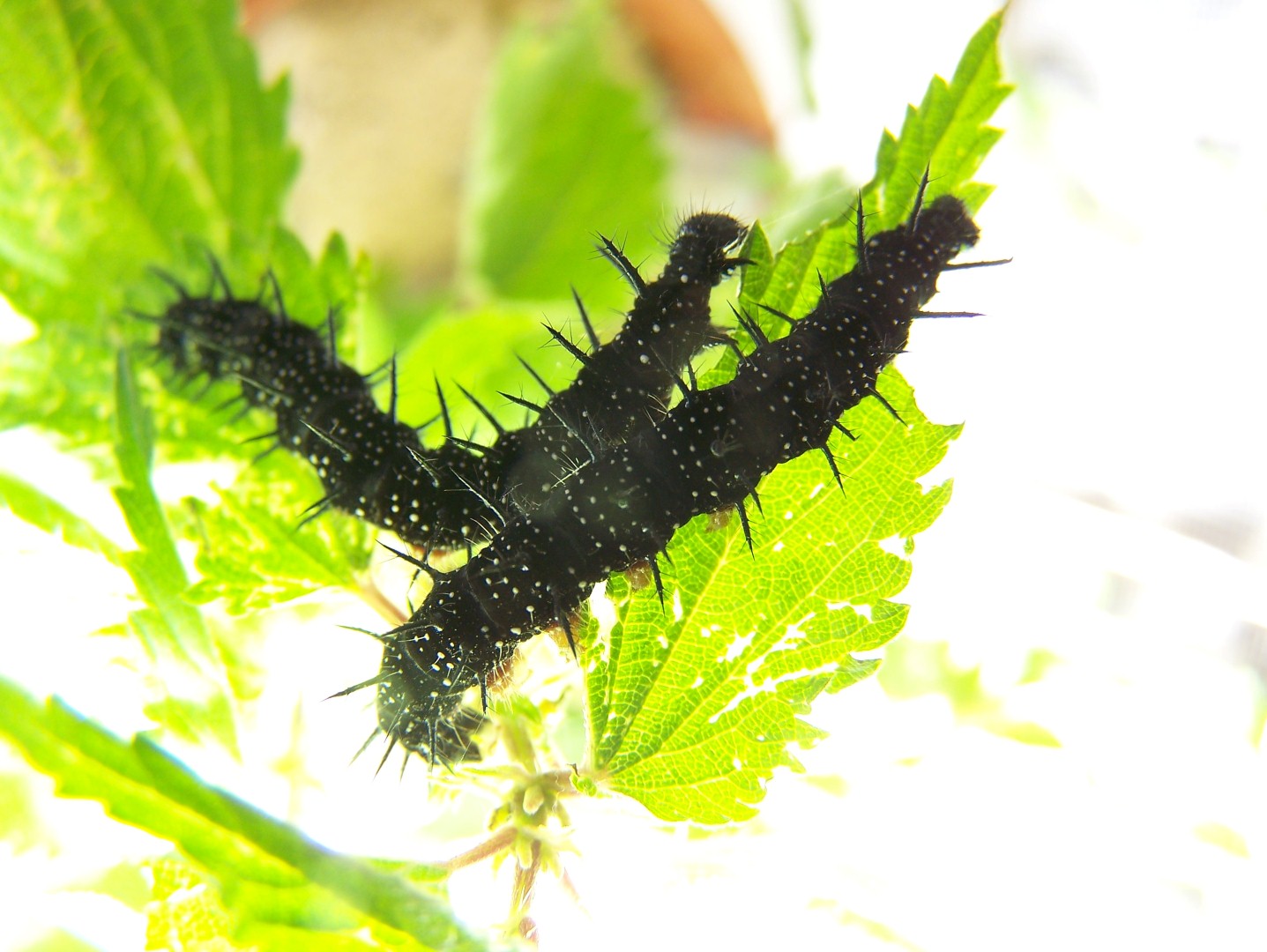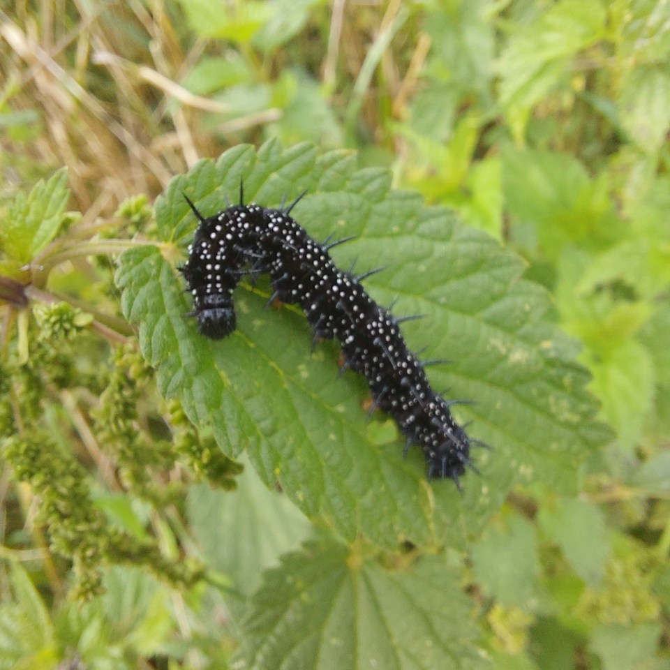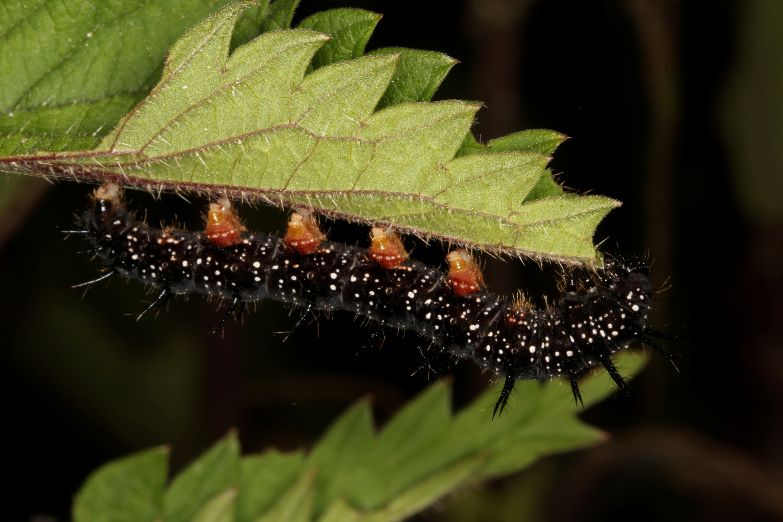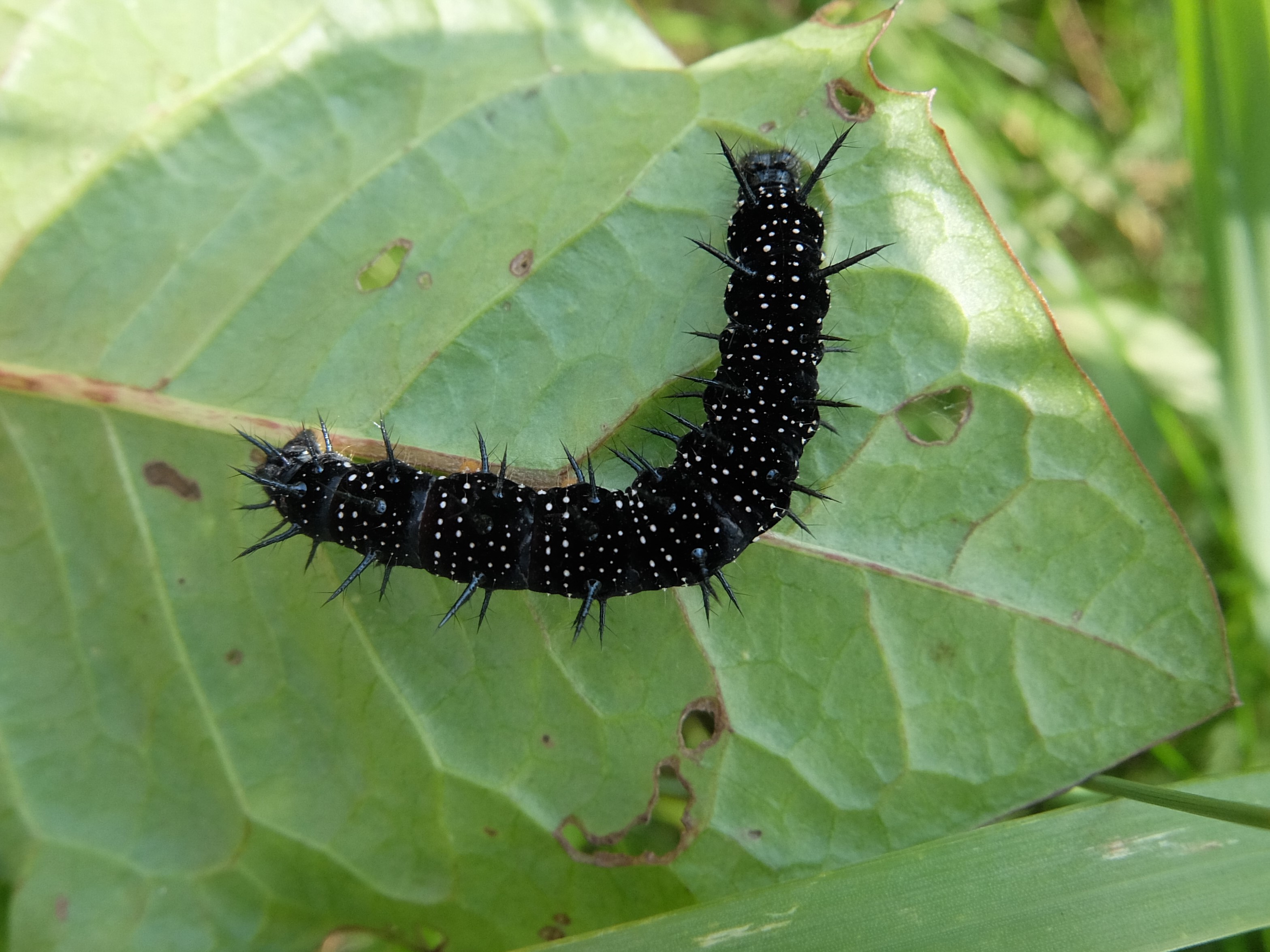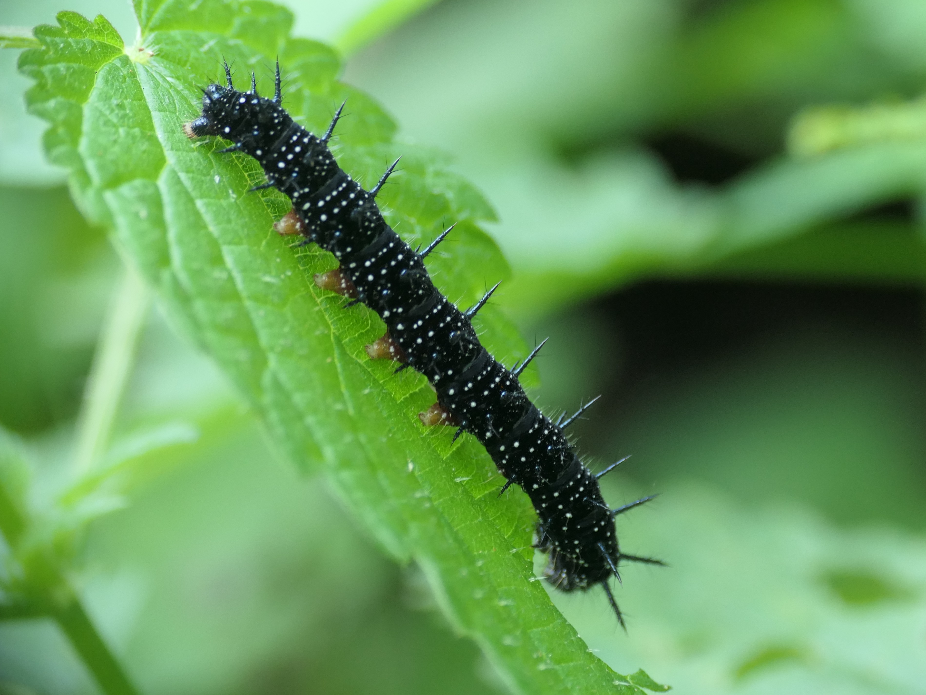 Tagpfauenauge (Aglais io (Linnaeus, 1758)), Larven in verschiedenen Entwicklungsstadien, bei Taubenheim, August 2016.